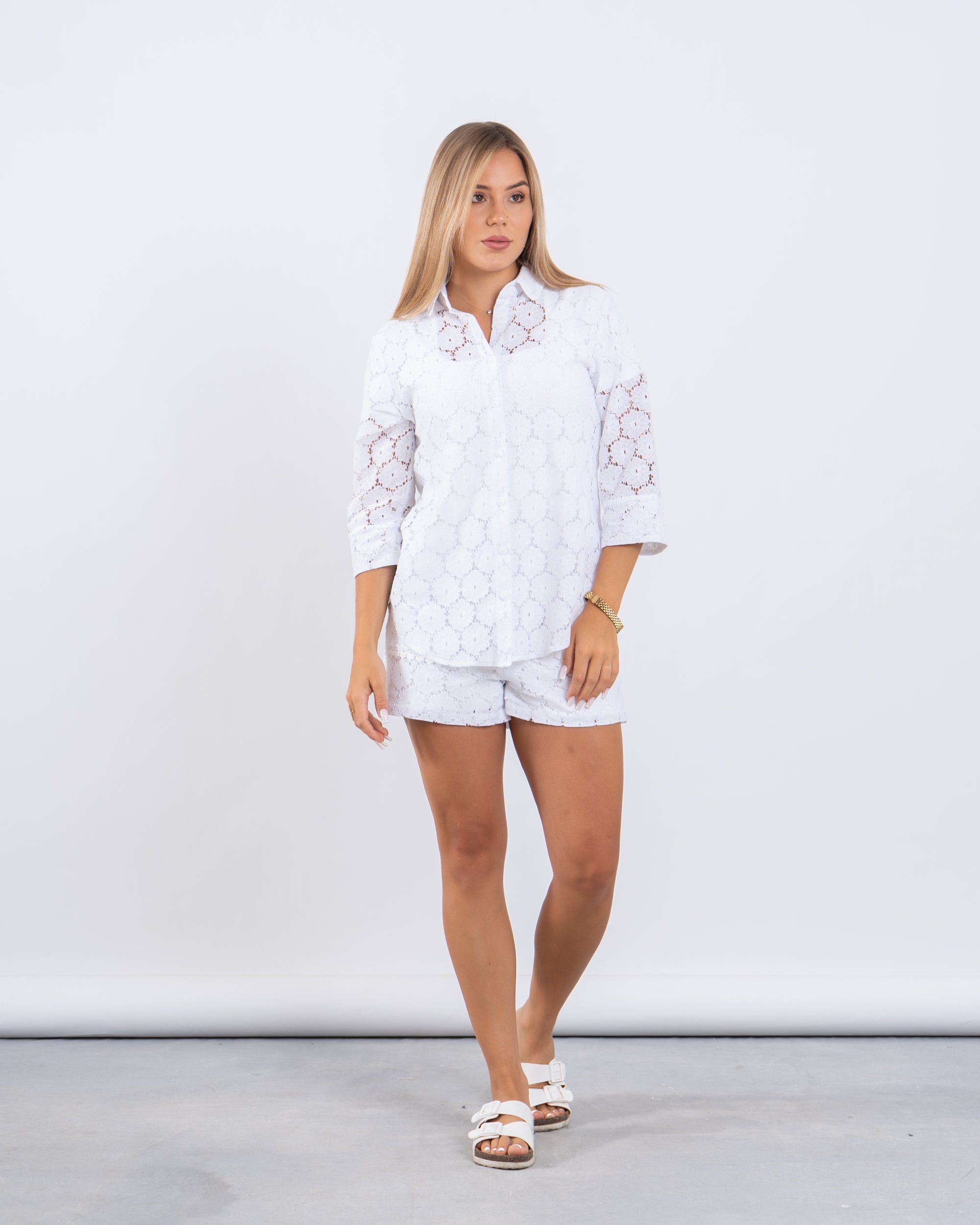 An airy, feminine button-down shirt crafted from delicate eyelet fabric. Lightweight and breathable, it’s perfect for warm-weather days and can be worn on its own or as part of a matching set.