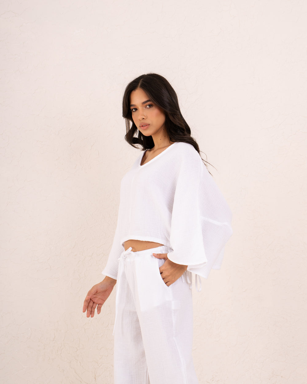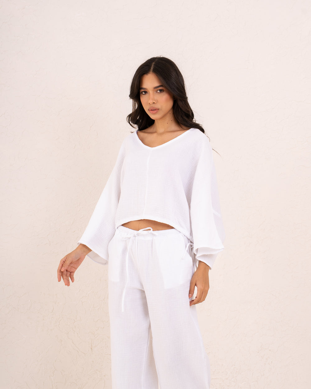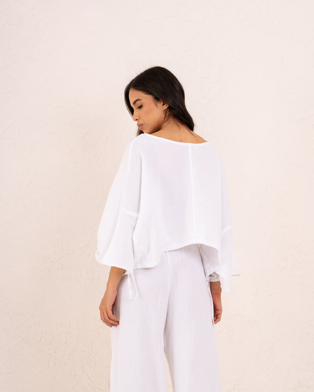An oversized, textured cotton top featuring a flattering V-neckline and adjustable side-ties for a customizable look.
