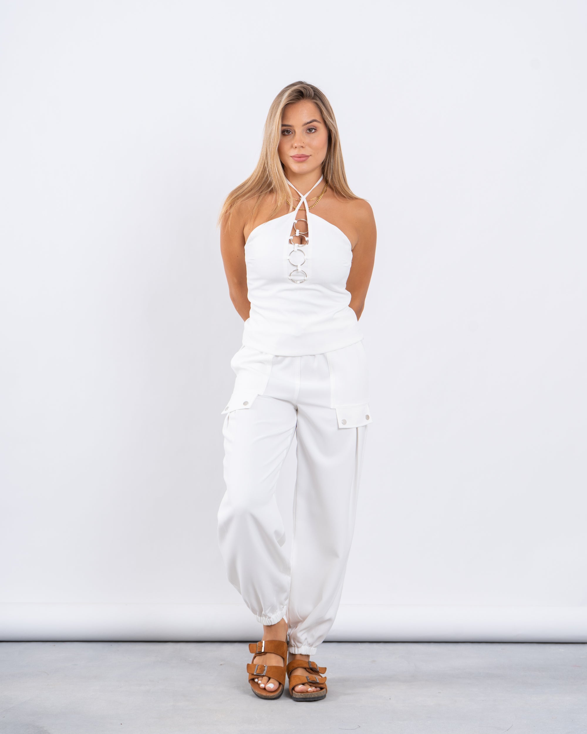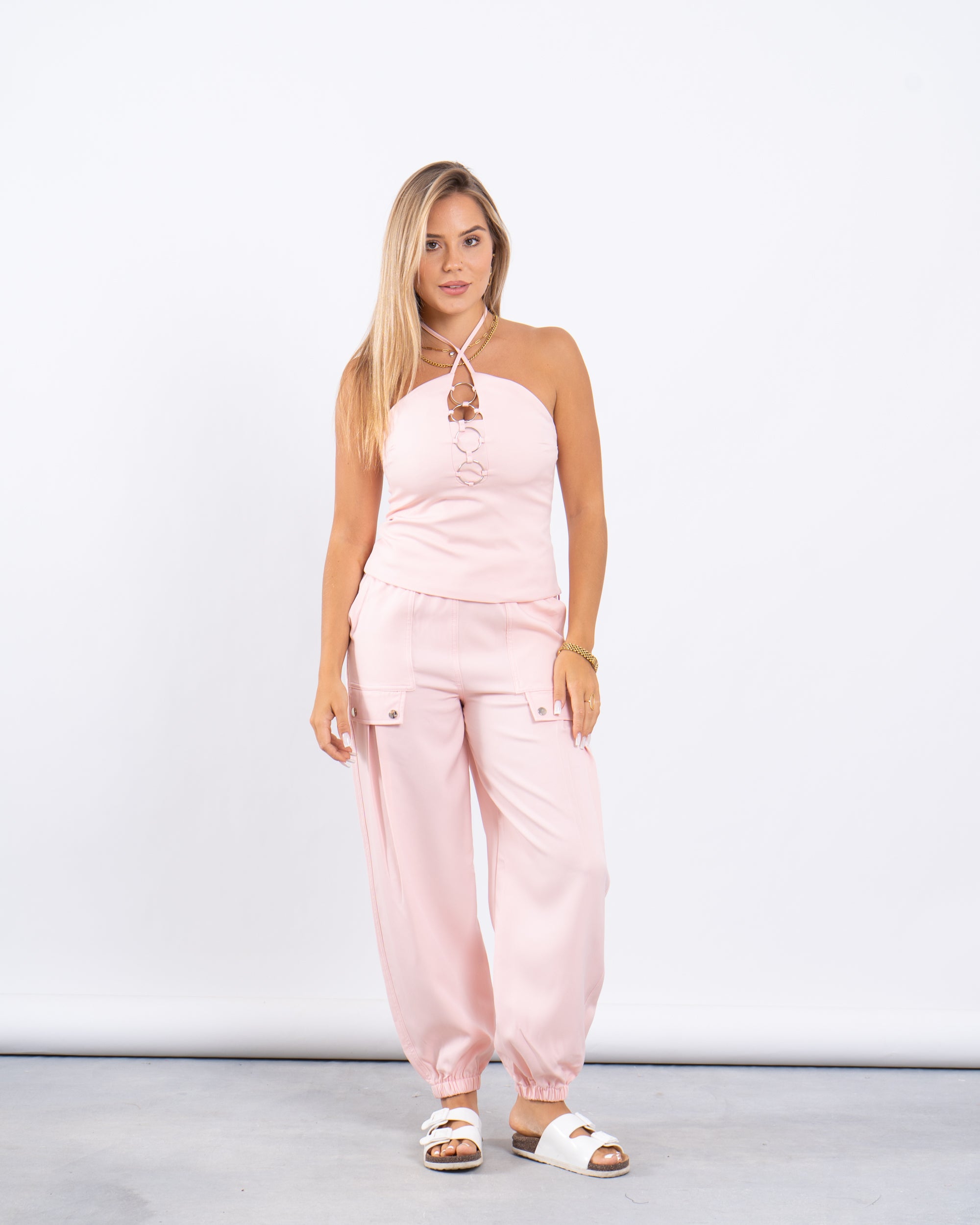 A statement halter top with bold metallic ring accents and a sleek neckline that ties at the neck. Designed for a flattering fit and standout style, it’s part of our matching Mommy & Me collection for a coordinated look with your mini.