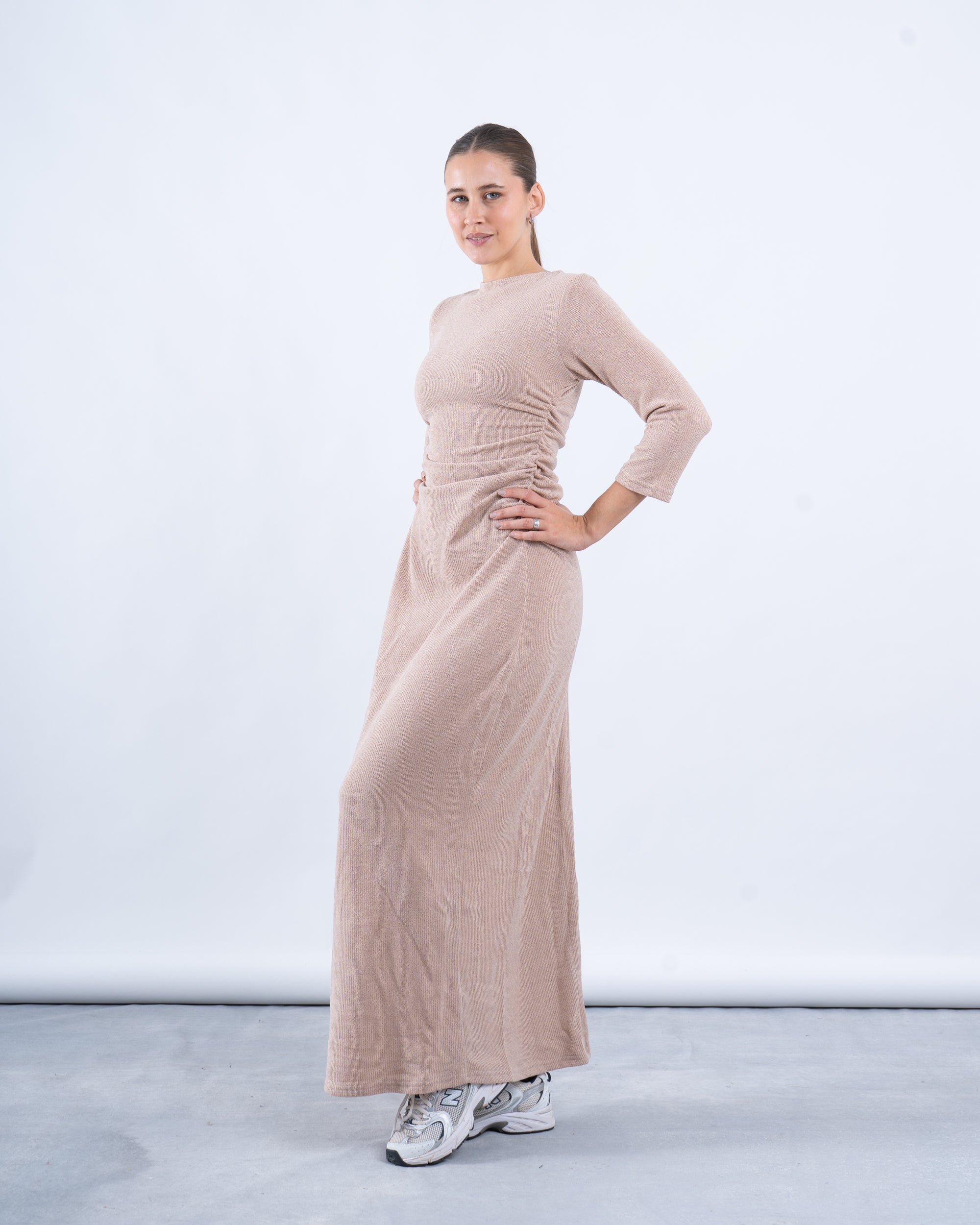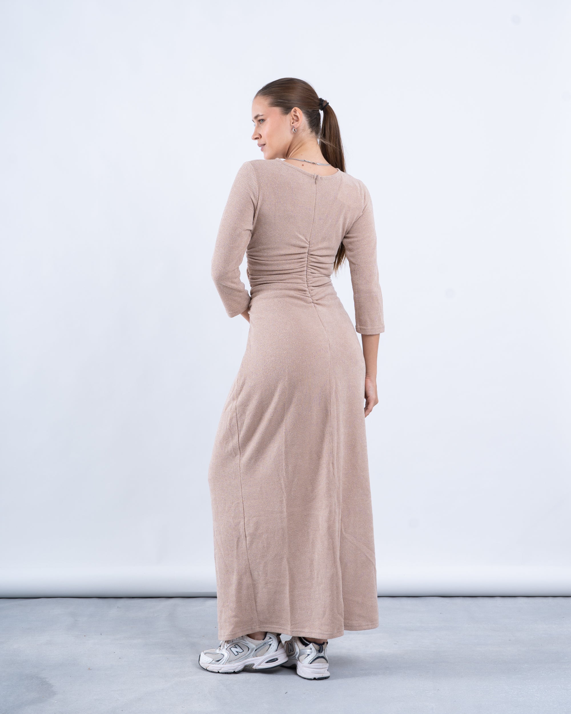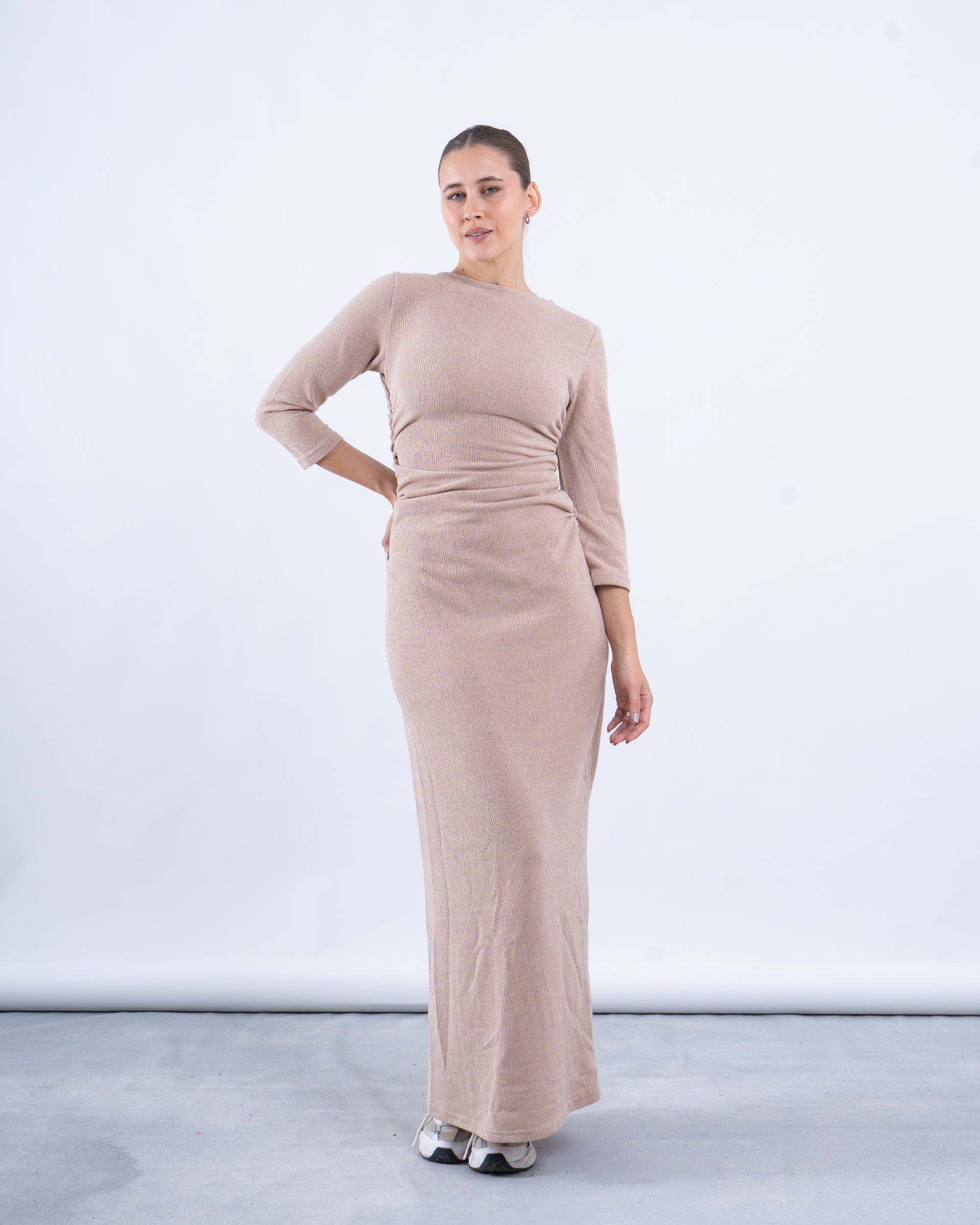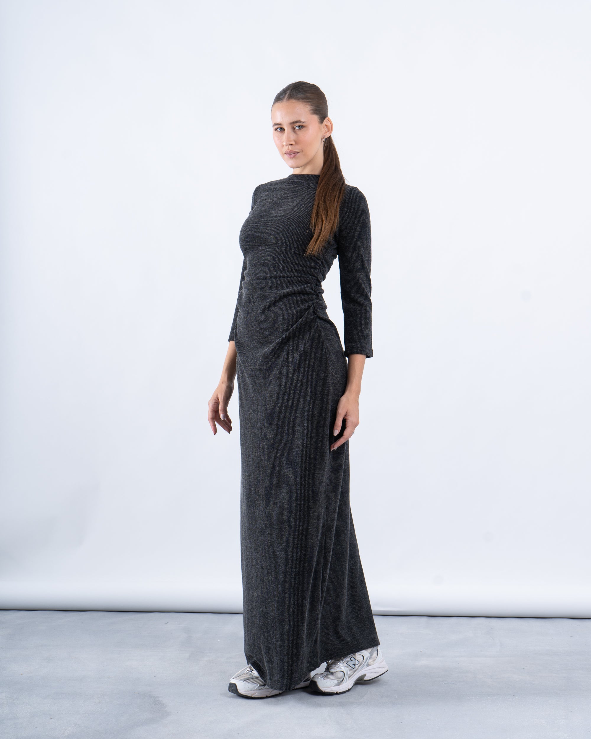 This elegant long knit dress offers a blend of comfort and sophistication, perfect for day-to-night transitions. Featuring a fitted bodice with subtle draping at the waist, it creates a flattering silhouette. The high neckline and three-quarter sleeves add a modest, chic touch, while the soft knit fabric ensures comfort and warmth. The floor-length design makes it a graceful choice for any occasion.