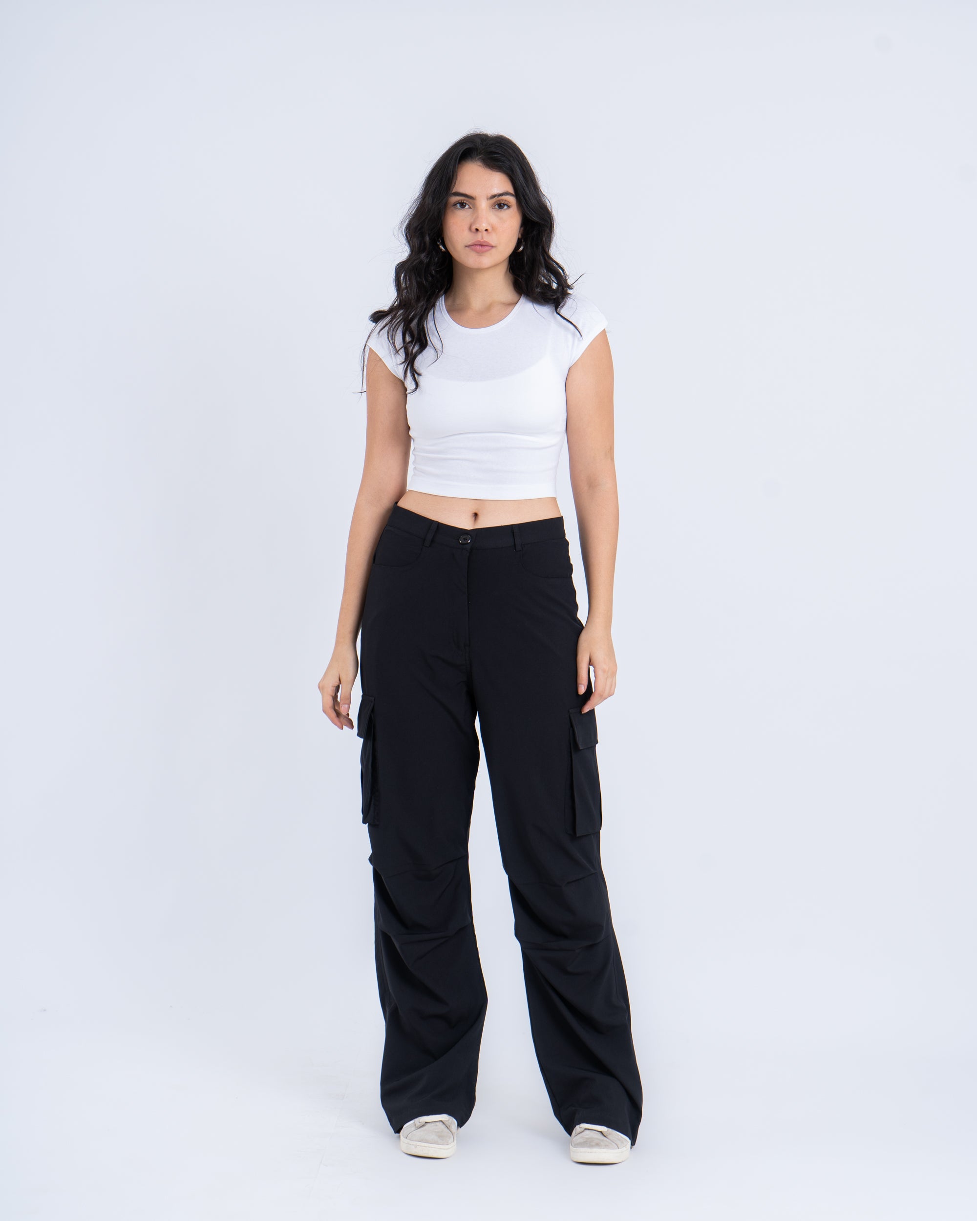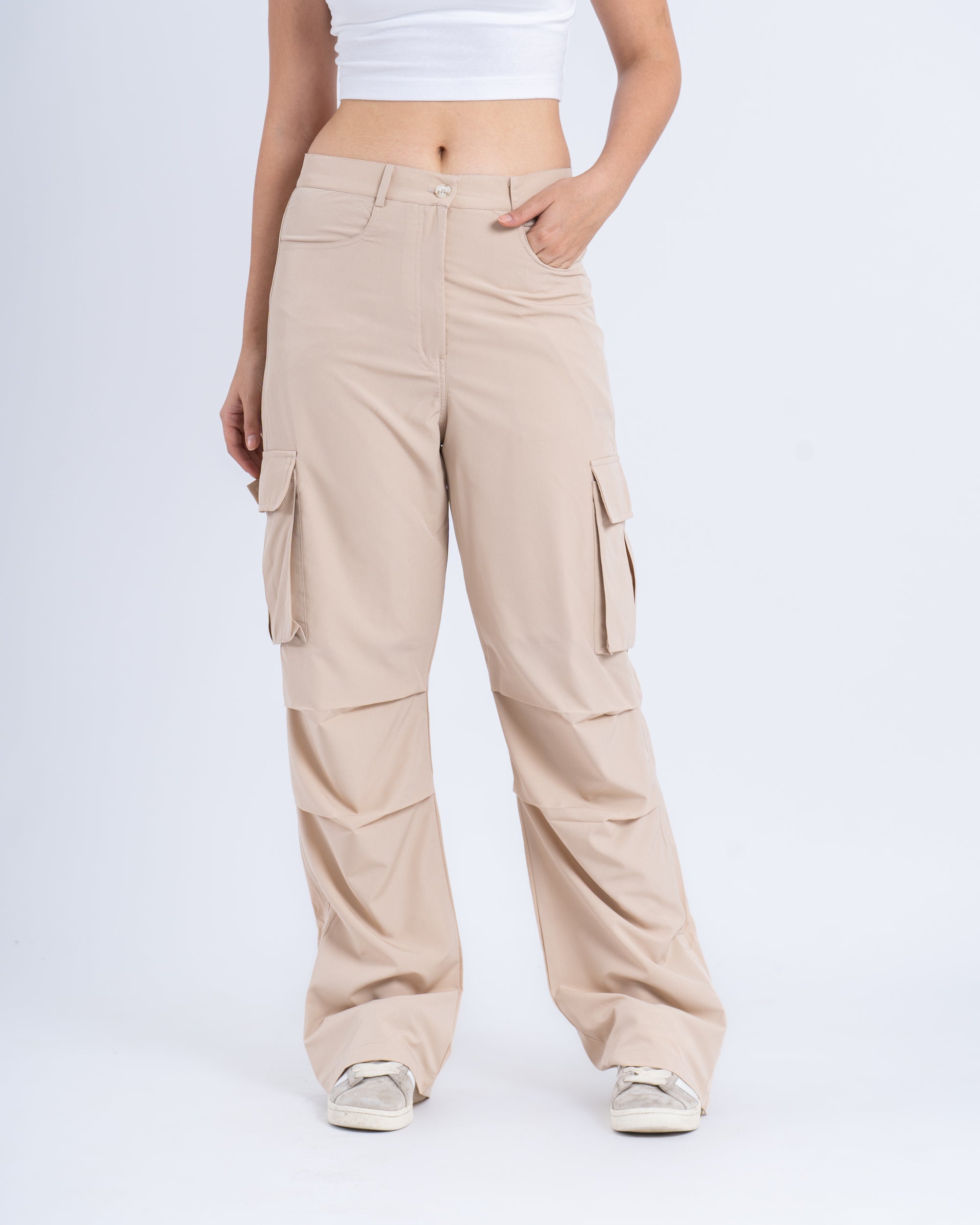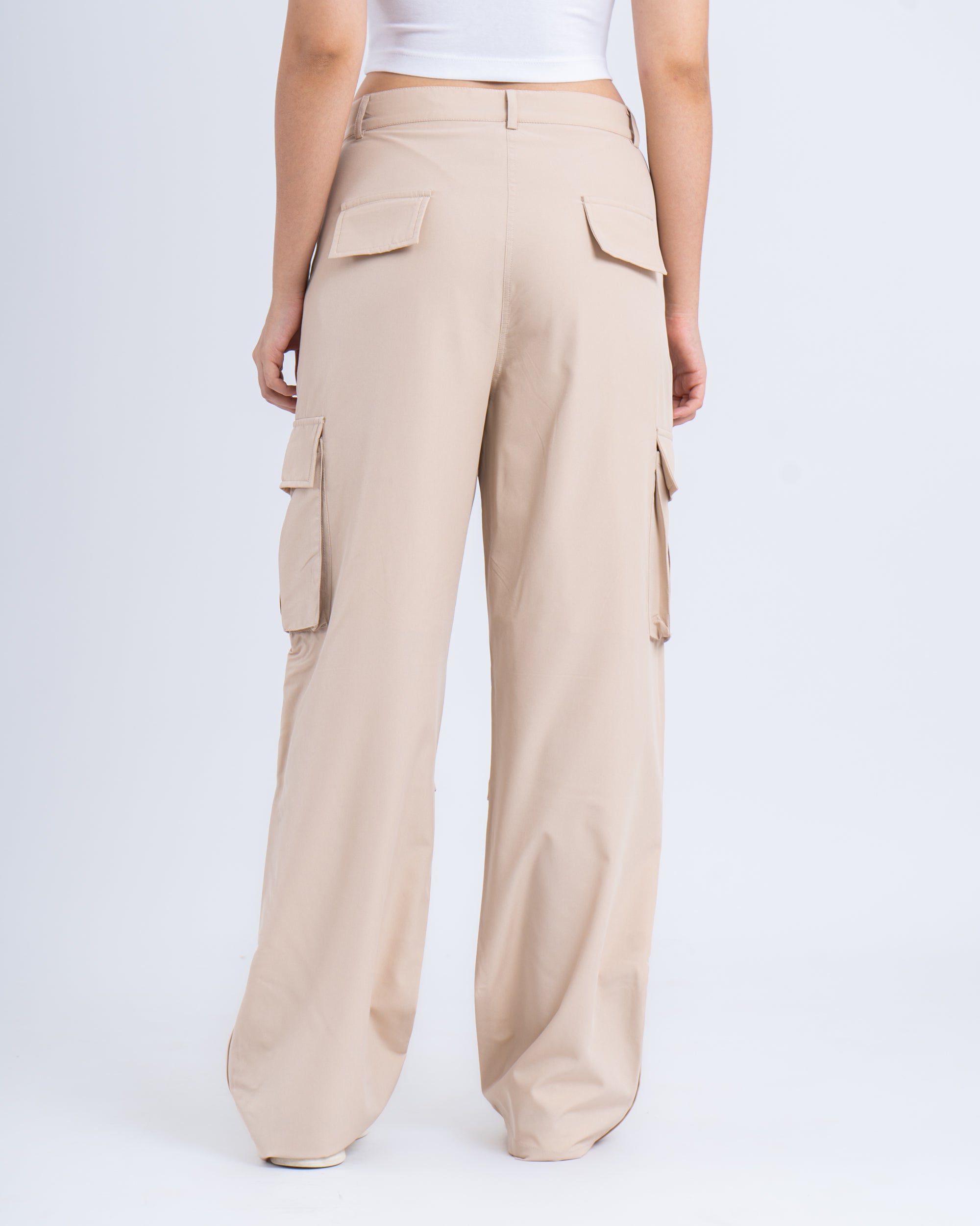 • Details: Large cargo pockets, adjustable waistband, available in black and beige.