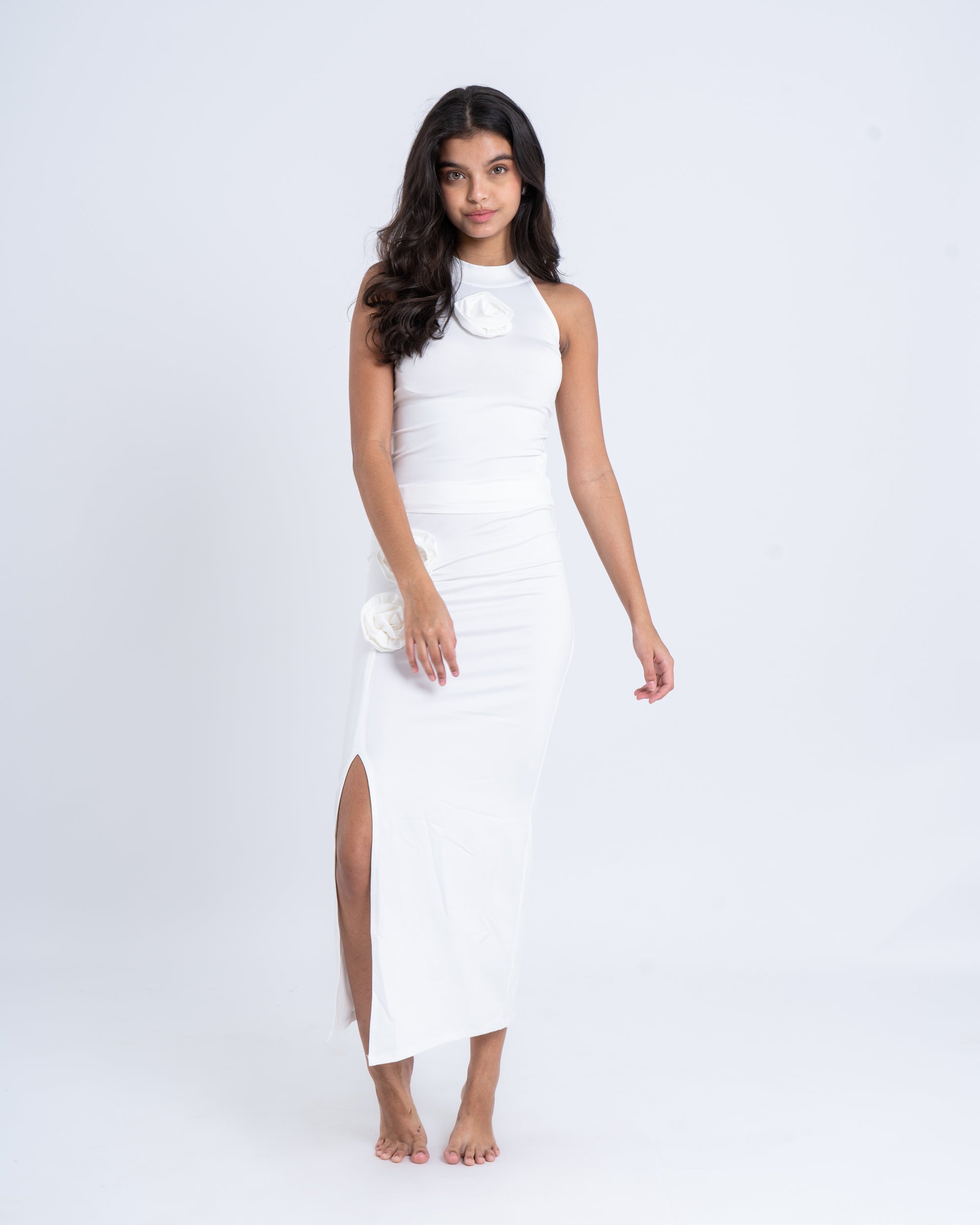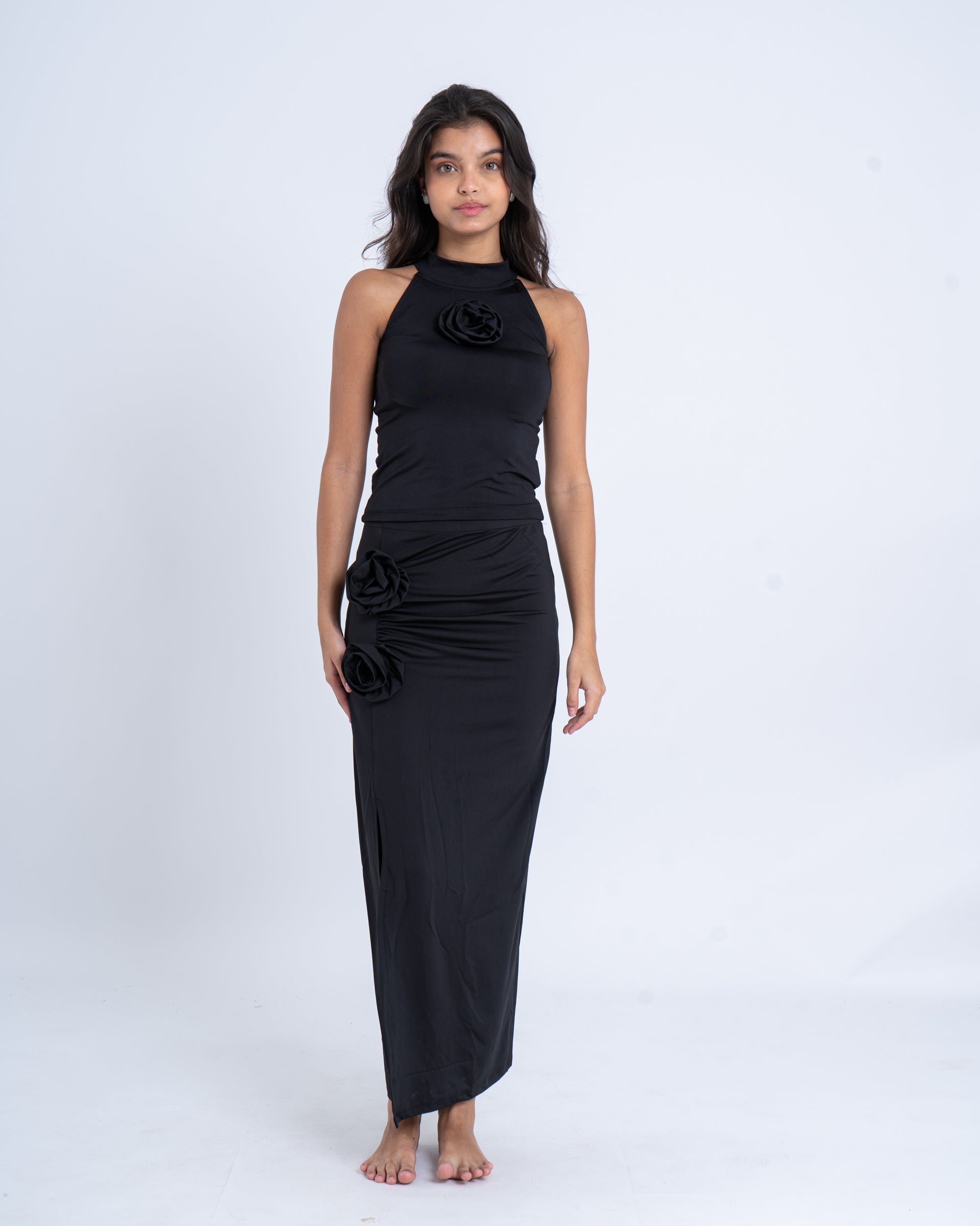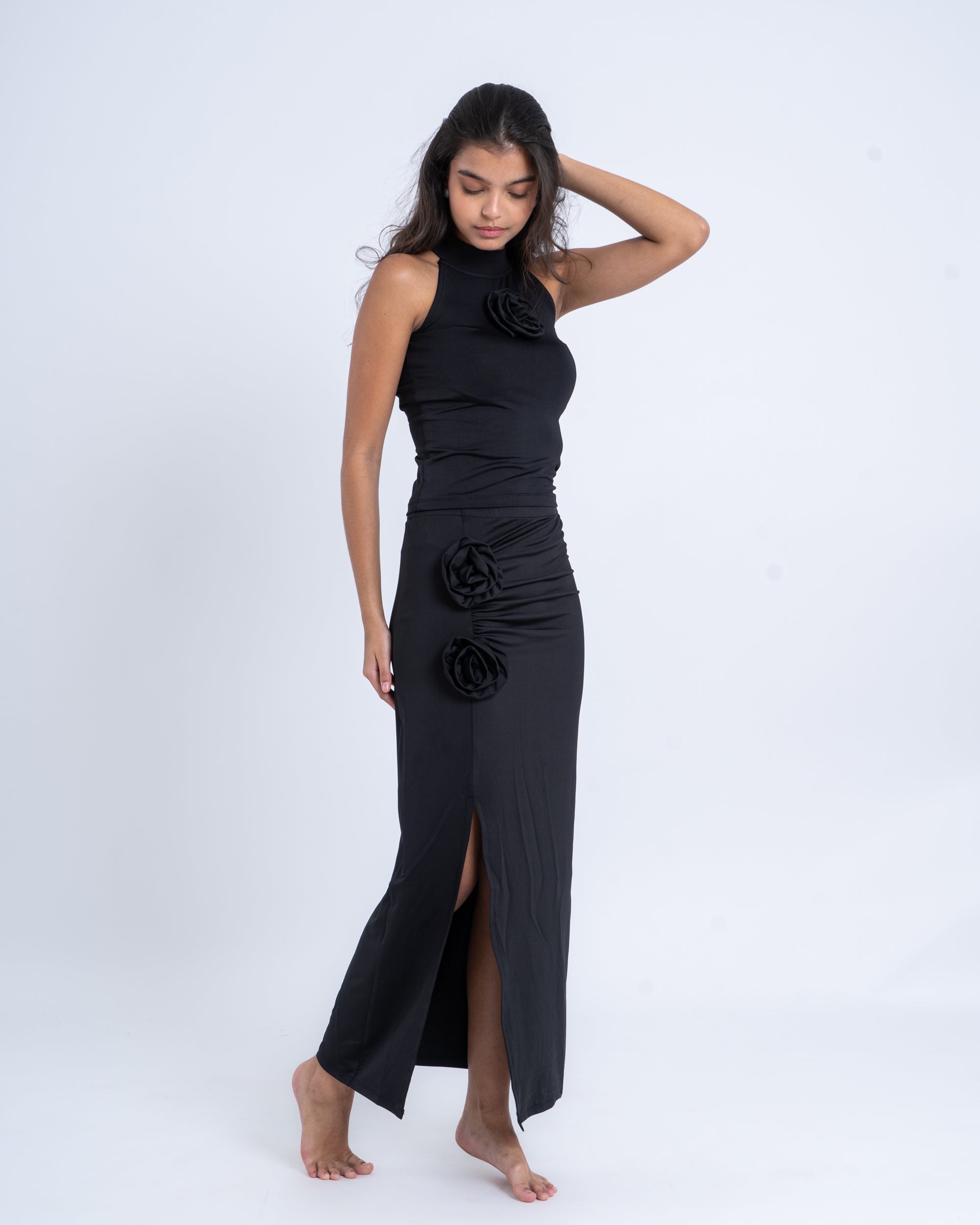 Elevate your style with this stunning high-neck maxi skirt set, available in classic black,camel and white. The dress features elegant floral appliqués that add a touch of romance to the look, while the high slit provides an alluring yet sophisticated detail. The body-hugging silhouette and ruching along the waist flatter the figure, making this set perfect for special occasions.