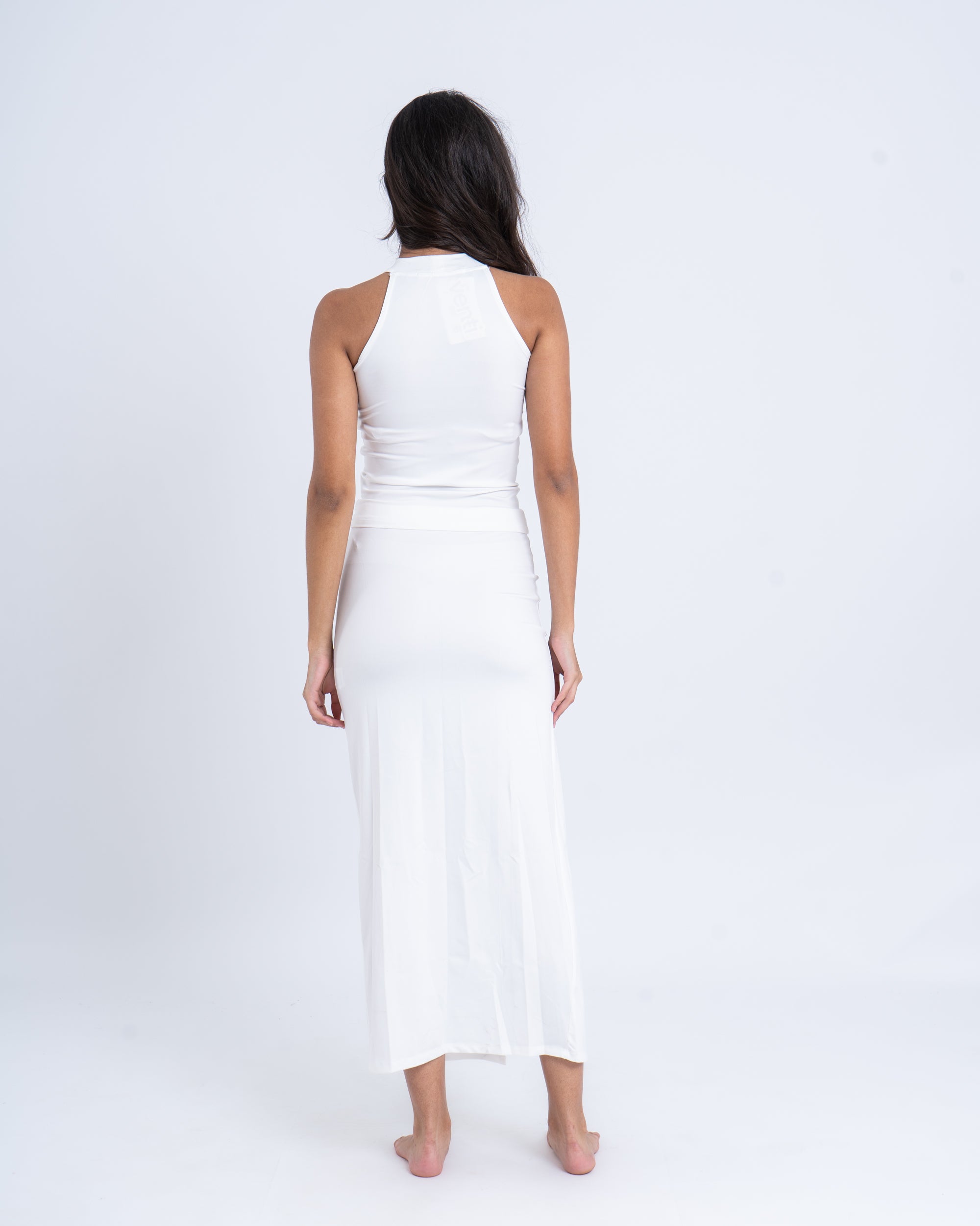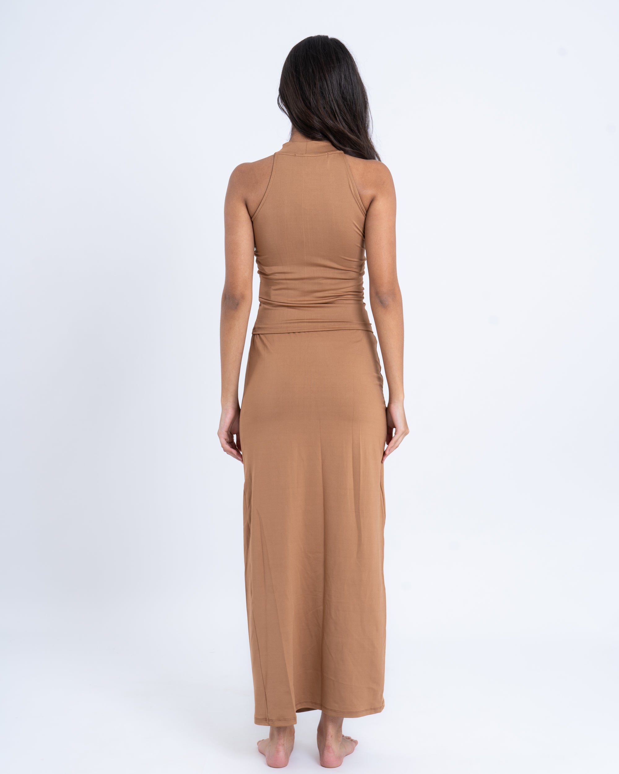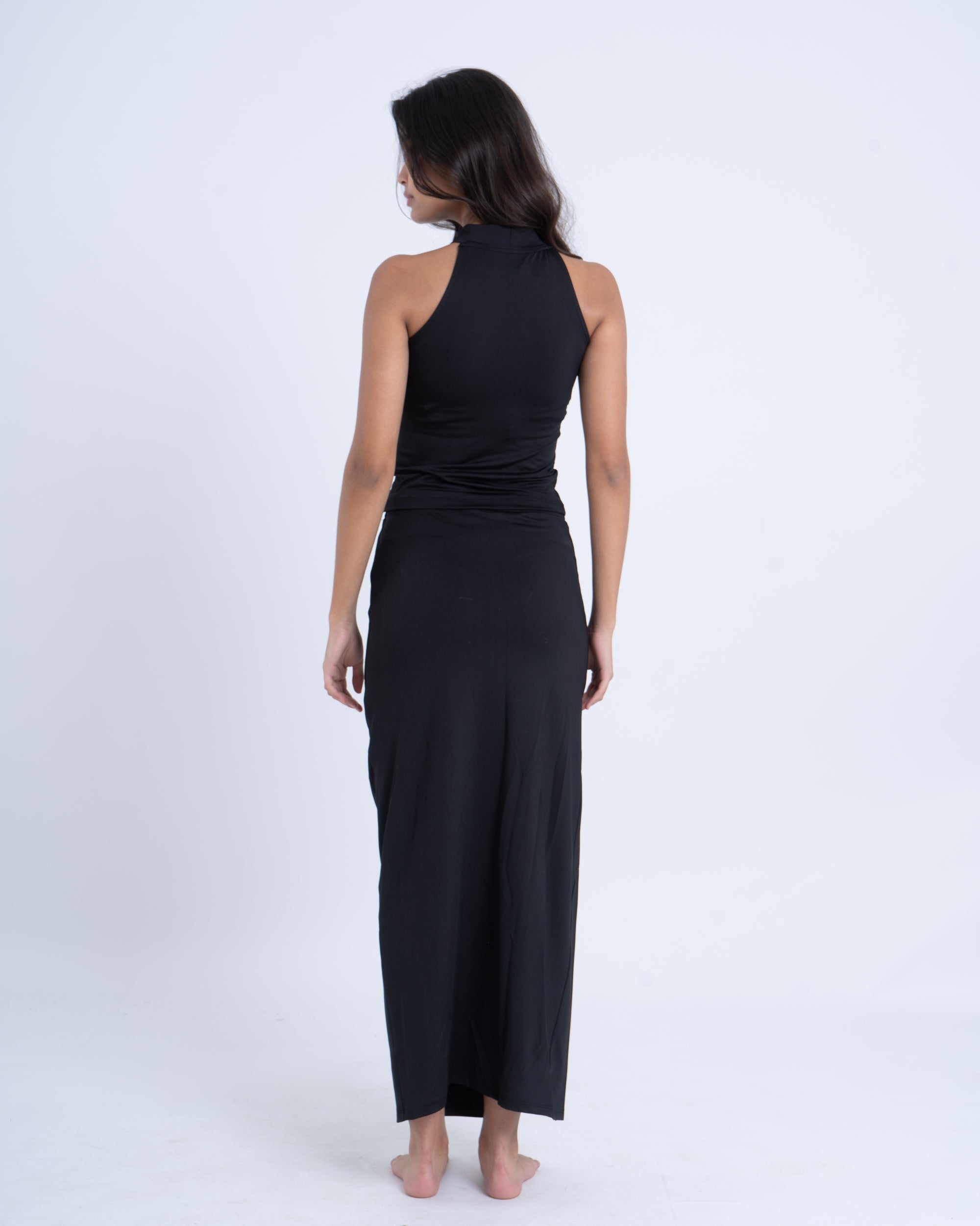 Elevate your style with this stunning high-neck maxi skirt set, available in classic black,camel and white. The dress features elegant floral appliqués that add a touch of romance to the look, while the high slit provides an alluring yet sophisticated detail. The body-hugging silhouette and ruching along the waist flatter the figure, making this set perfect for special occasions.