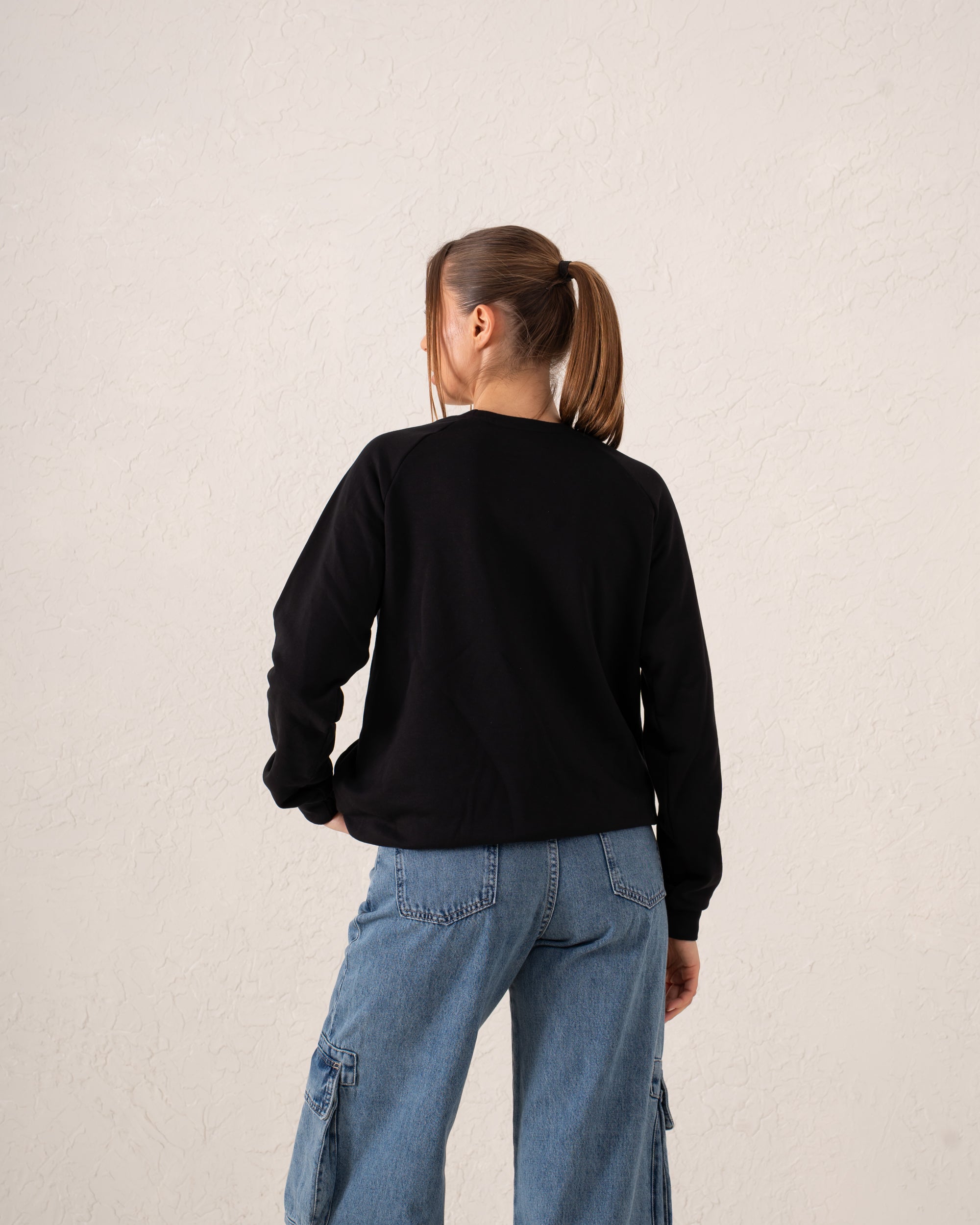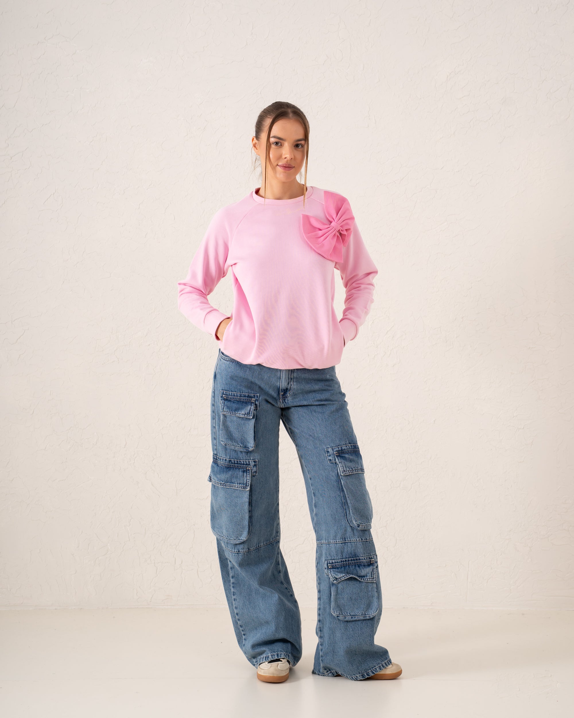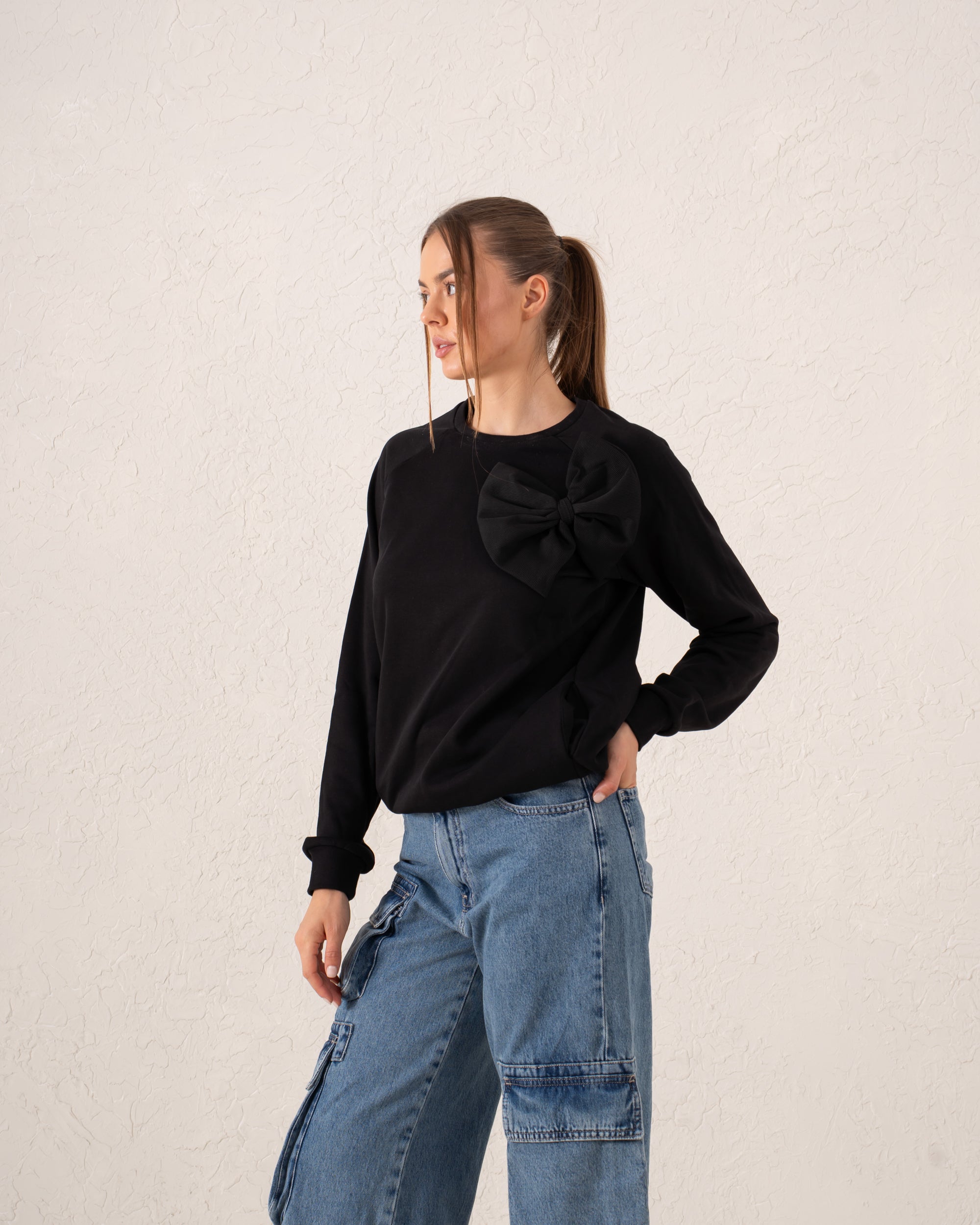 • Details: Large 3D bow detail at the shoulder, crew neckline, ribbed cuffs and hem