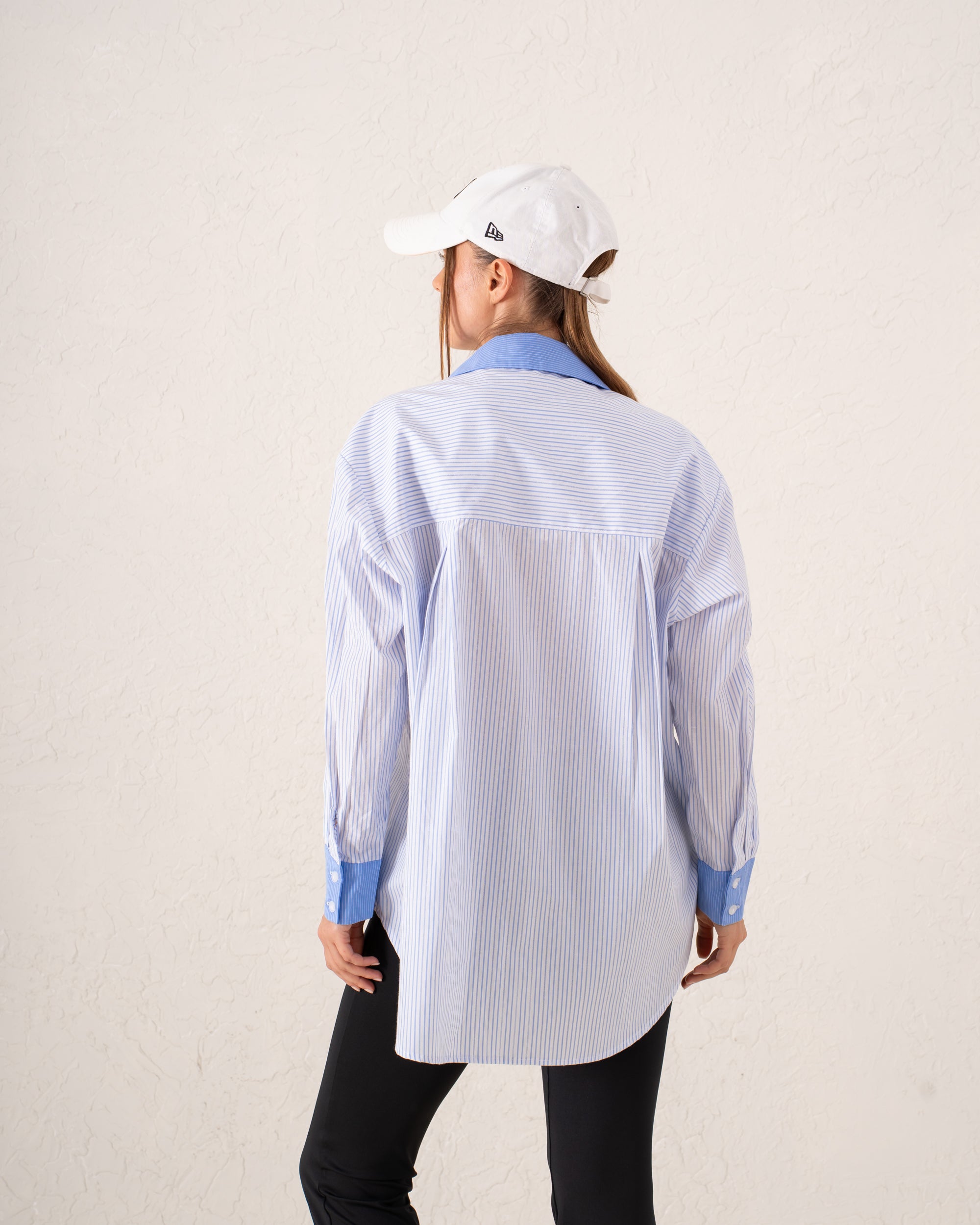A sharp, elevated take on the classic striped shirt. This oversized button-down features a striking contrast collar and cuffs, giving a cool, borrowed-from-the-boys look with a feminine twist.