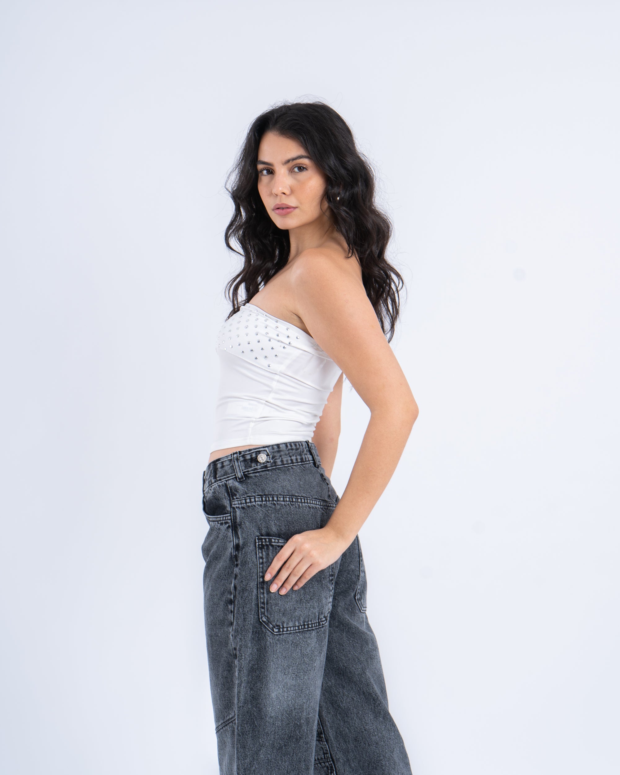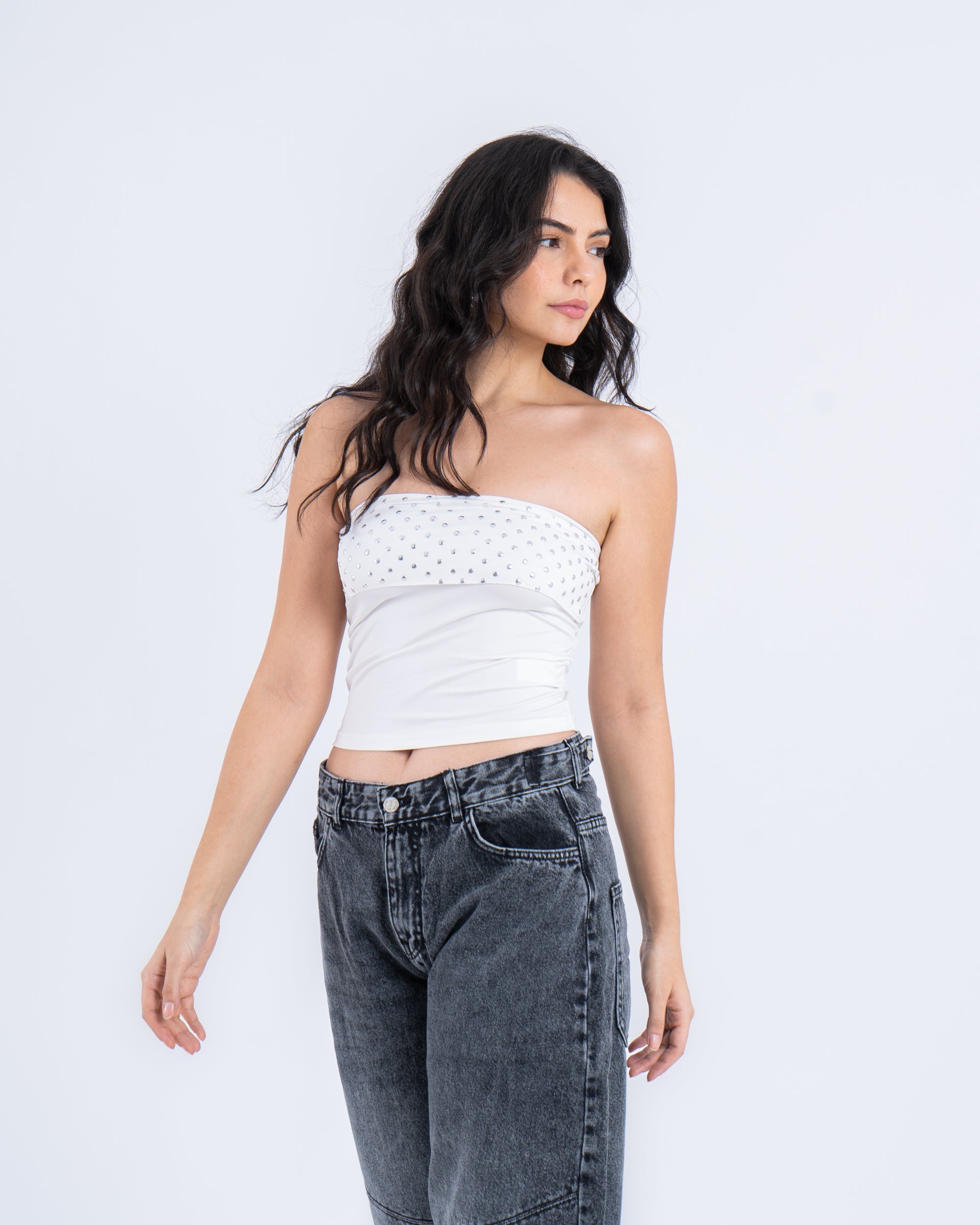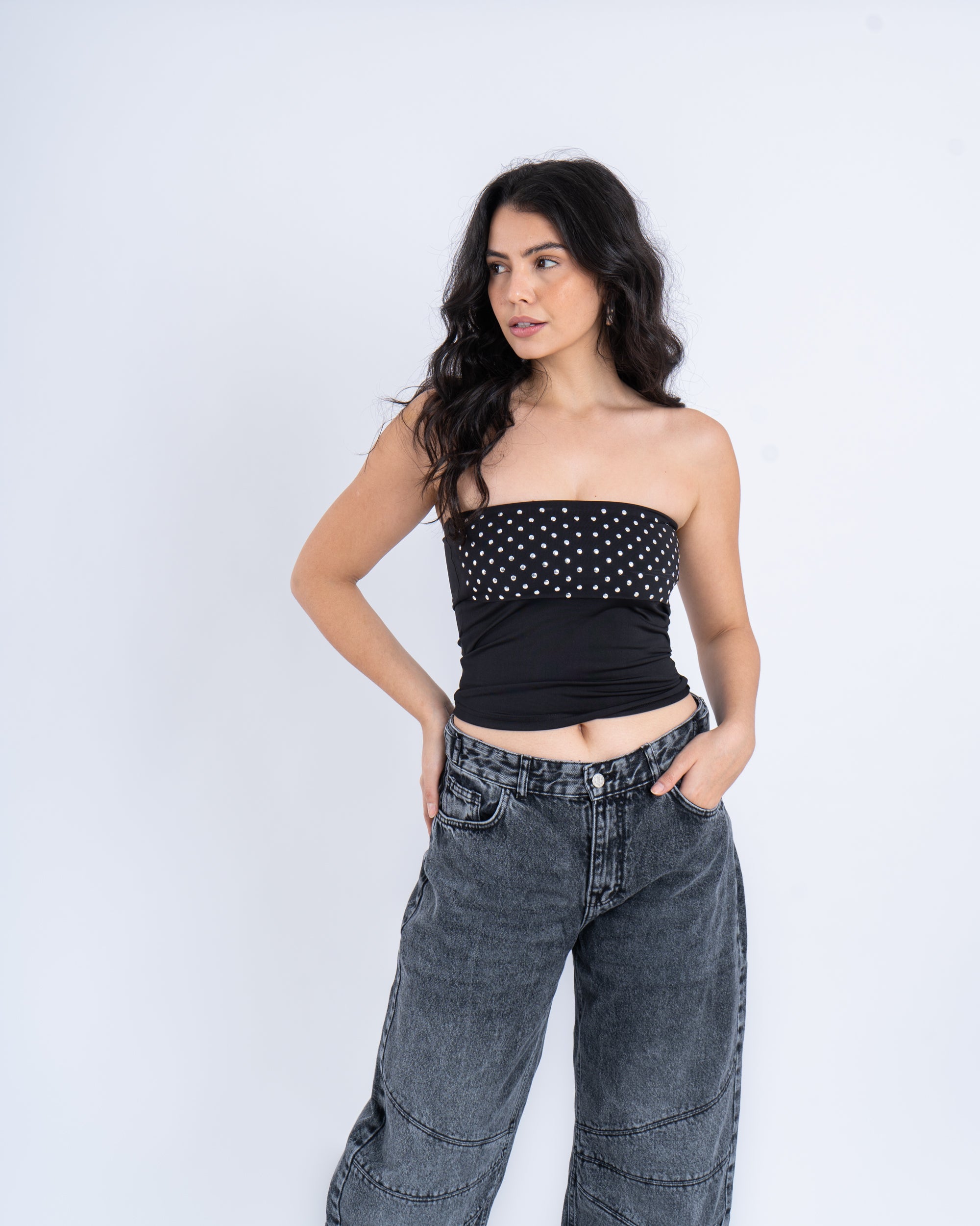 This studded tube top is a versatile and trendy piece, perfect for layering or wearing on its own for a bold statement. The top features delicate studs along the front, adding a touch of sparkle and edge to your outfit. Whether for casual looks or a night out, this top brings effortless style.