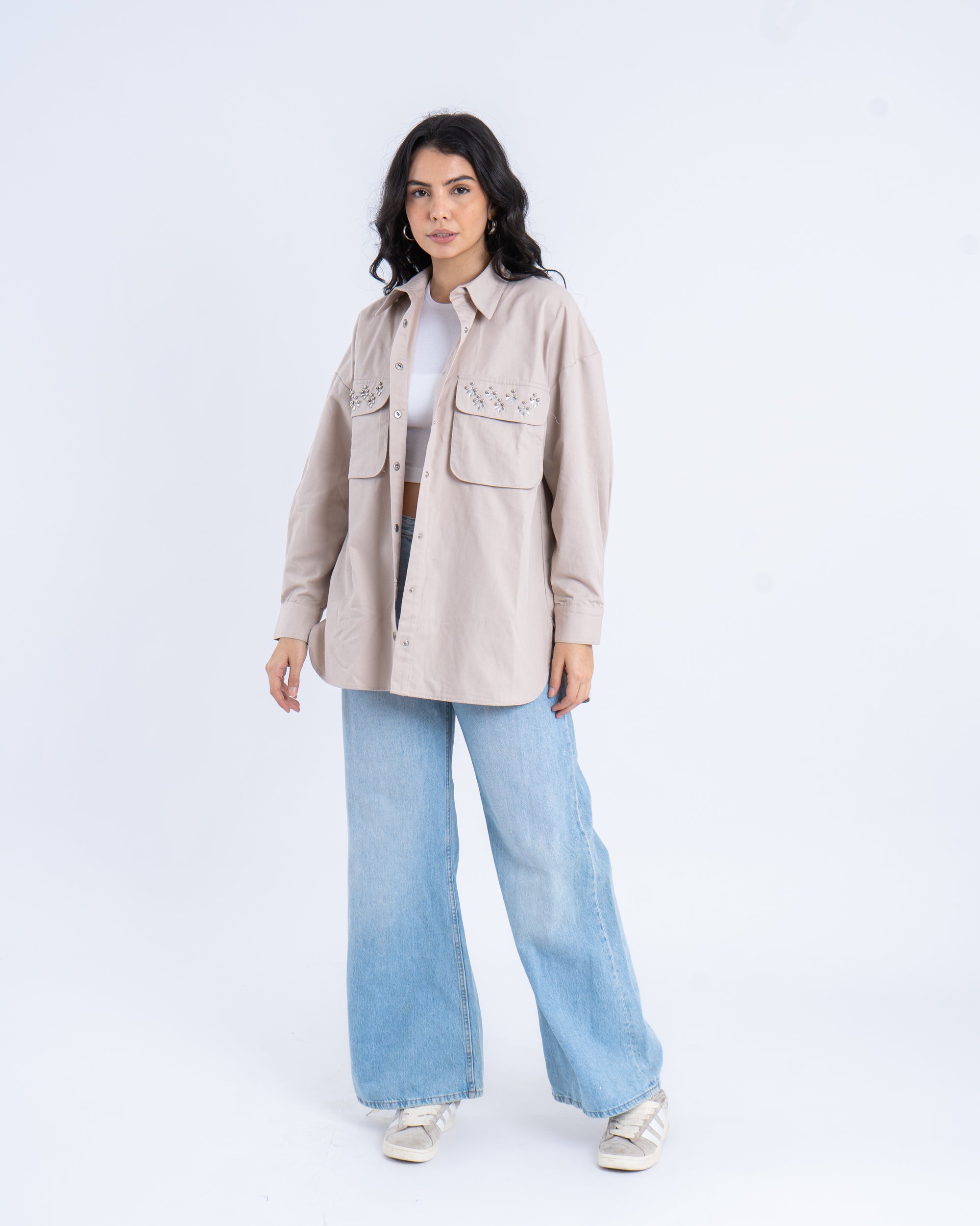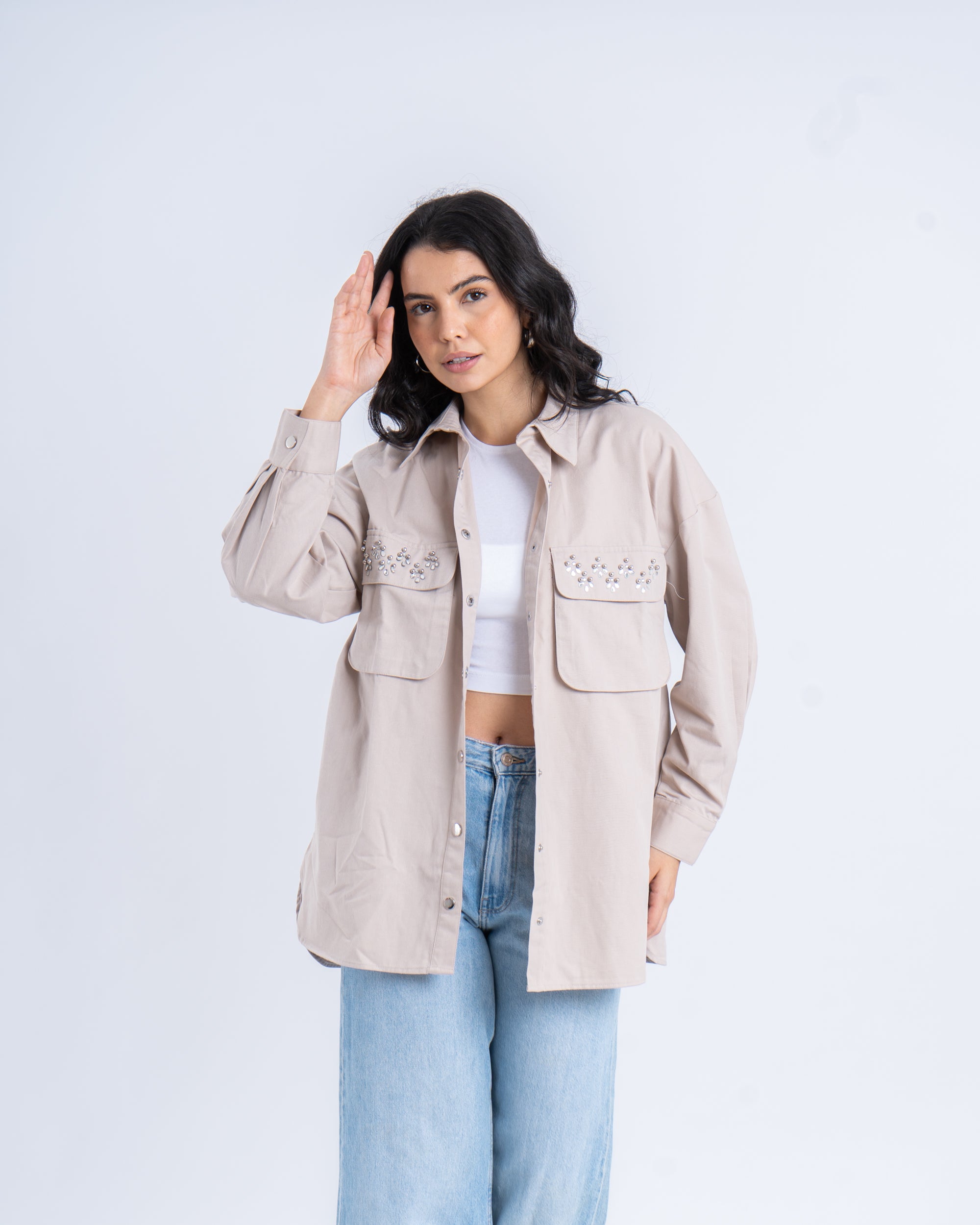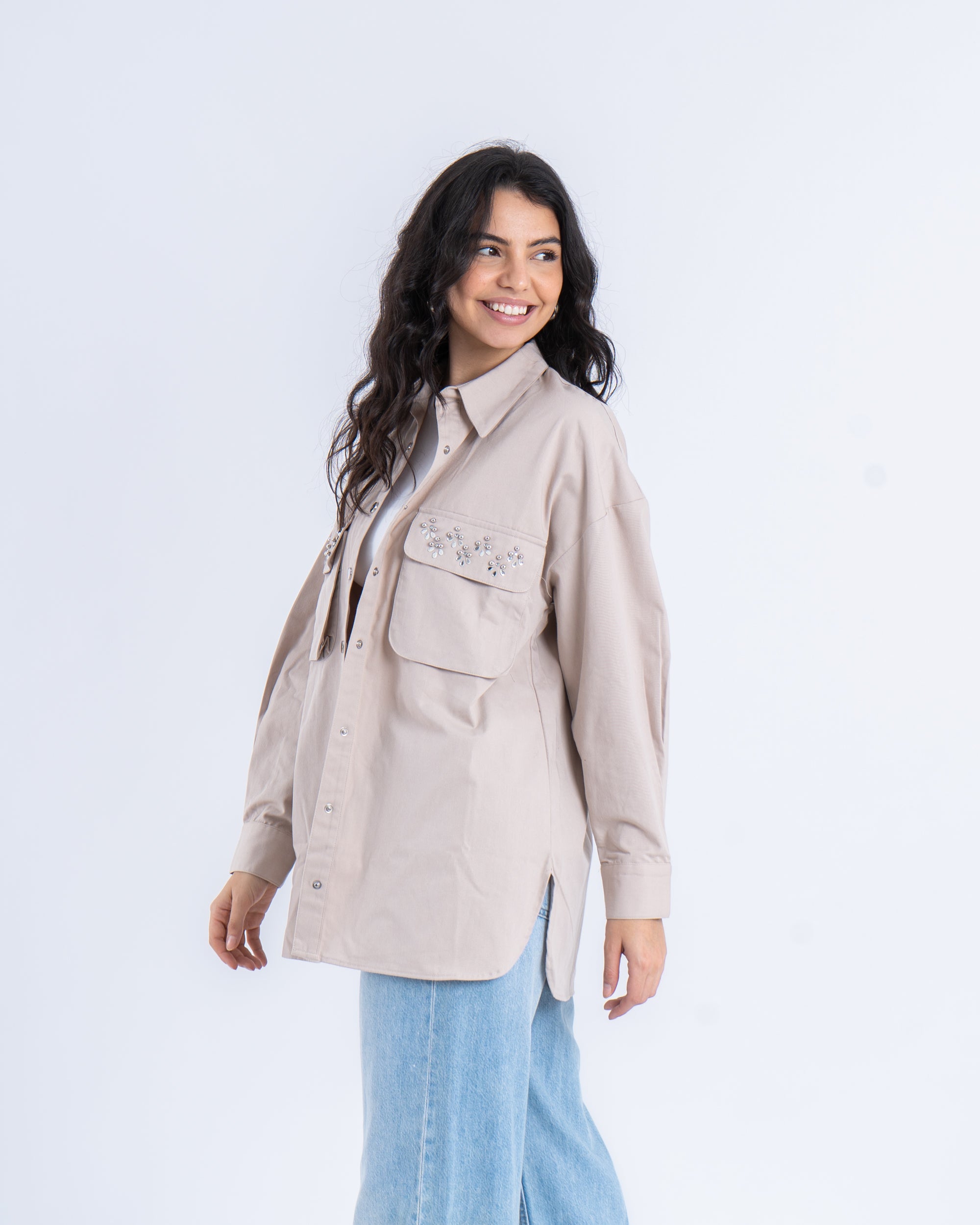 This oversized twill shirt is a perfect blend of casual style and chic detailing. Featuring a relaxed, loose fit, the shirt is adorned with delicate embellishments on the chest pockets, adding a subtle sparkle to the look. Crafted from sturdy twill fabric, this shirt offers structure while maintaining a comfortable, effortless feel. The snap-button front closure and oversized silhouette make it an ideal layering piece for casual outfits.