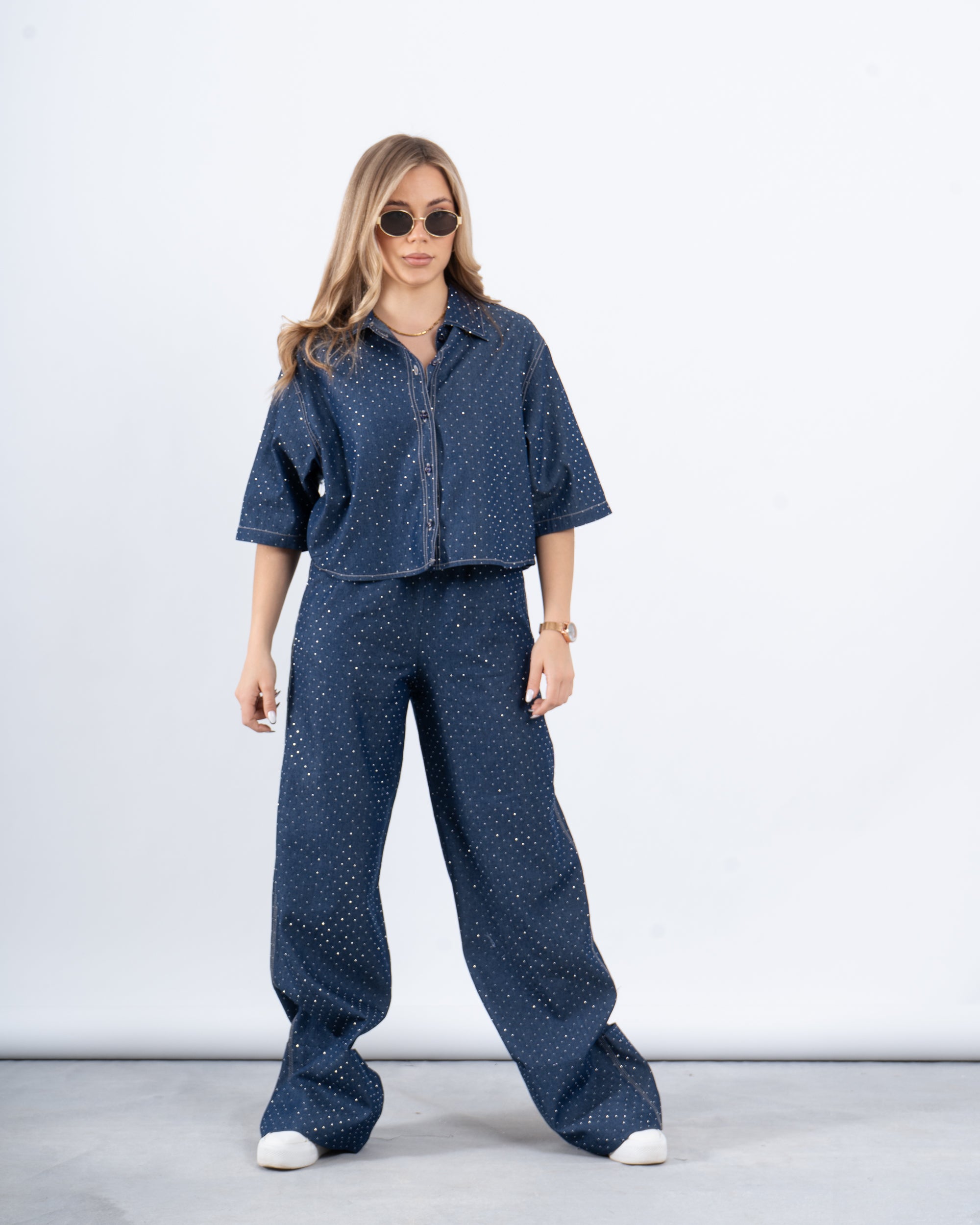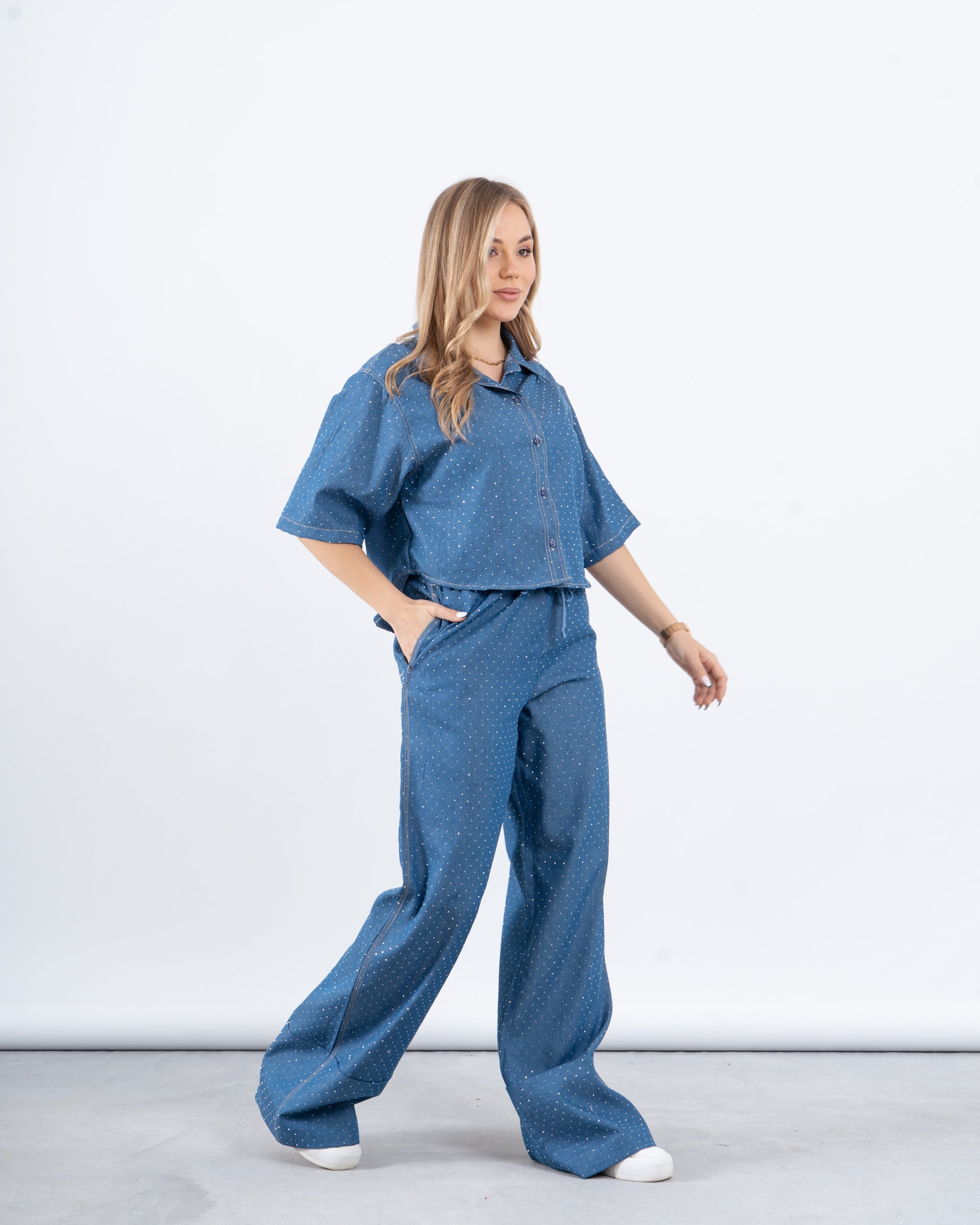 A stylish cropped shirt with a relaxed silhouette and a subtle sparkling finish that catches the light. Designed with short sleeves and a classic button-down front, this piece combines comfort with effortless chic. Made from lightweight fabric for a breezy feel.