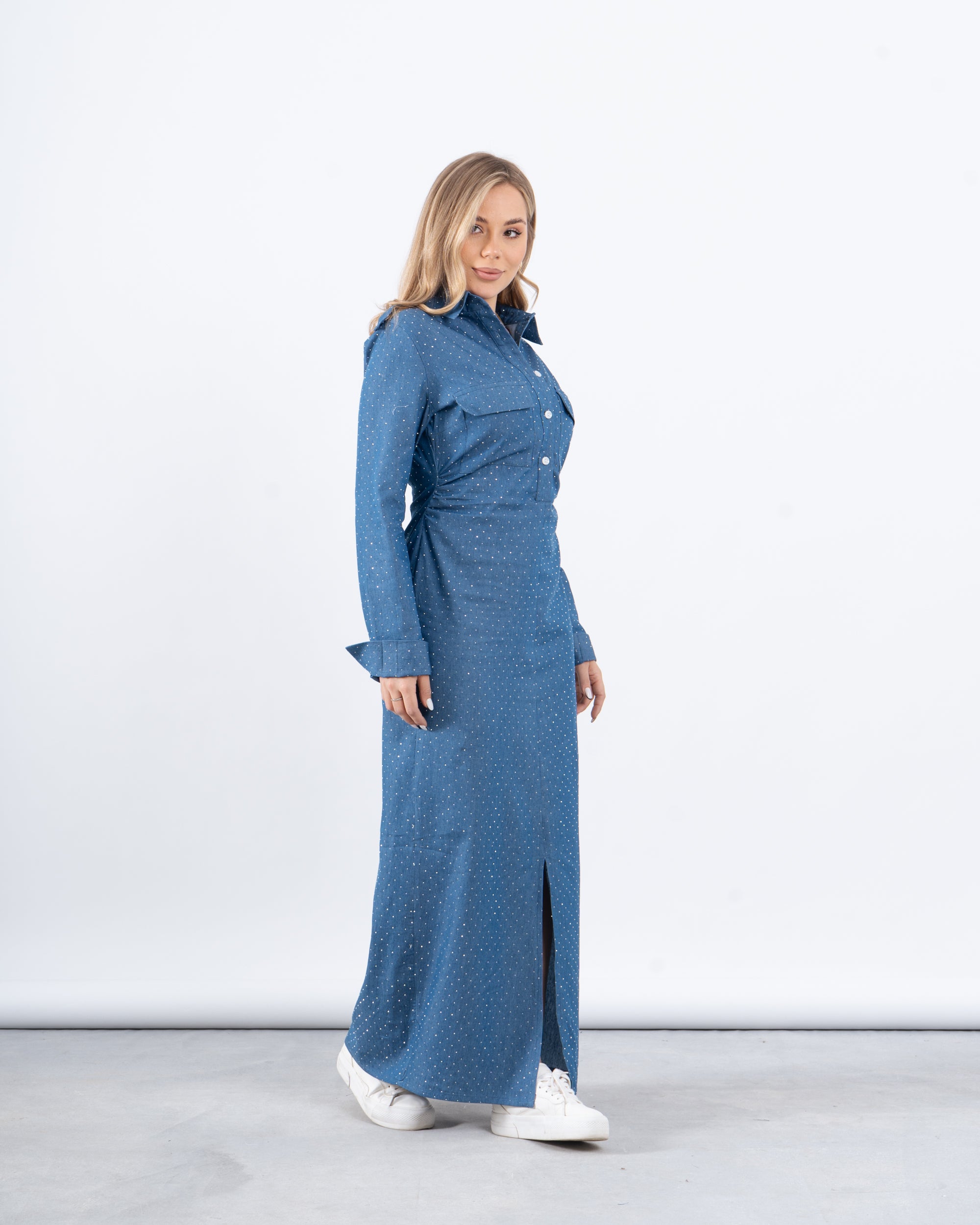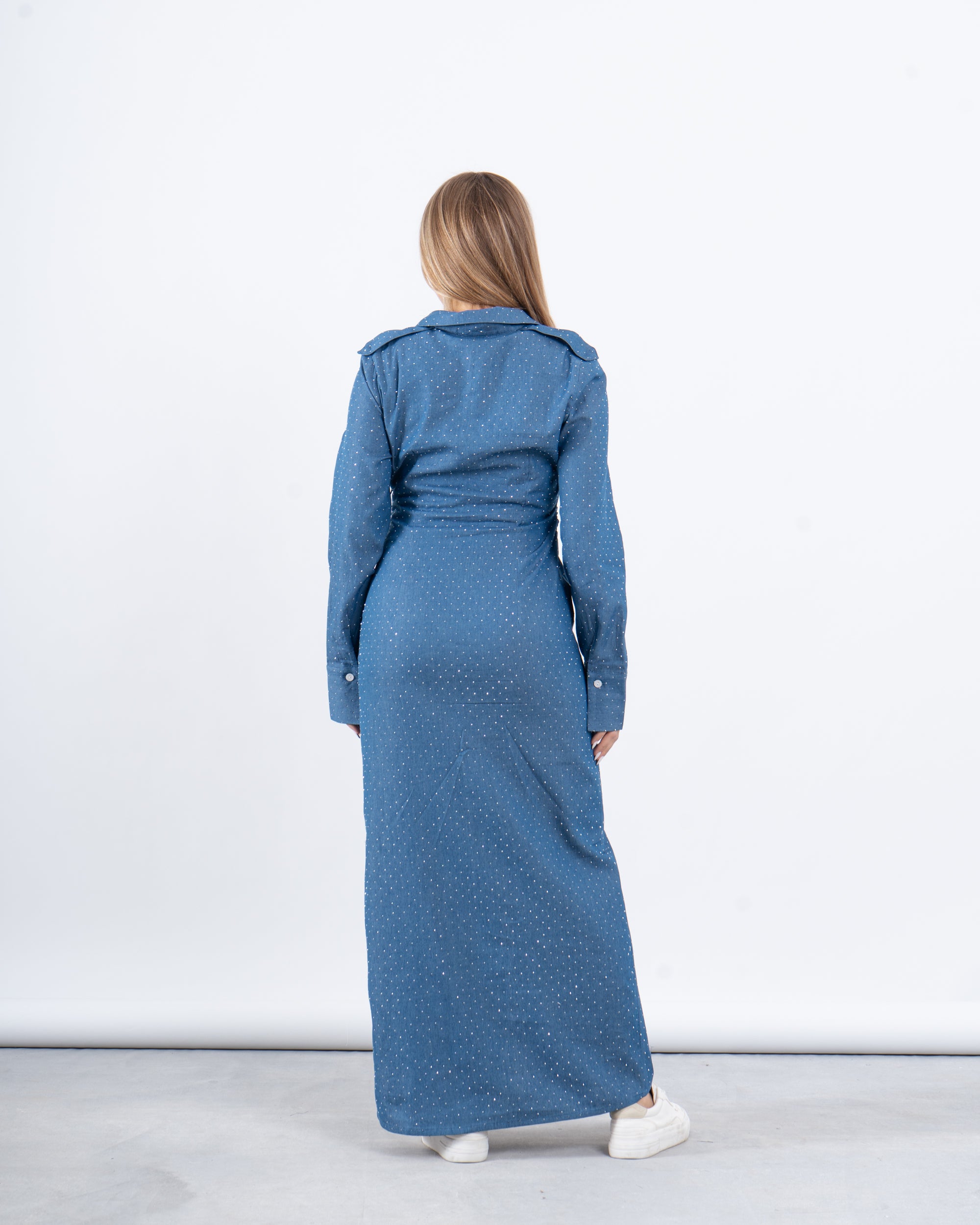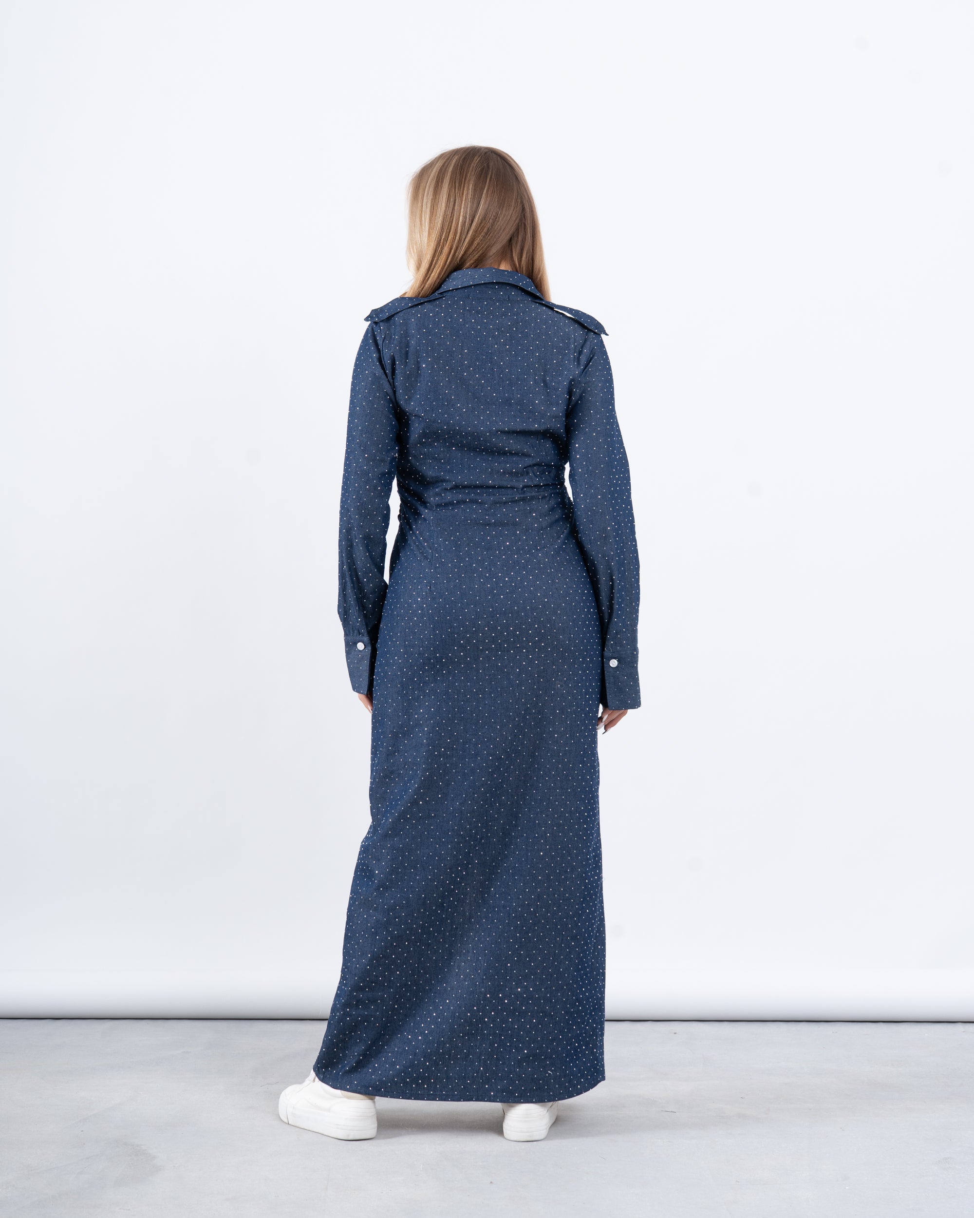 A statement piece that fuses classic denim with sparkling embellishments for a bold yet elegant look.