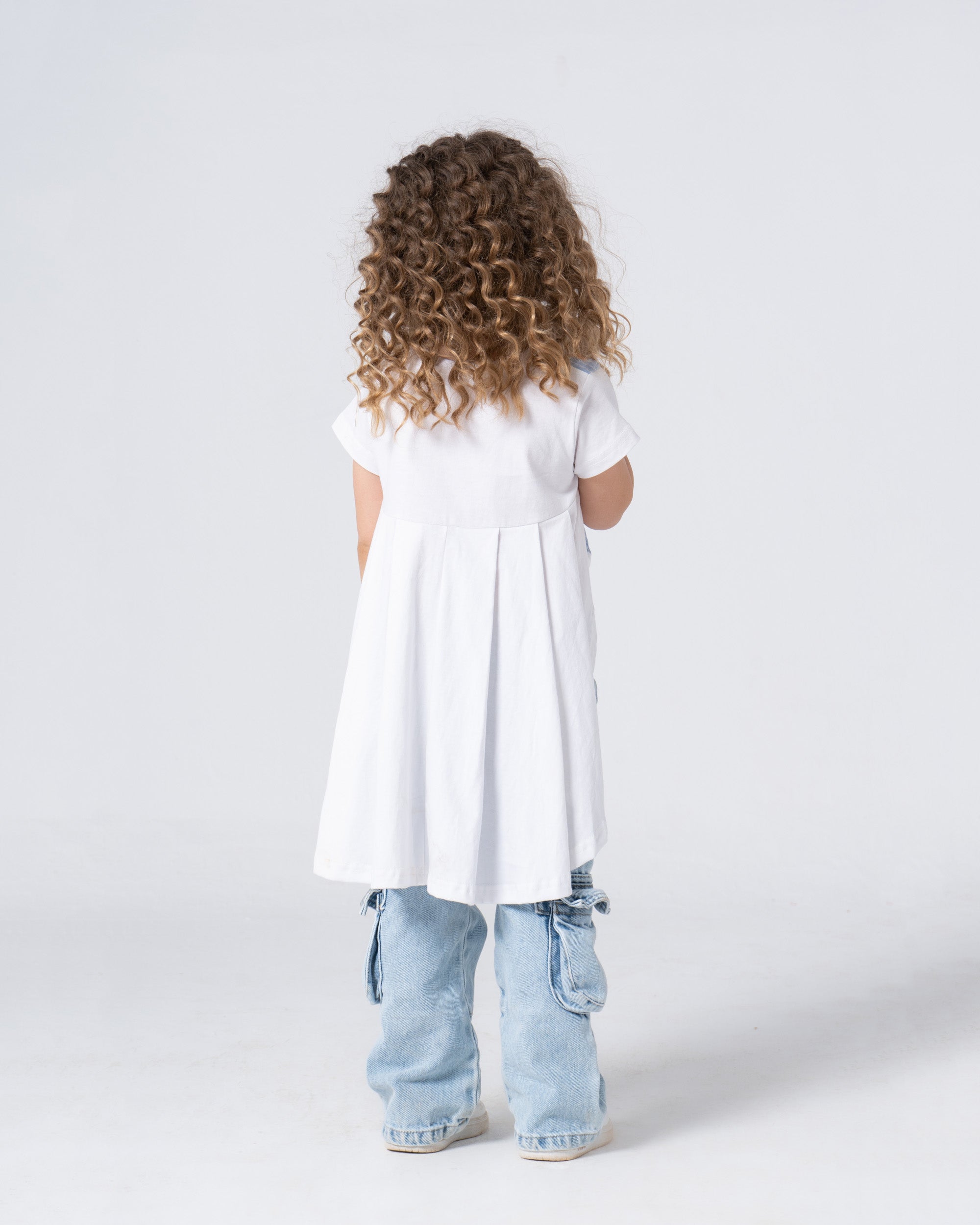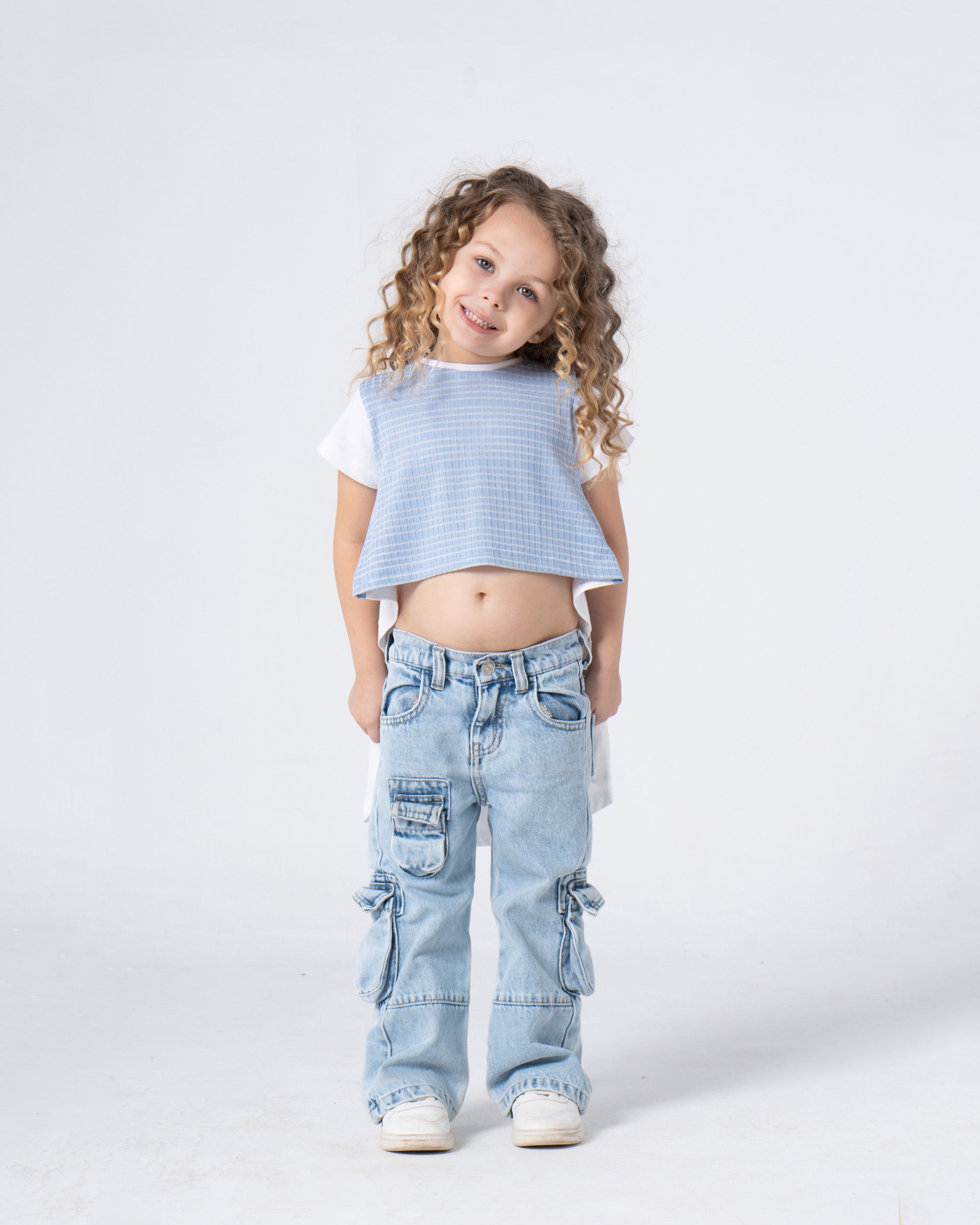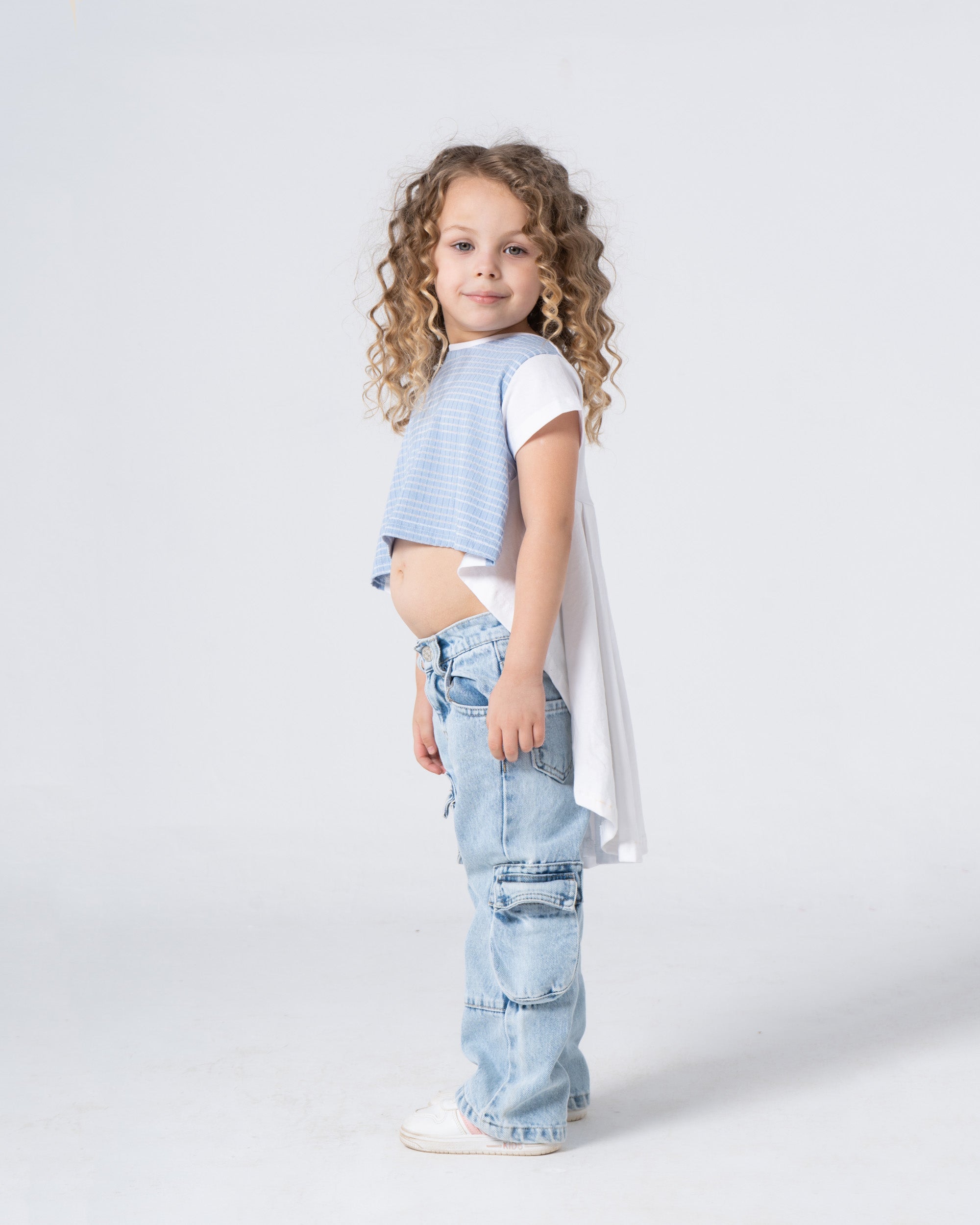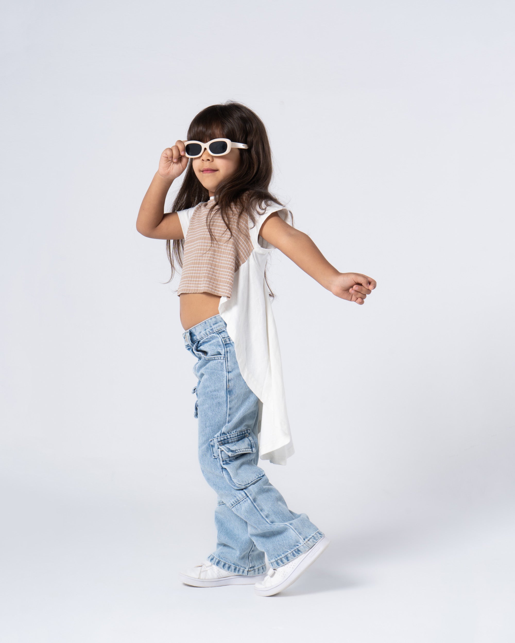 This chic beige top boasts an asymmetric cut with bold stripes running along the front. The long, flowing back creates a stylish, flattering look that can be dressed up or down for any occasion