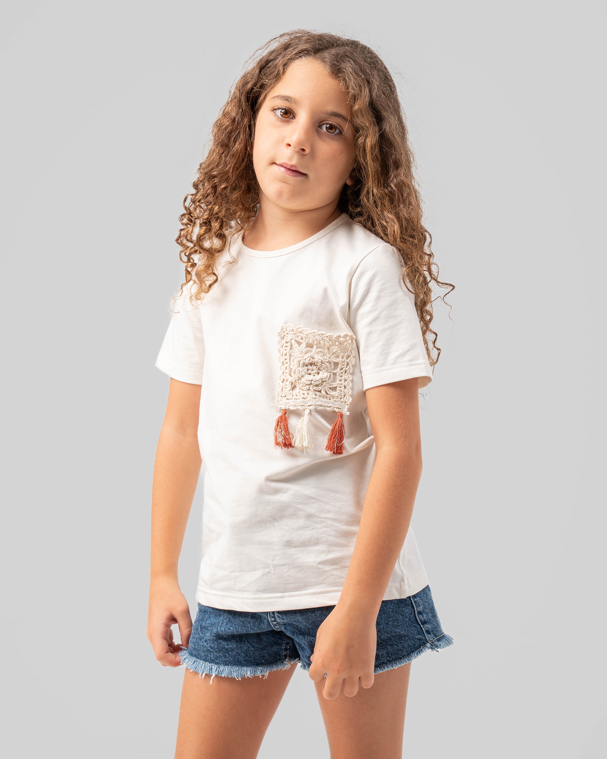 This off-white girls' tee features a sweet crocheted pocket detail for a touch of feminine flair. The classic t-shirt silhouette is elevated by the delicate crochet accent, creating a versatile, everyday piece. This soft, comfortable top looks great dressed up or down.