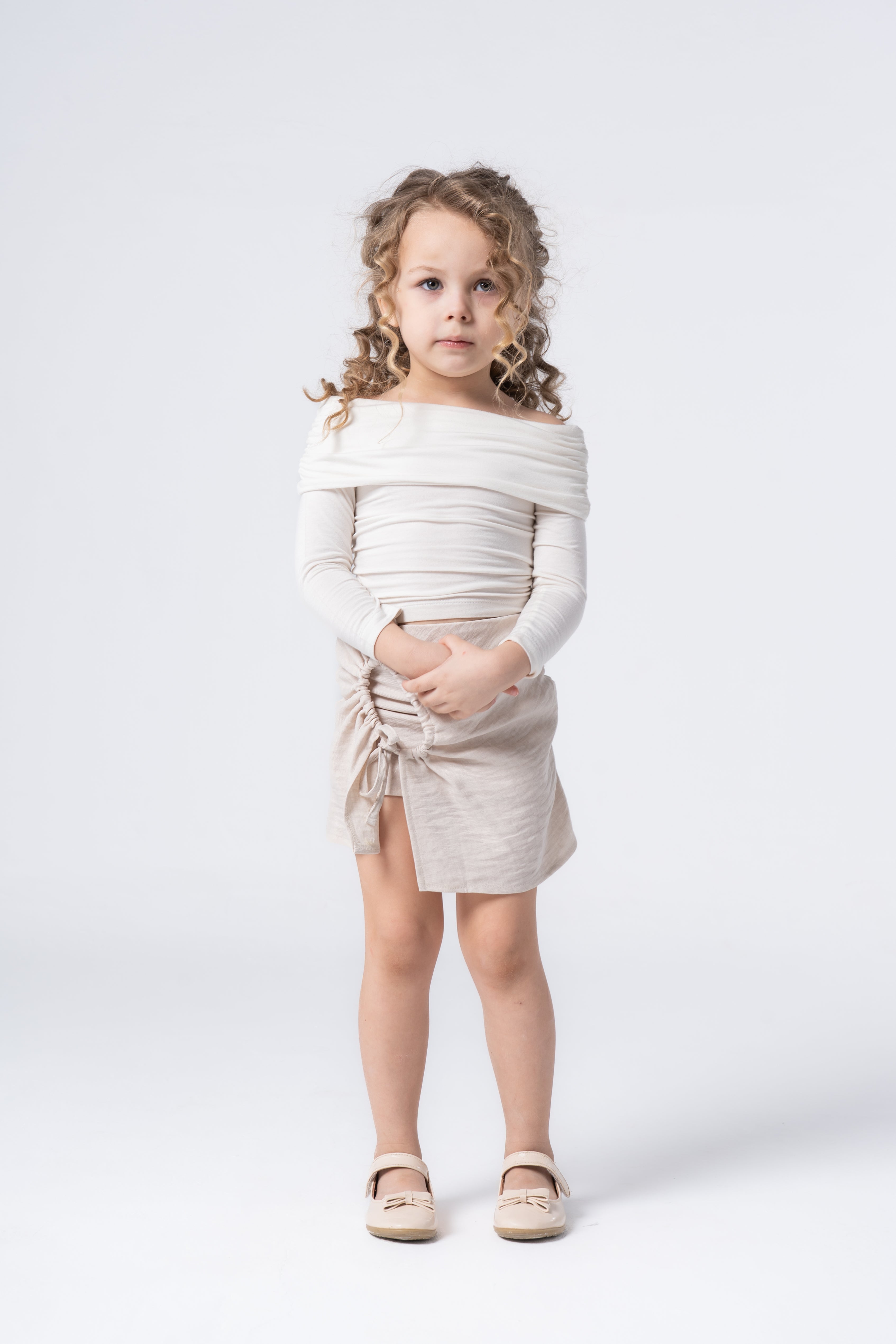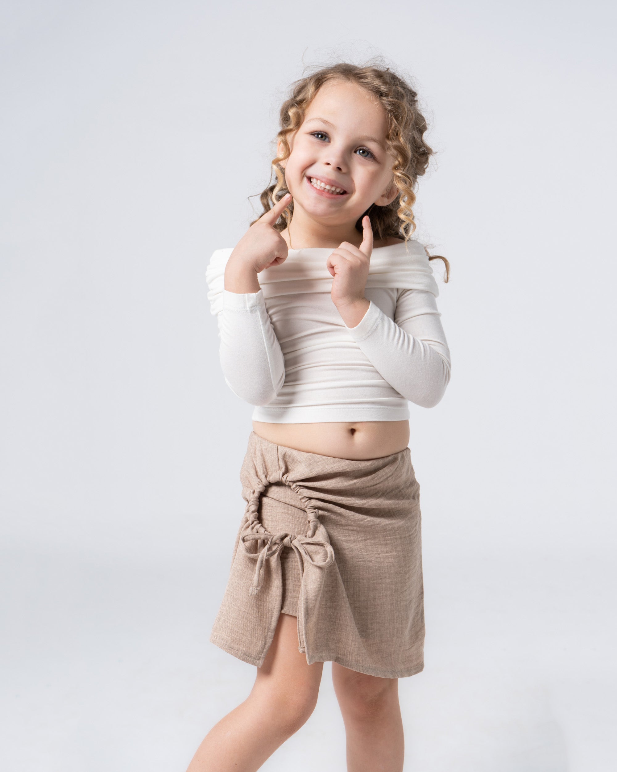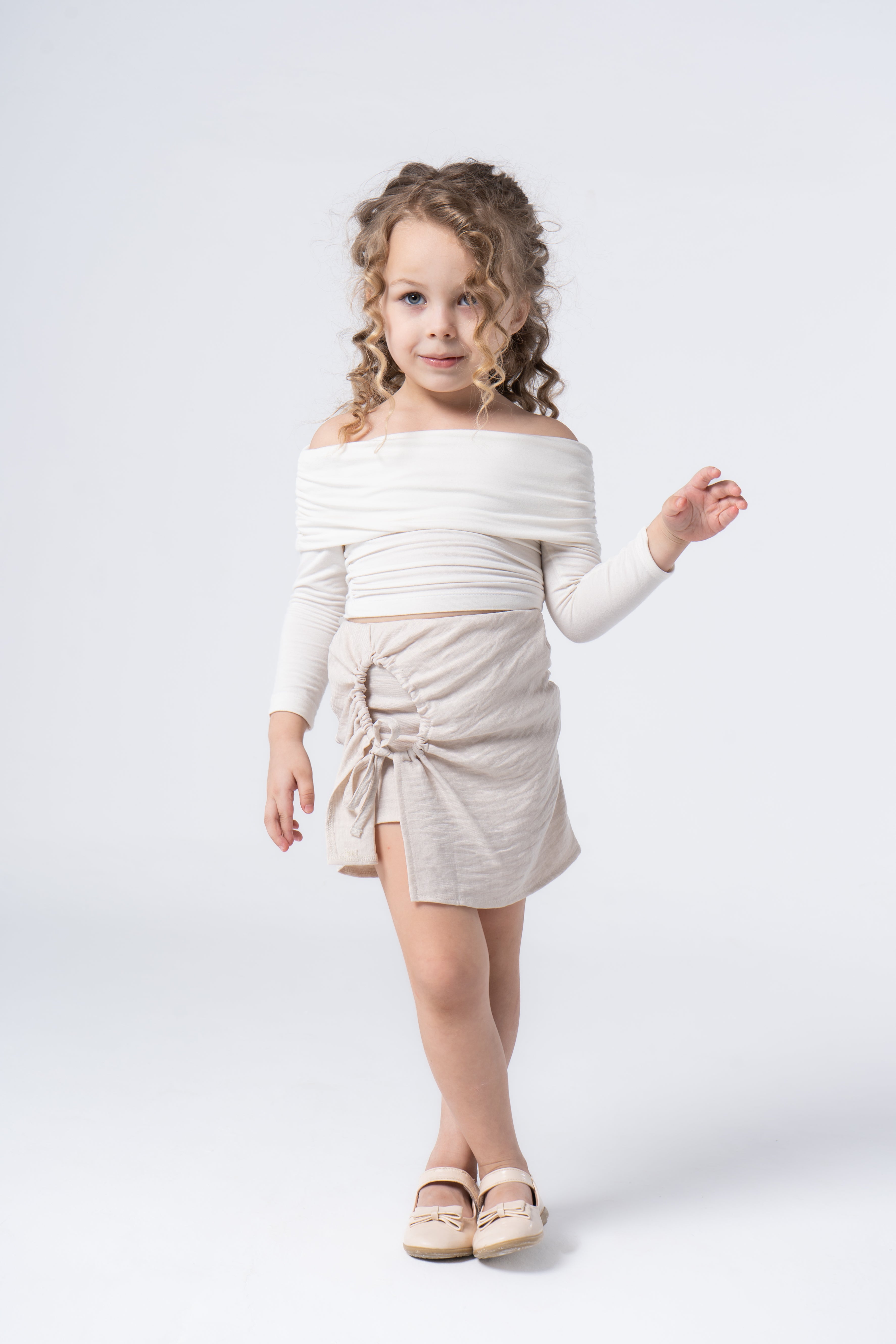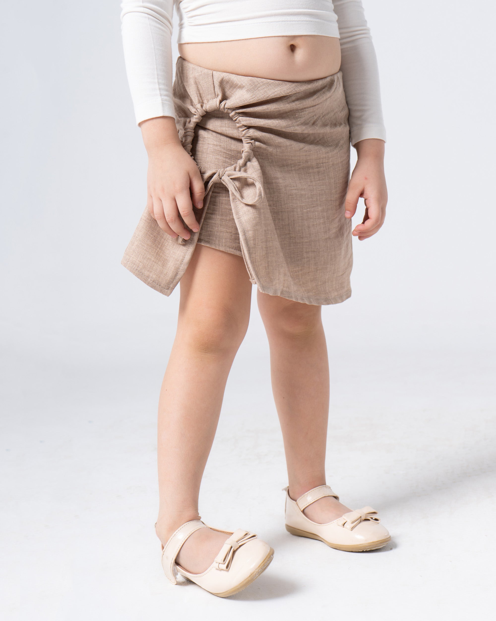 This charming beige mini skirt for girls has a stylish knot detail at the waist. The lightweight, flowy fabric creates a playful, swishy silhouette perfect for everyday wear. The knot accent adds a whimsical, on-trend finishing touch. This versatile skirt can be dressed up or down, making it a great addition to a girl's wardrobe. The flattering mini length and elastic waistband ensure a comfortable, flattering fit.