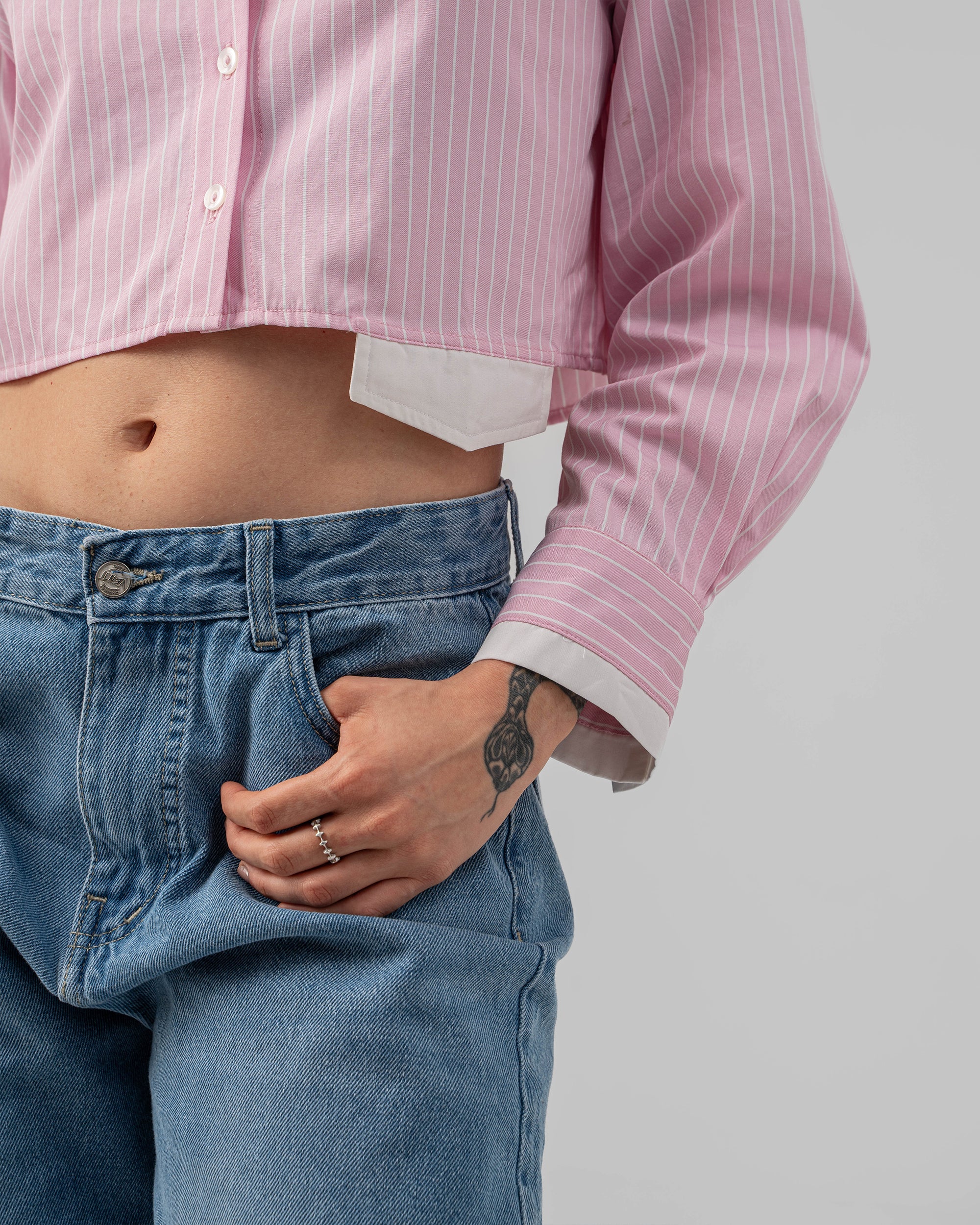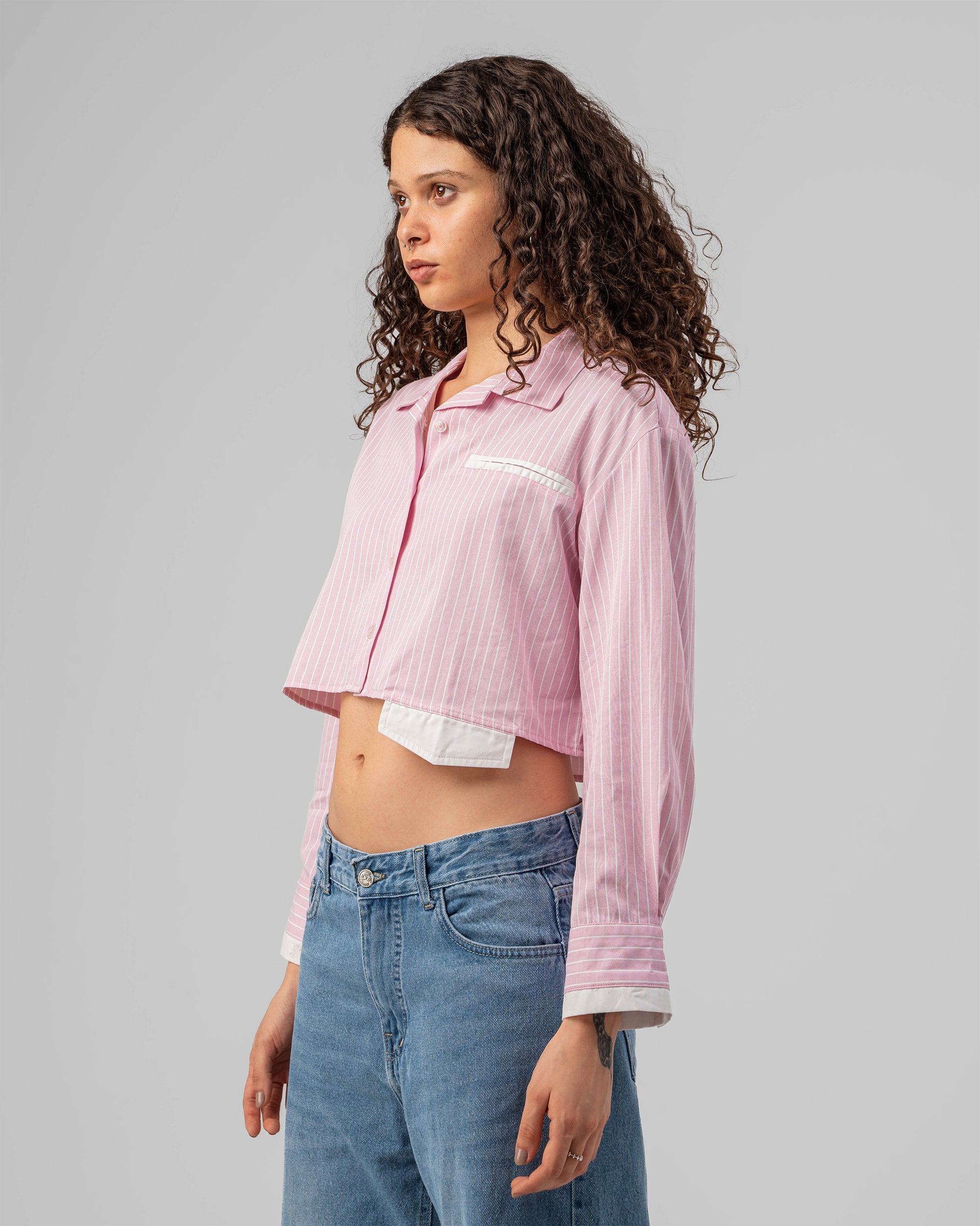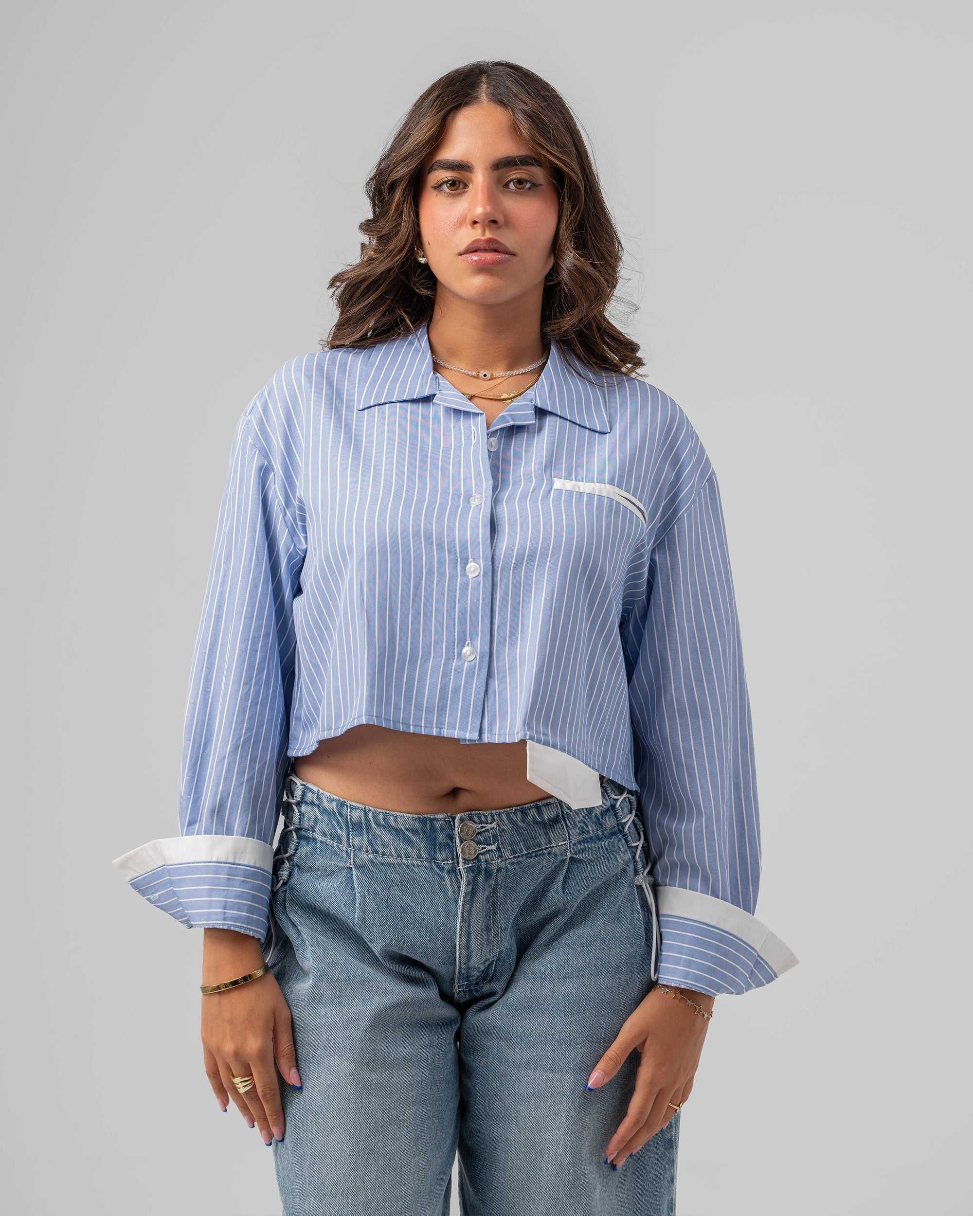 Add a playful twist to your wardrobe with this striped contrast shirt. Featuring a unique cropped silhouette, this shirt combines classic striped fabric with a bold contrast detail for a chic, modern look. The oversized fit and relaxed tailoring ensure comfort while offering a fresh, trendy aesthetic. Perfect for layering or wearing on its own, this shirt brings a blend of sophistication and casual flair to any outfit.