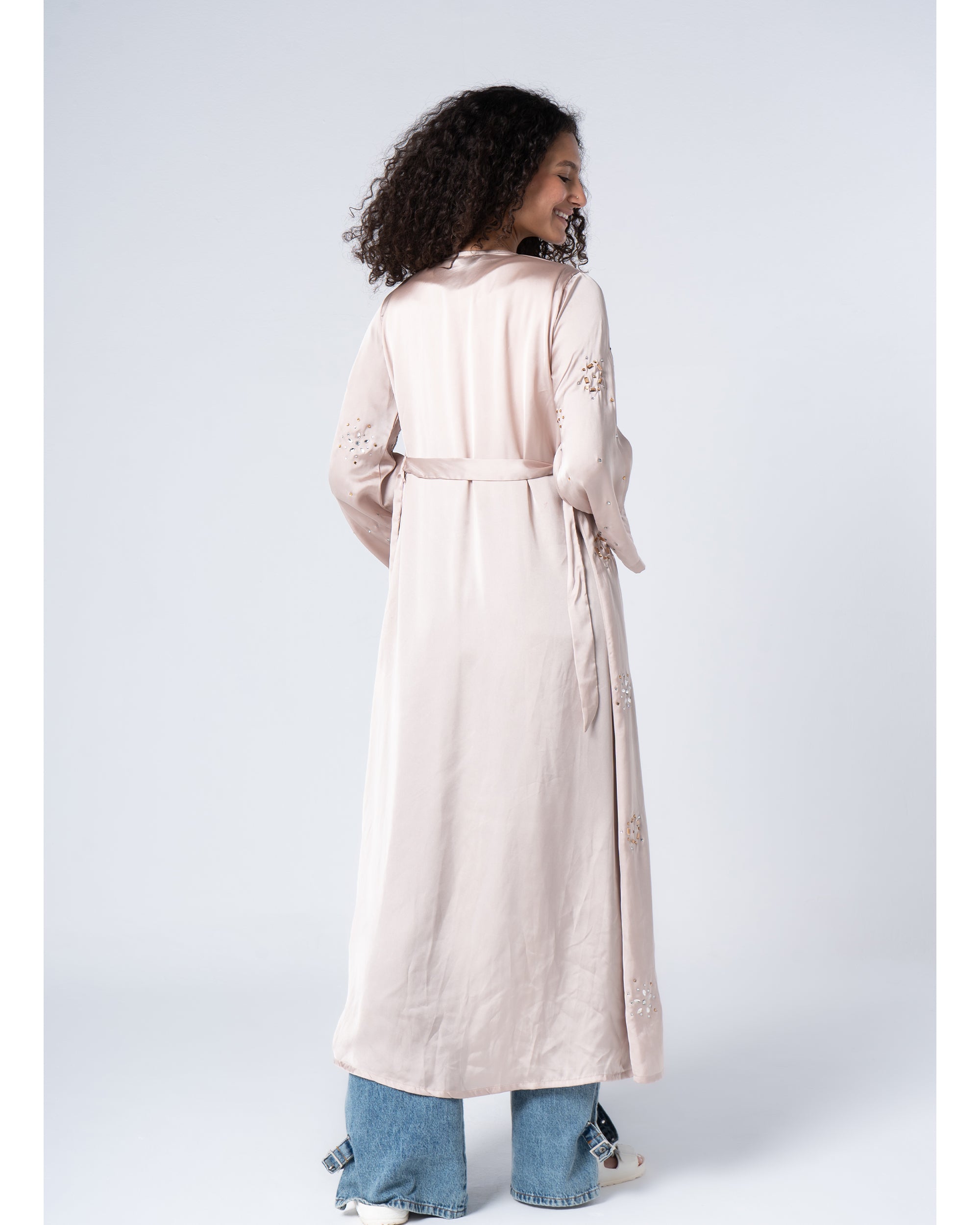 Boho luxe with a touch of sparkle. This beige kimono adds glamorous shine to any outfit.