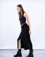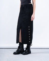 • Details: Front slit for ease of movement, buttoned waistband, and side eyelet detailing