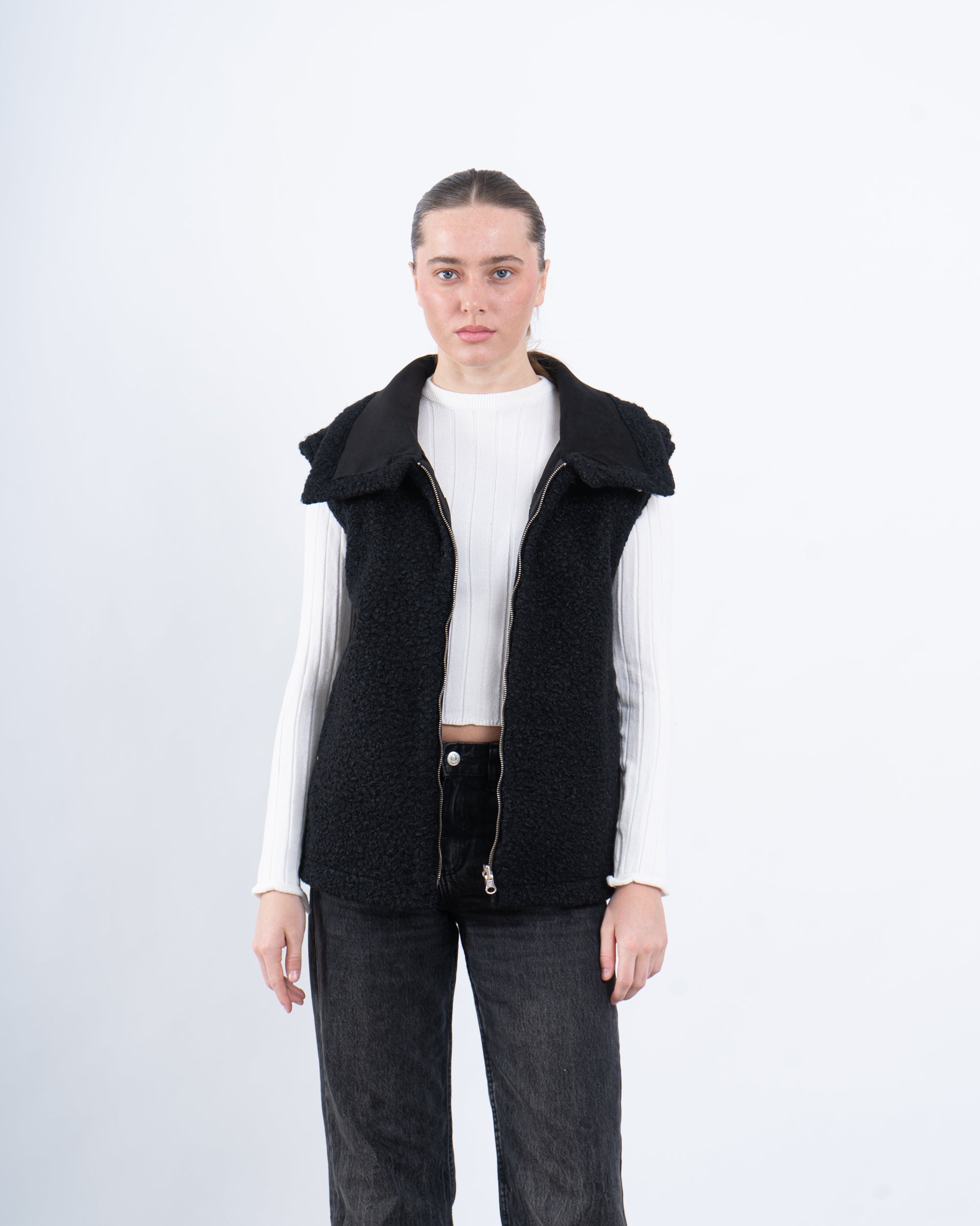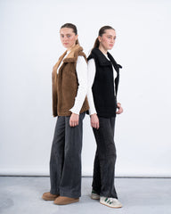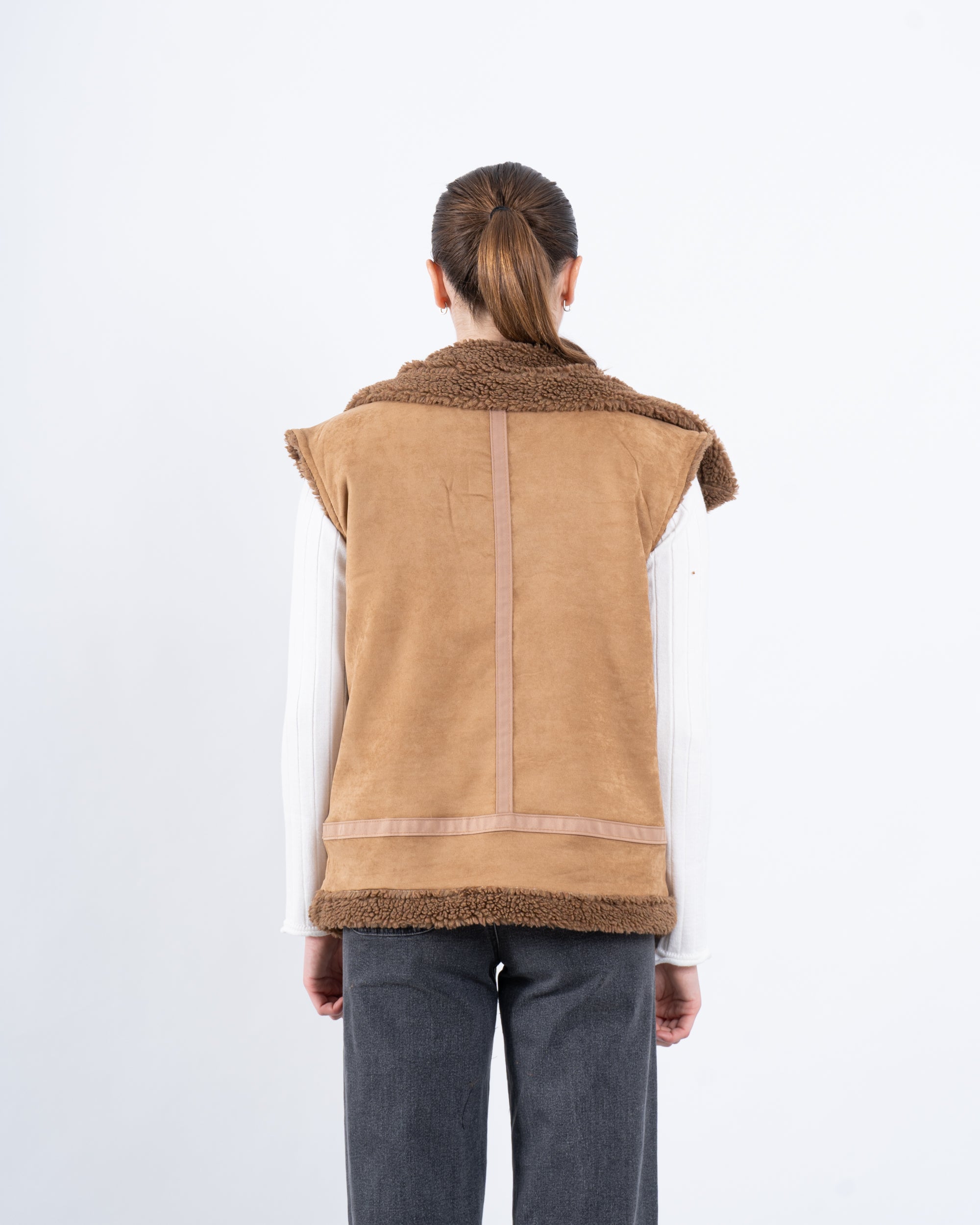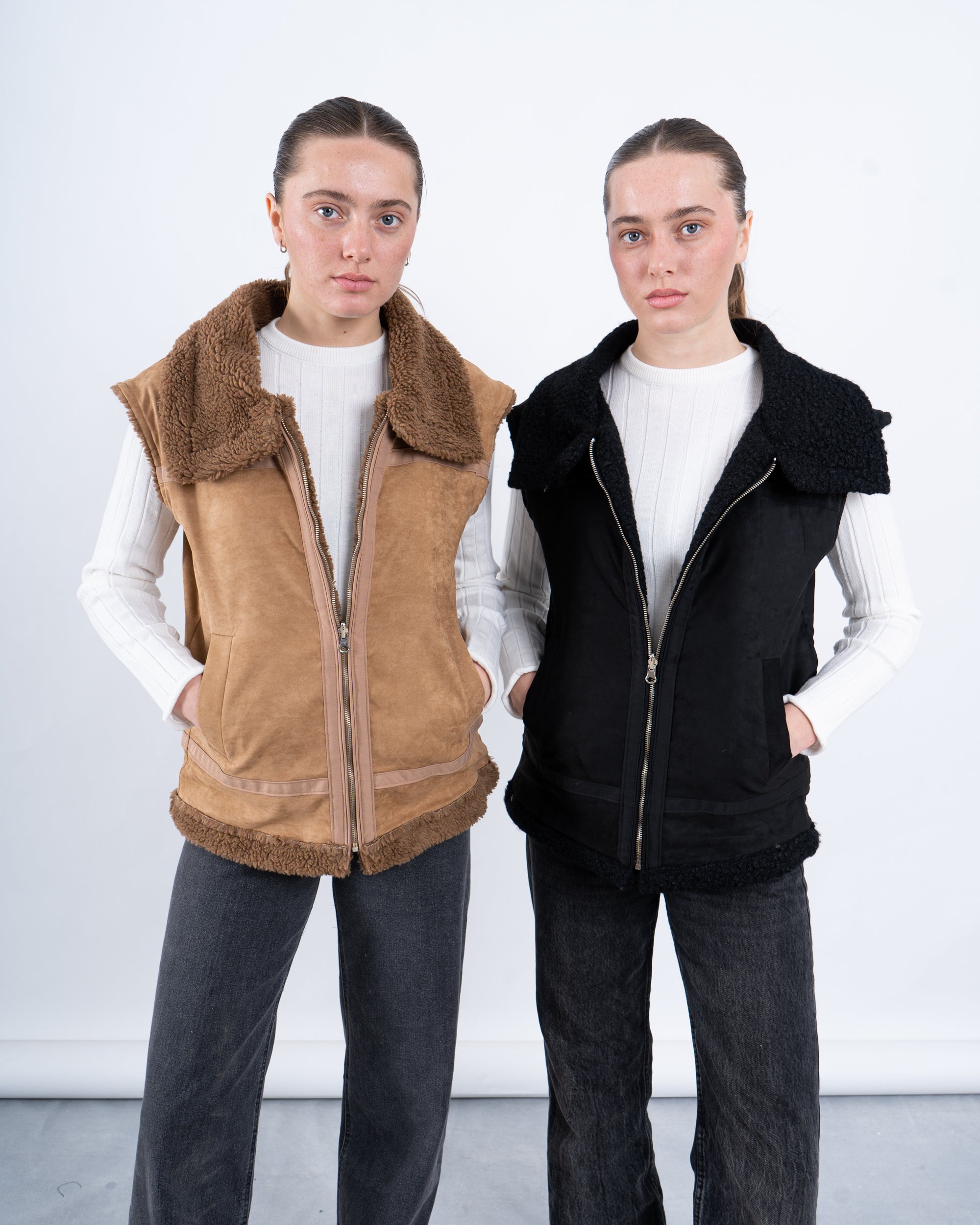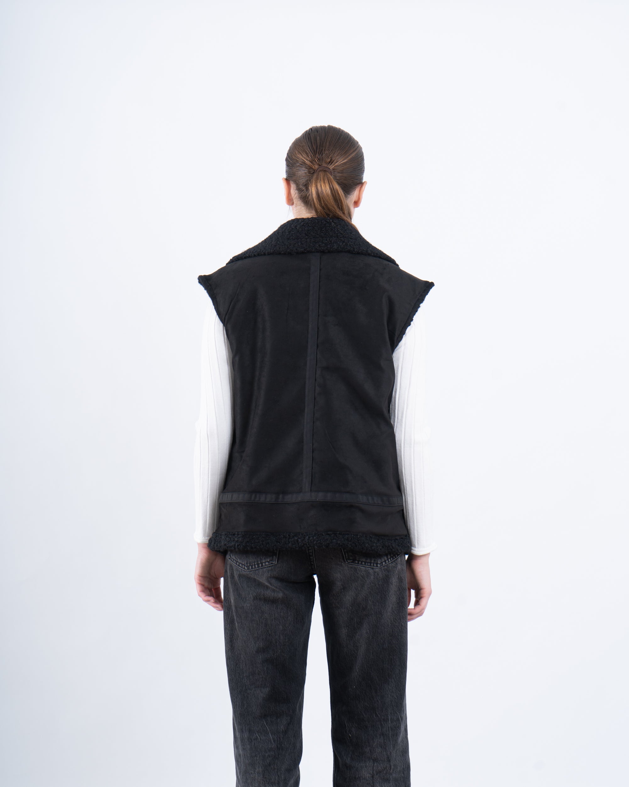This versatile double-face faux shearling vest is the ultimate layering piece for transitional seasons. With a cozy shearling interior and a smooth faux suede or textured exterior, it offers two stylish looks in one. Featuring a zip-up front, wide lapel collar, and functional side pockets, this vest is perfect for adding warmth and texture to your outfits.