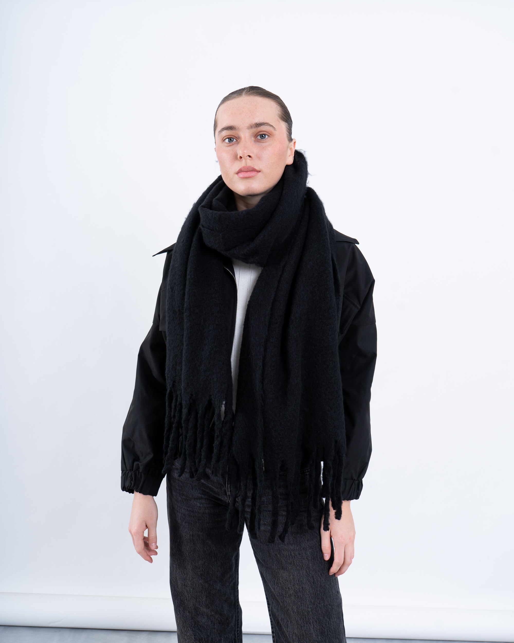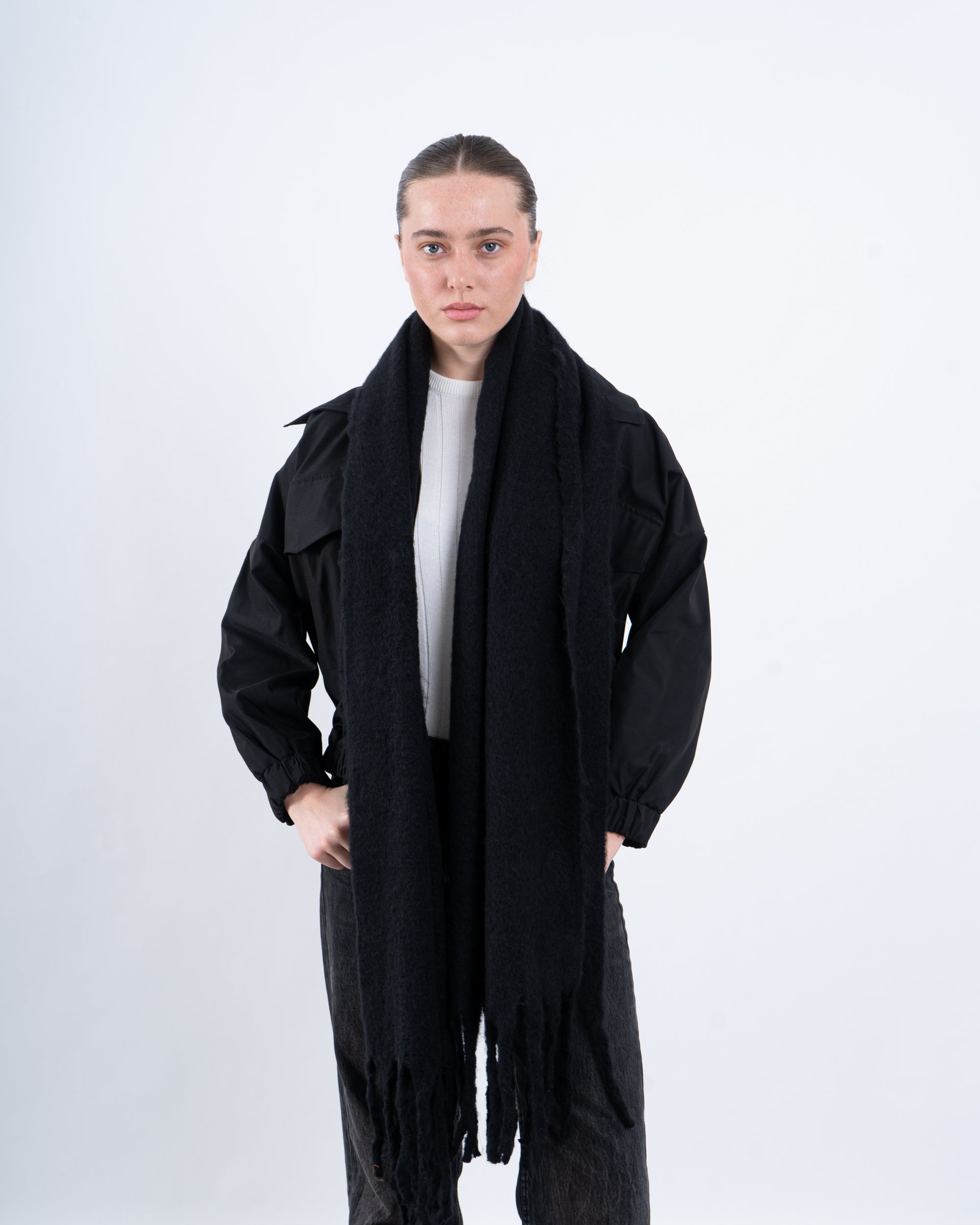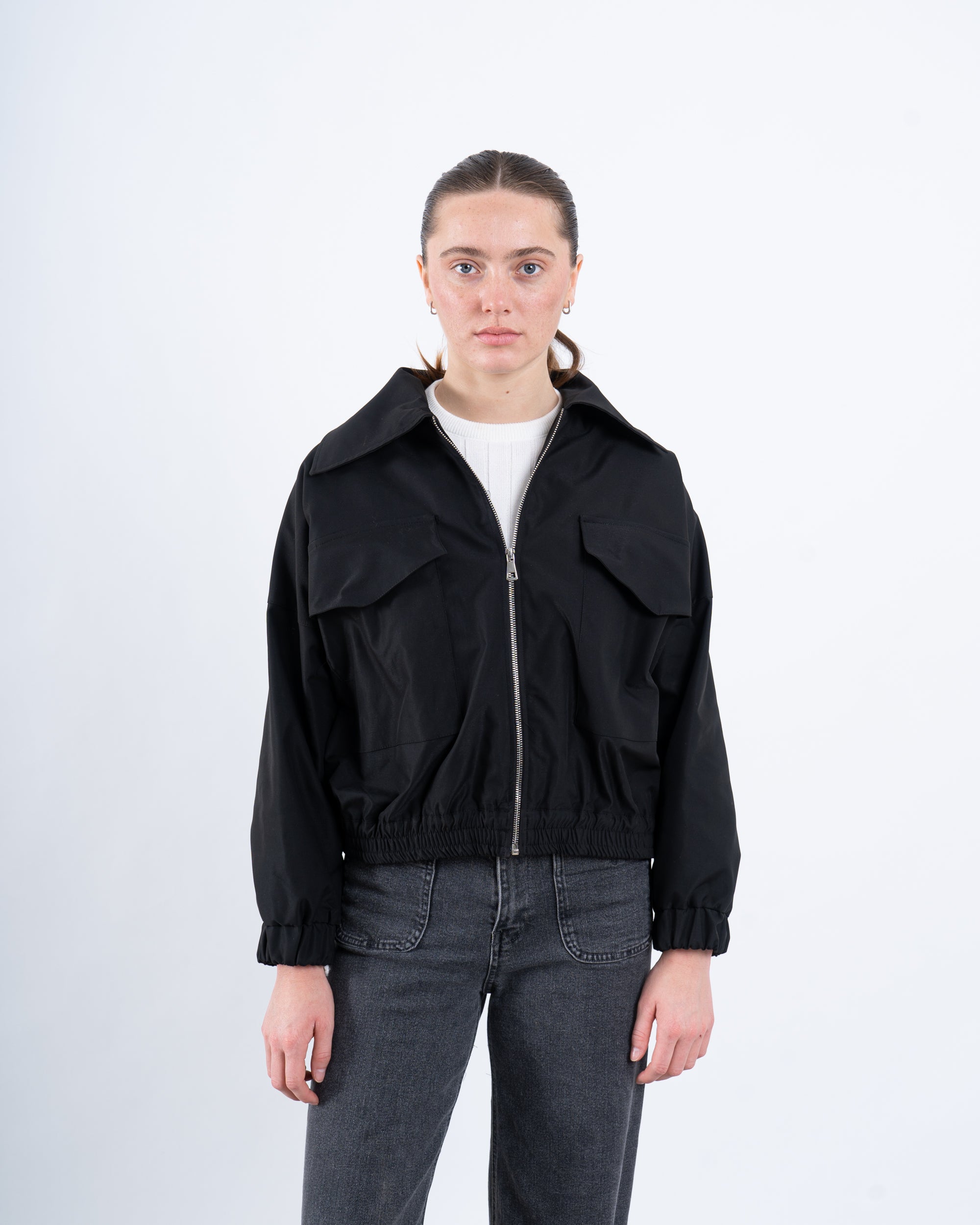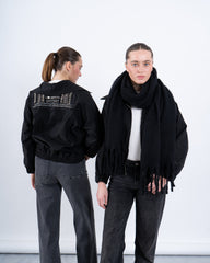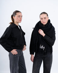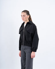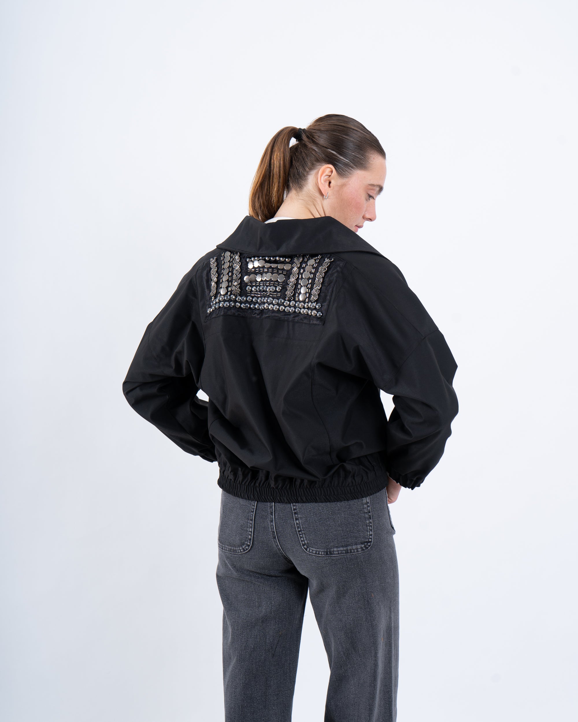 A statement black cropped jacket featuring a unique embellished back detail that adds a touch of glamour. Designed with a zip-up front, elasticated hem, and oversized flap pockets, this jacket effortlessly blends functionality with contemporary style. Perfect for layering over casual or dressy looks.