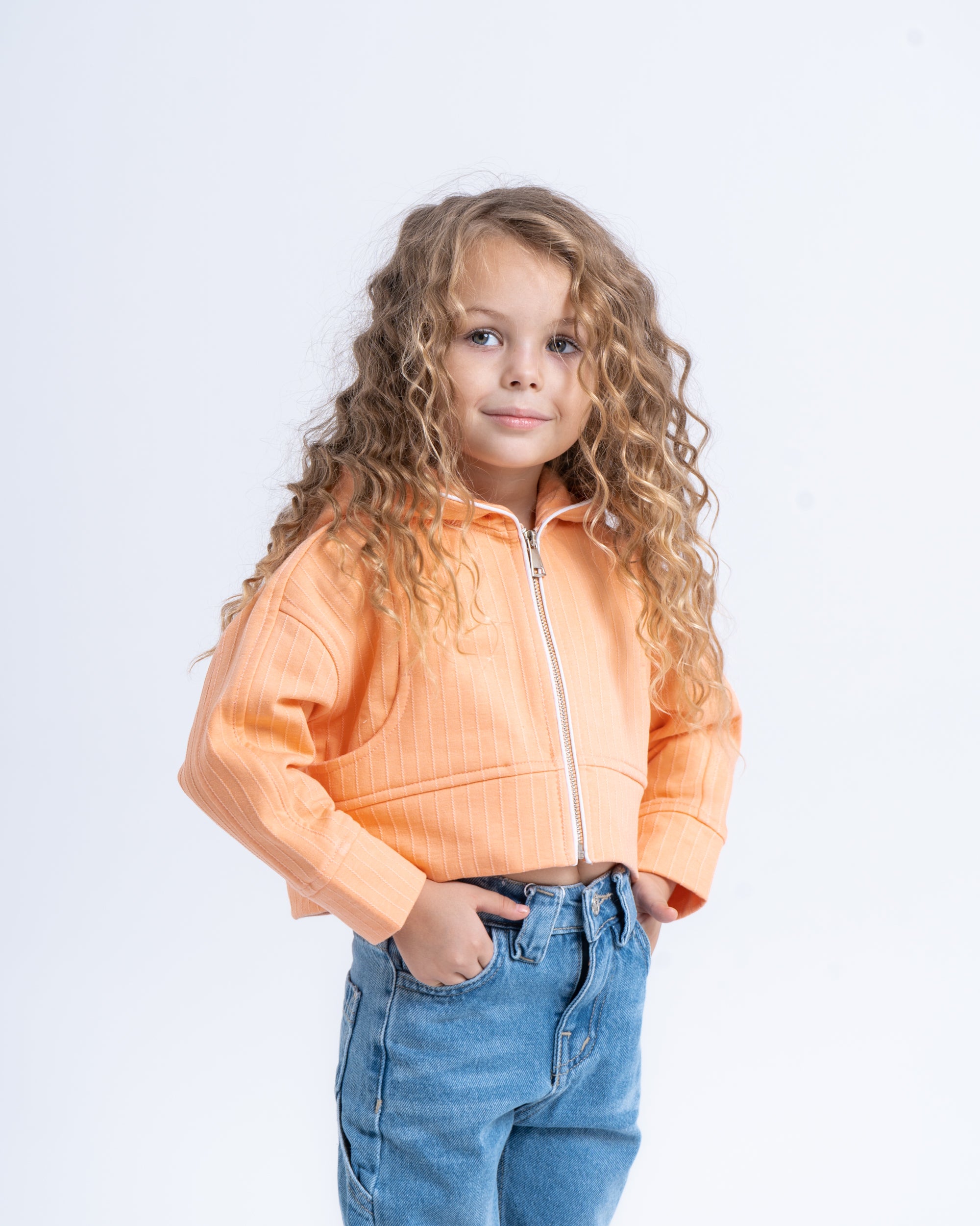 Add a pop of color to your little one’s wardrobe with this bright orange cropped hoodie. Featuring a full front zipper and a relaxed fit, this hoodie is both stylish and easy to wear. The ribbed fabric provides a subtle texture that adds to its appeal, making it a fun piece to layer over different outfits.