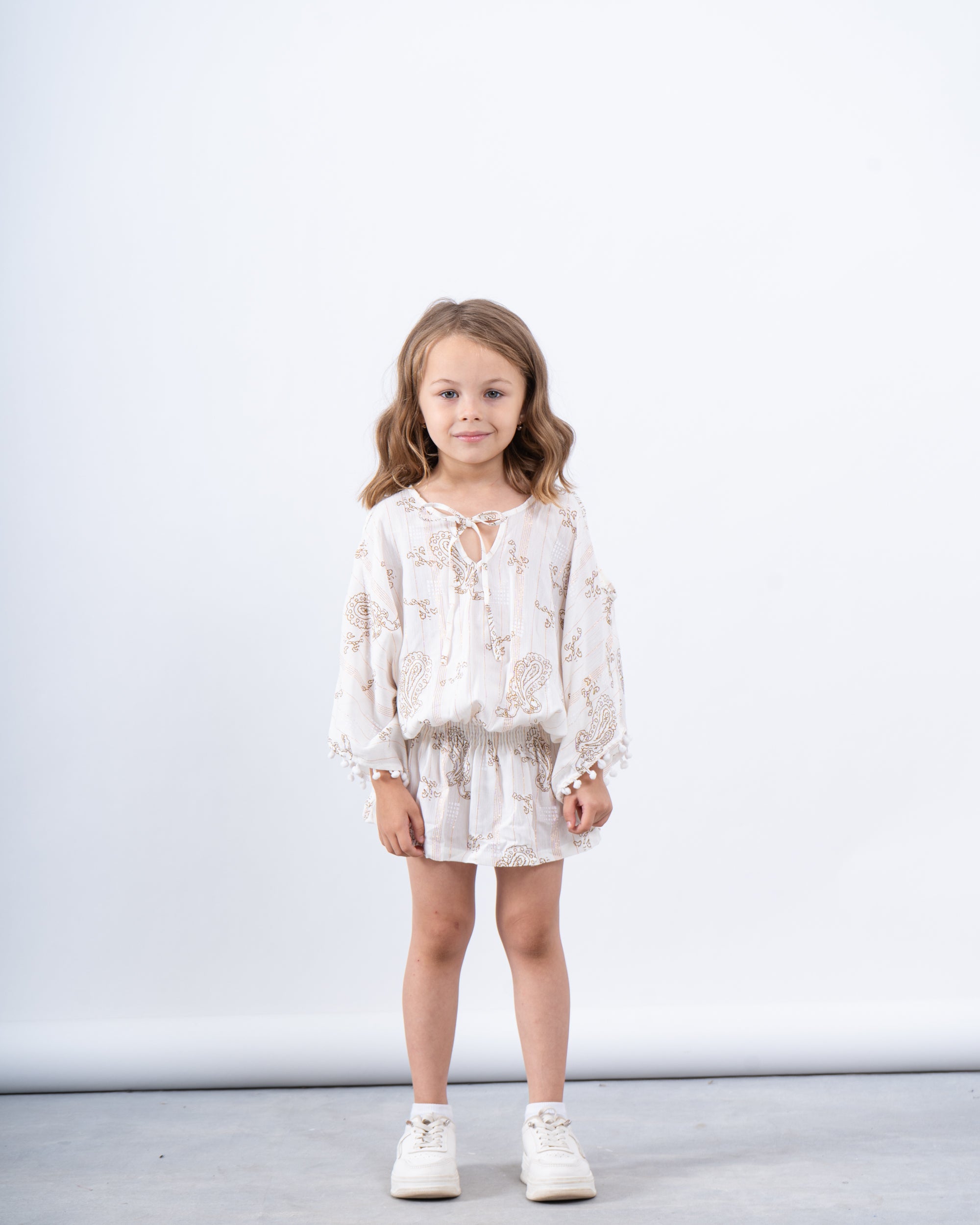 A breezy beach dress with a playful paisley print and pom-pom details — perfect for summer days, seaside strolls, or matching moments with mom.