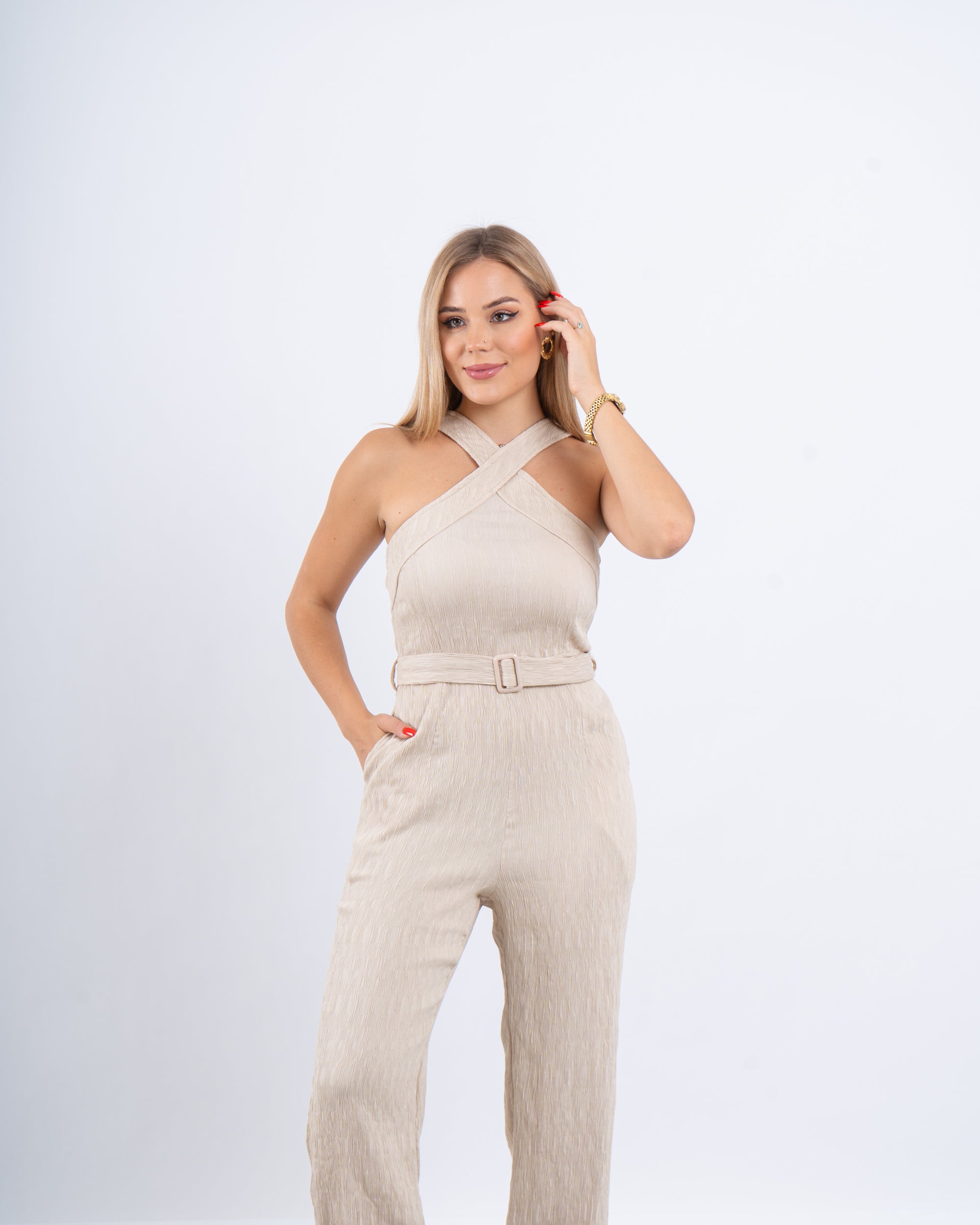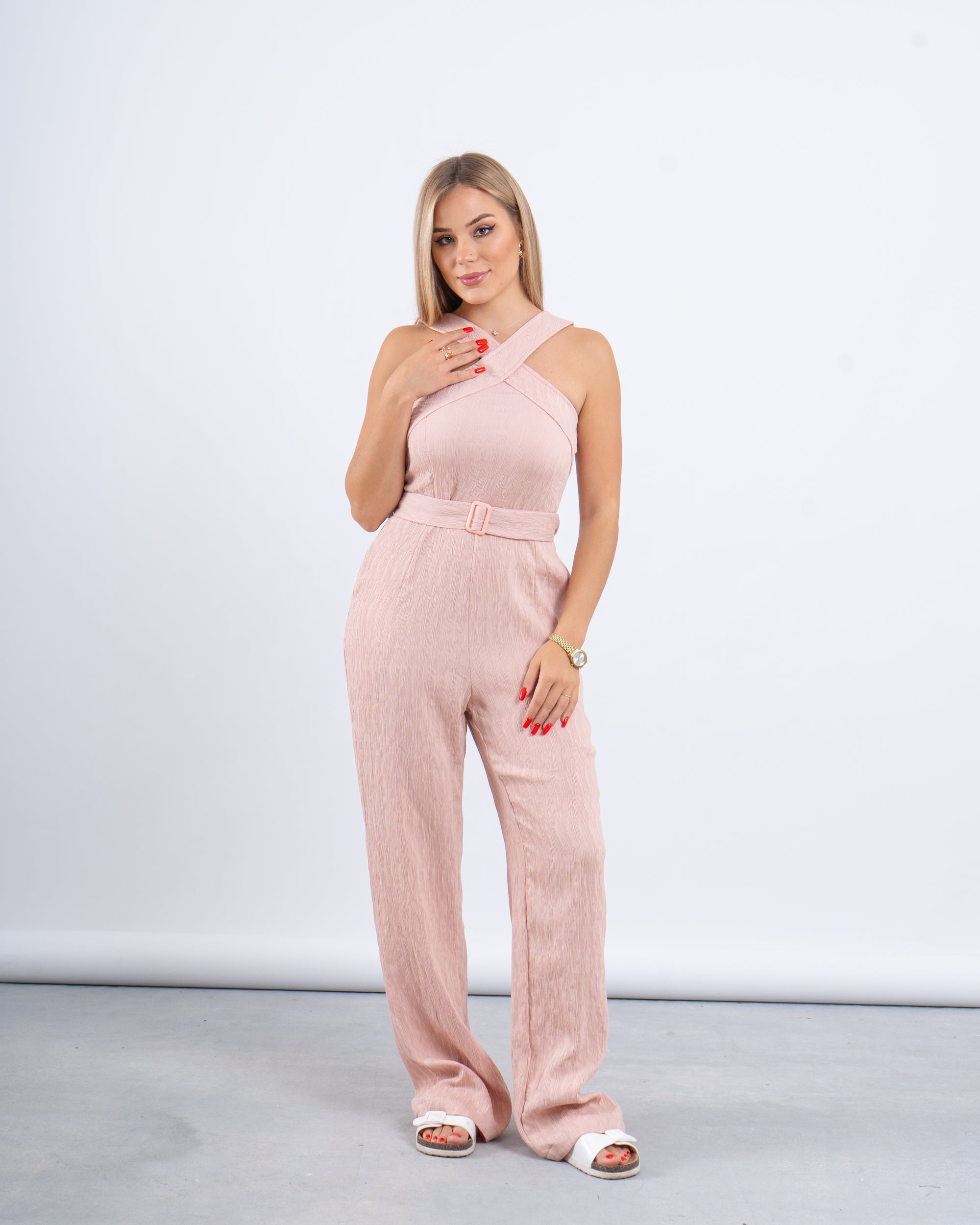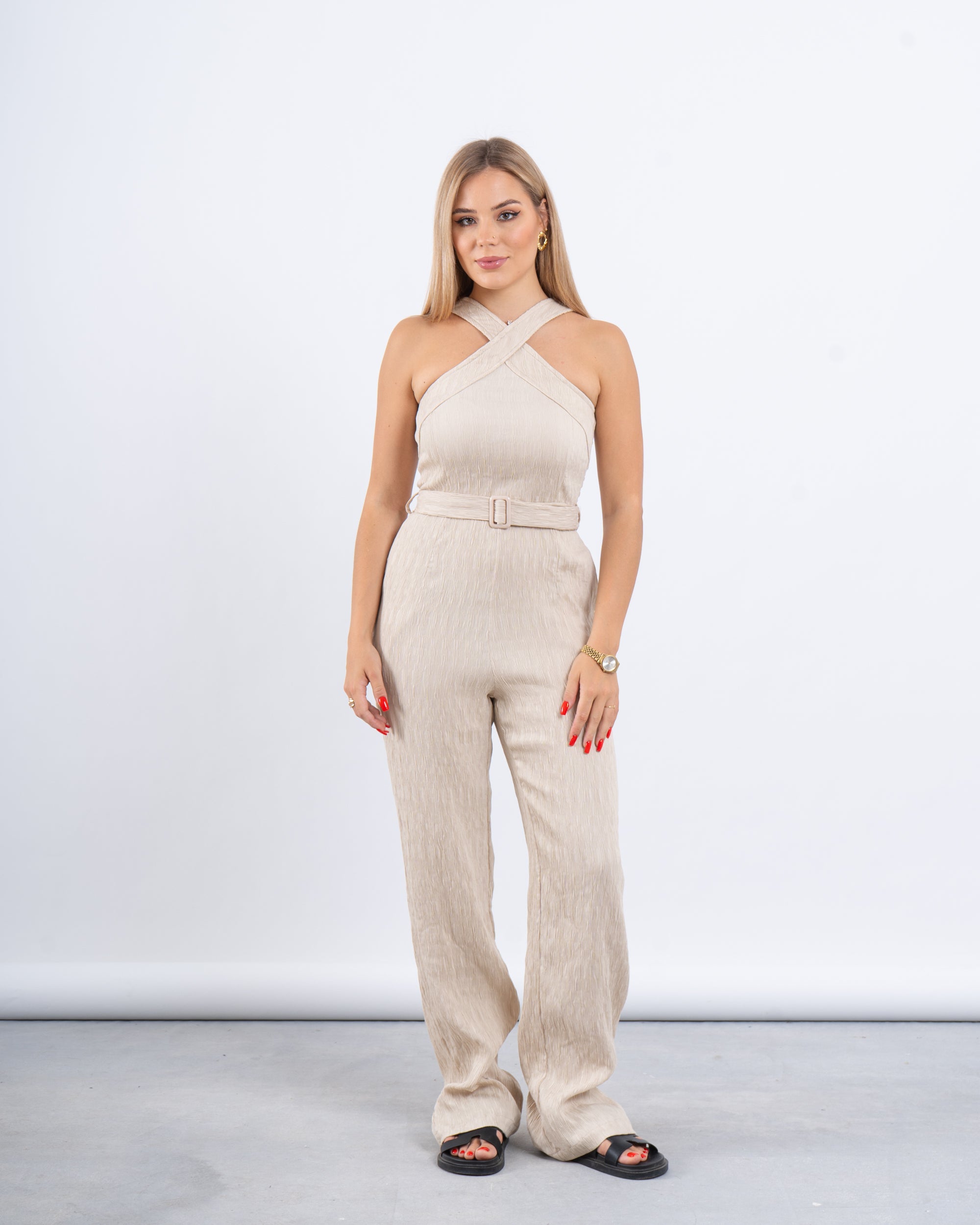 Sleek, minimal, and effortlessly flattering. This full-length jumpsuit features a unique cross-over neckline and a tonal belt for a sculpted silhouette.