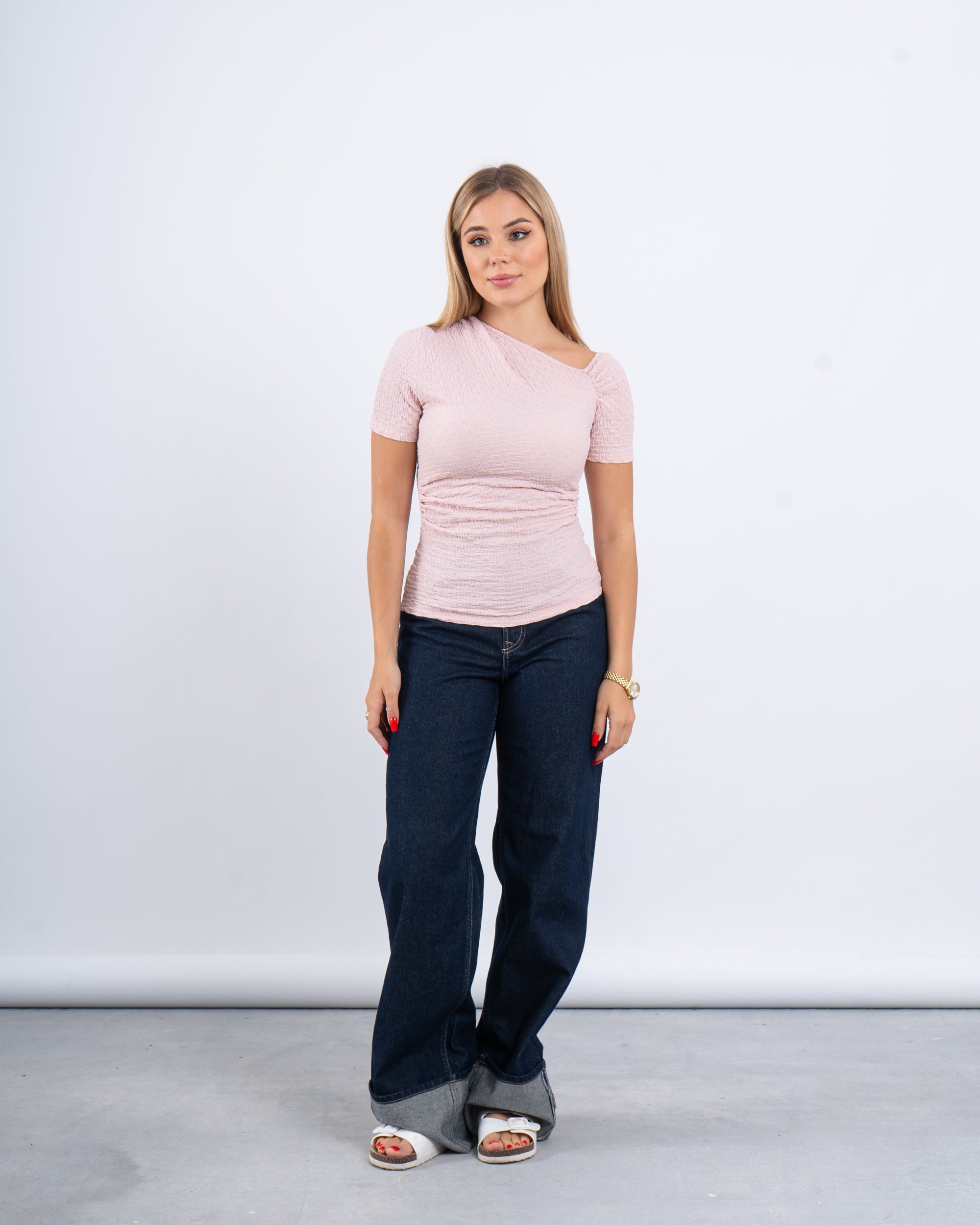 A flattering essential with a soft sculpting feel. This textured top hugs the body with gentle ruching and a rounded neckline—perfect for everyday looks with a polished edge.