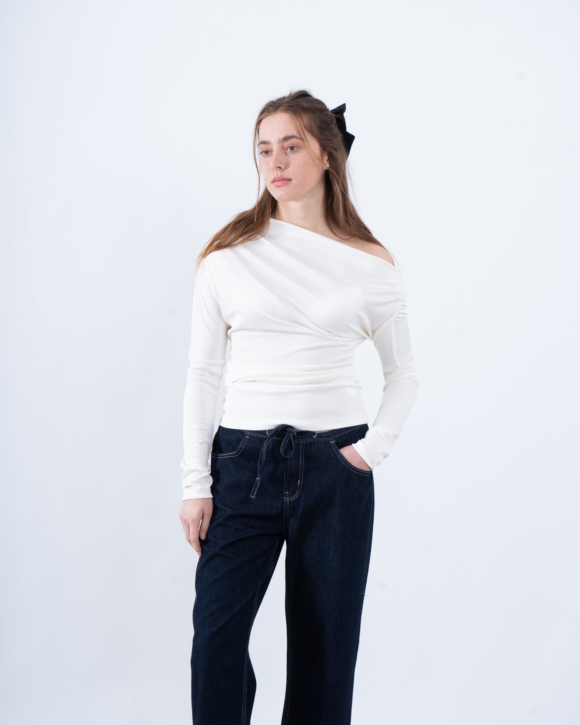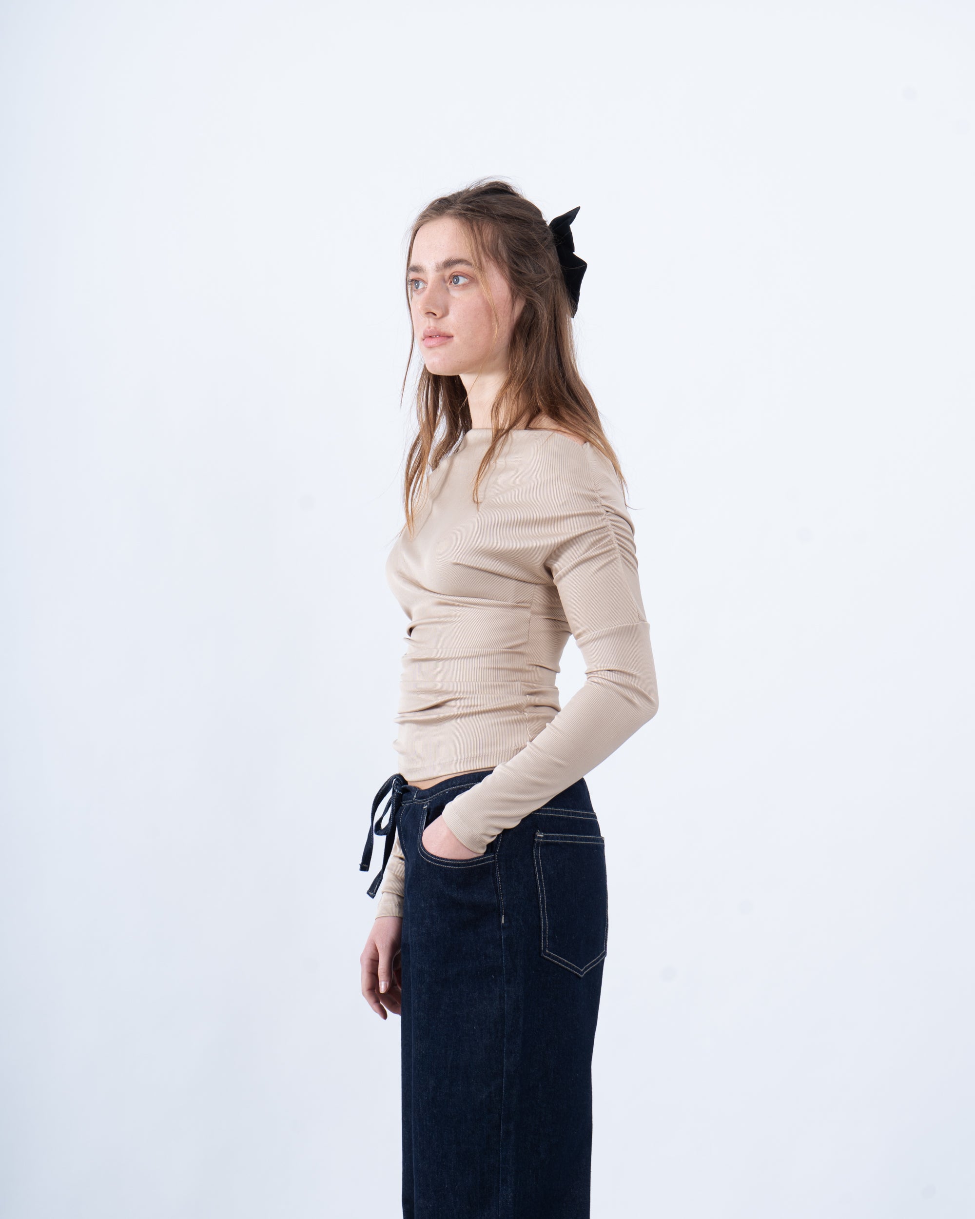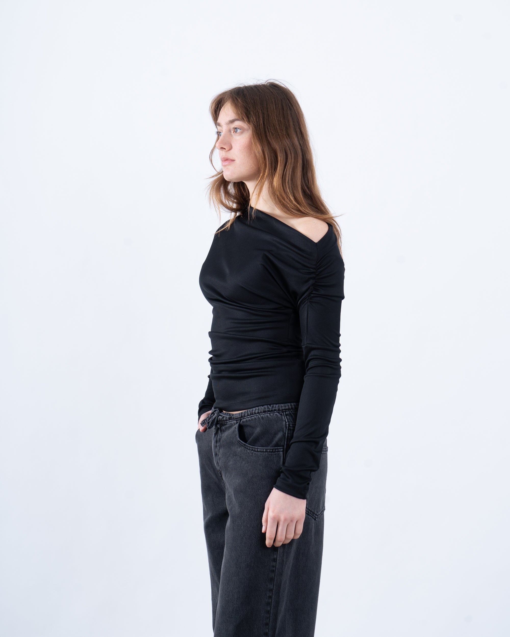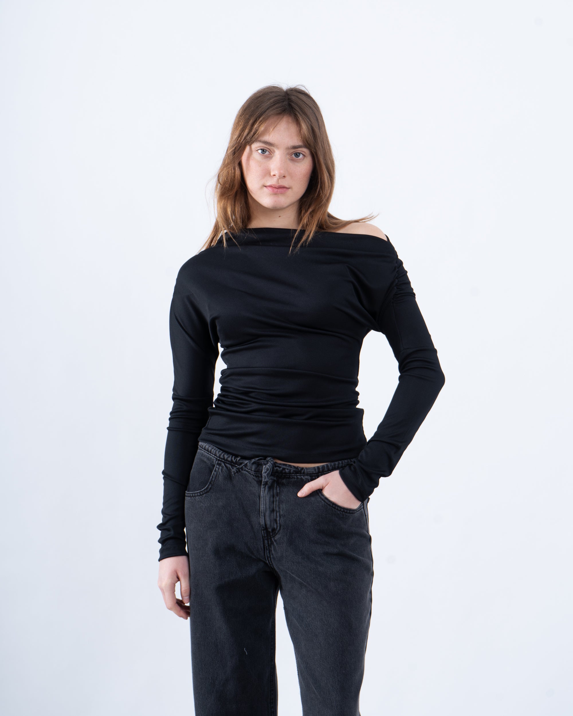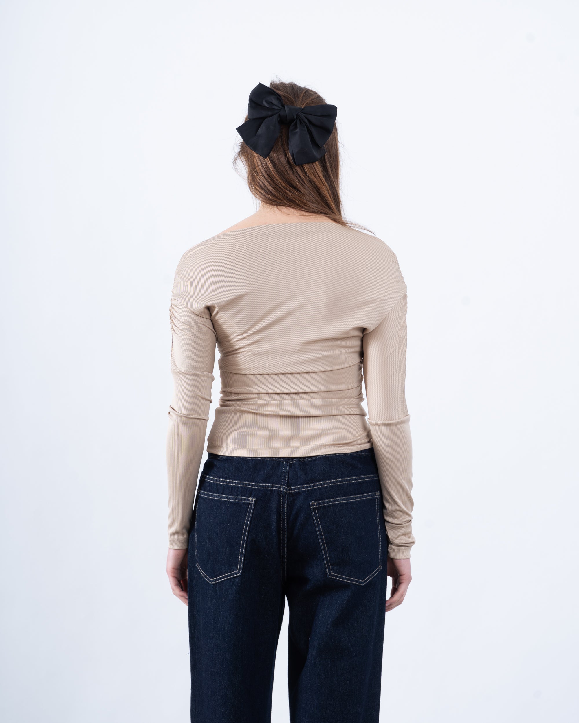 A sleek and form-fitting long-sleeve top featuring a ruched design that enhances the silhouette. The off-shoulder neckline adds a touch of effortless elegance, making it a versatile piece for any occasion. Made from soft, stretchy fabric for a comfortable yet flattering fit.
