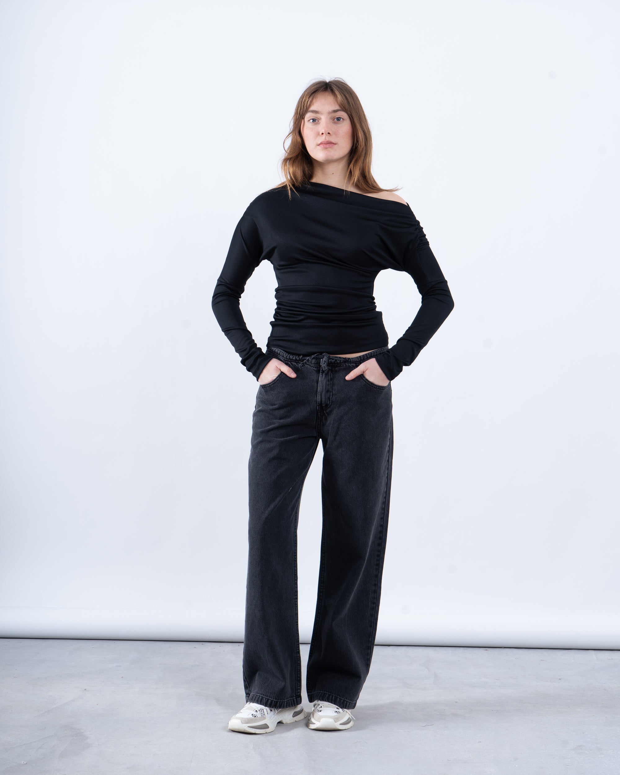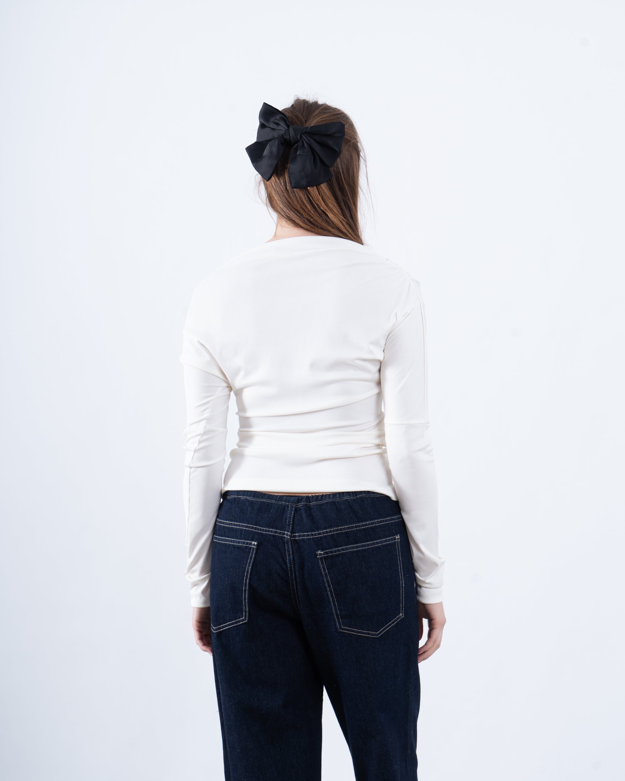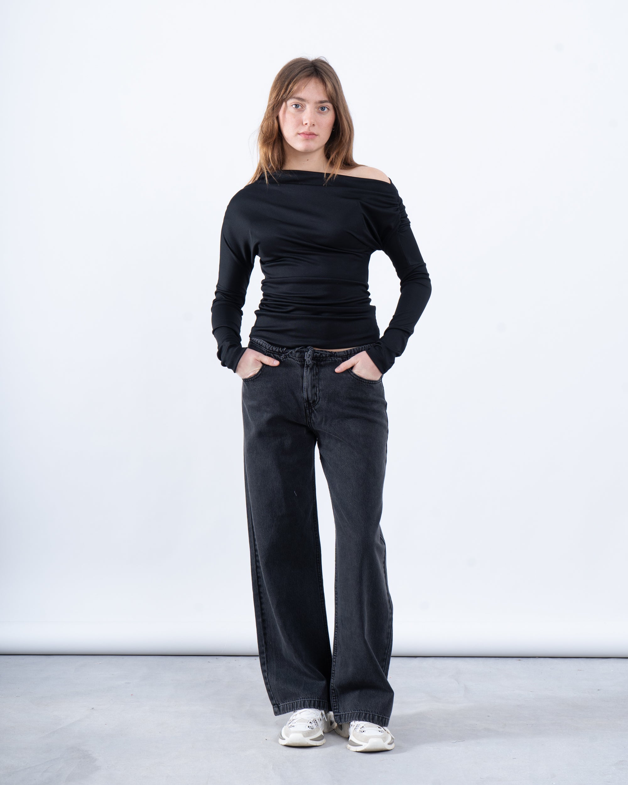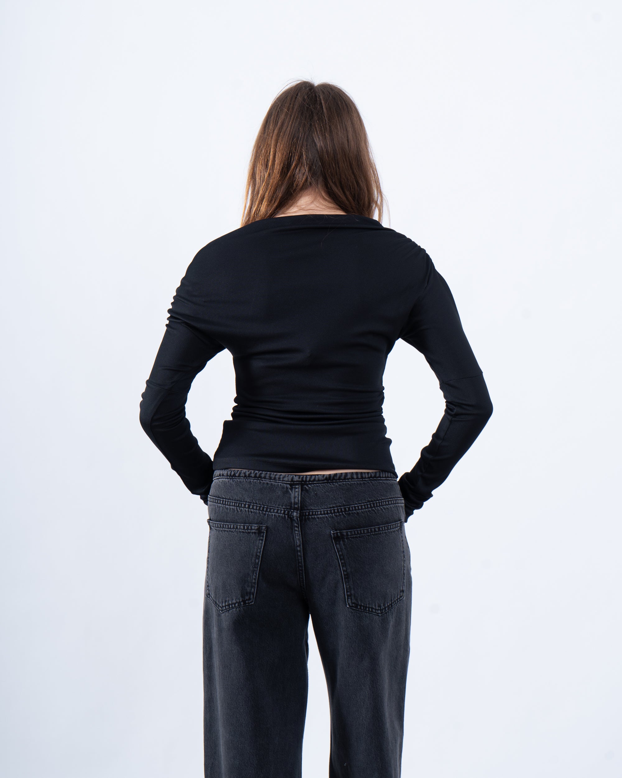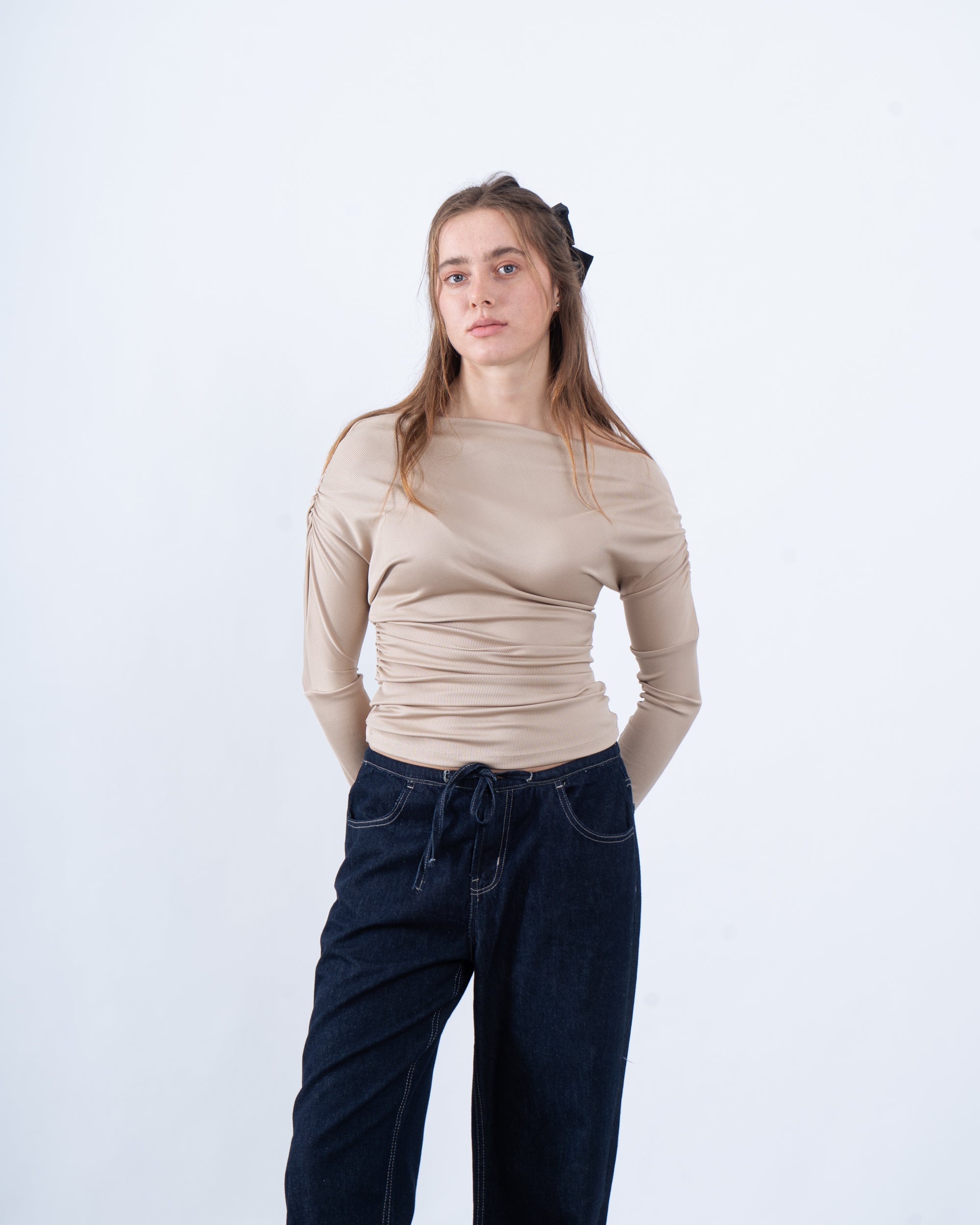 A sleek and form-fitting long-sleeve top featuring a ruched design that enhances the silhouette. The off-shoulder neckline adds a touch of effortless elegance, making it a versatile piece for any occasion. Made from soft, stretchy fabric for a comfortable yet flattering fit.
