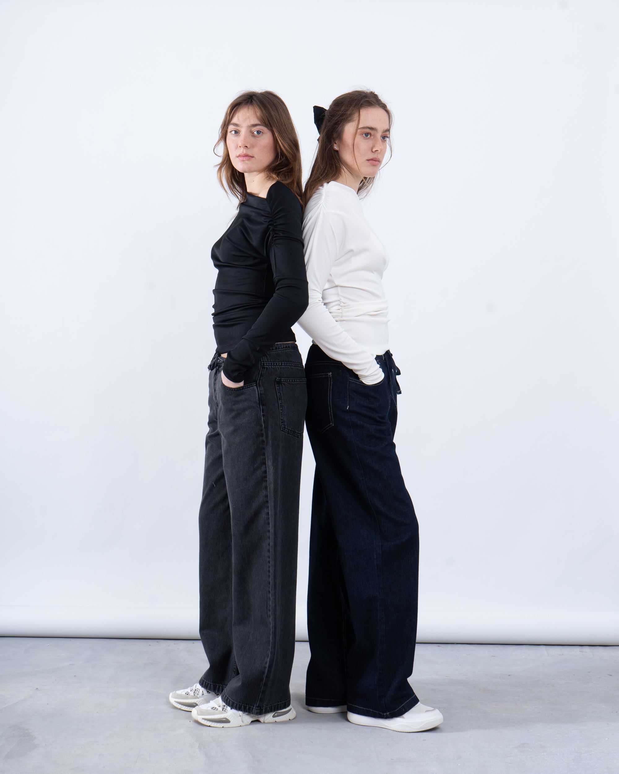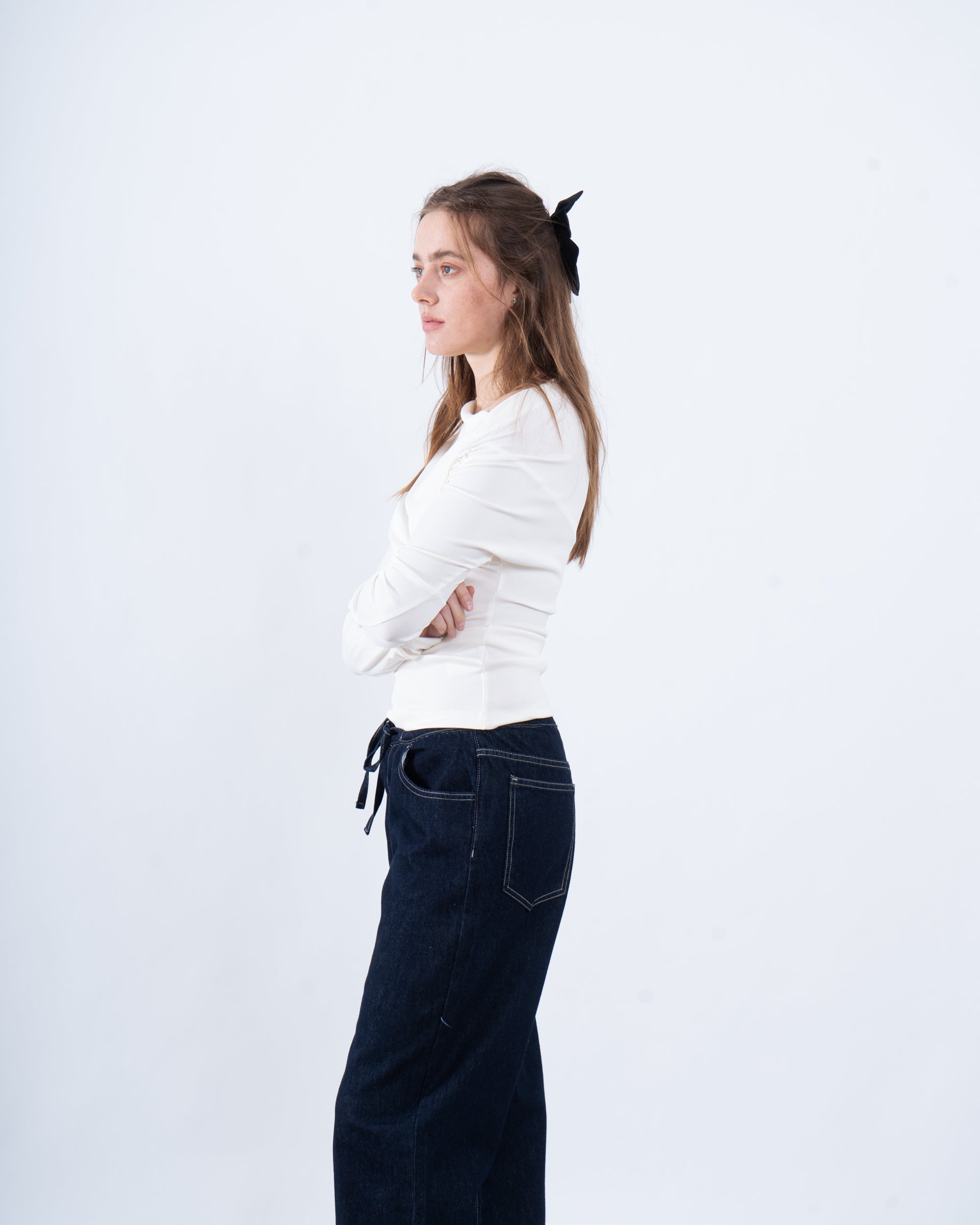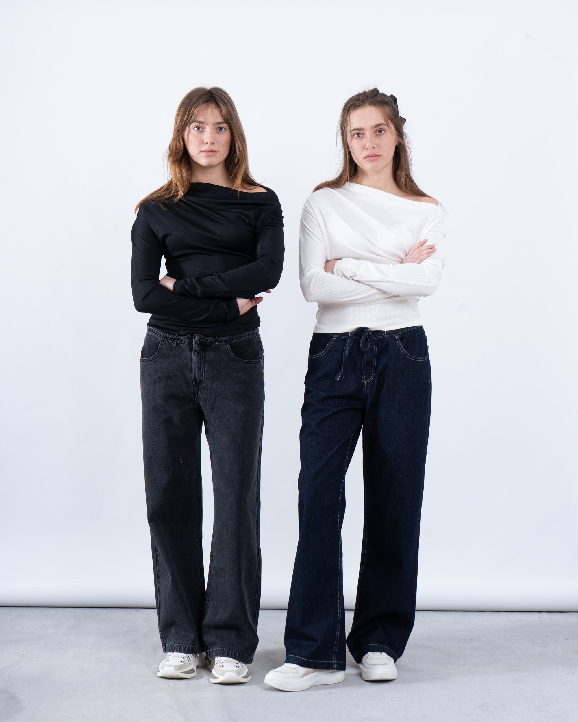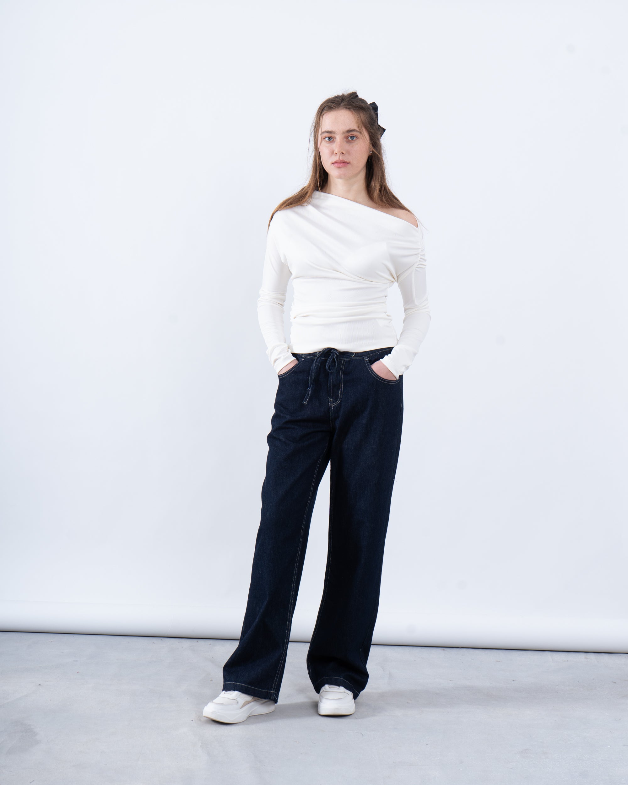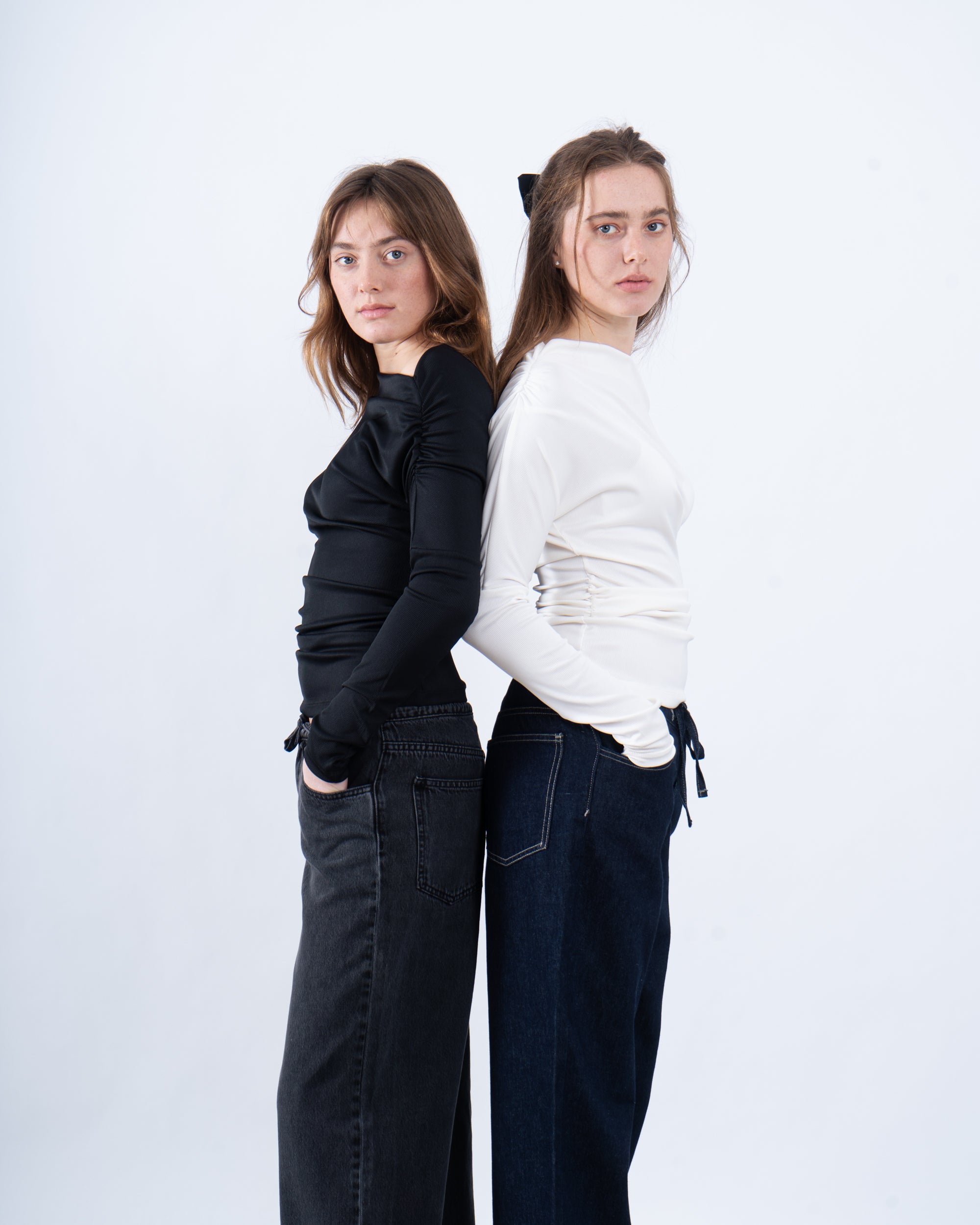 A sleek and form-fitting long-sleeve top featuring a ruched design that enhances the silhouette. The off-shoulder neckline adds a touch of effortless elegance, making it a versatile piece for any occasion. Made from soft, stretchy fabric for a comfortable yet flattering fit.