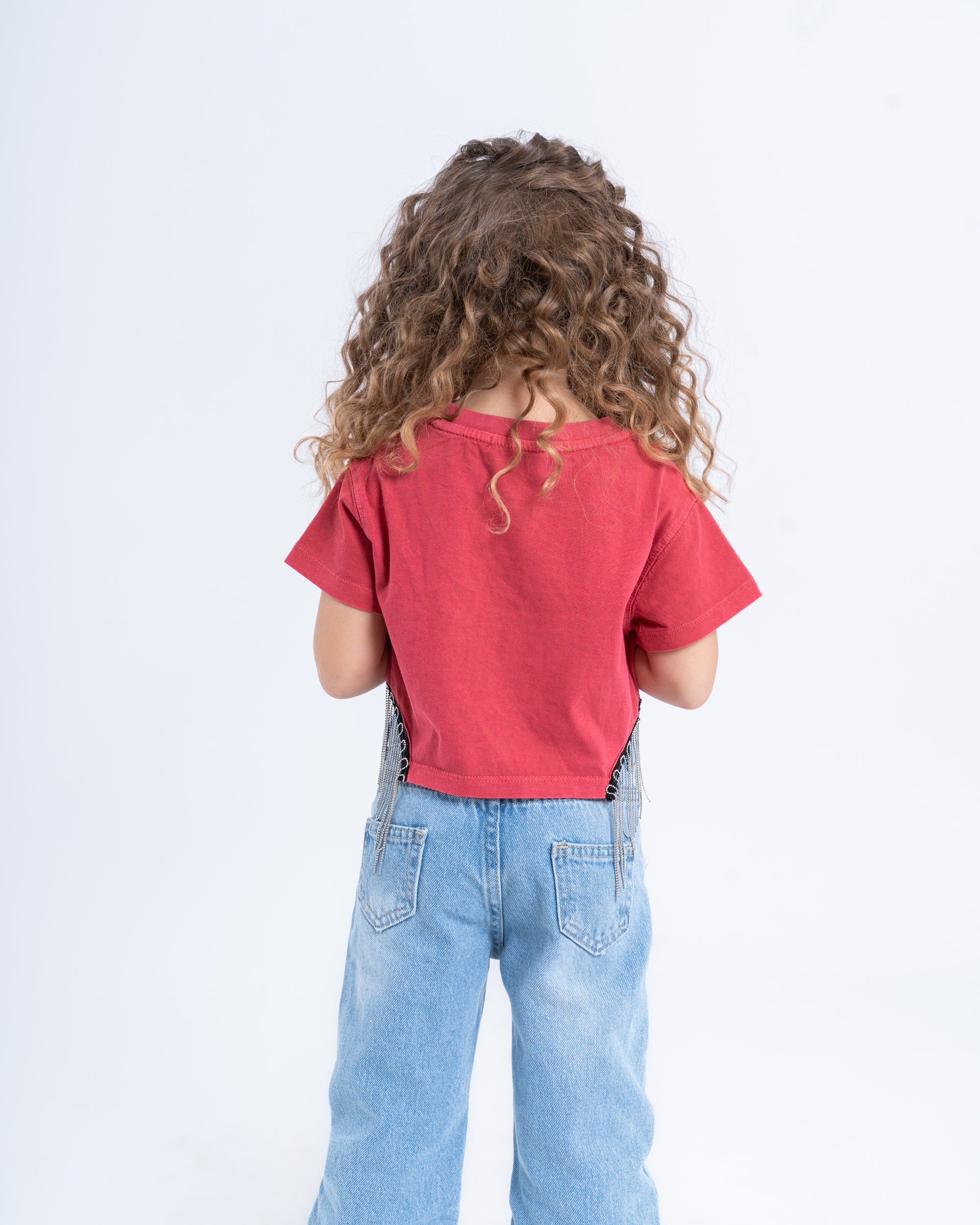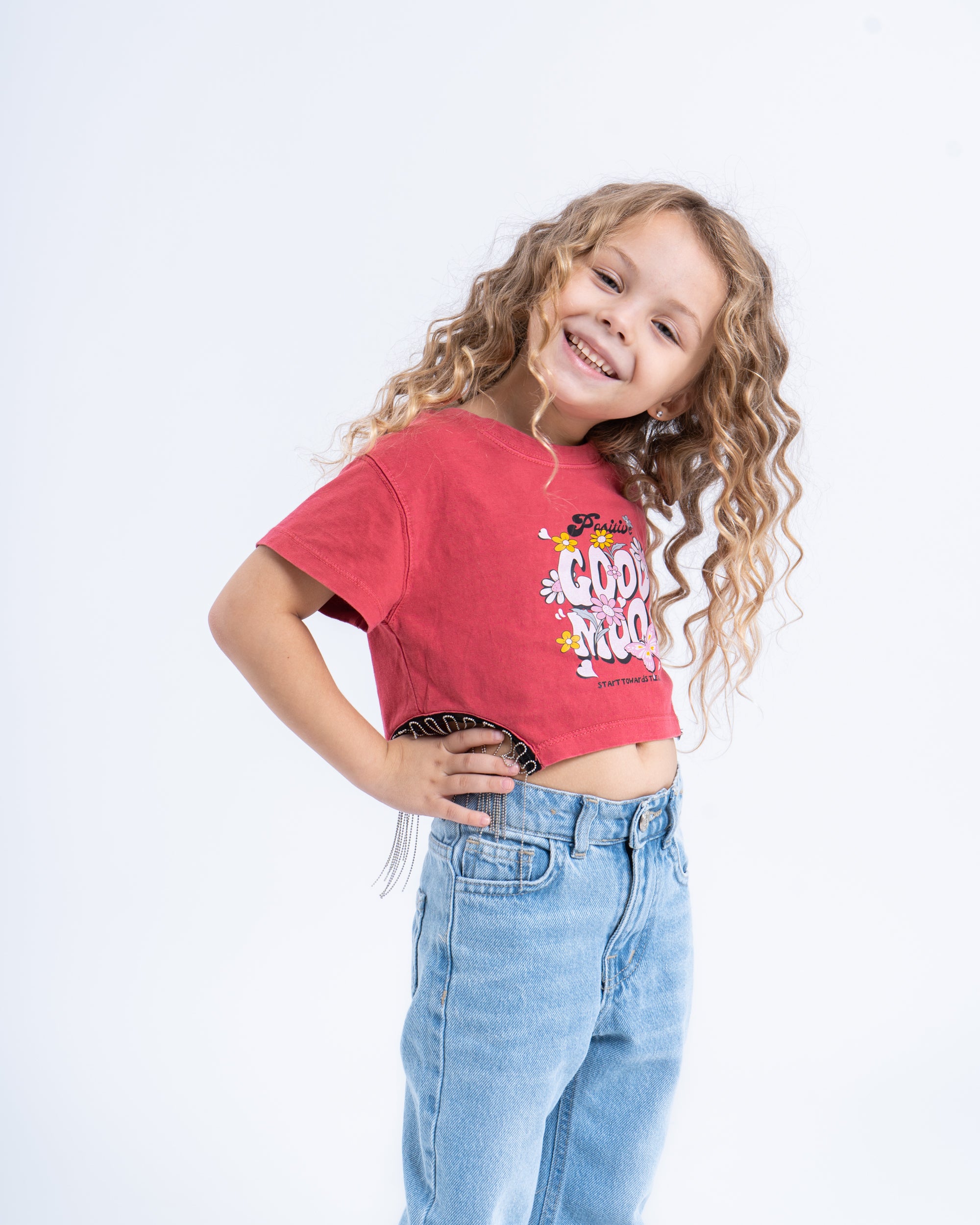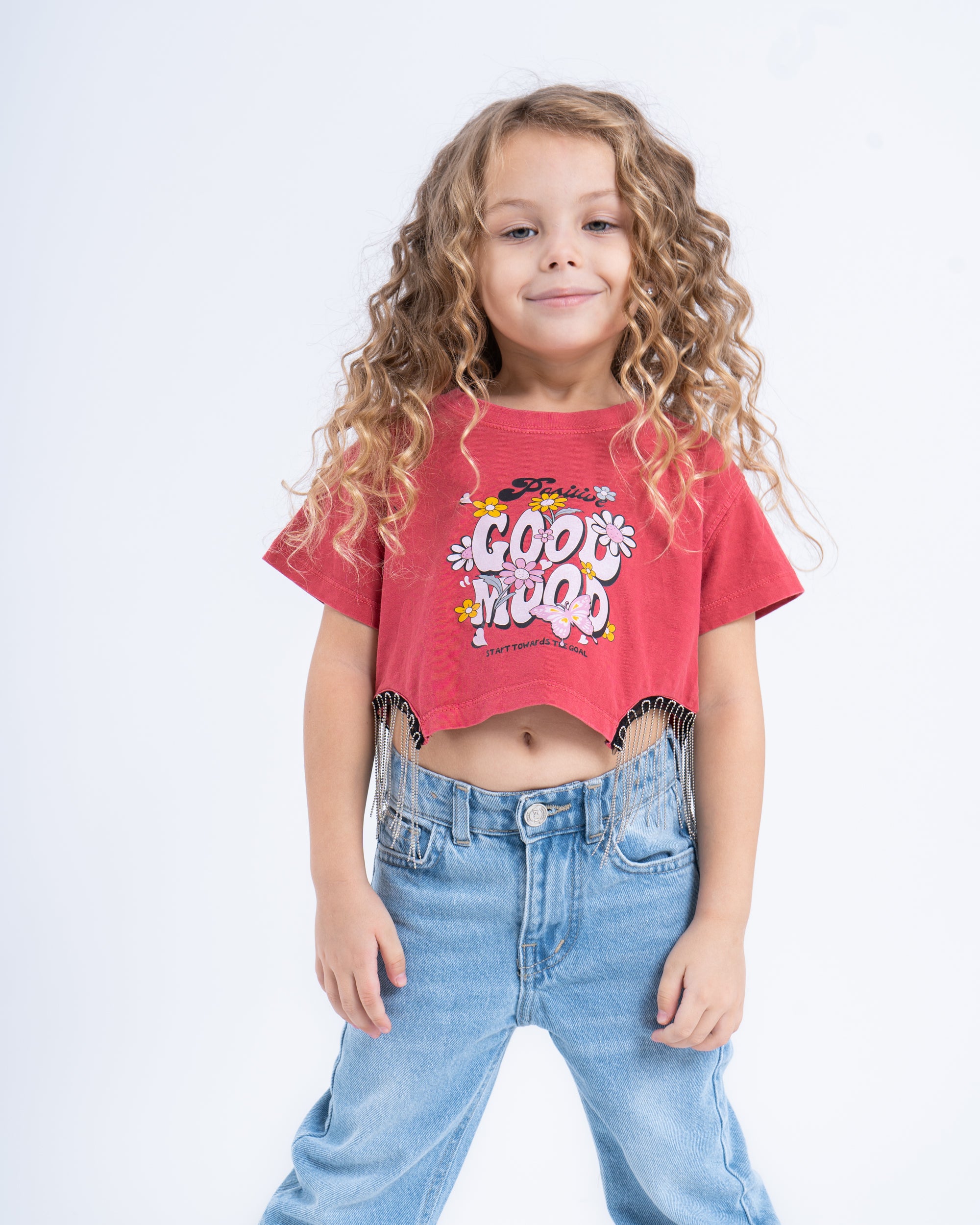 Bring a cheerful touch to your little one’s wardrobe with this Good Mood graphic crop top. The fun, colorful print and cropped design make it perfect for playful, casual outfits that express personality and style & the chains add the extra edge.