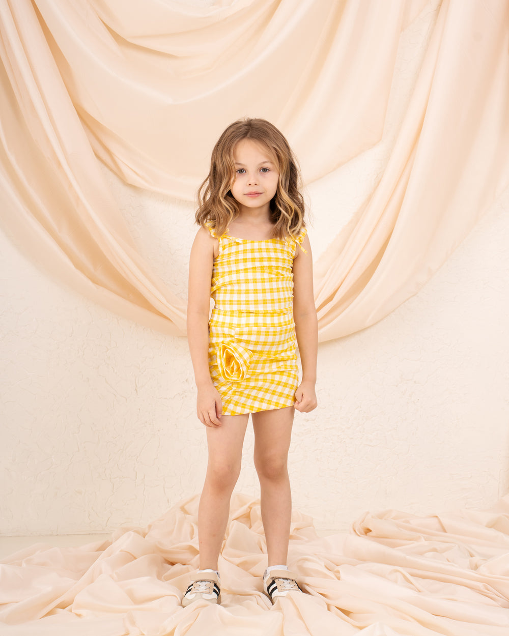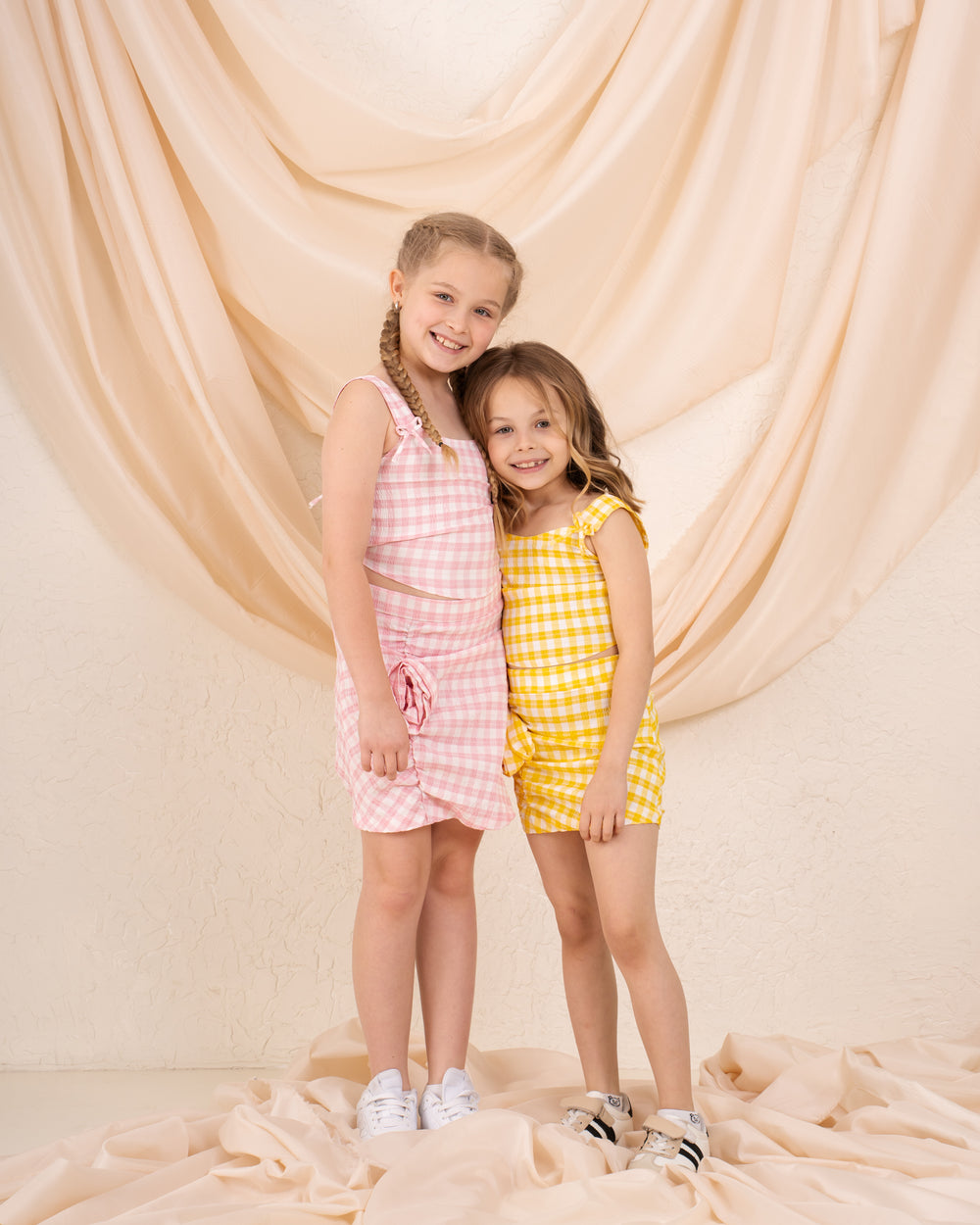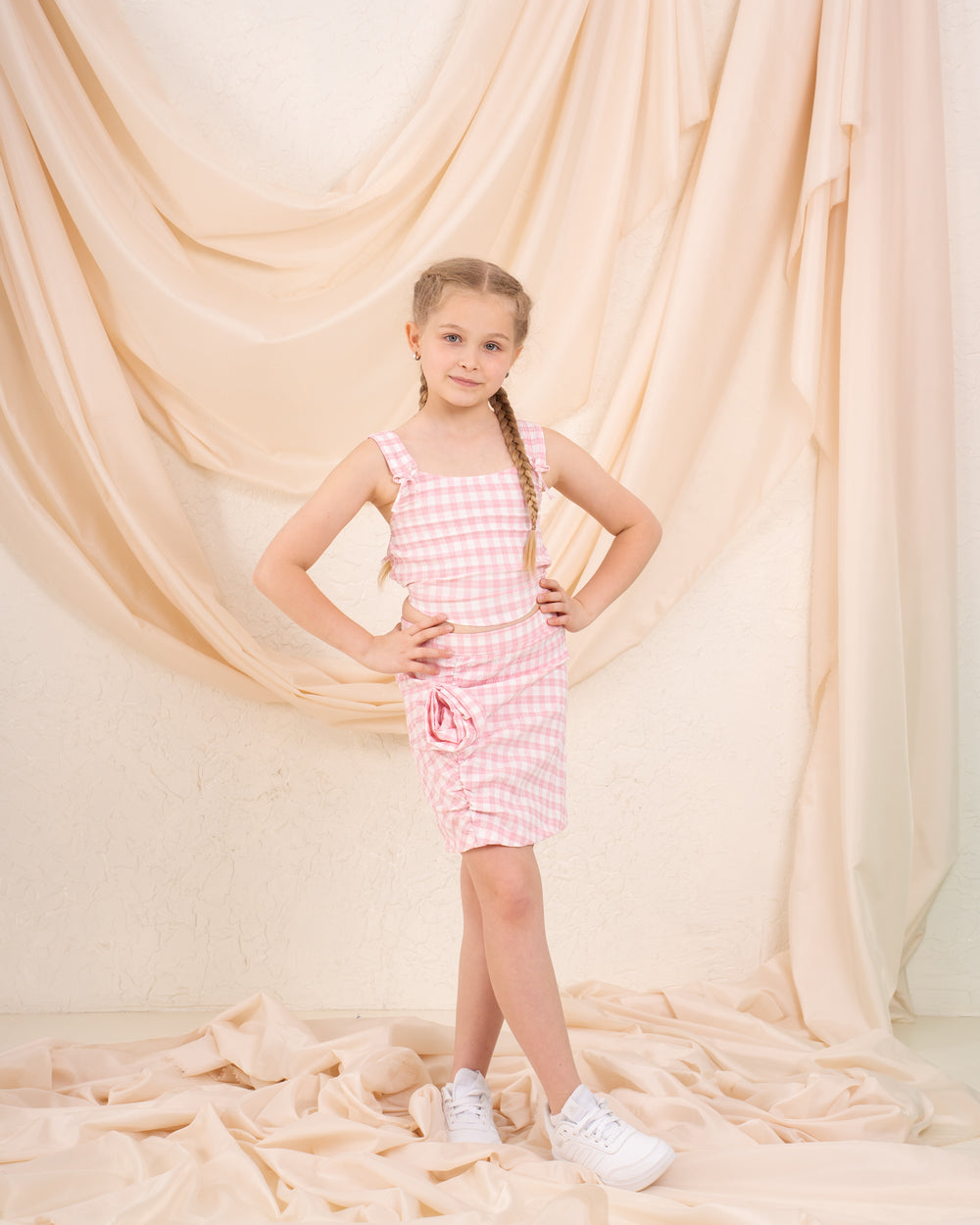 A playful and vibrant coordinated set for girls, featuring a classic gingham check pattern and a charming 3D flower detail.