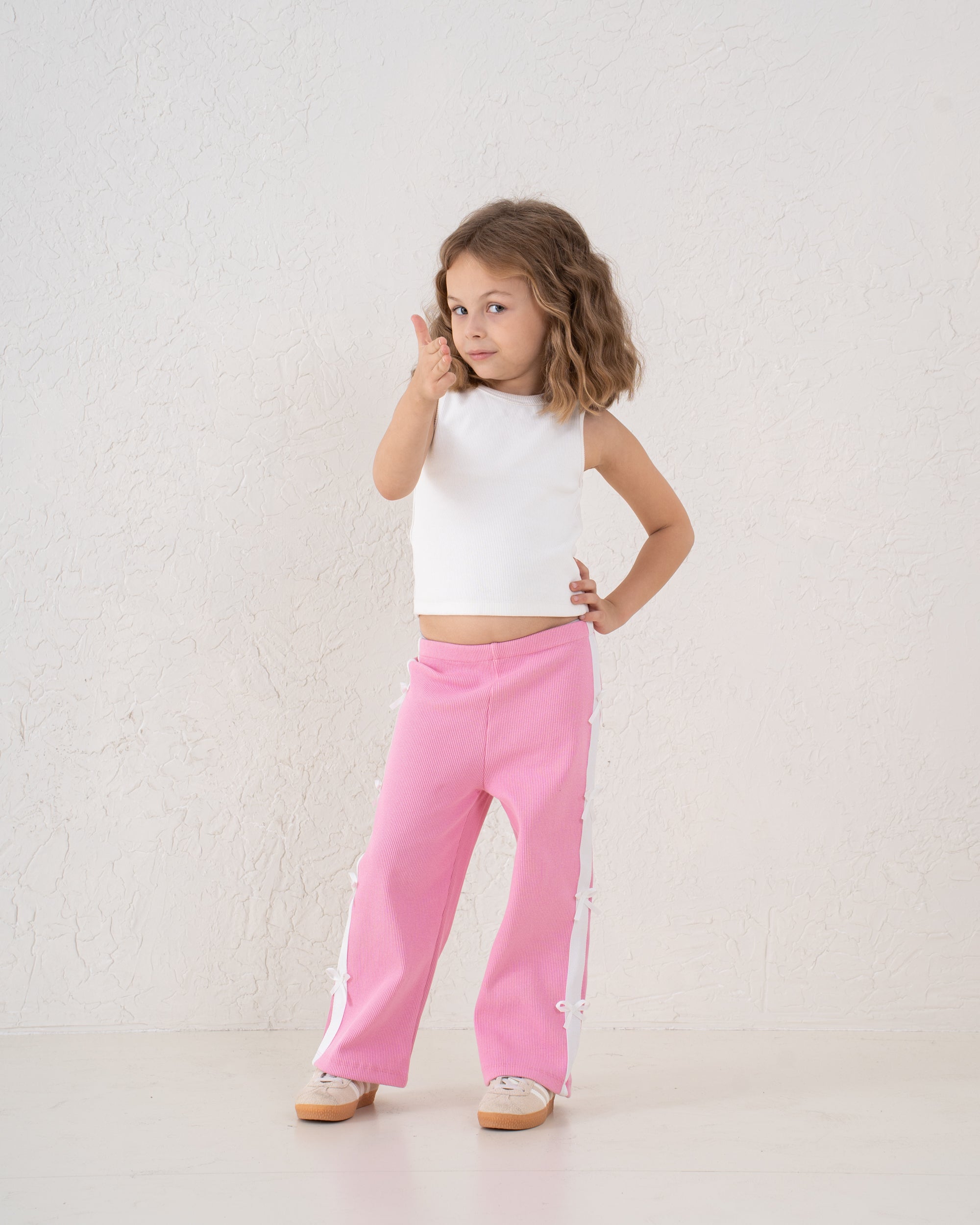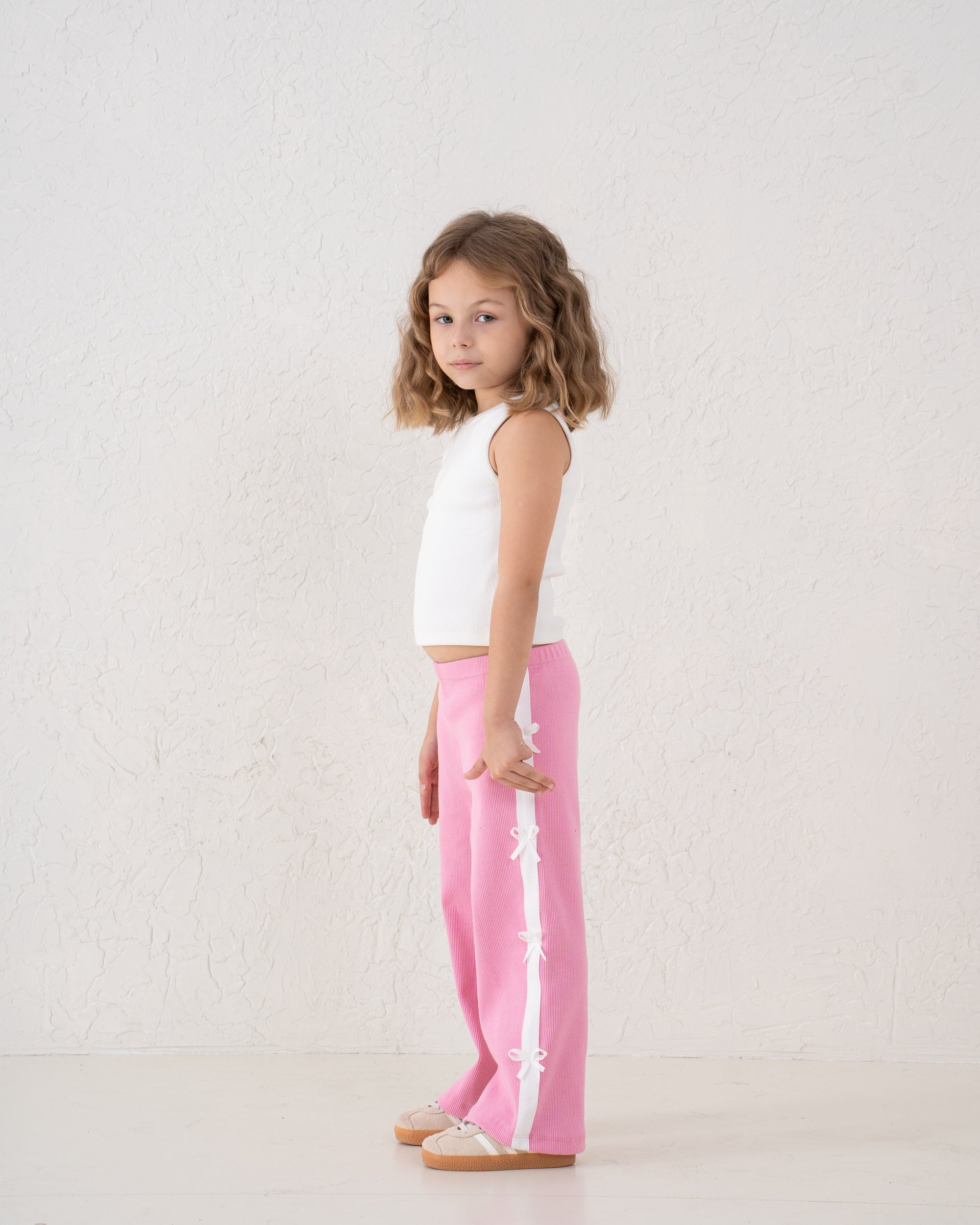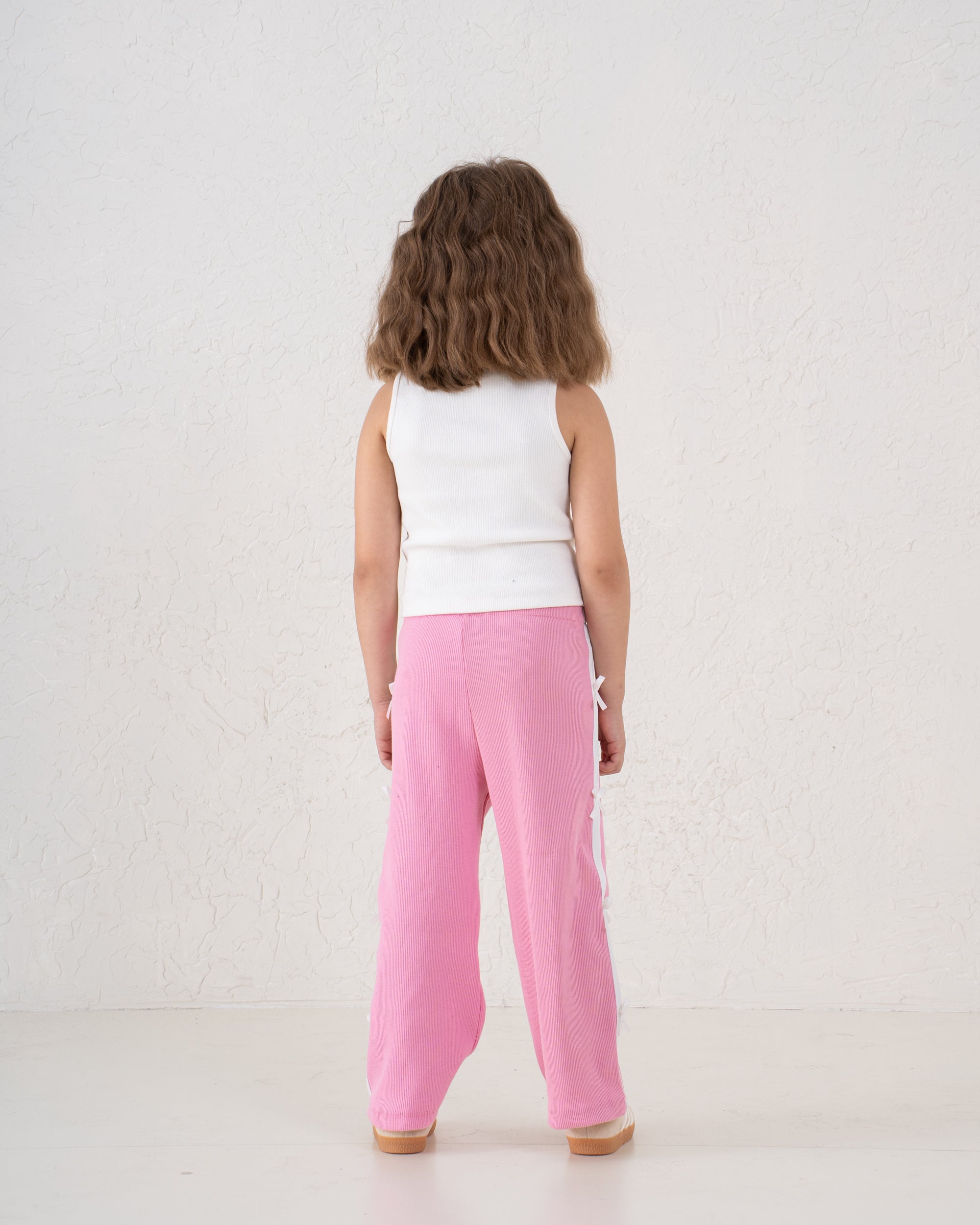 Comfortable ribbed wide-leg pants adorned with bow trims down the sides. A stylish statement piece that brings sweetness to casual dressing.