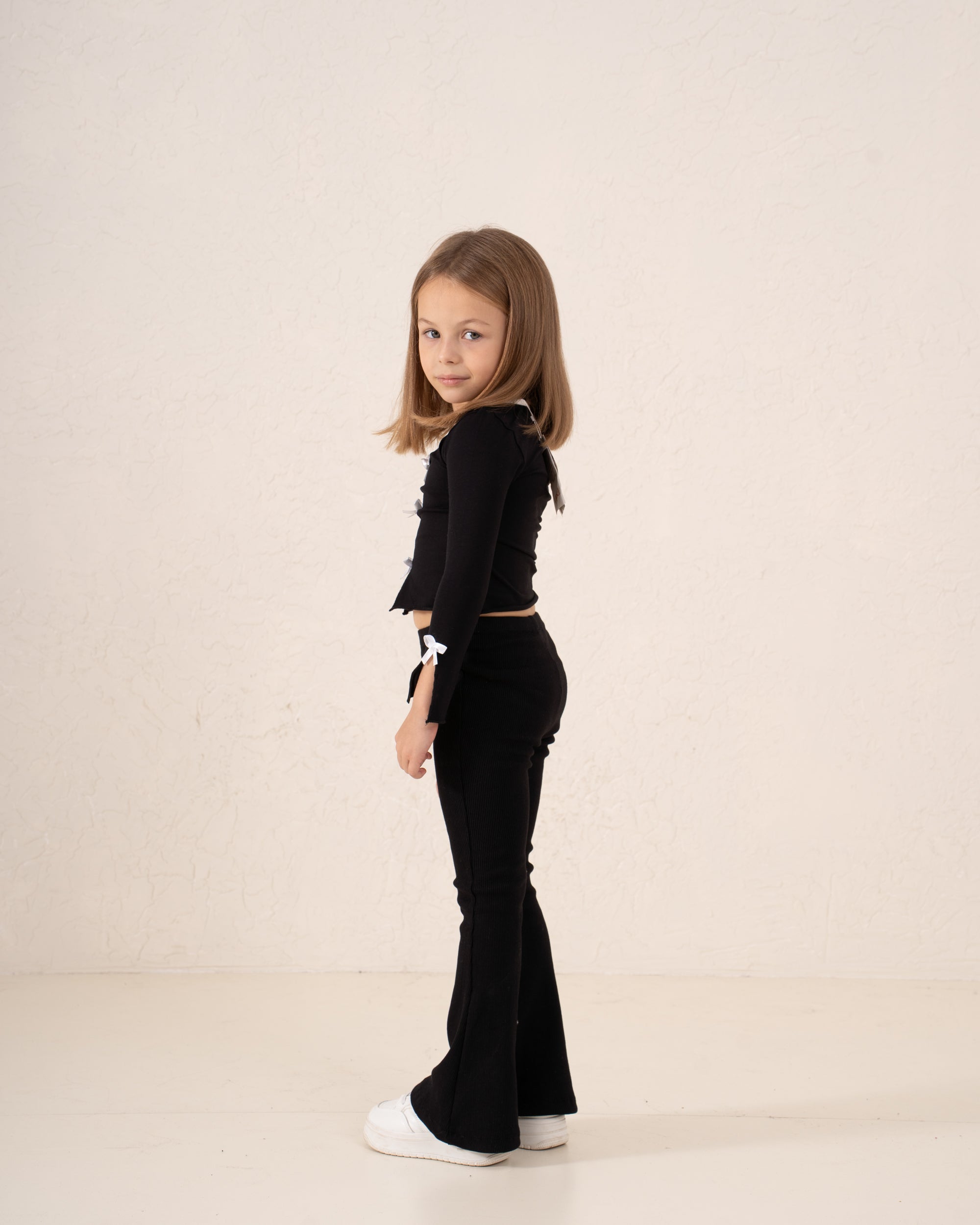A stylish fitted top with contrast bow detailing for a chic, modern look. Made from soft stretch fabric, it features front bow appliqués and contrast trim for a playful yet elegant touch.
