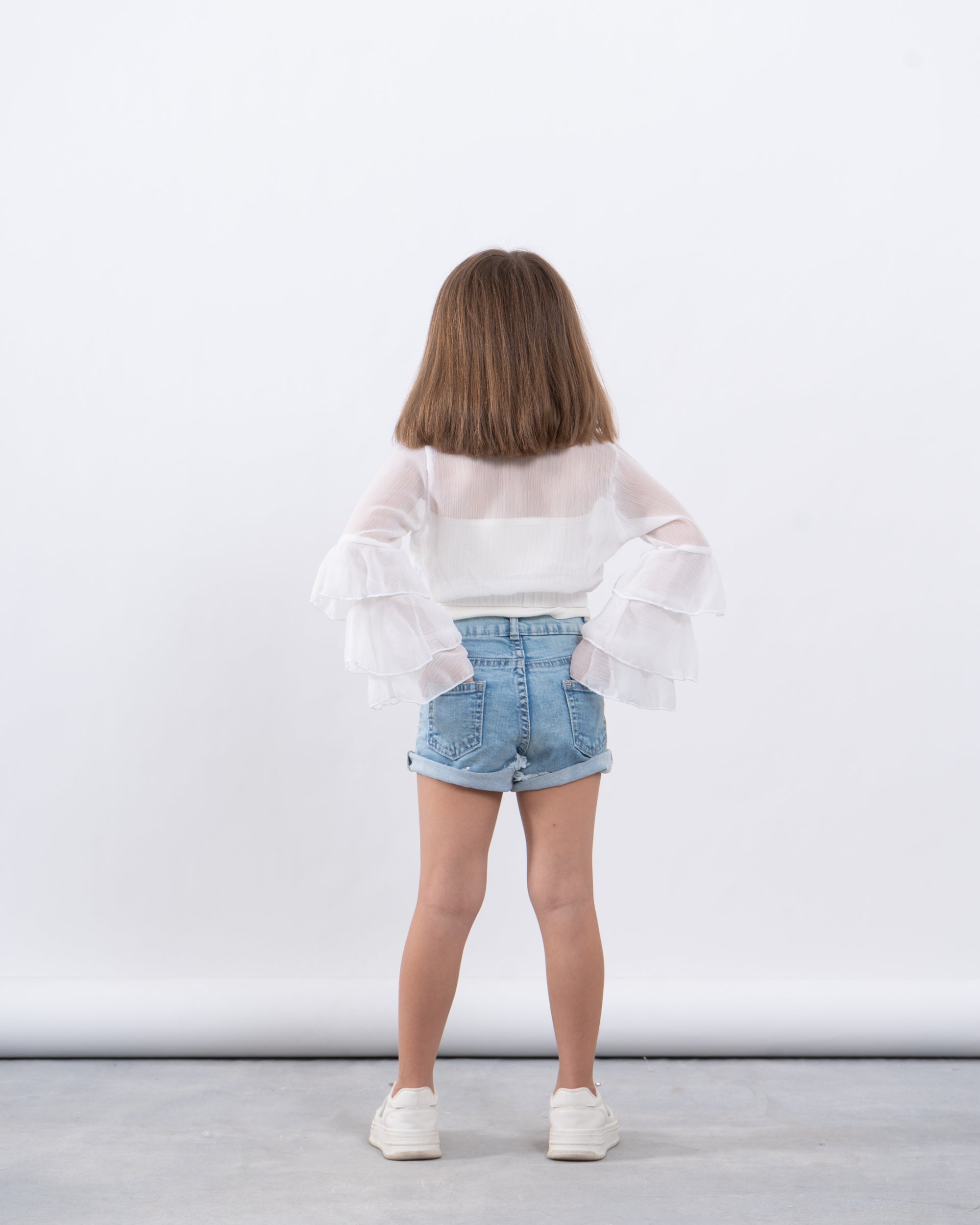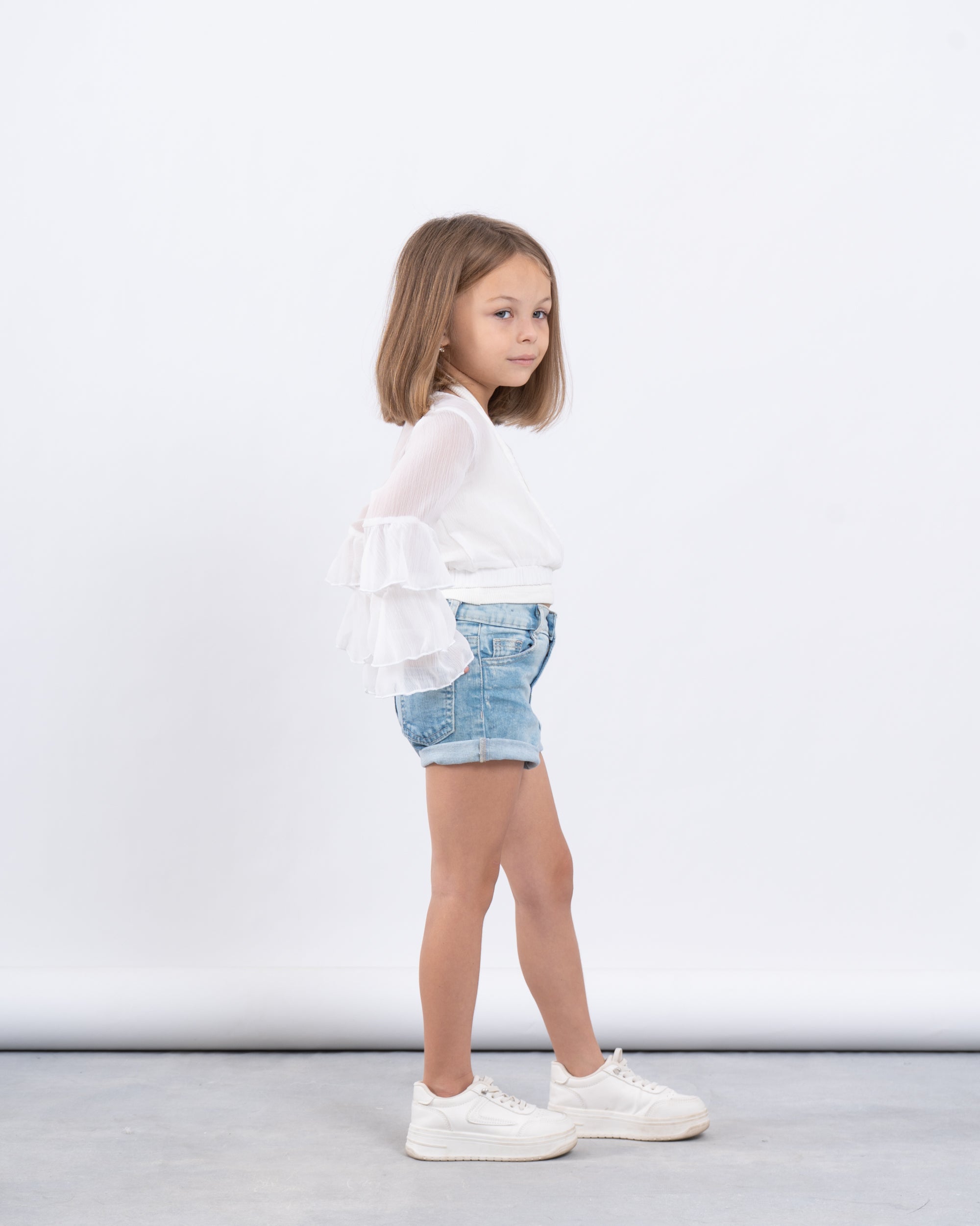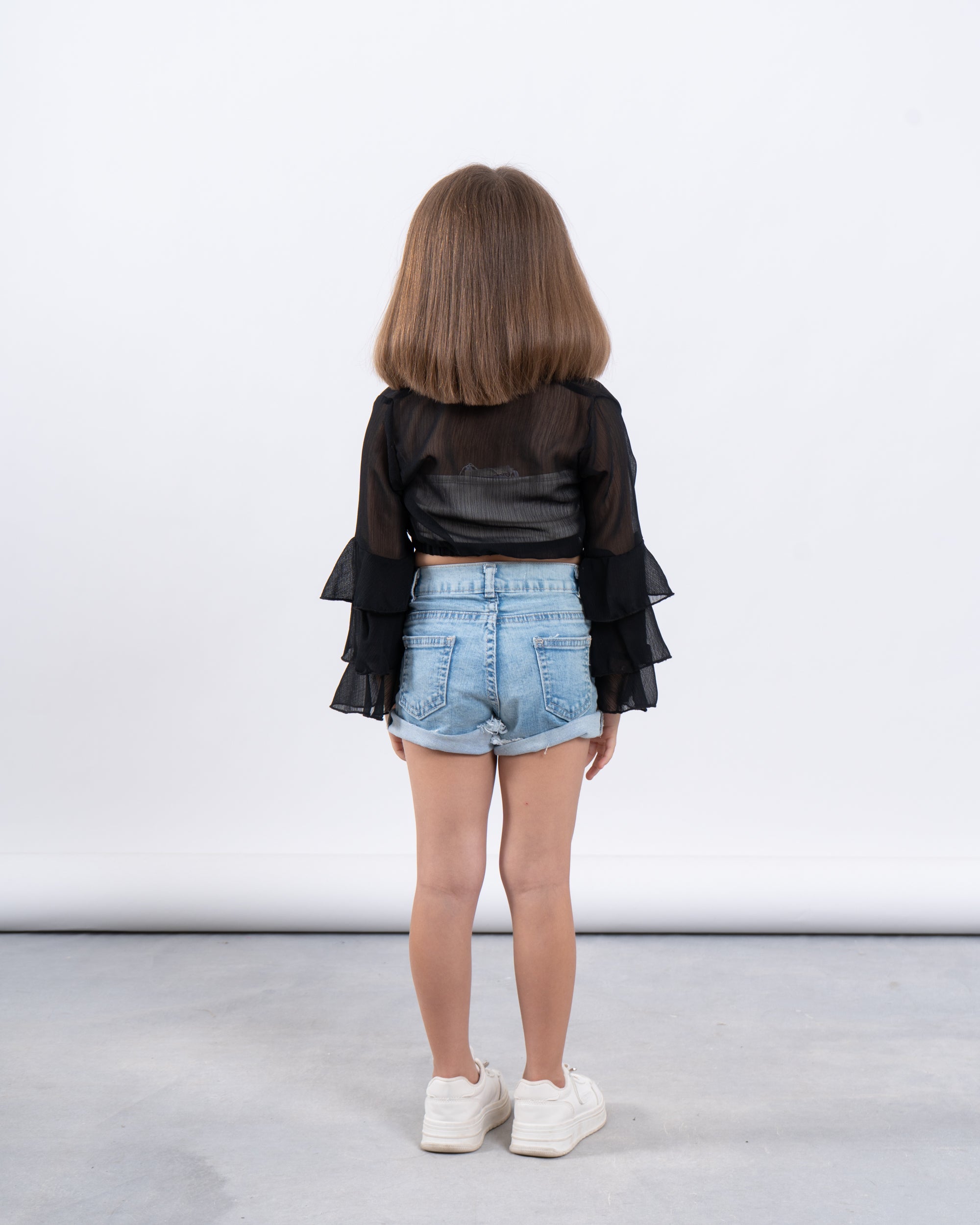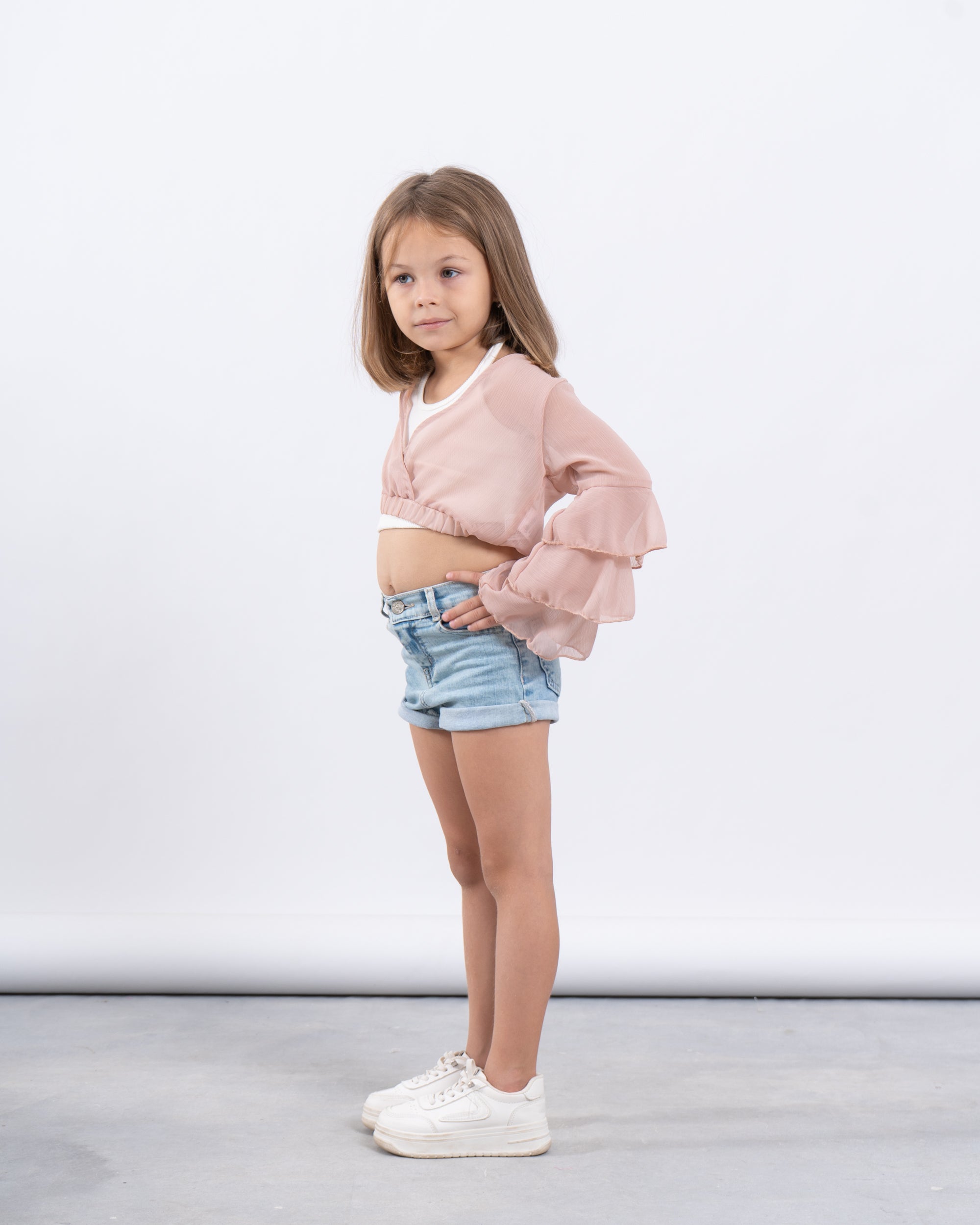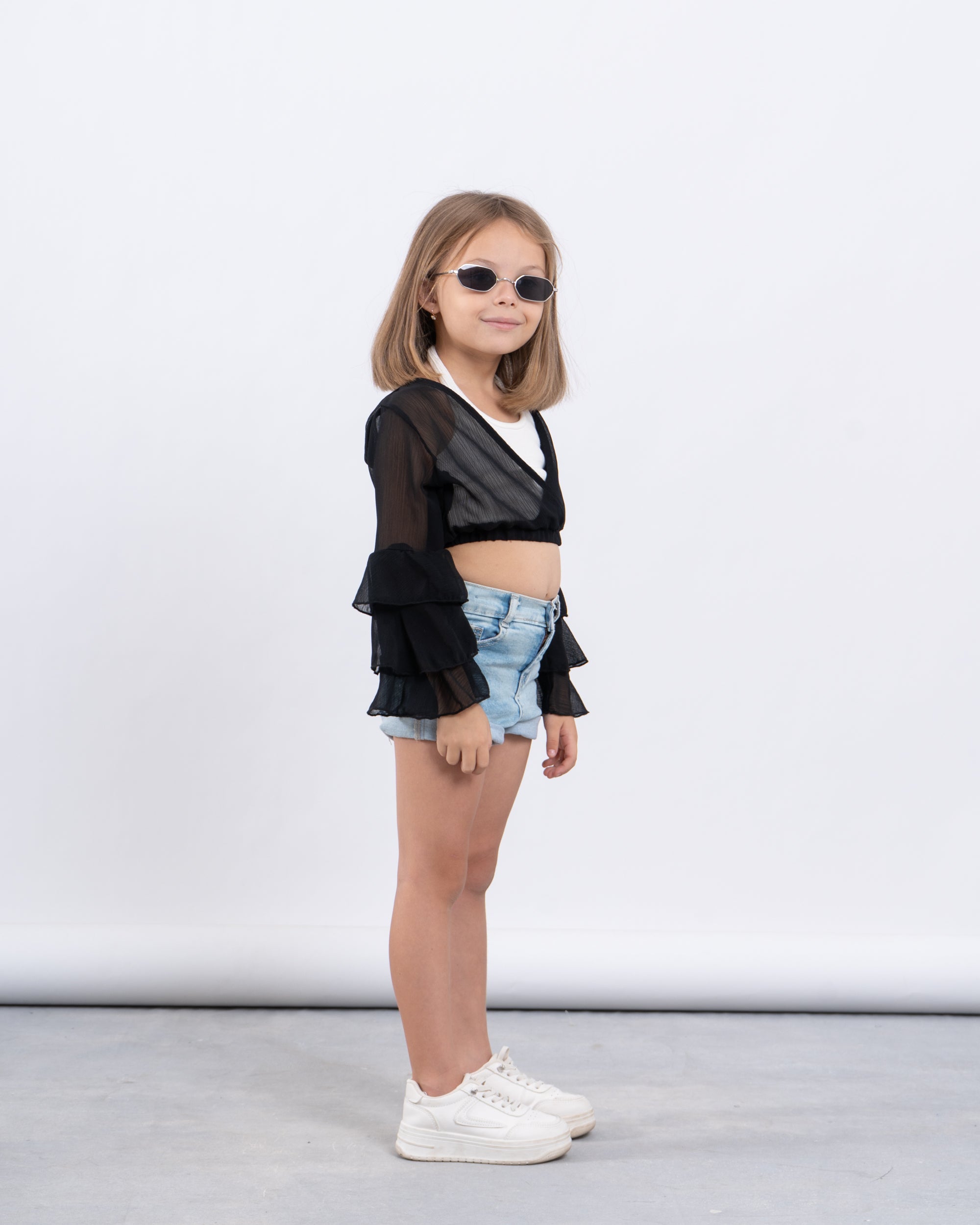 Made to match with mom! This mini version of our sheer ruffle top is cropped with a wrap effect and elastic hem—perfect for playdates and twinning moments.