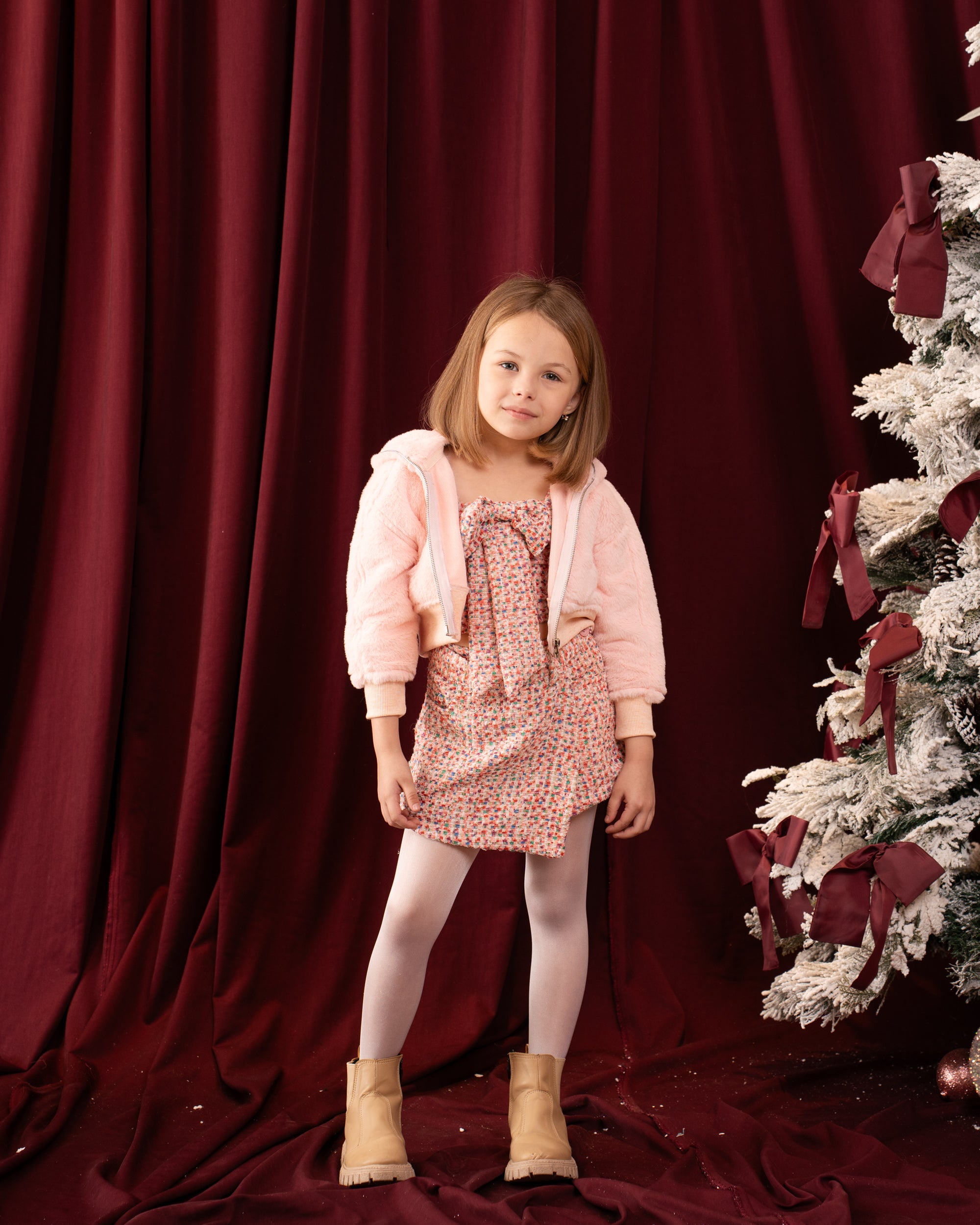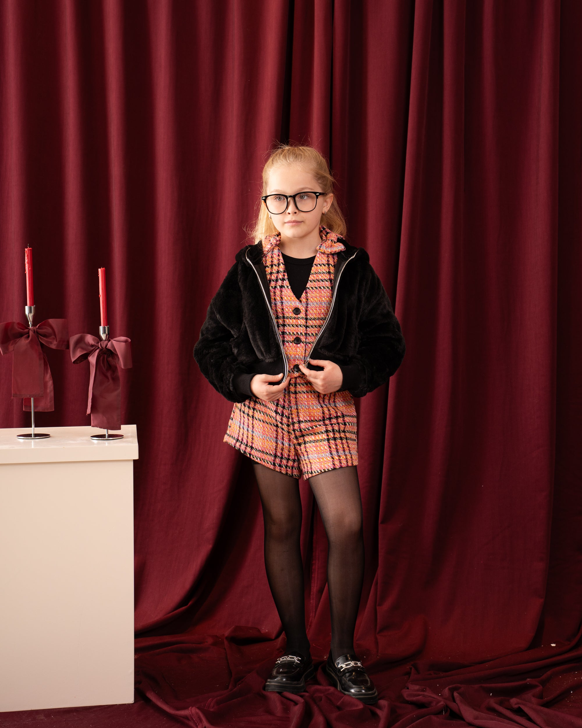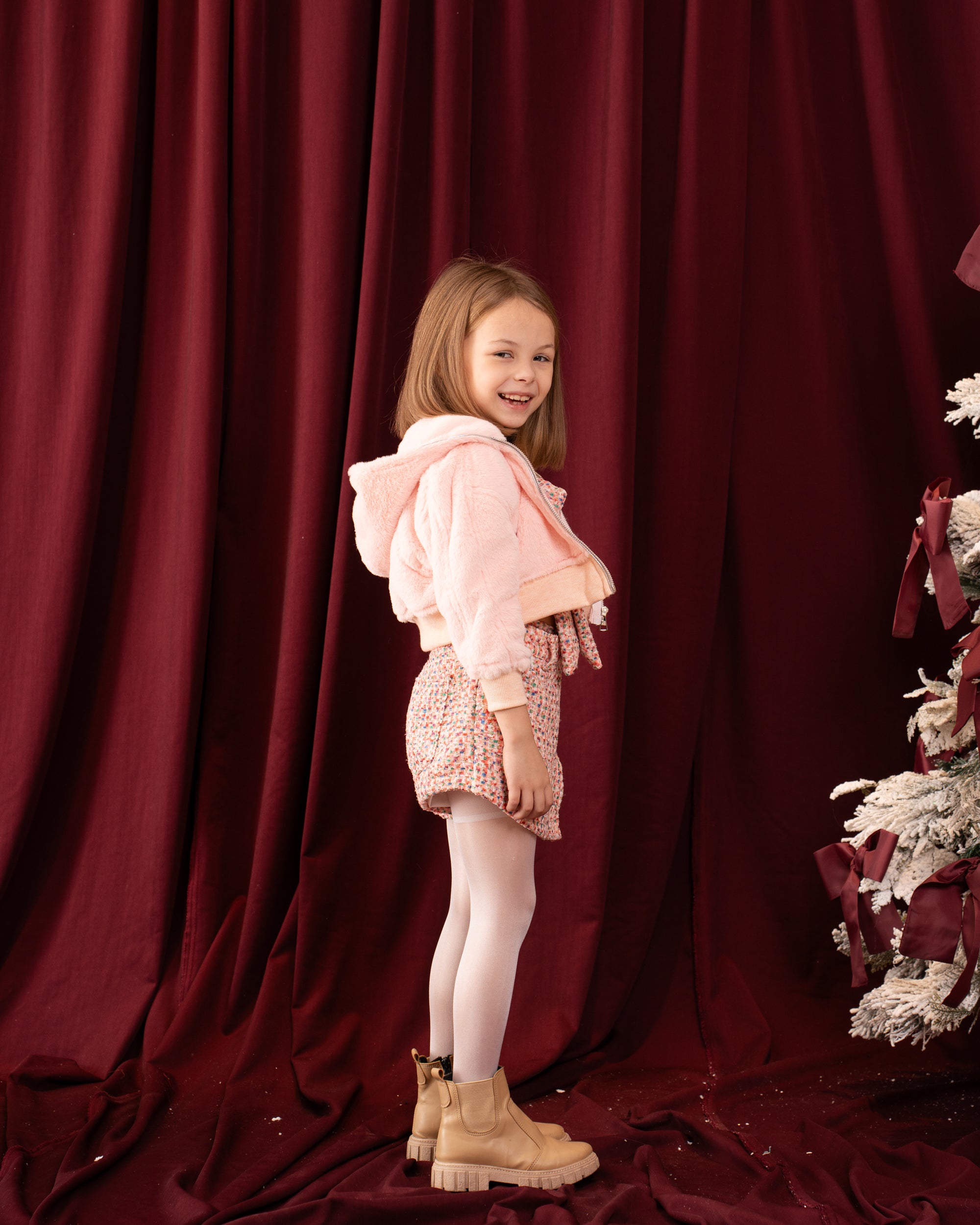 A cozy faux fur bomber jacket designed to keep little ones warm while adding a playful, stylish layer. Soft, lightweight, and easy to throw on over any outfit.