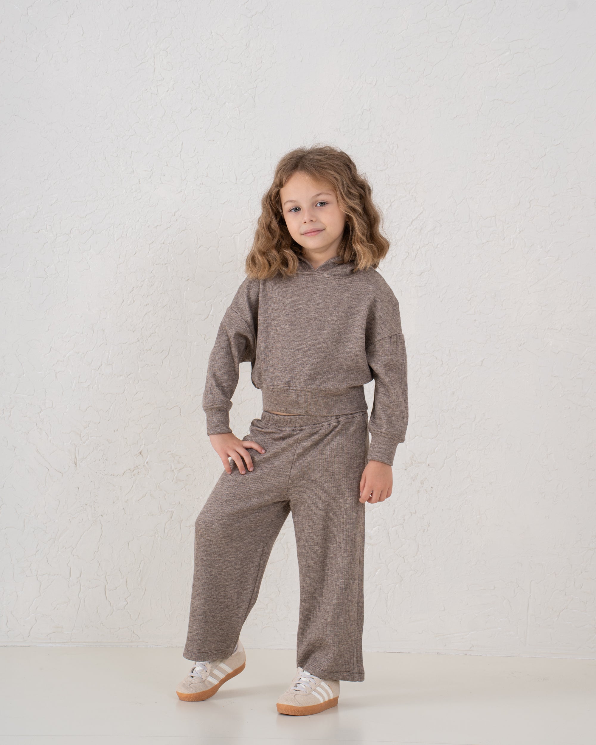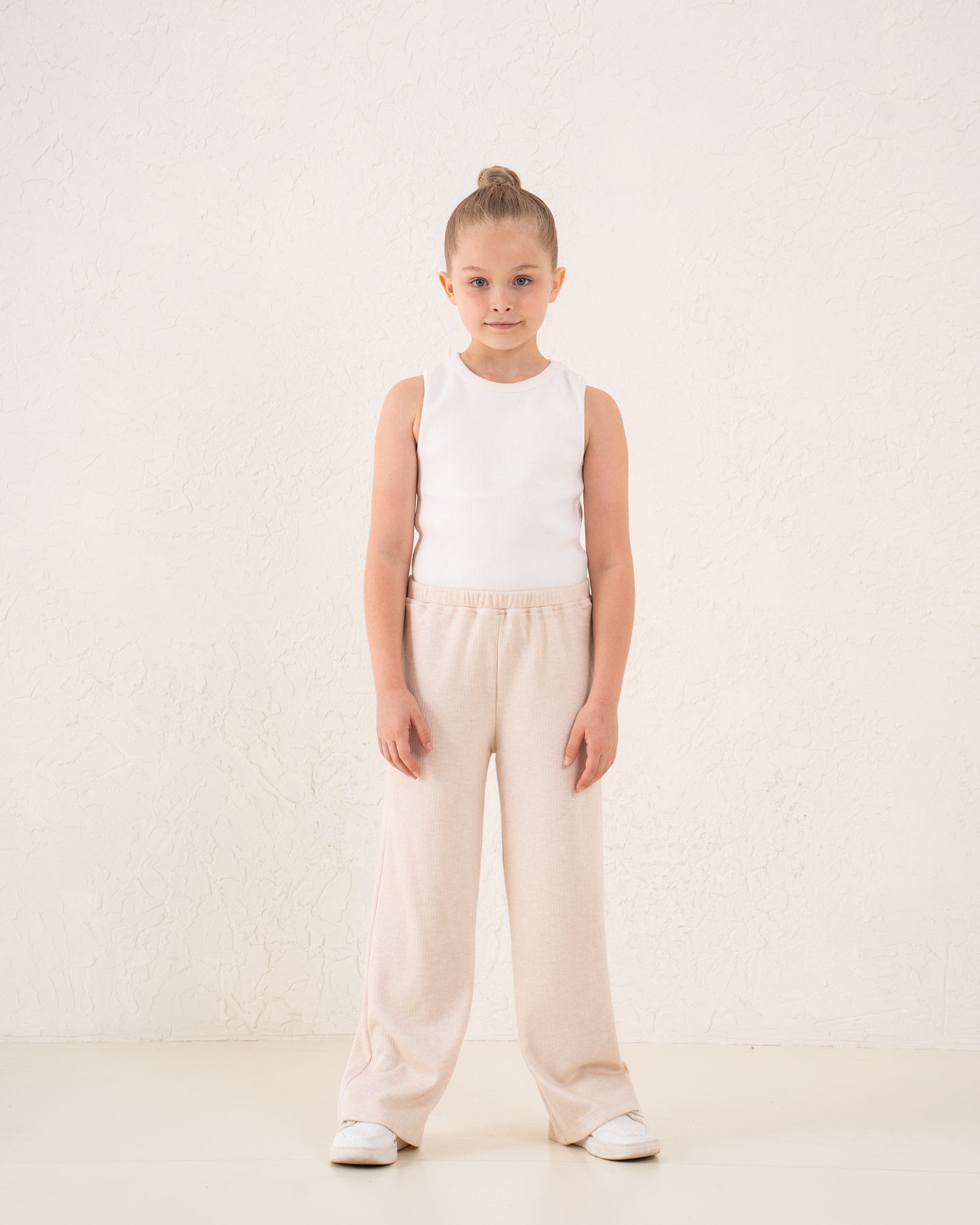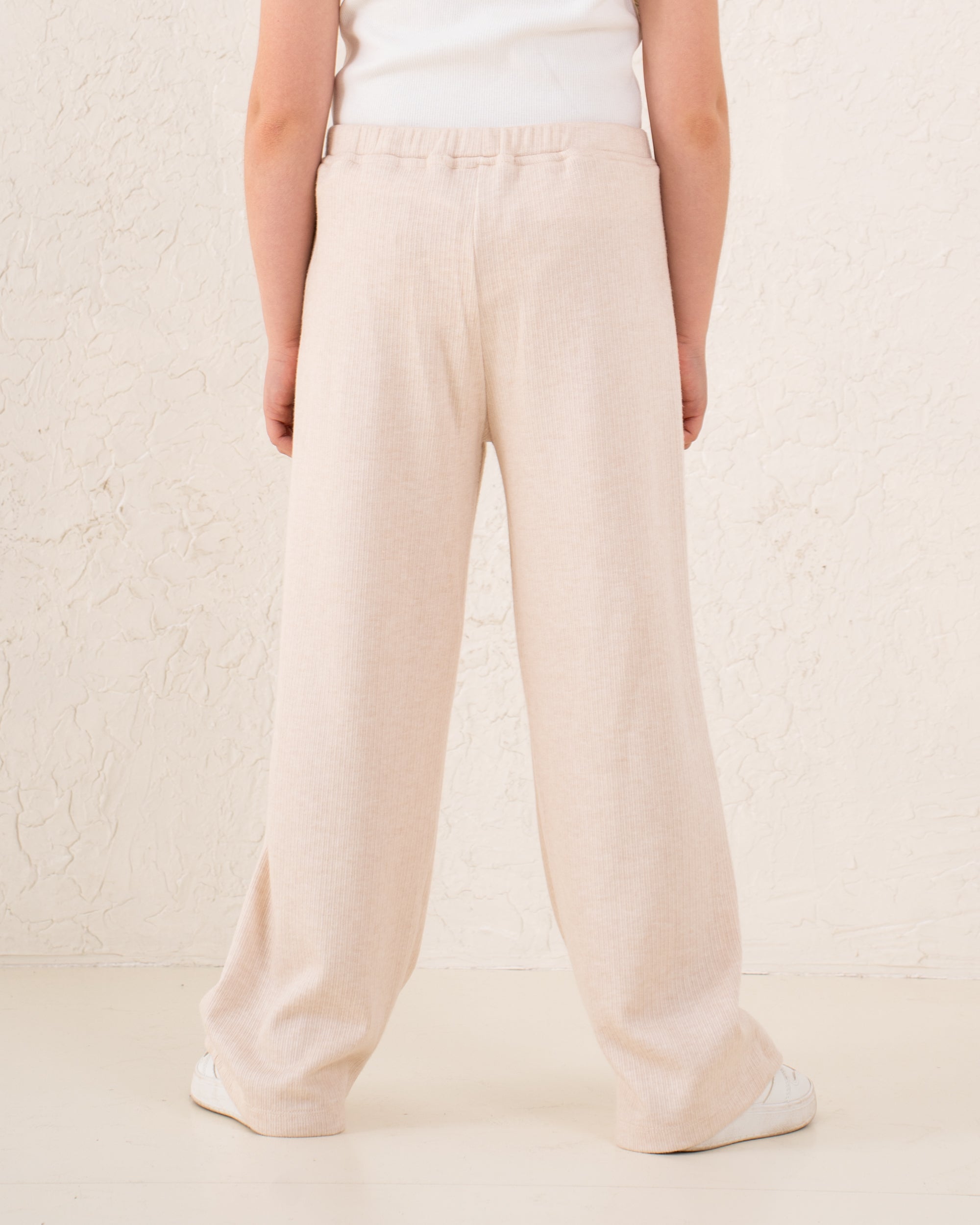 Soft knit pants featuring a relaxed wide-leg cut and a comfortable elastic waistband. Perfect for coordinated sets or everyday styling.