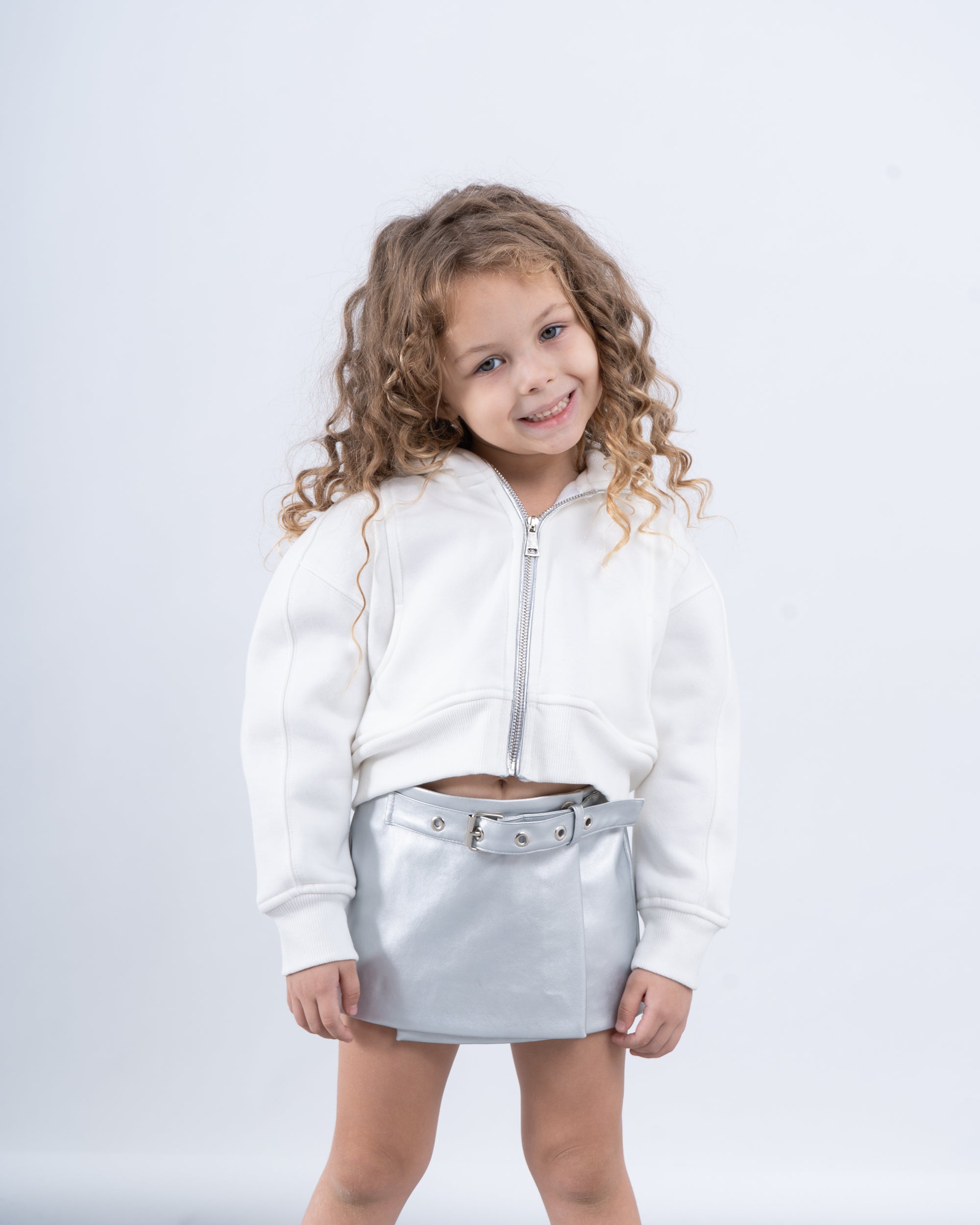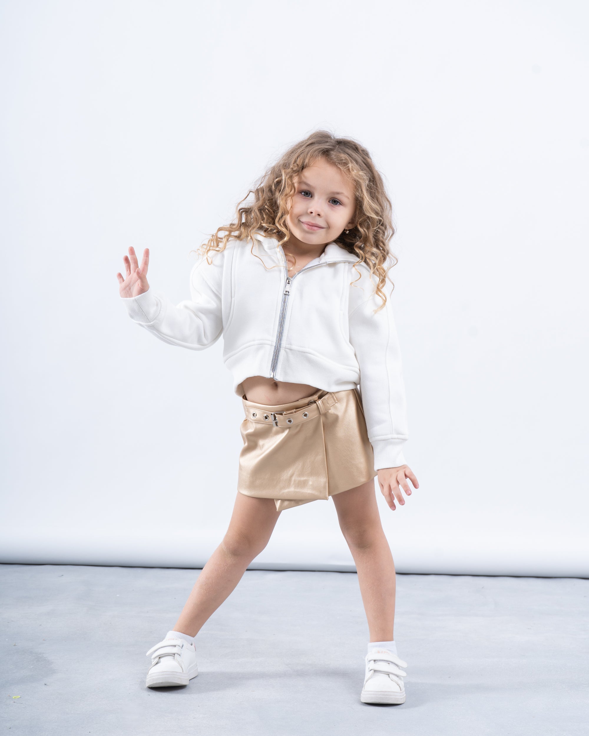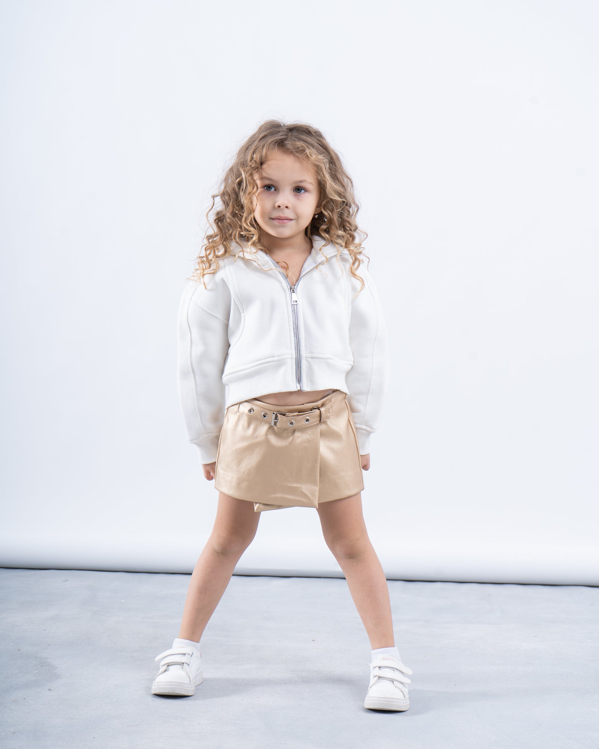 Elevate their style with this chic leather skort, designed for young trendsetters. This skort combines the classic look of a skirt with the comfort and practicality of shorts, perfect for playdates or family outings. The sleek faux leather finish and adjustable belt add a touch of sophistication, while the soft inner lining ensures all-day comfort. Pair it with tights and boots for a fashion-forward, season-ready look.