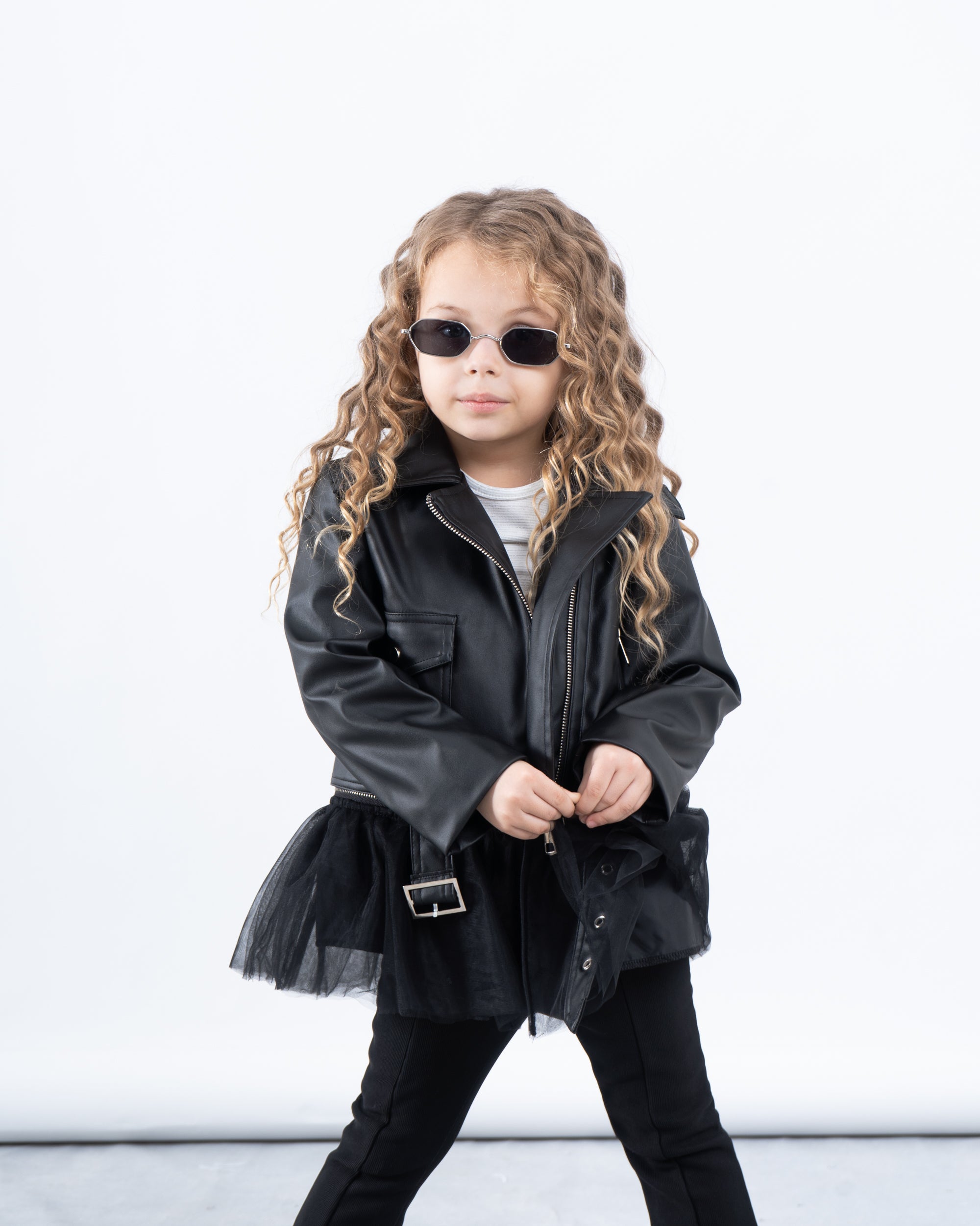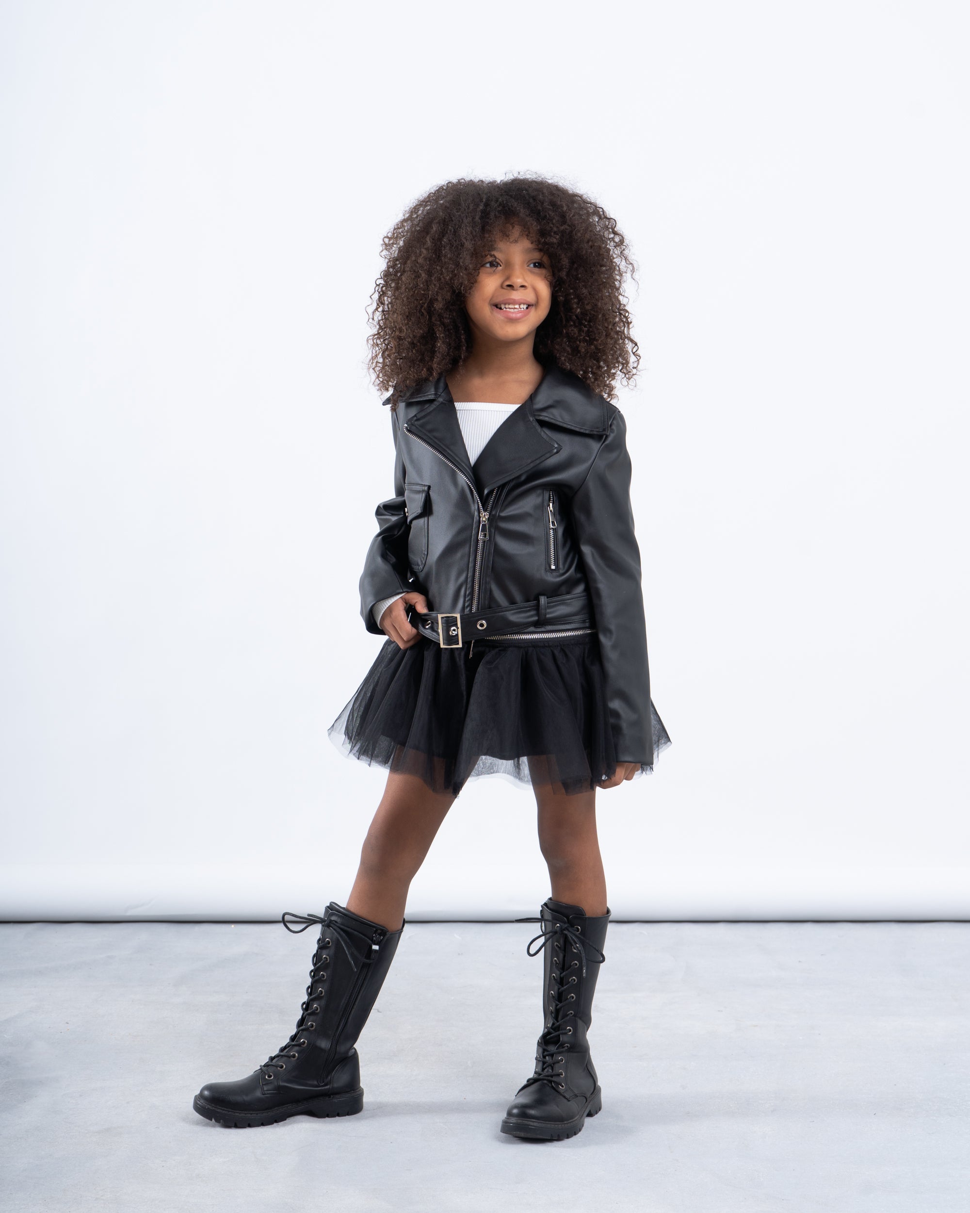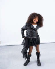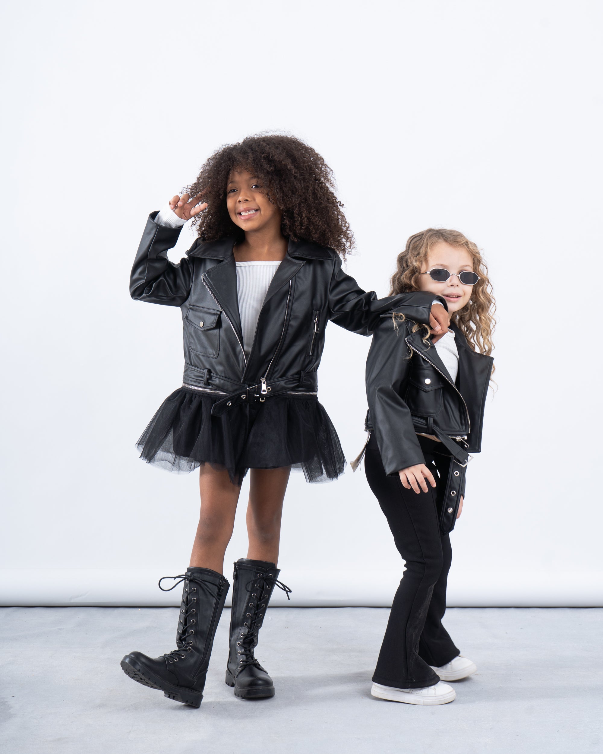 A bold and versatile take on the classic biker jacket. This faux leather piece features a unique detachable lower panel, allowing you to transform it into a cropped style by unzipping the section. Designed with silver-tone hardware, an asymmetrical front zip, and a sleek, structured fit, this jacket is perfect for adding an edge to any outfit.