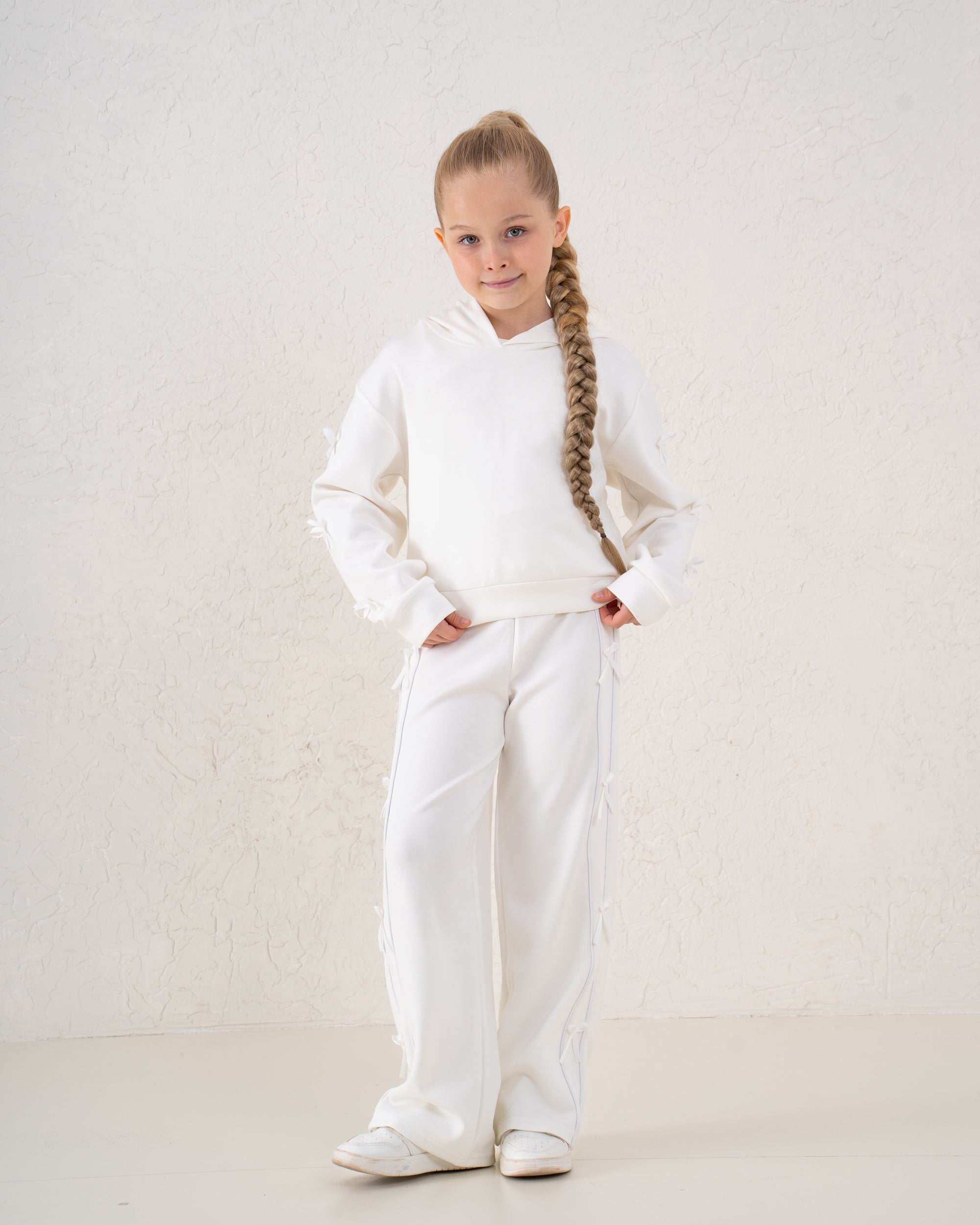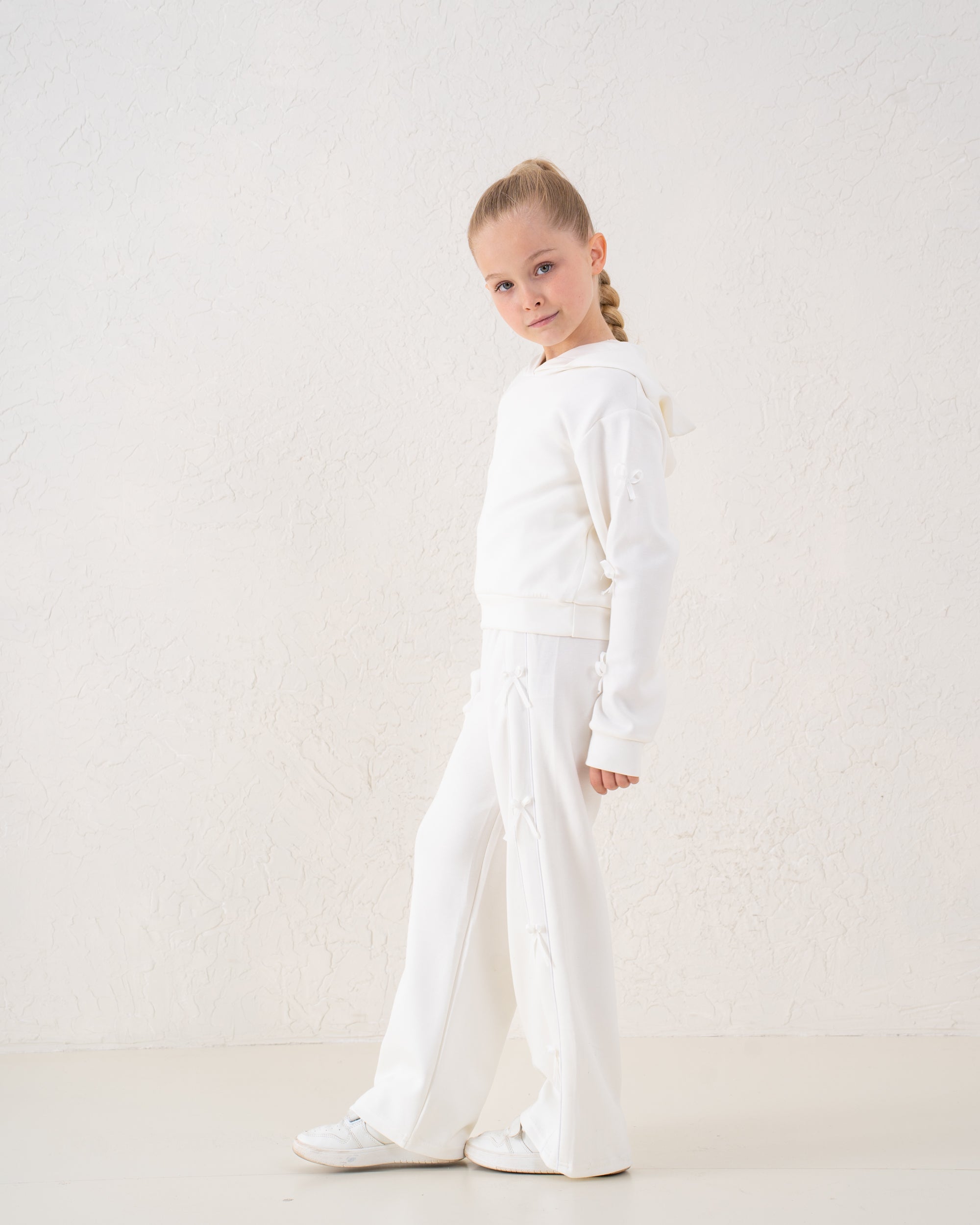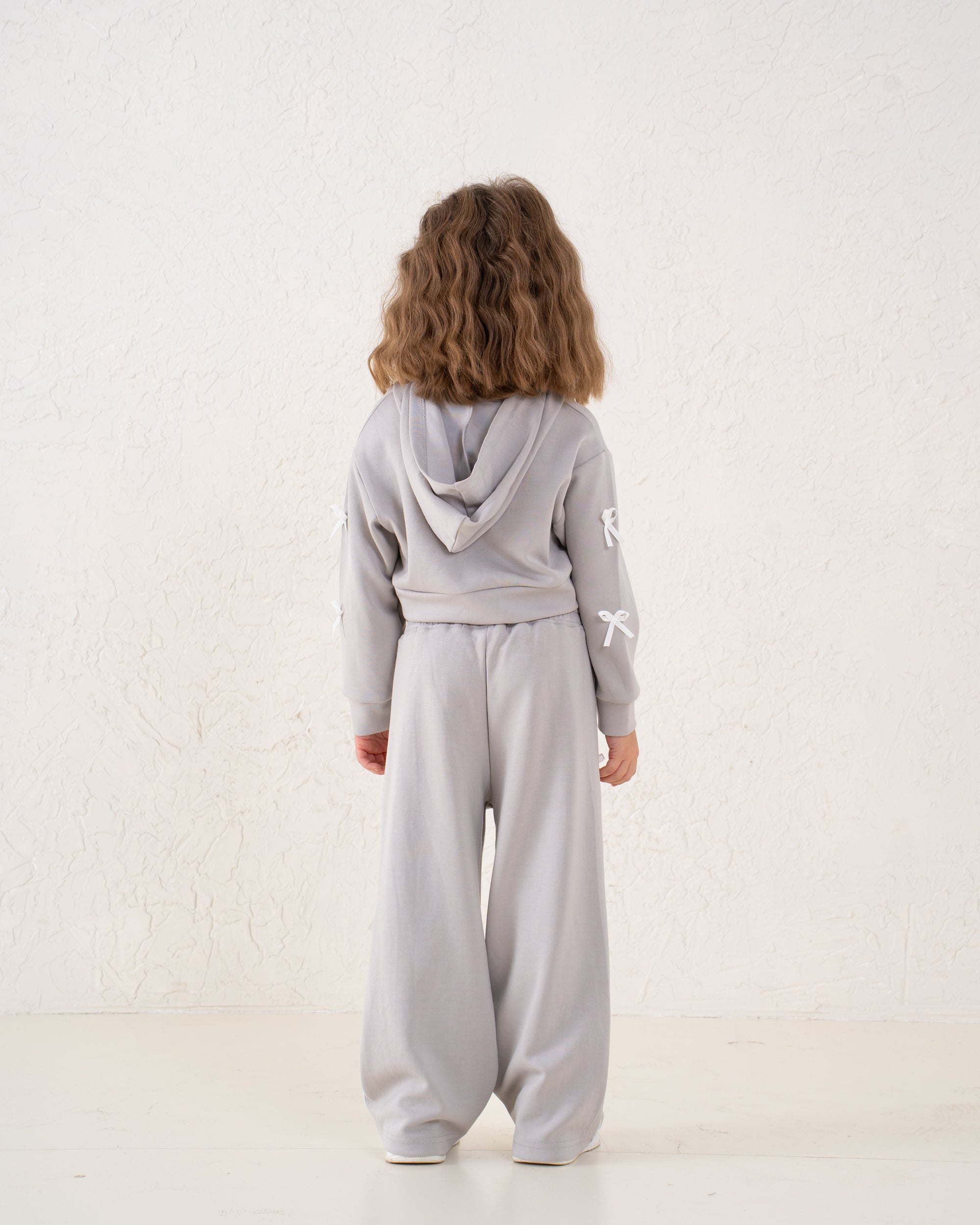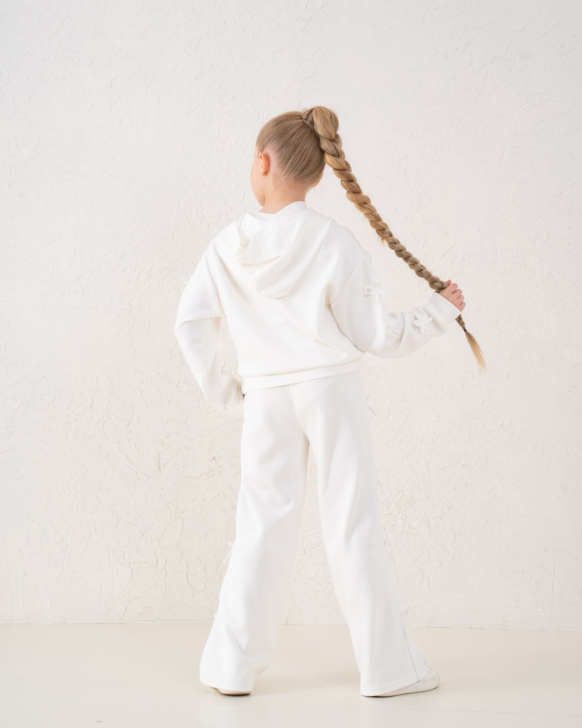 A soft jersey hoodie designed with delicate bow trims along the sleeves for a feminine, playful touch. Lightweight and comfortable with a relaxed silhouette, perfect for matching moments.