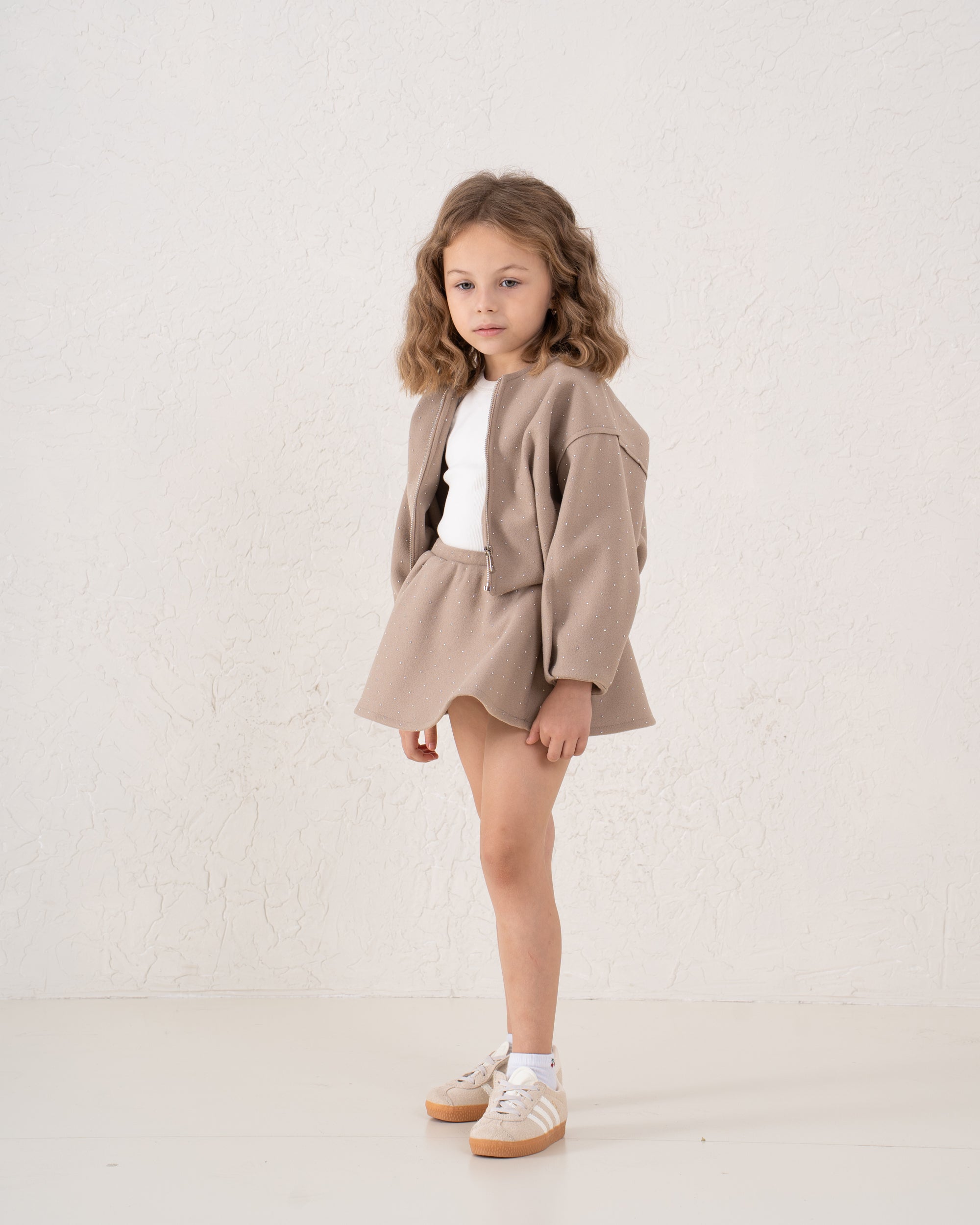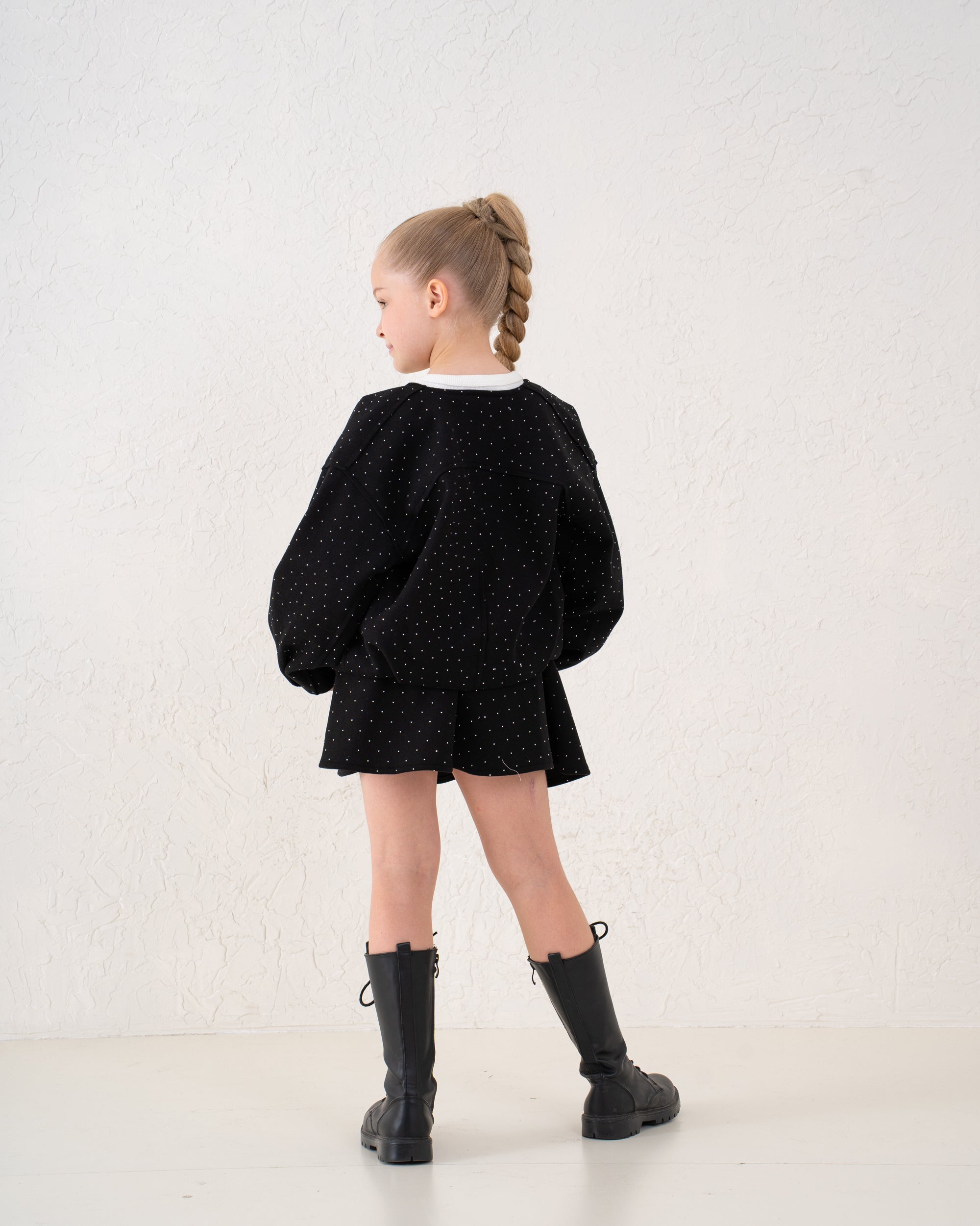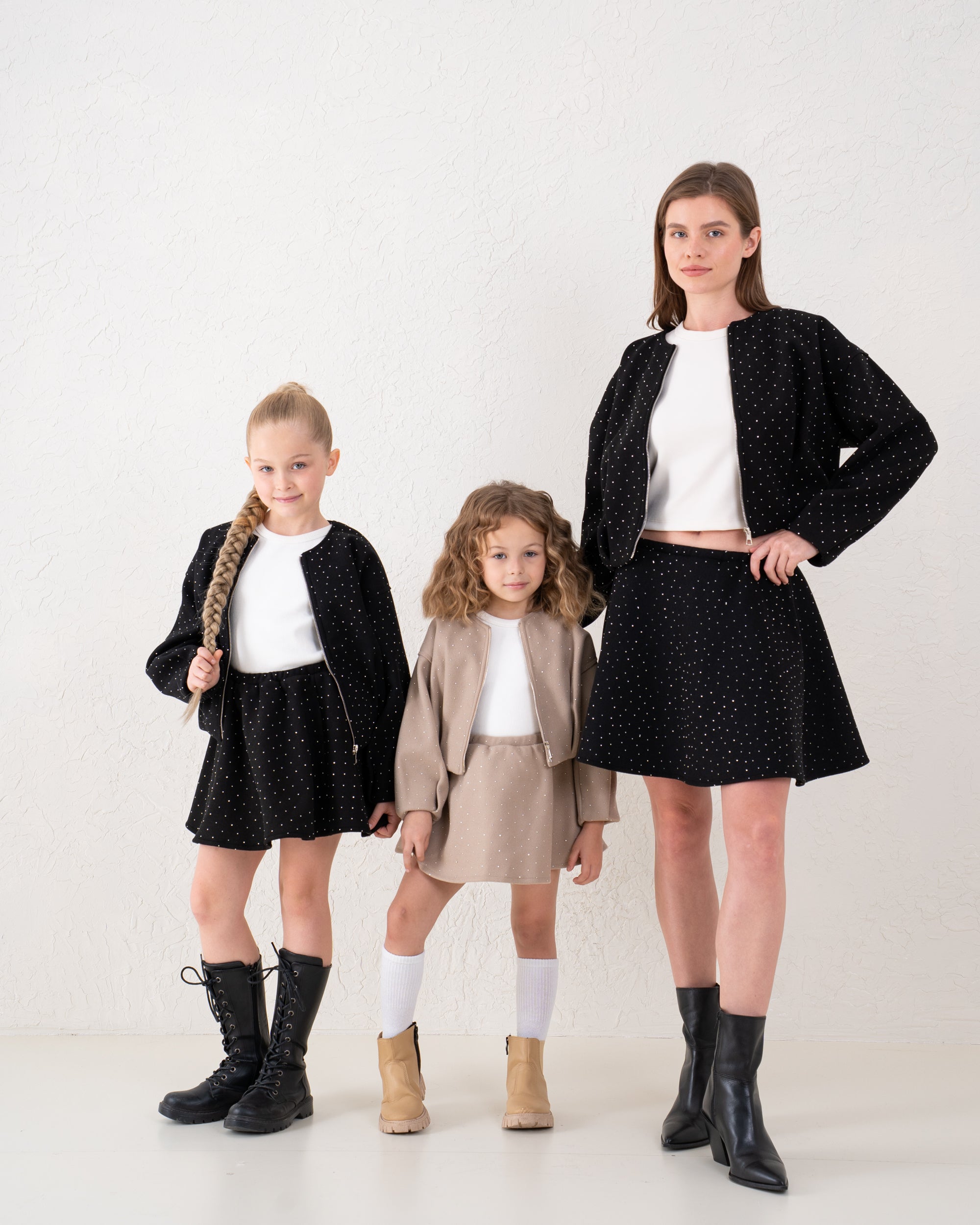 A chic cropped jacket adorned with subtle sparkling embellishments for a refined, elegant shine. Designed with a clean round neckline and relaxed sleeves, perfect for dressing up any outfit or twinning in style.