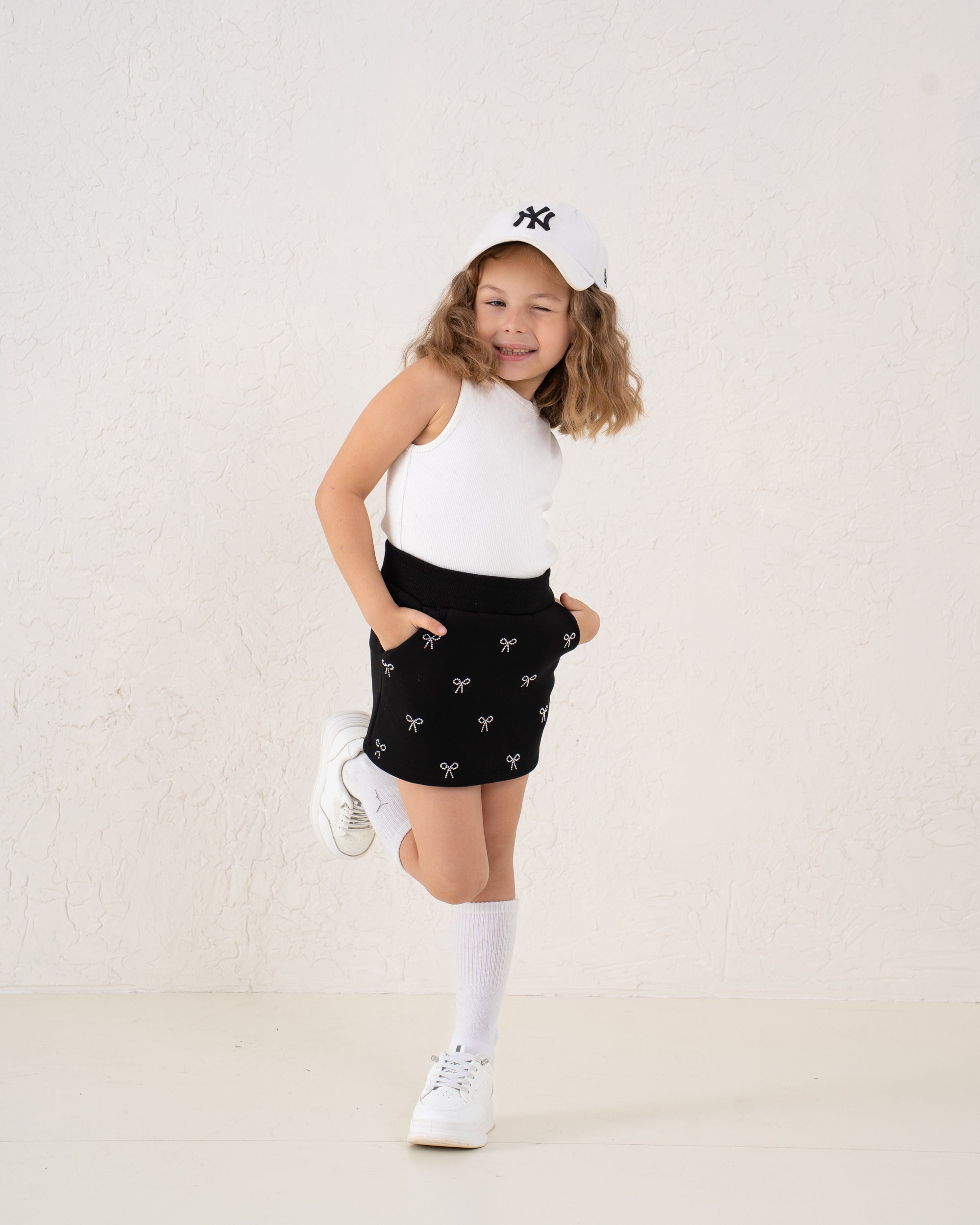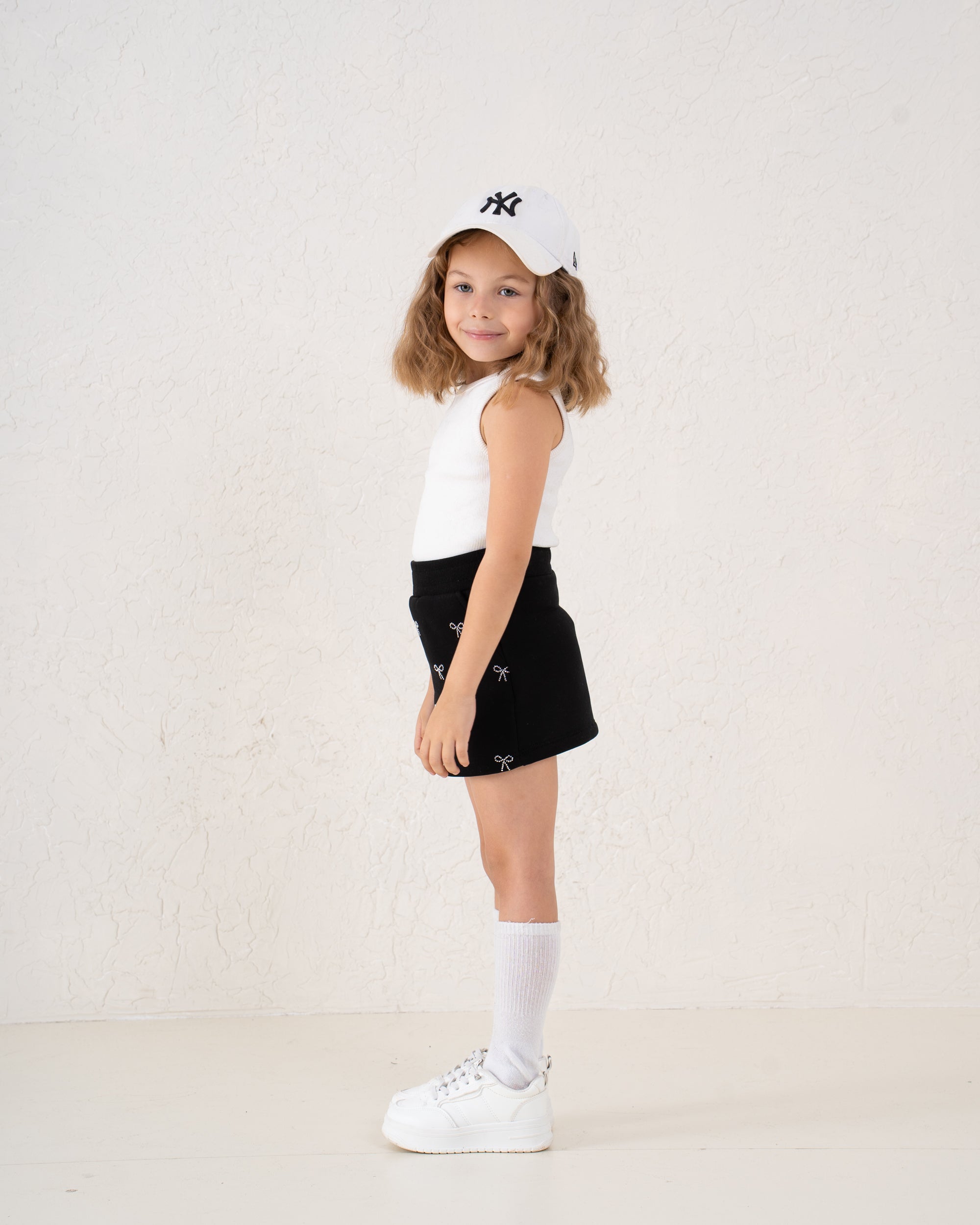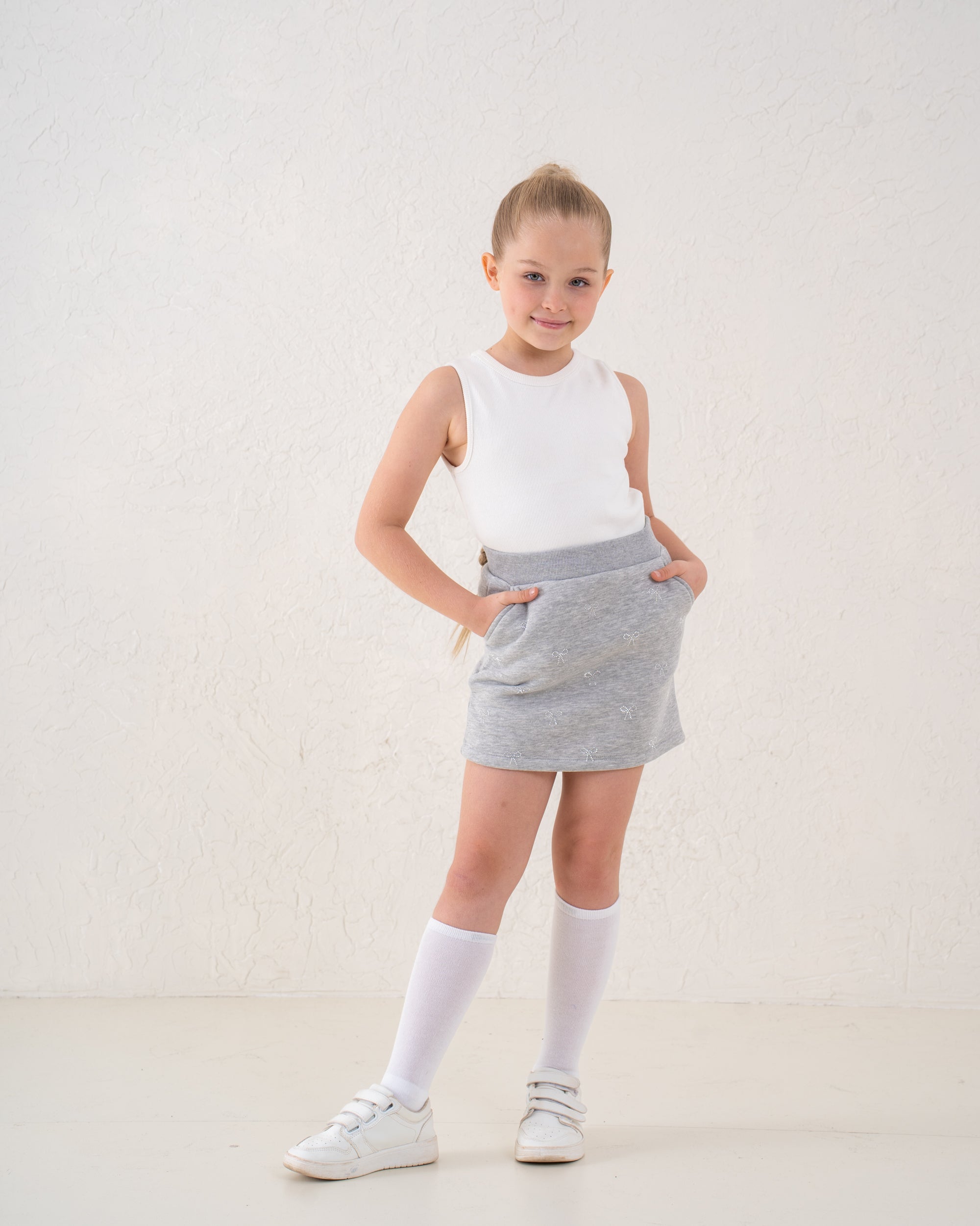 A cute fleece-lined mini skirt accented with sparkling bow details, crafted for little girls who love style and comfort.