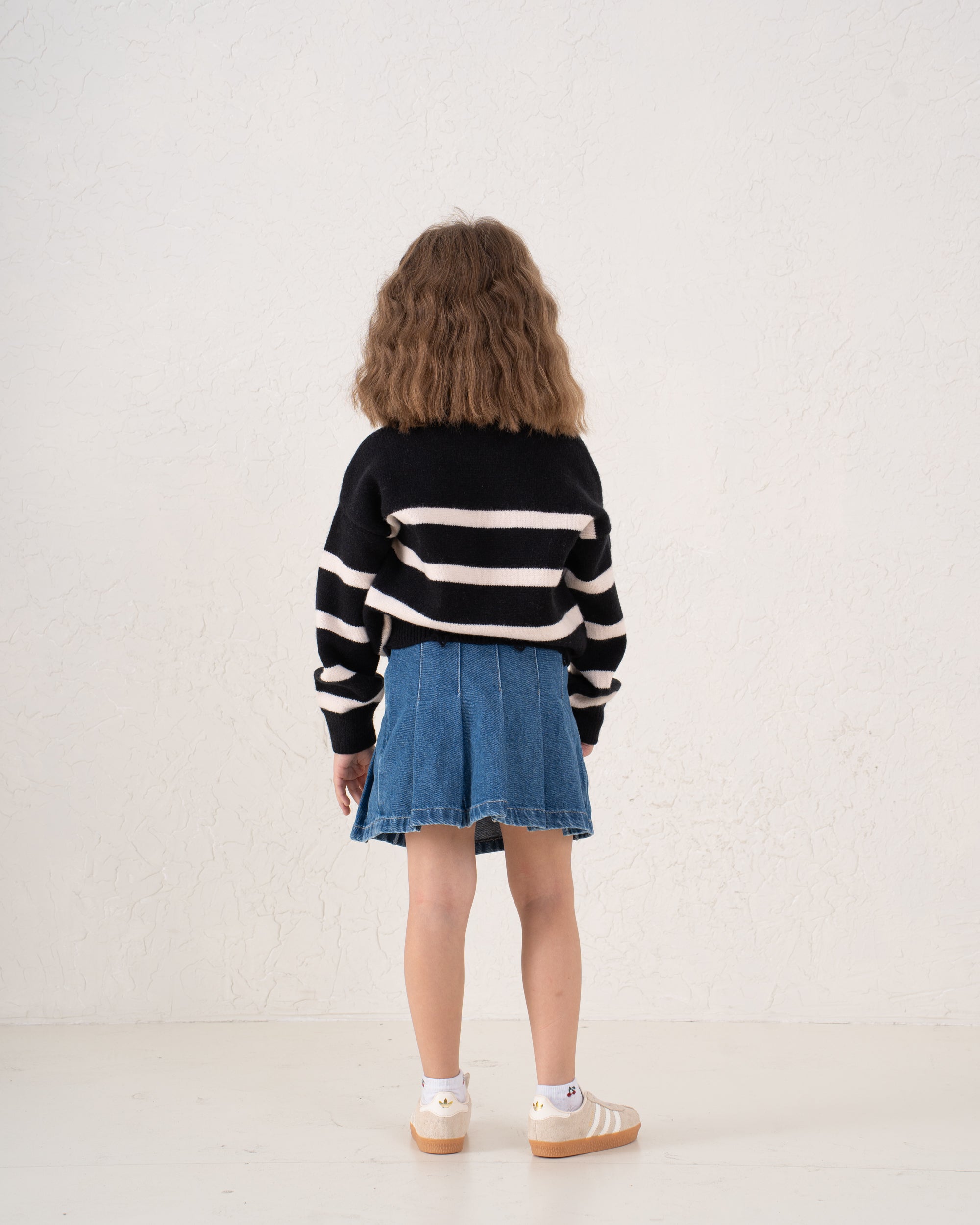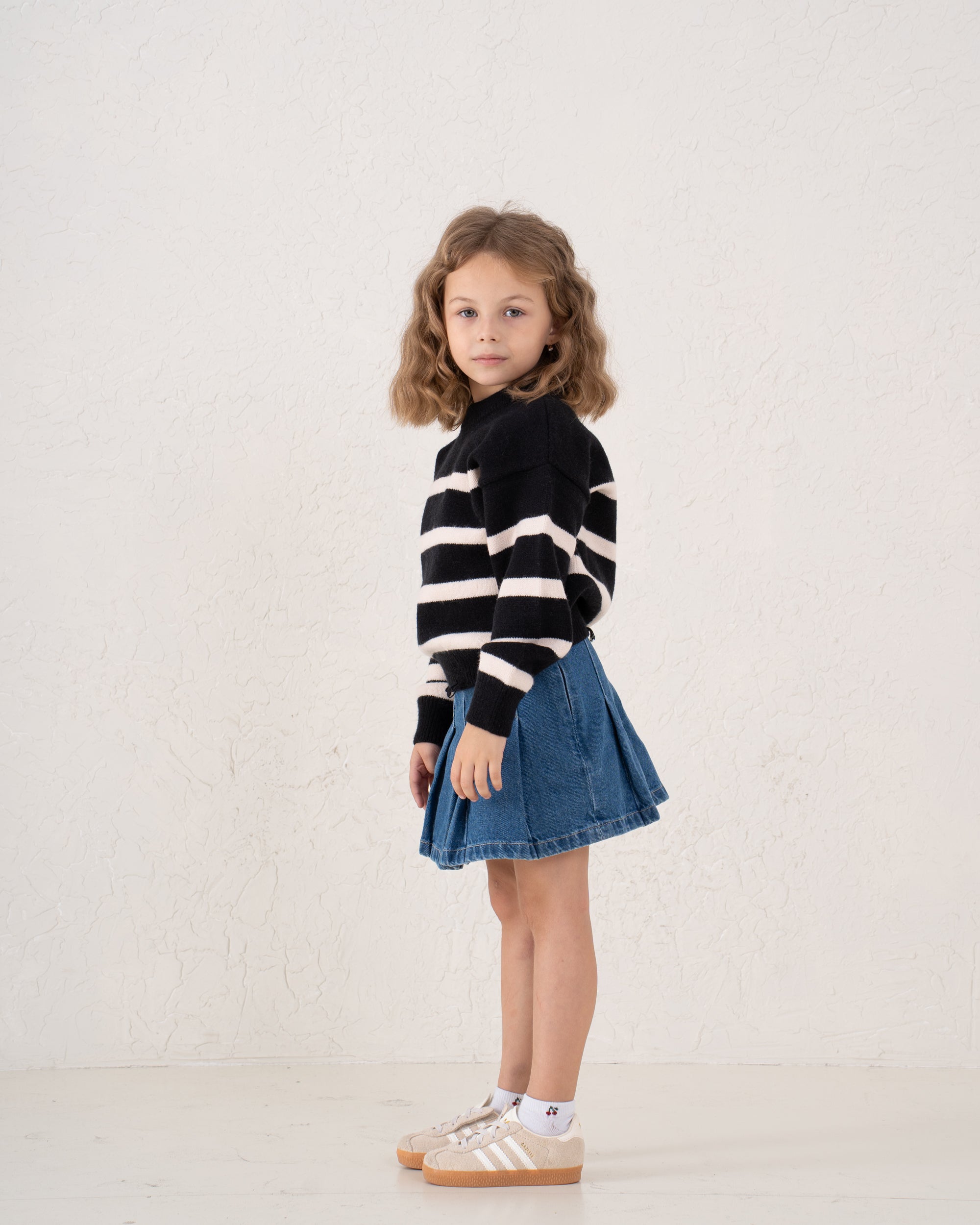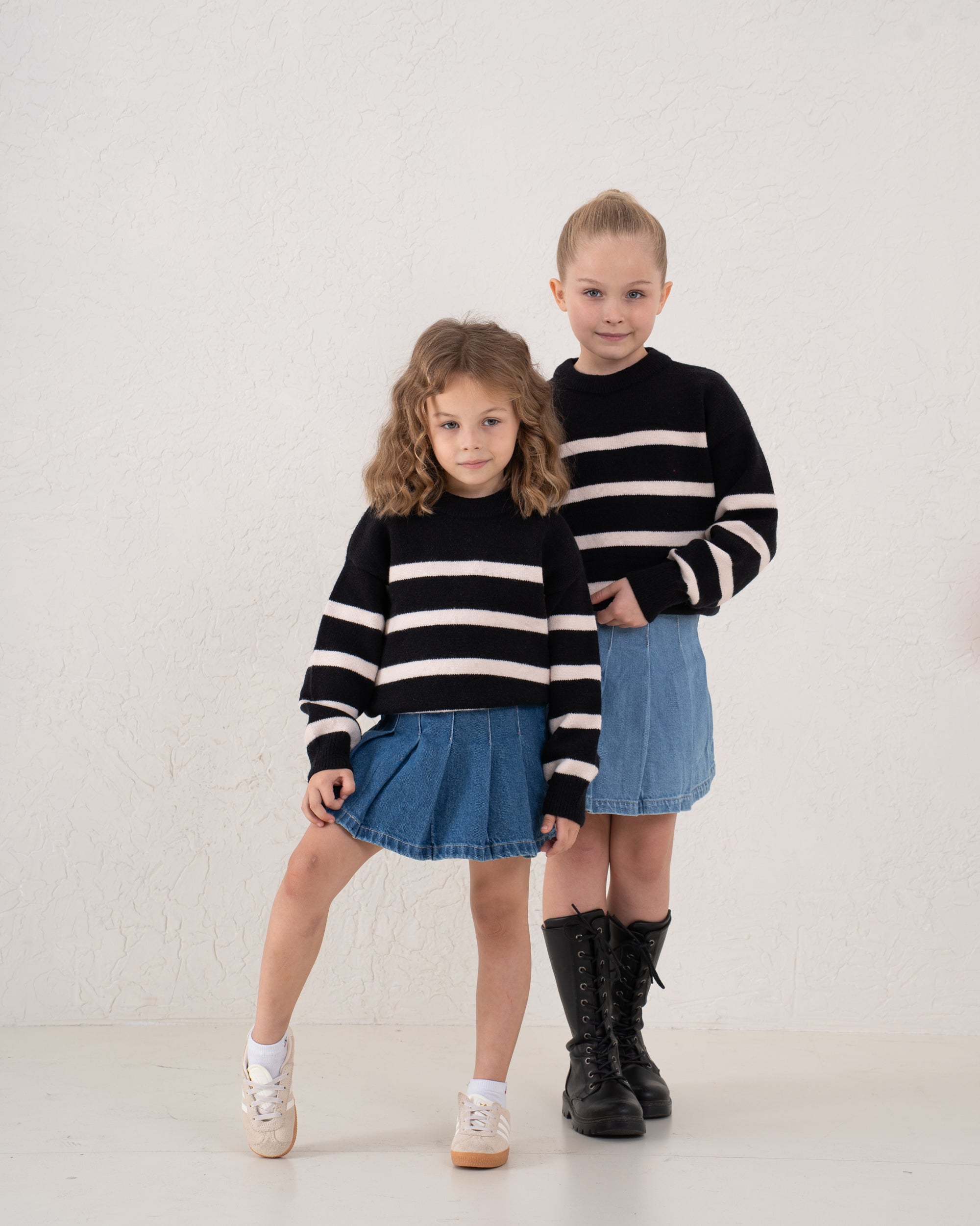 A trendy striped knit sweater featuring a relaxed, boxy fit with an unfinished raw hem for a cool, effortless look. The bold black and cream stripes add a classic touch while the cropped cut brings a modern edge.