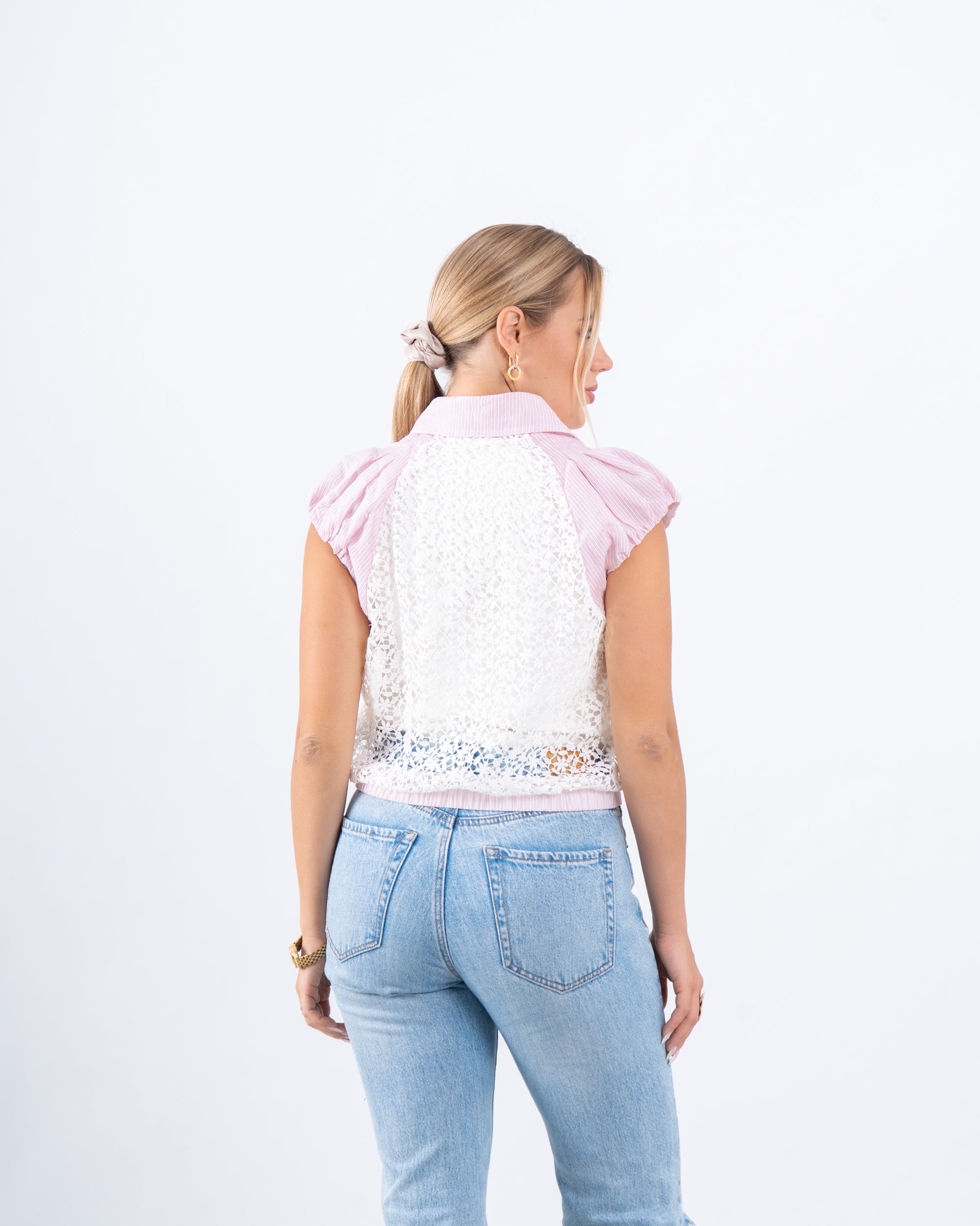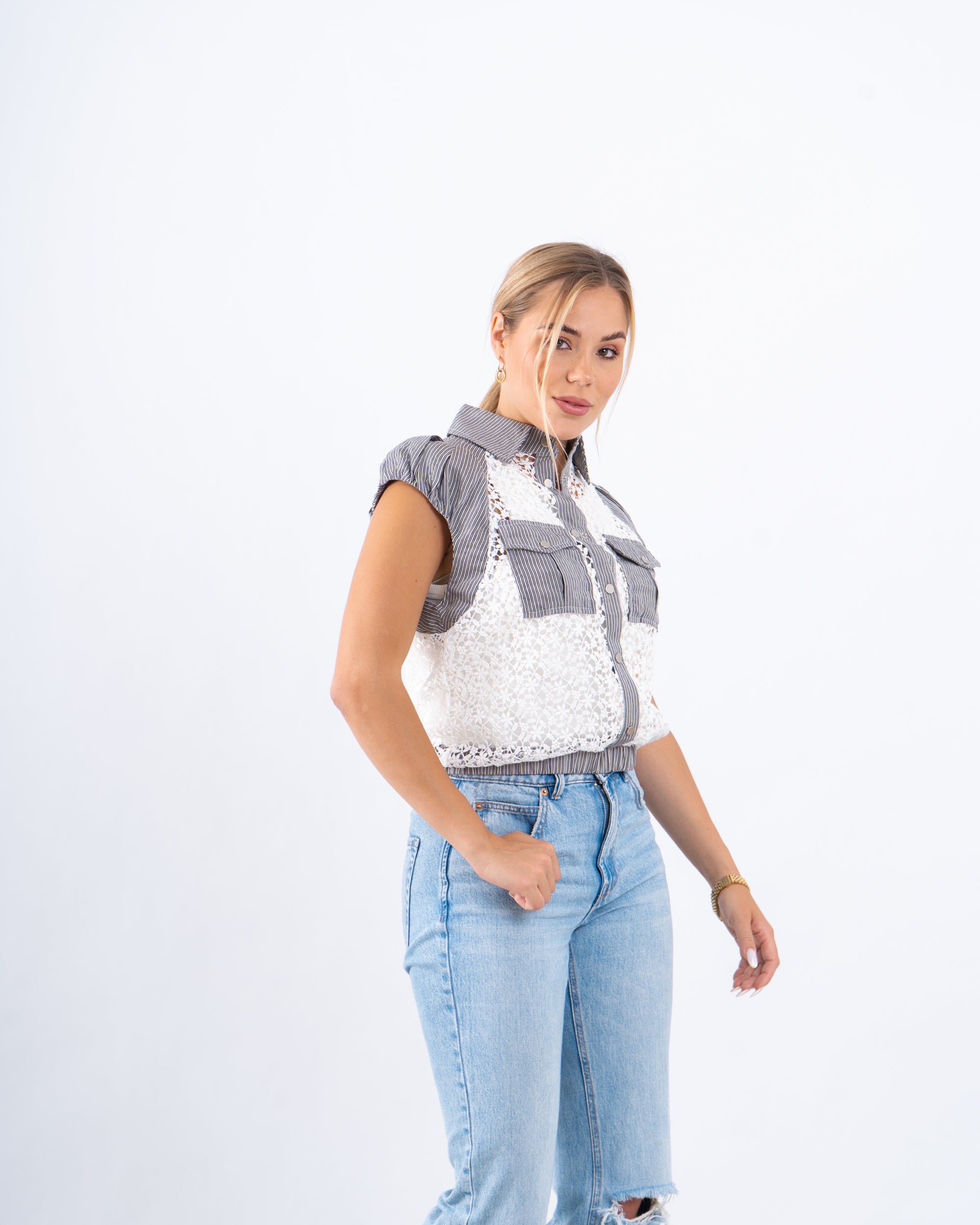 A unique buttoned vest combining textured fabric with delicate lace detailing. This versatile piece adds a touch of femininity while maintaining a structured look, perfect for layering or wearing solo.