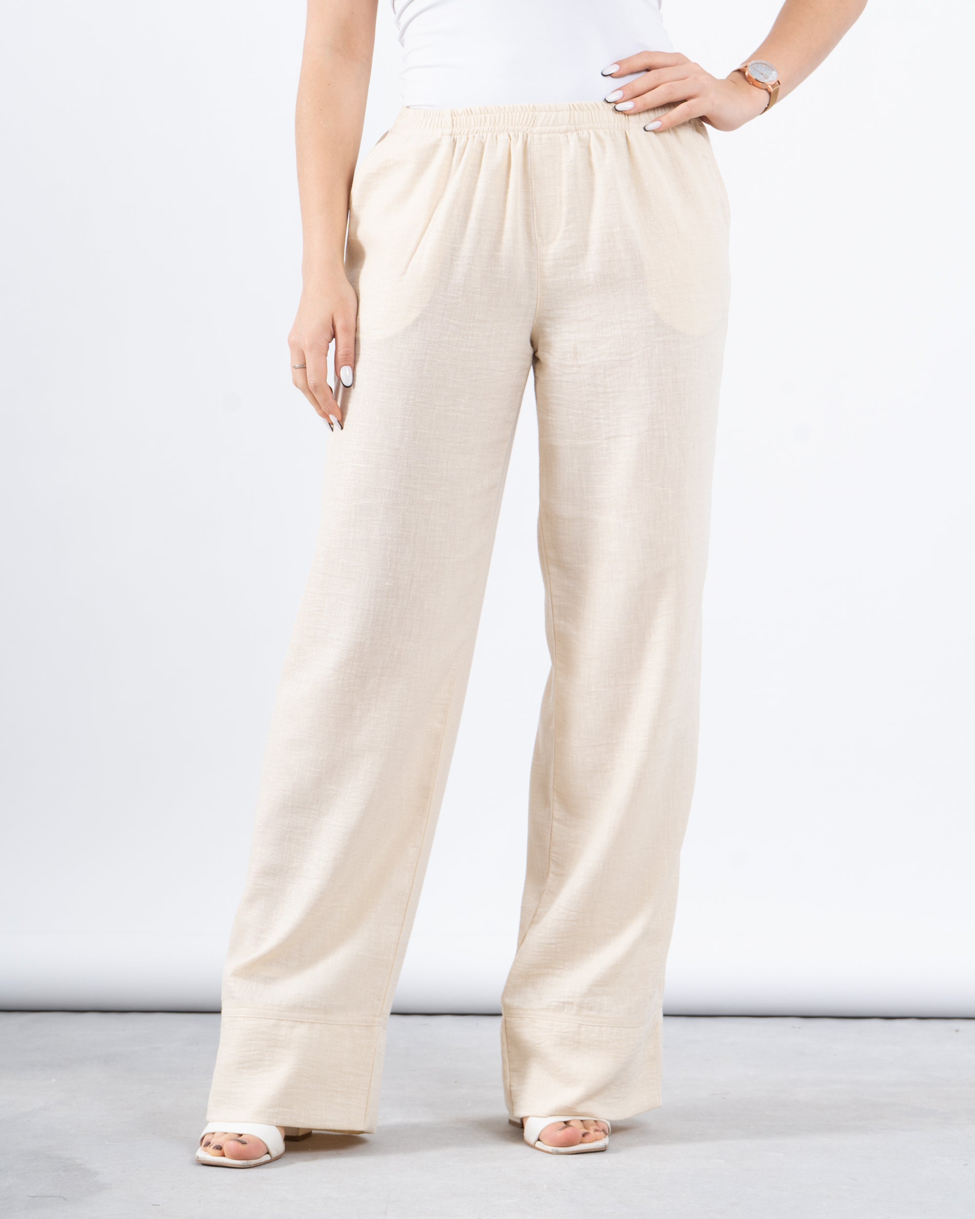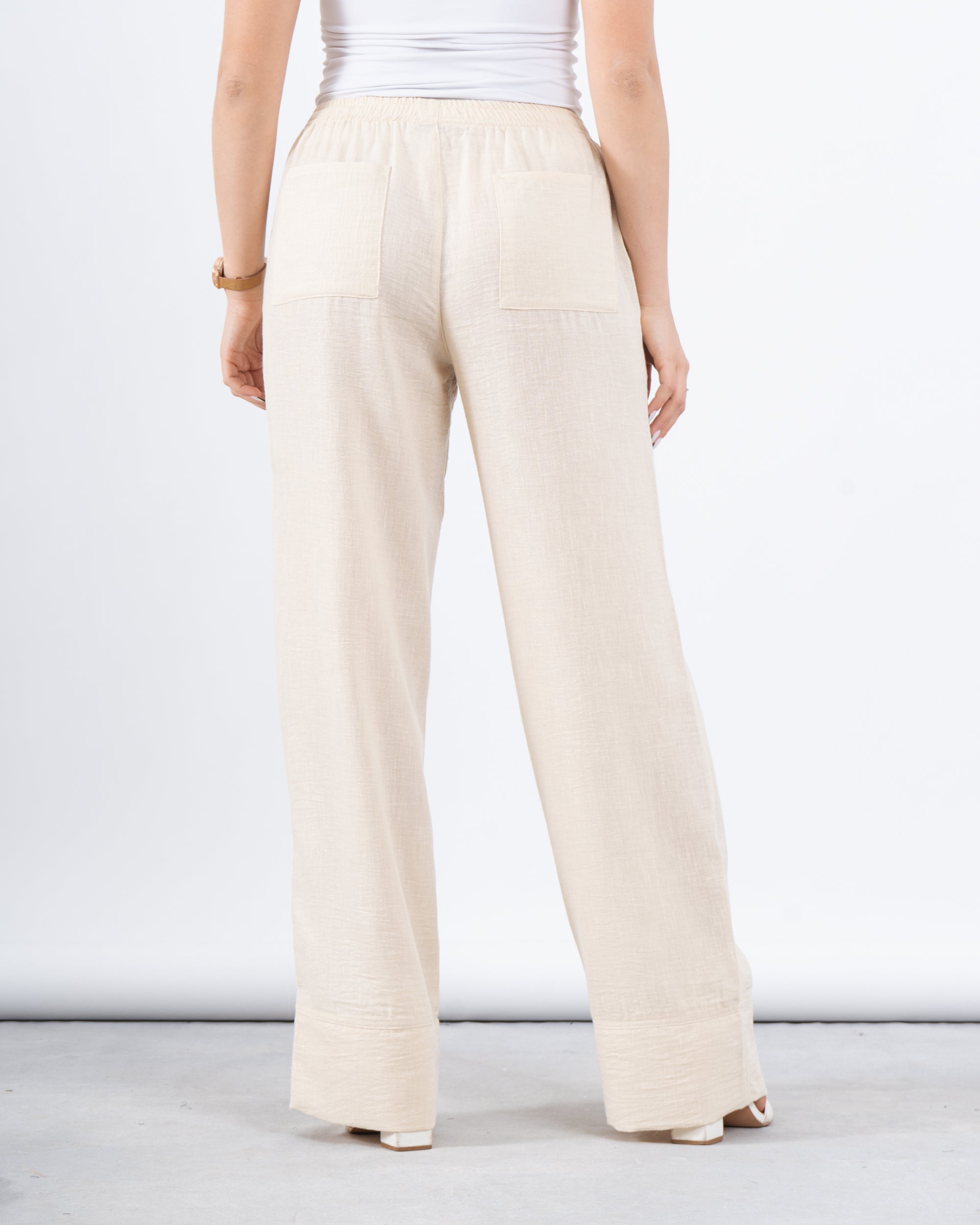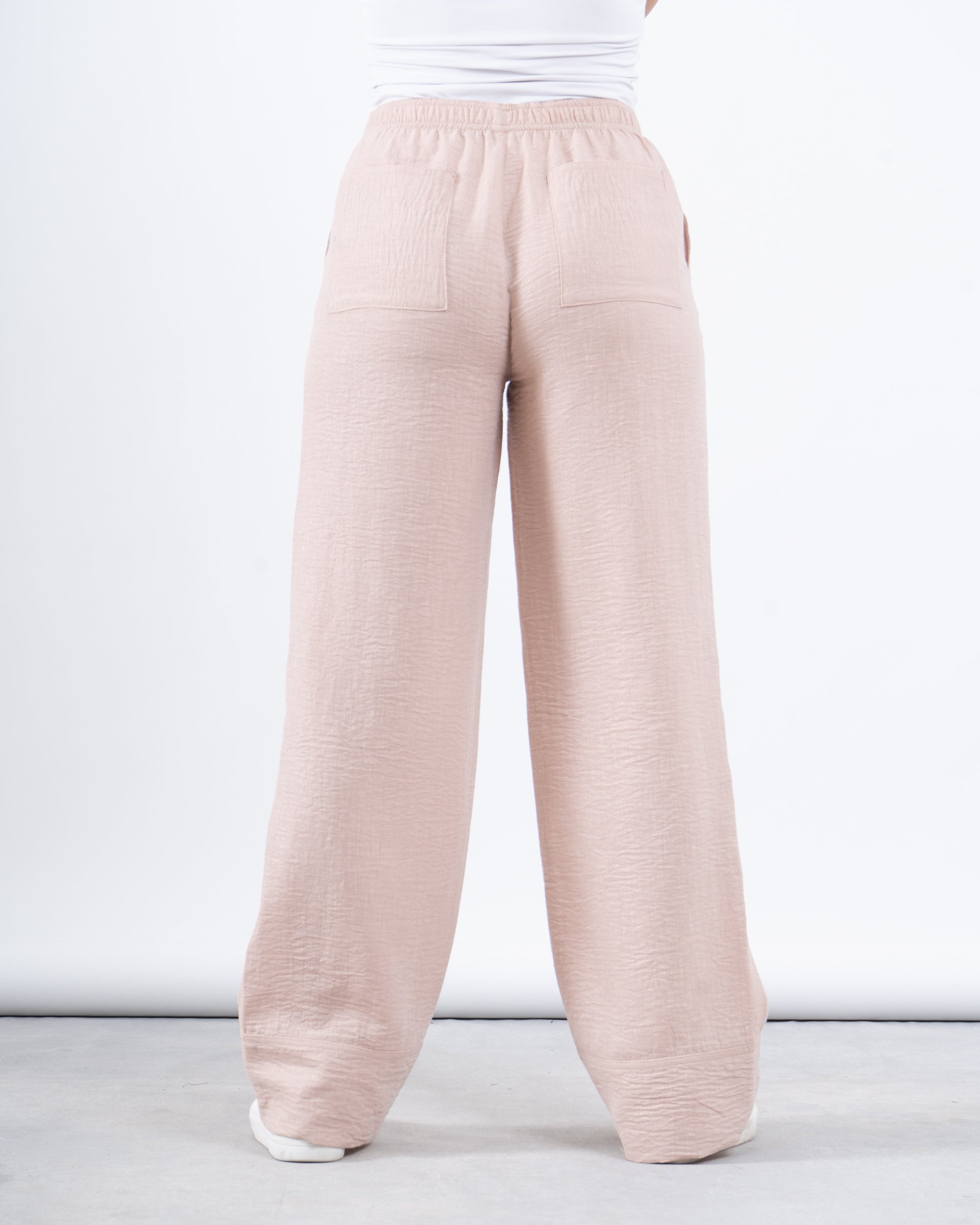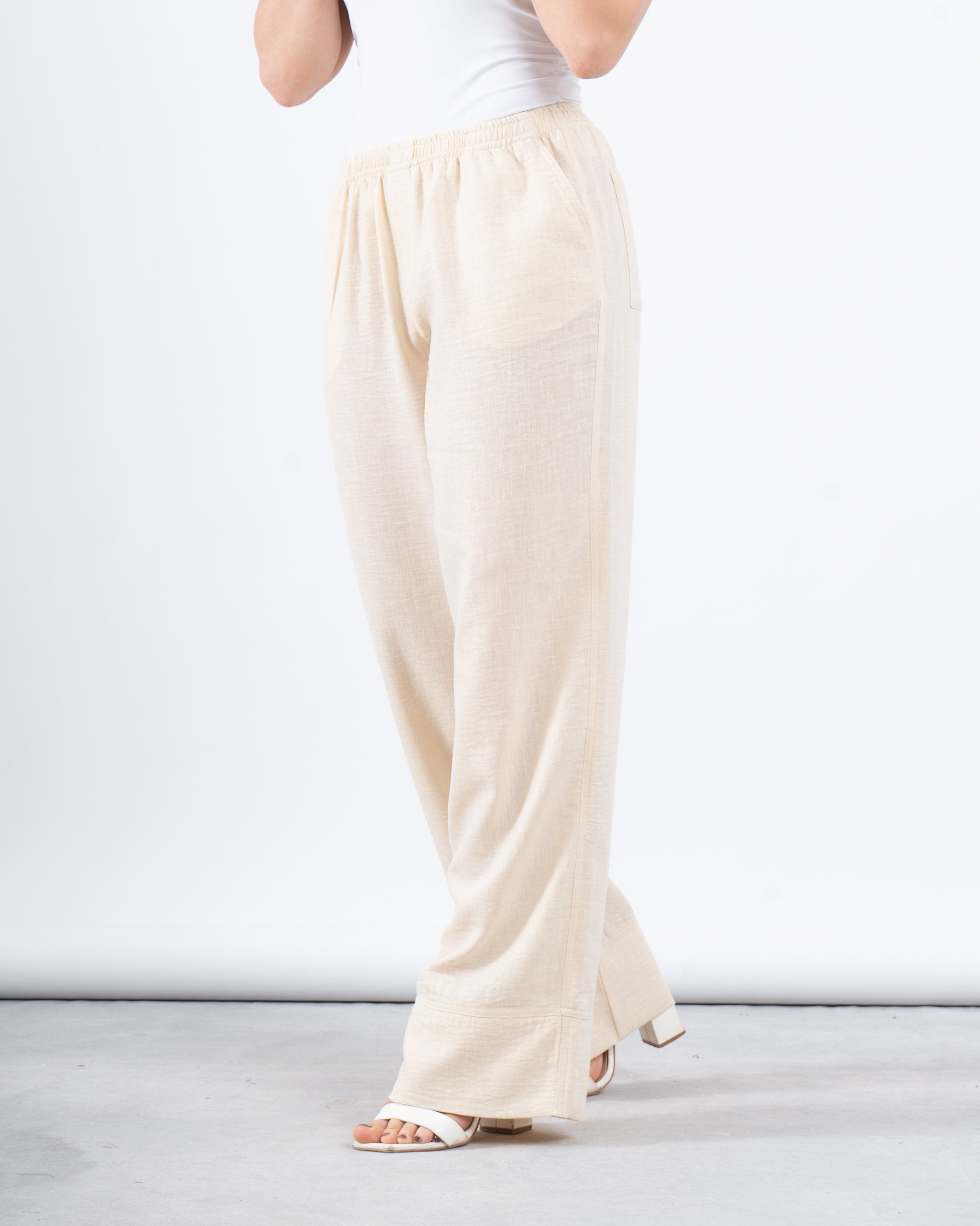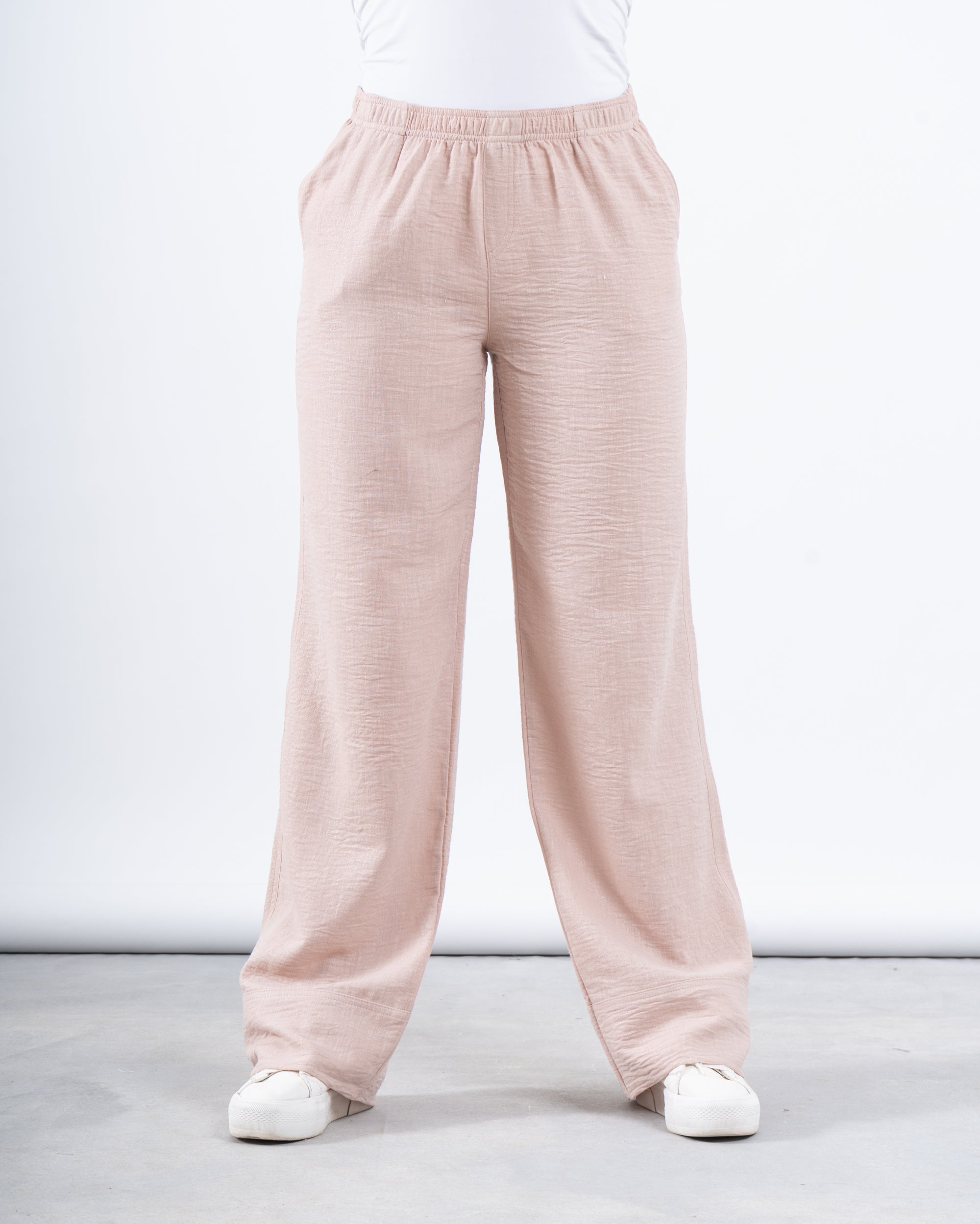 Crafted for comfort and elegance, these wide-leg pants offer a breezy fit with a subtle shimmer for an elevated touch. The elasticated waistband ensures a comfortable fit, making them a versatile staple for any wardrobe.