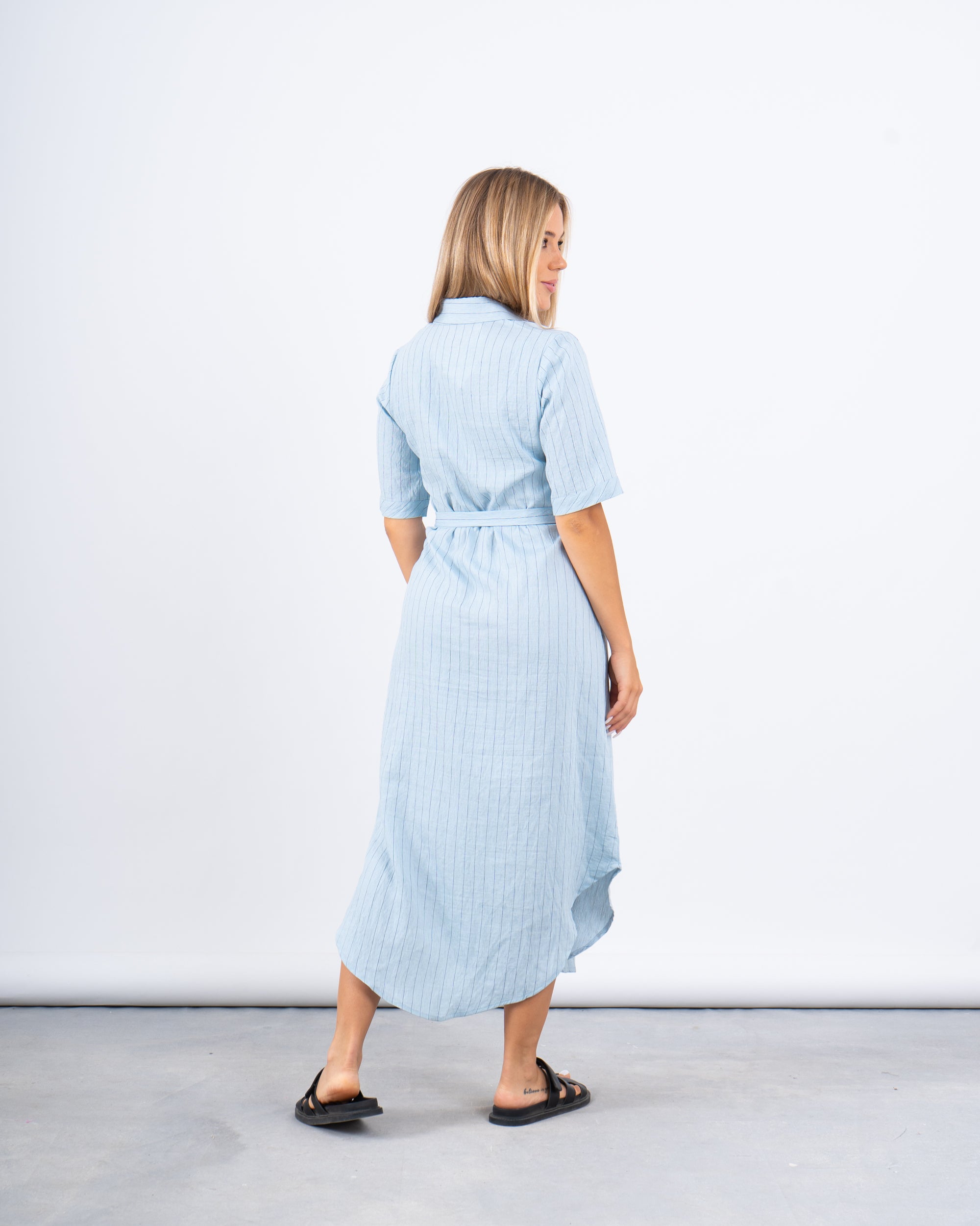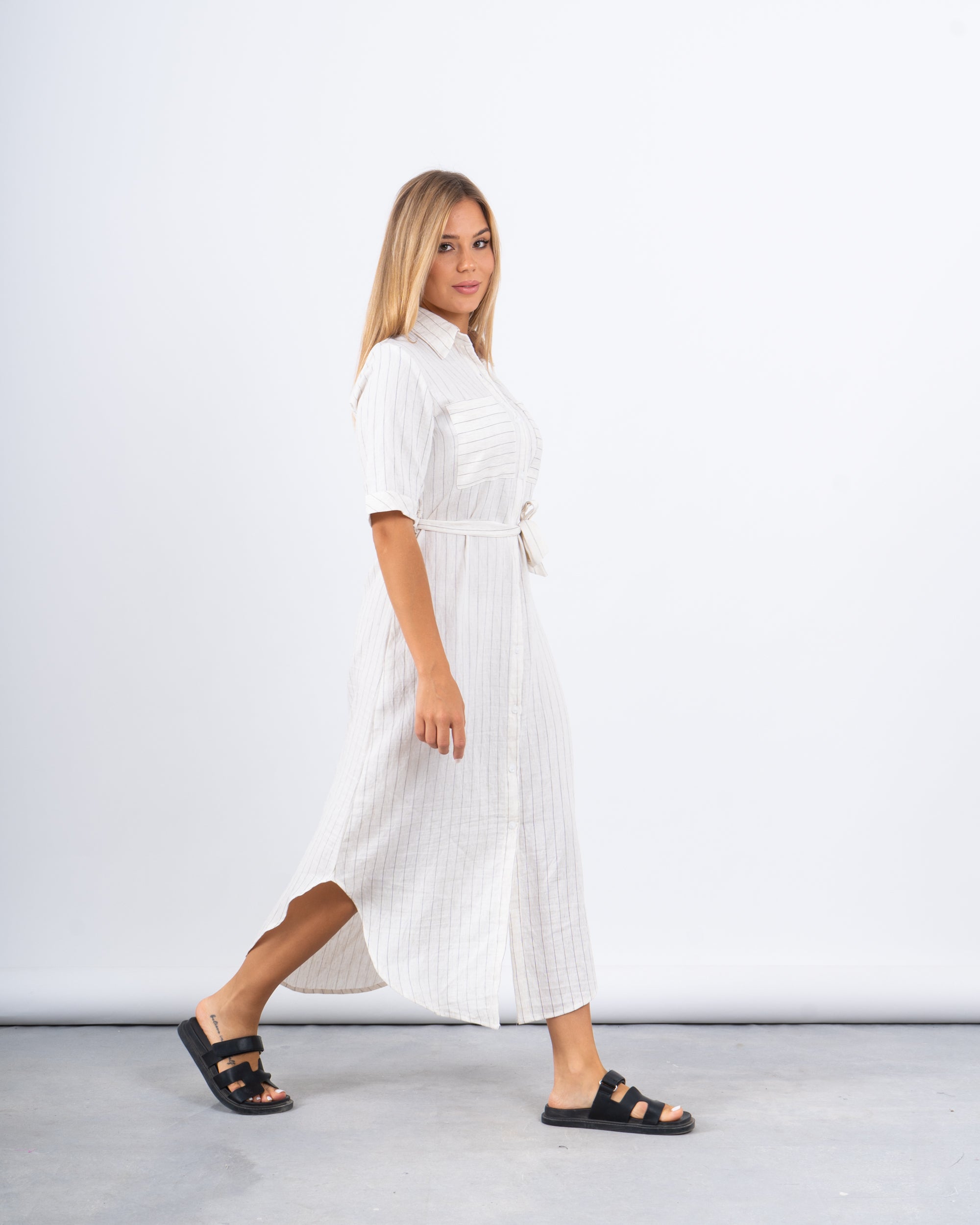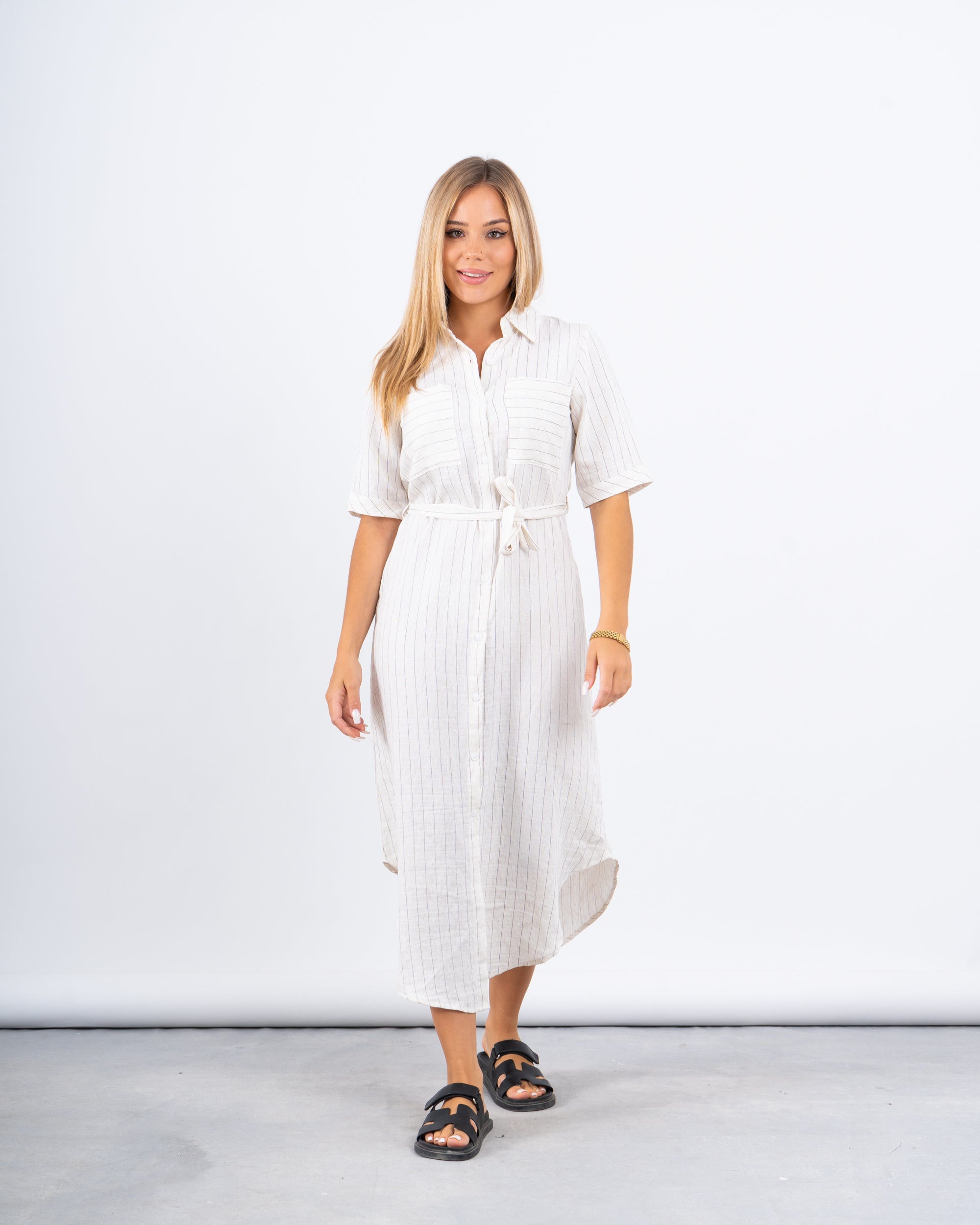 A lightweight and effortless striped shirt dress designed for easy summer days. Features a flattering belted waist and button-down front for a classic yet modern look.