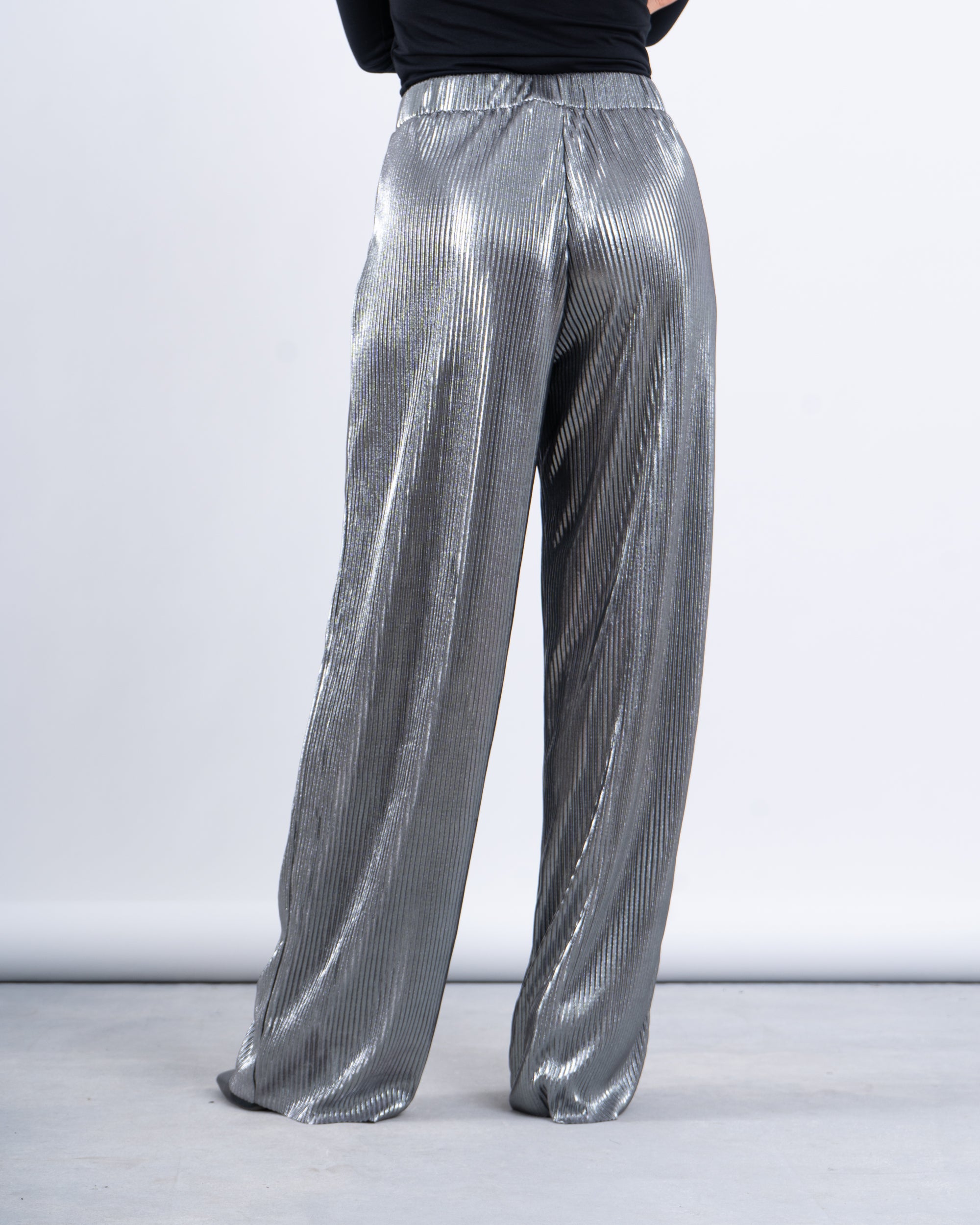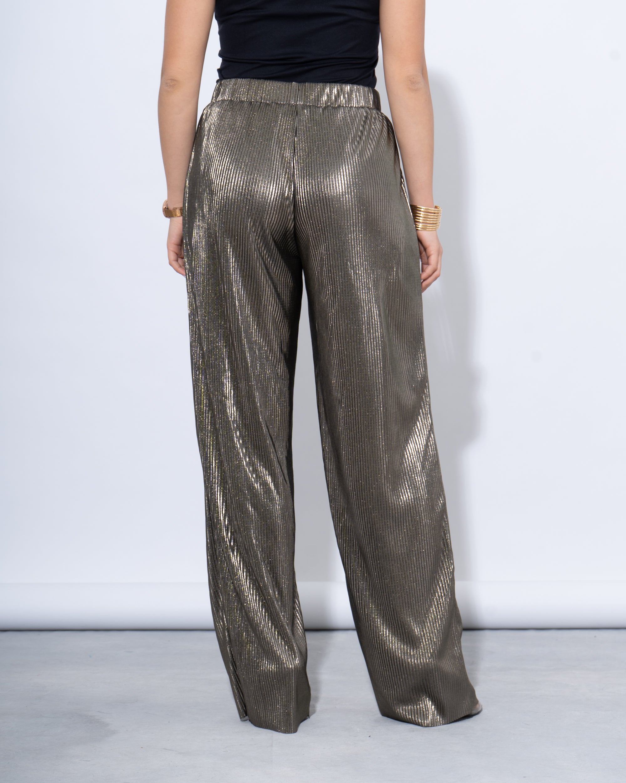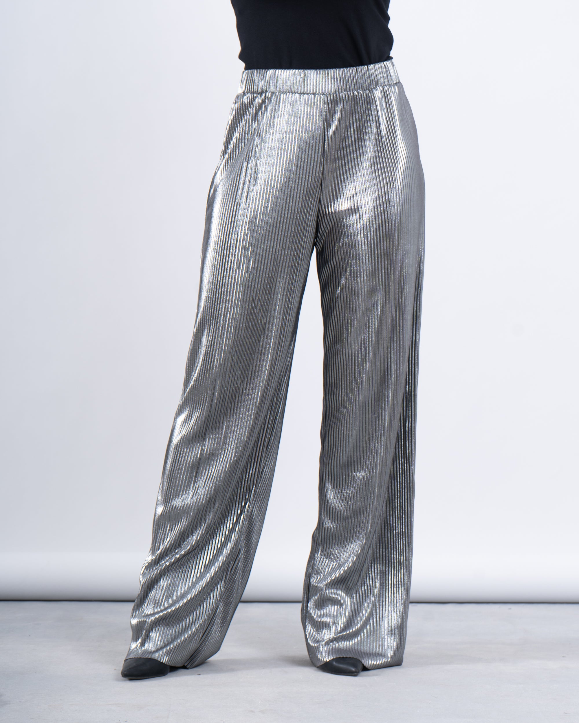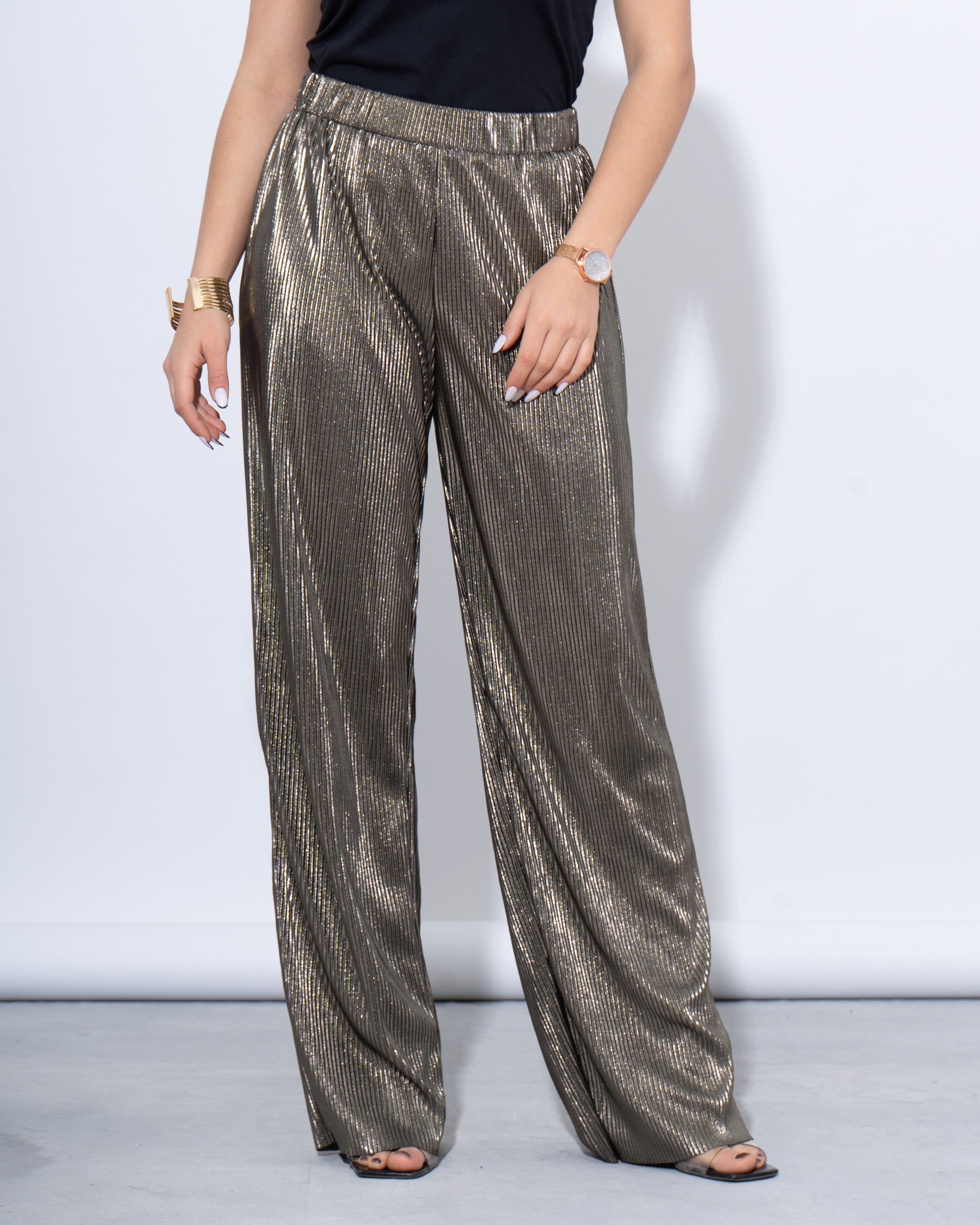Elevate your style with these metallic wide-leg pants. Featuring a relaxed fit and a fluid drape, these pants add a luxe touch to both casual and dressy outfits.