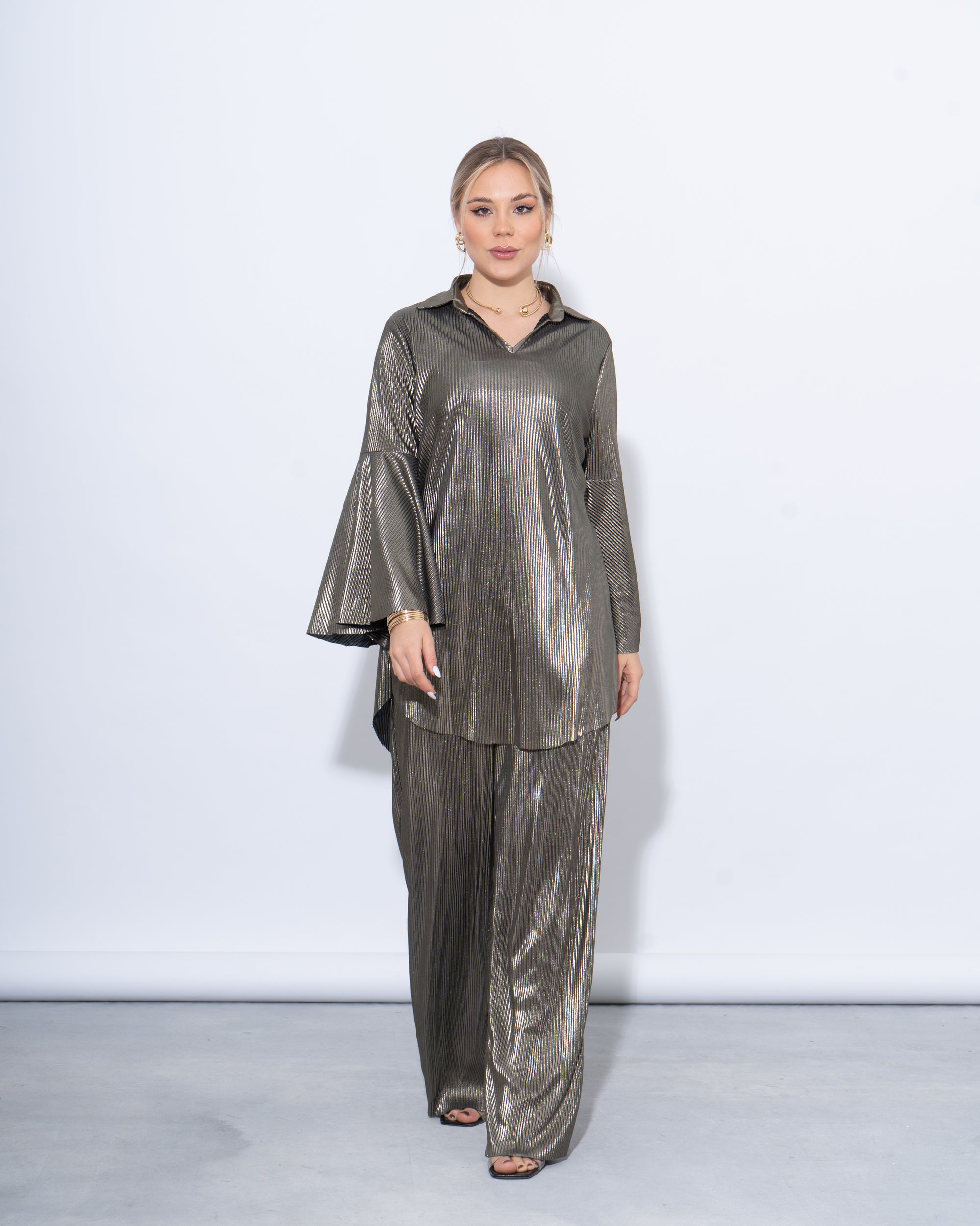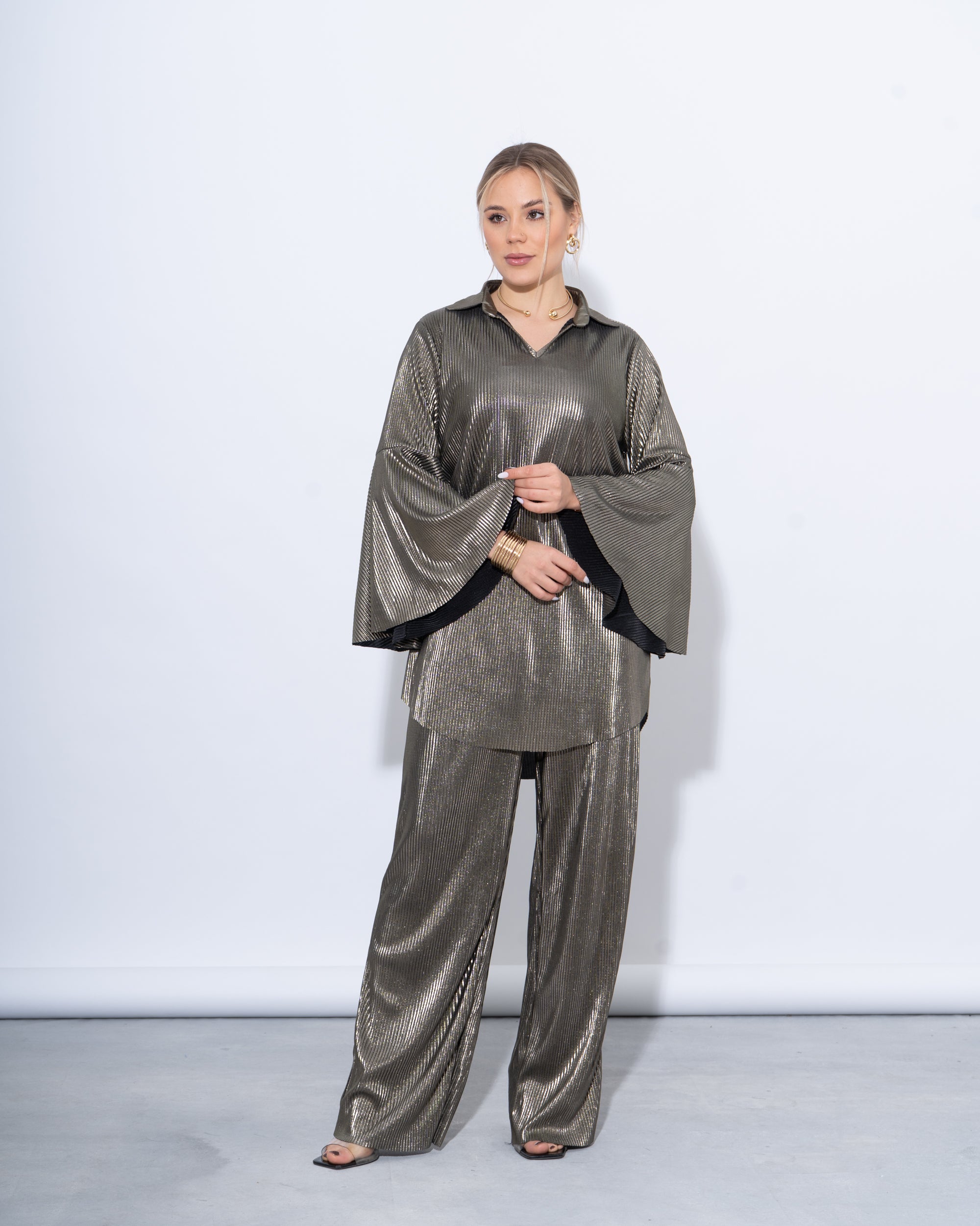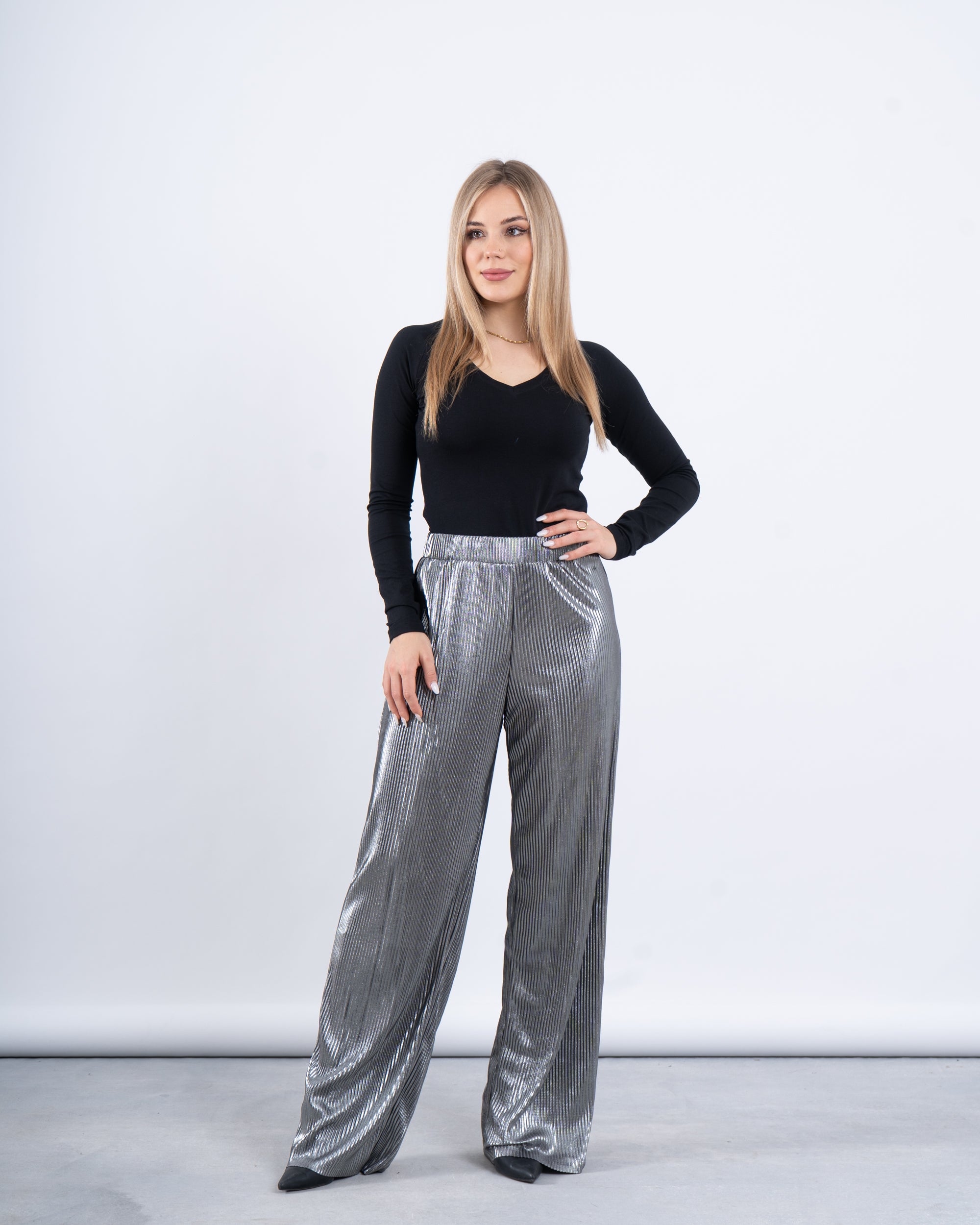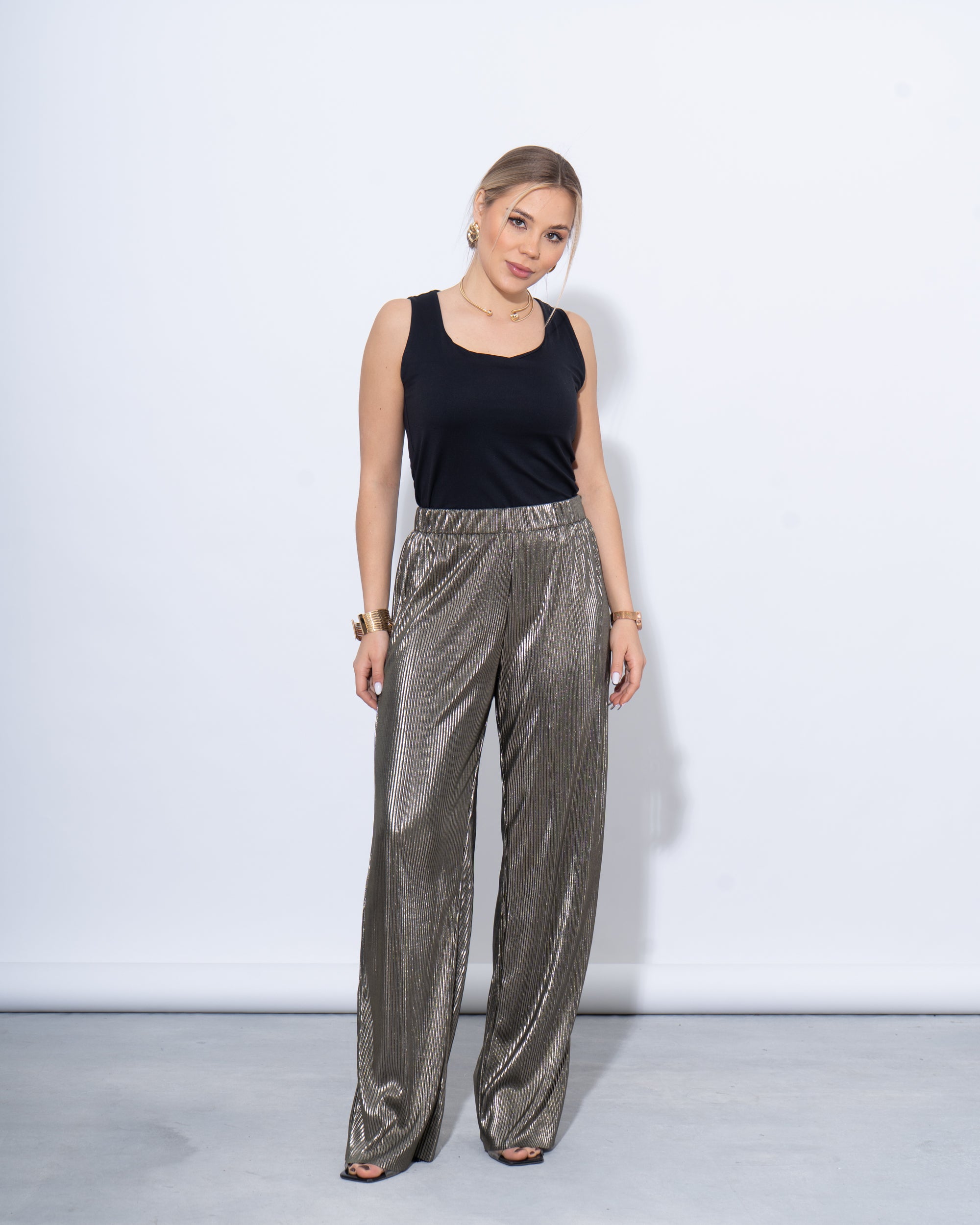 Elevate your style with these metallic wide-leg pants. Featuring a relaxed fit and a fluid drape, these pants add a luxe touch to both casual and dressy outfits.