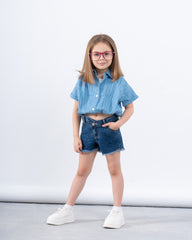 Relaxed, boxy fit with short puff sleeves. Button-up front. Inner tank has a fitted cut.