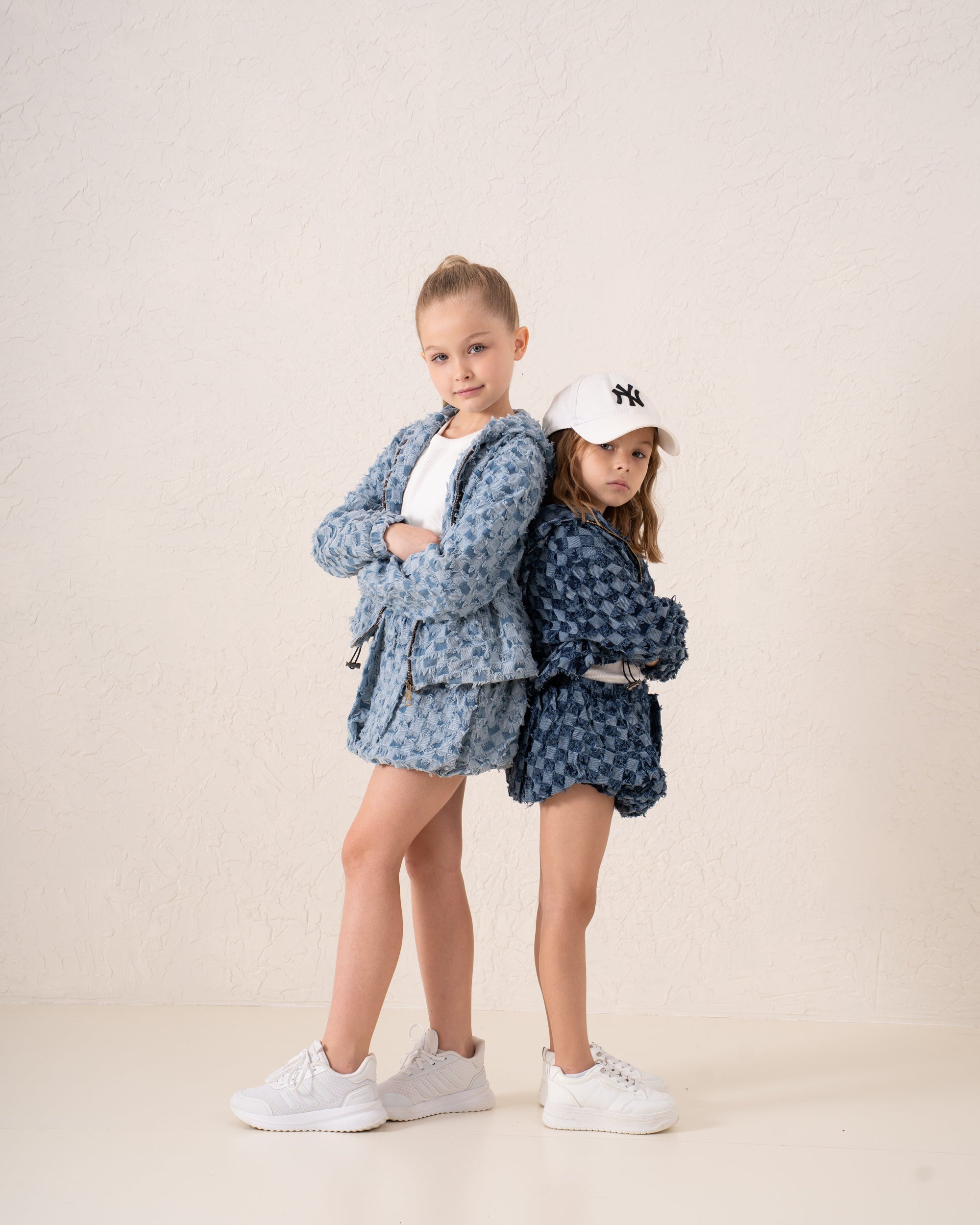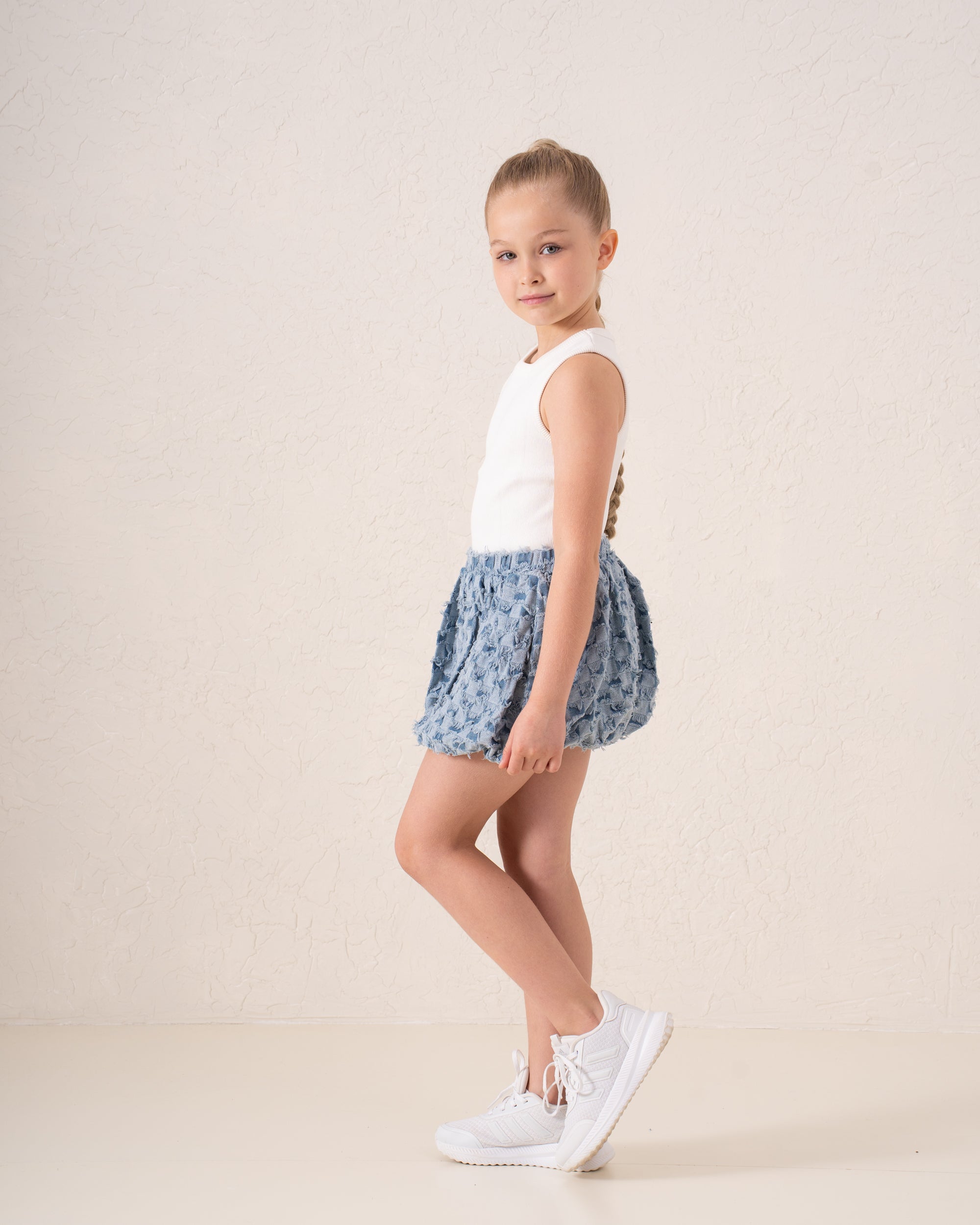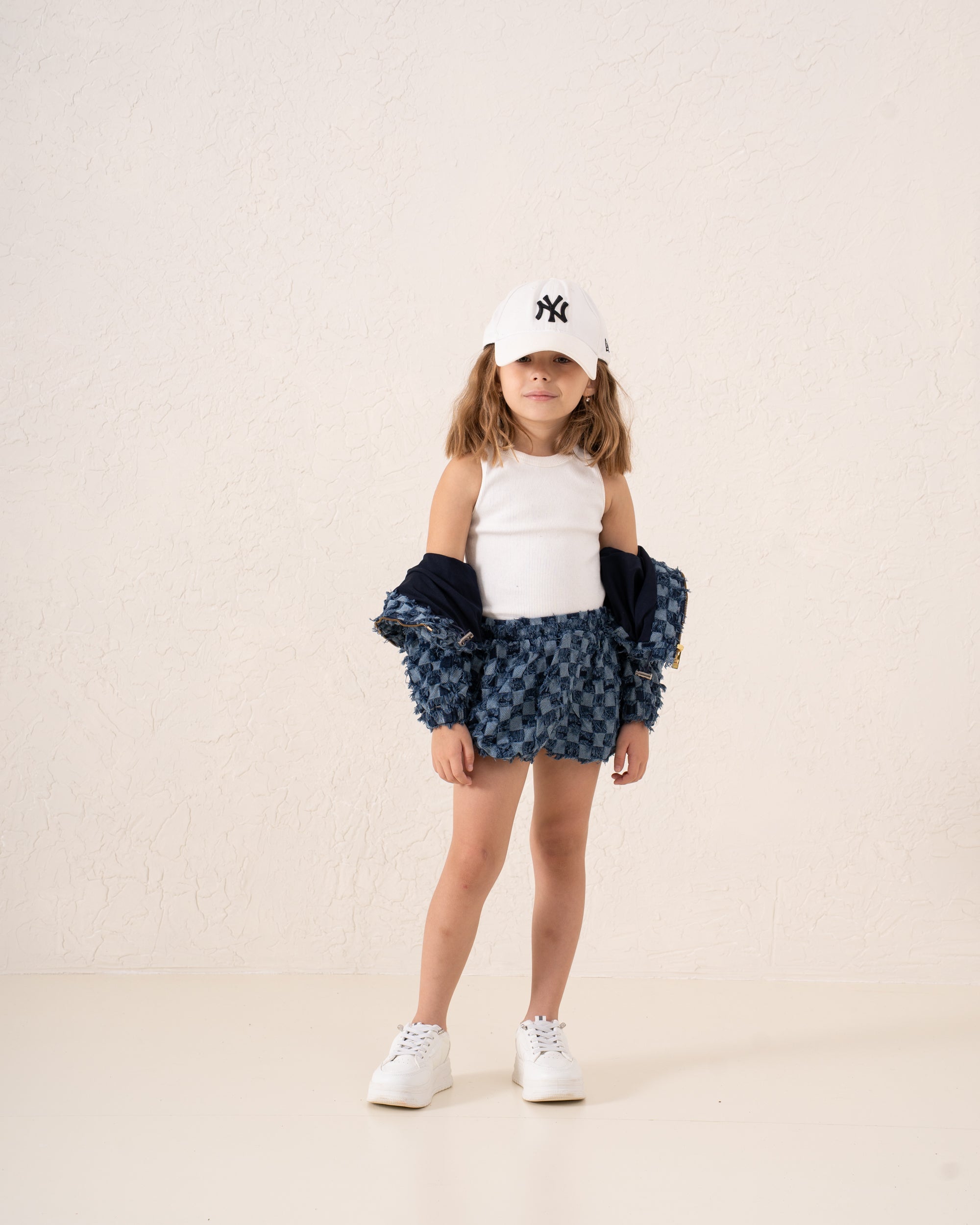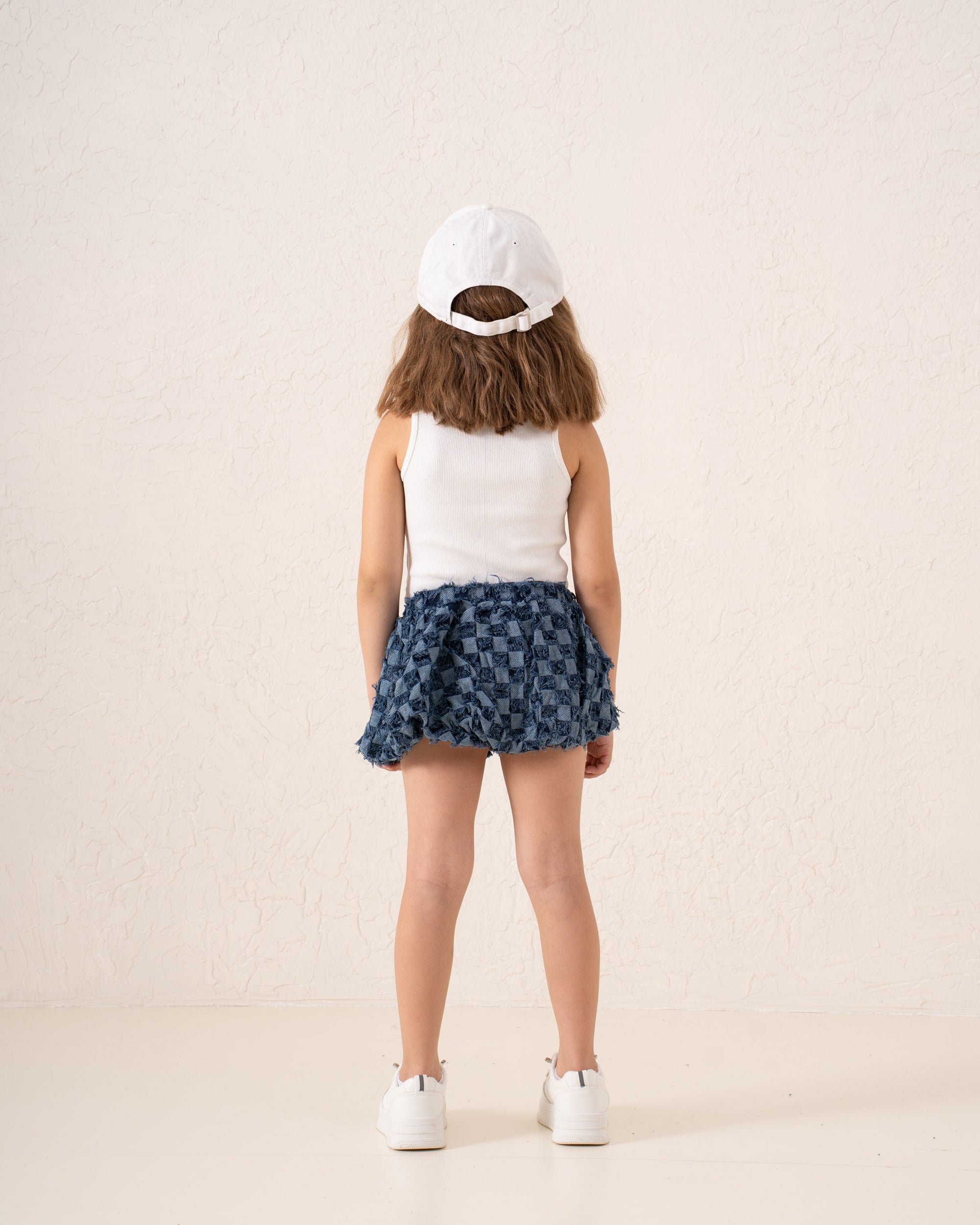 A playful twist on the classic denim mini — this skirt features a textured patchwork finish and easy pull-on style. Trendy and versatile for day-to-day wear.