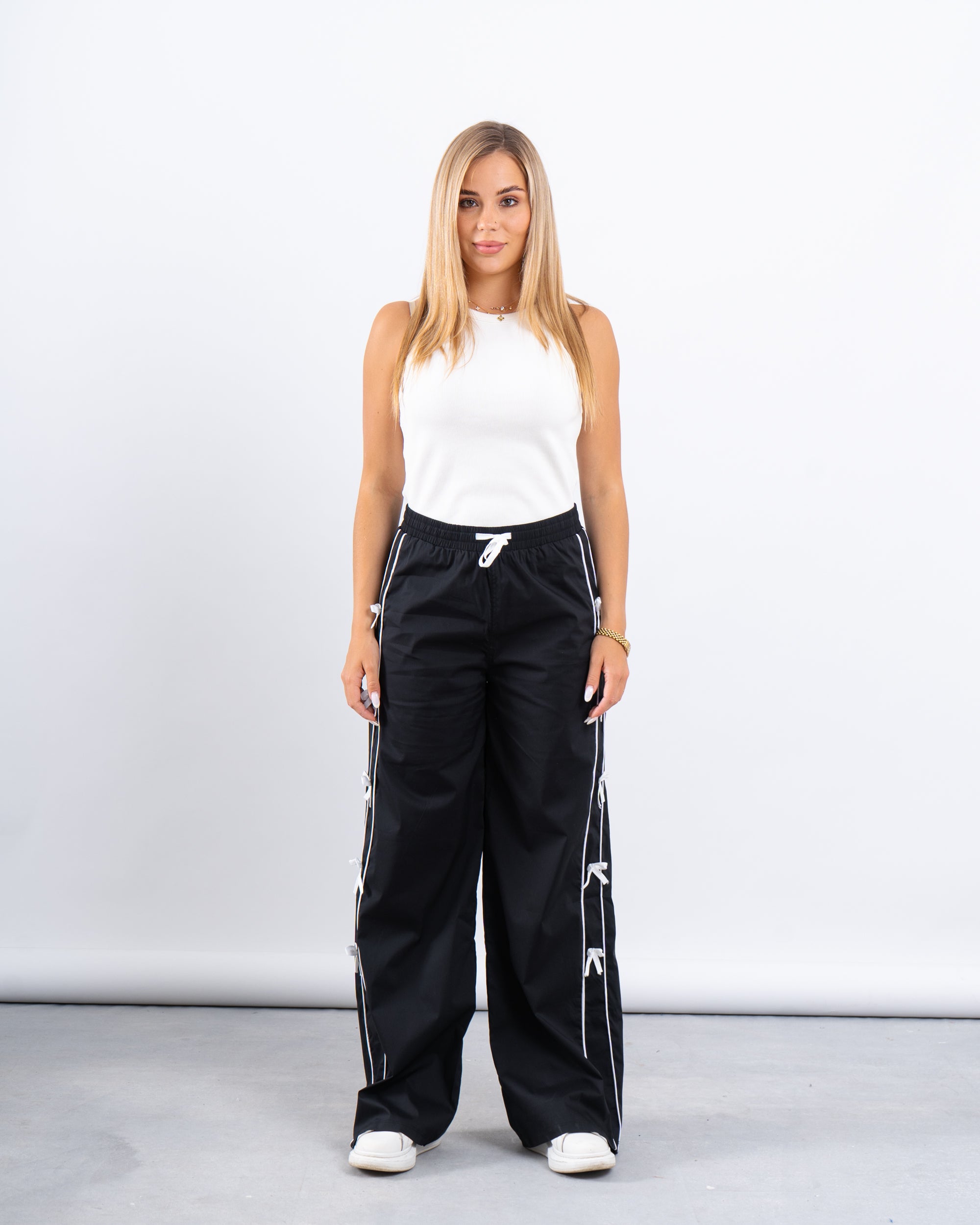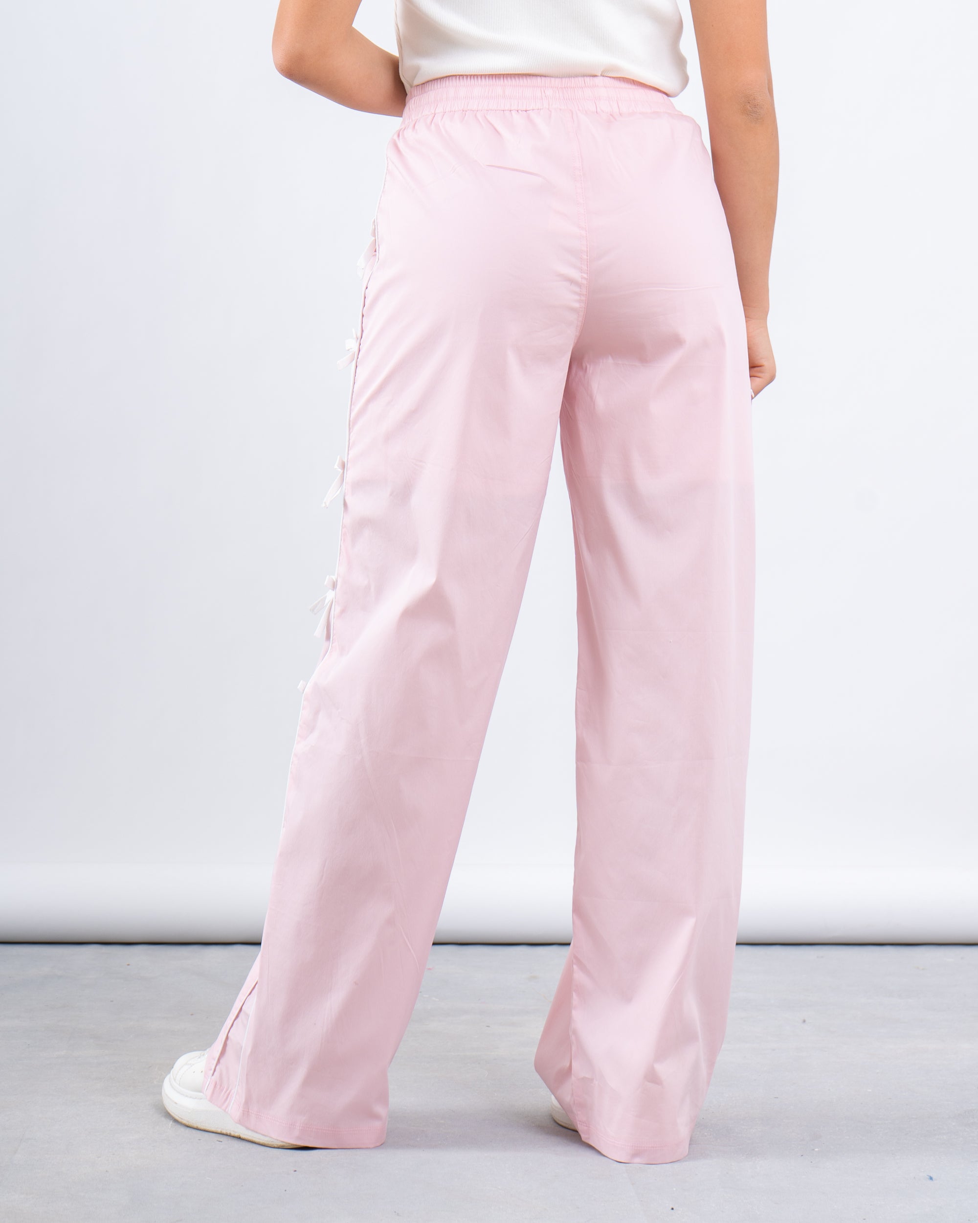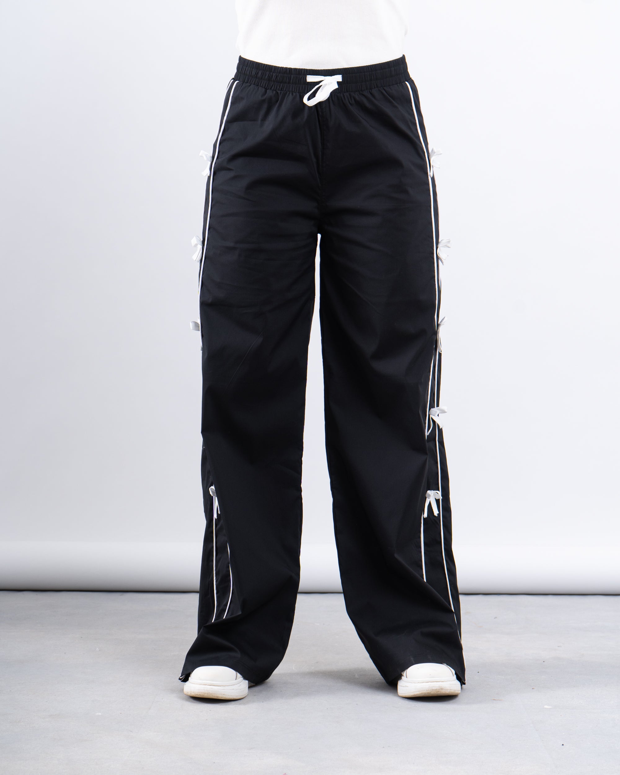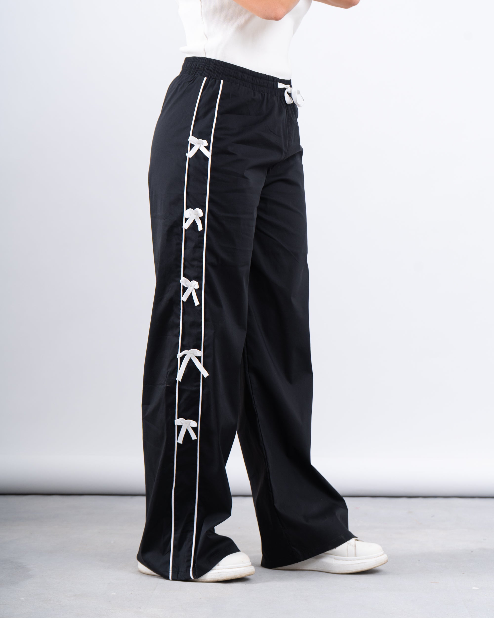 Chic and playful wide-leg pants featuring bow details along the sides, designed for a statement look. Ideal for both casual outings and stylish moments.