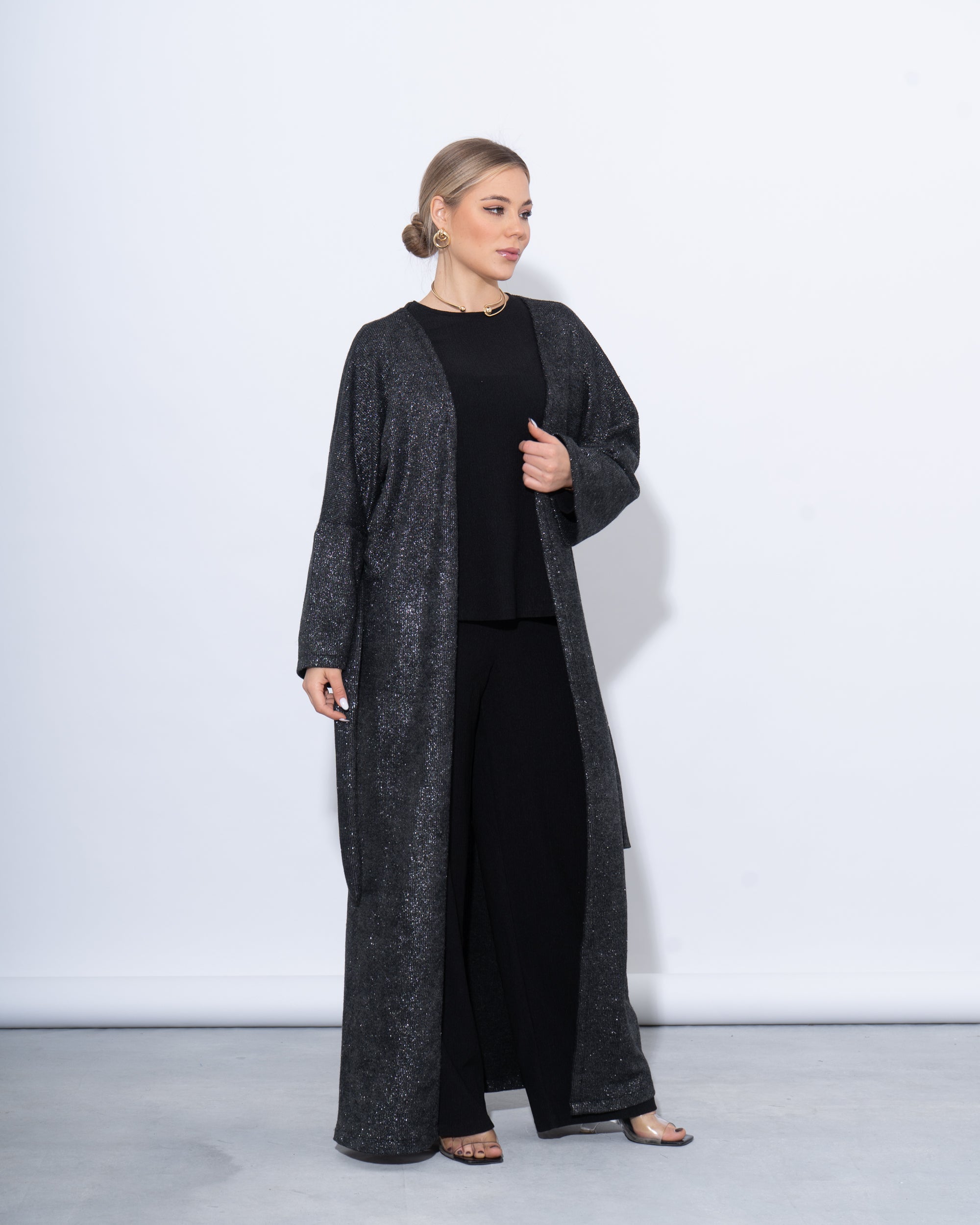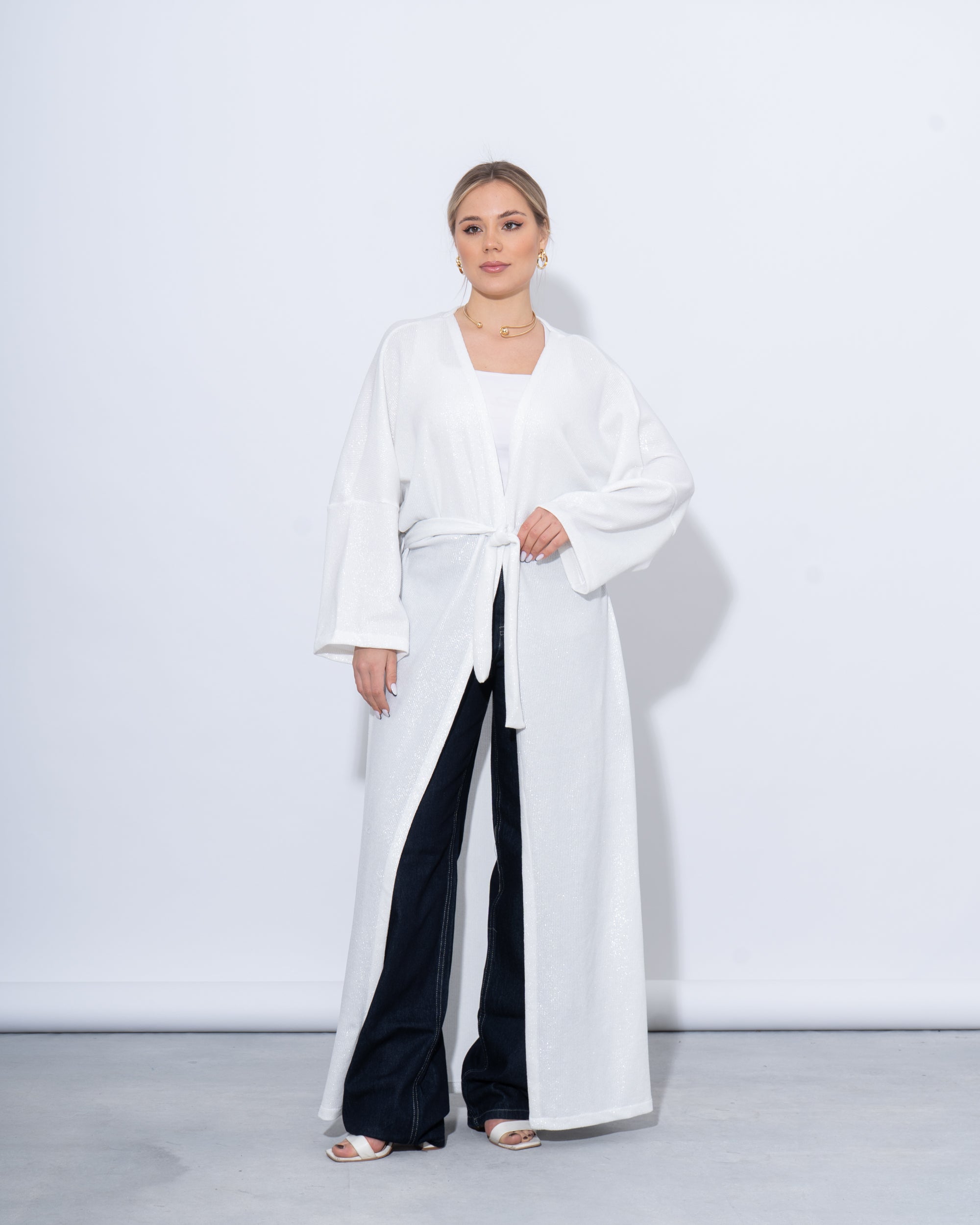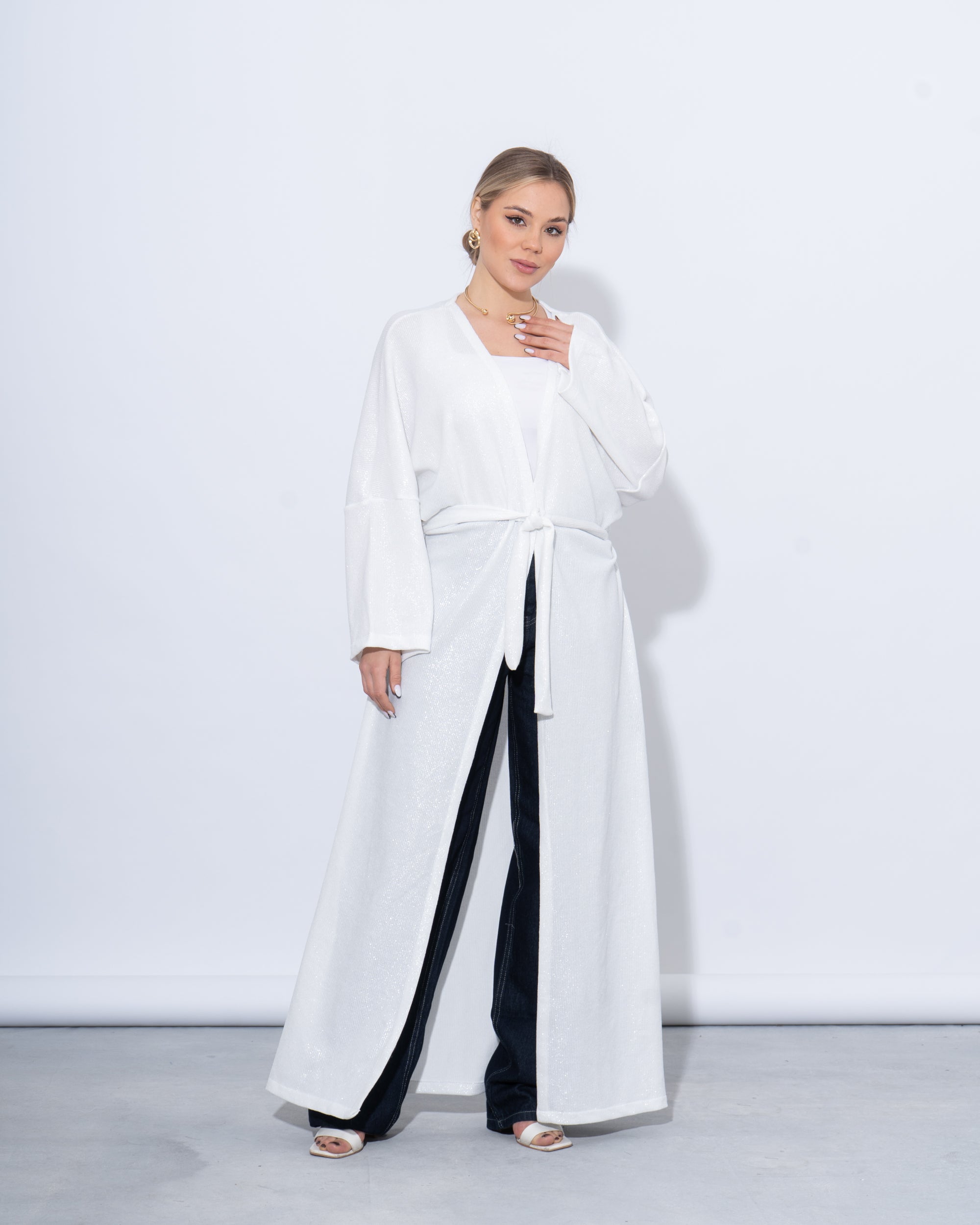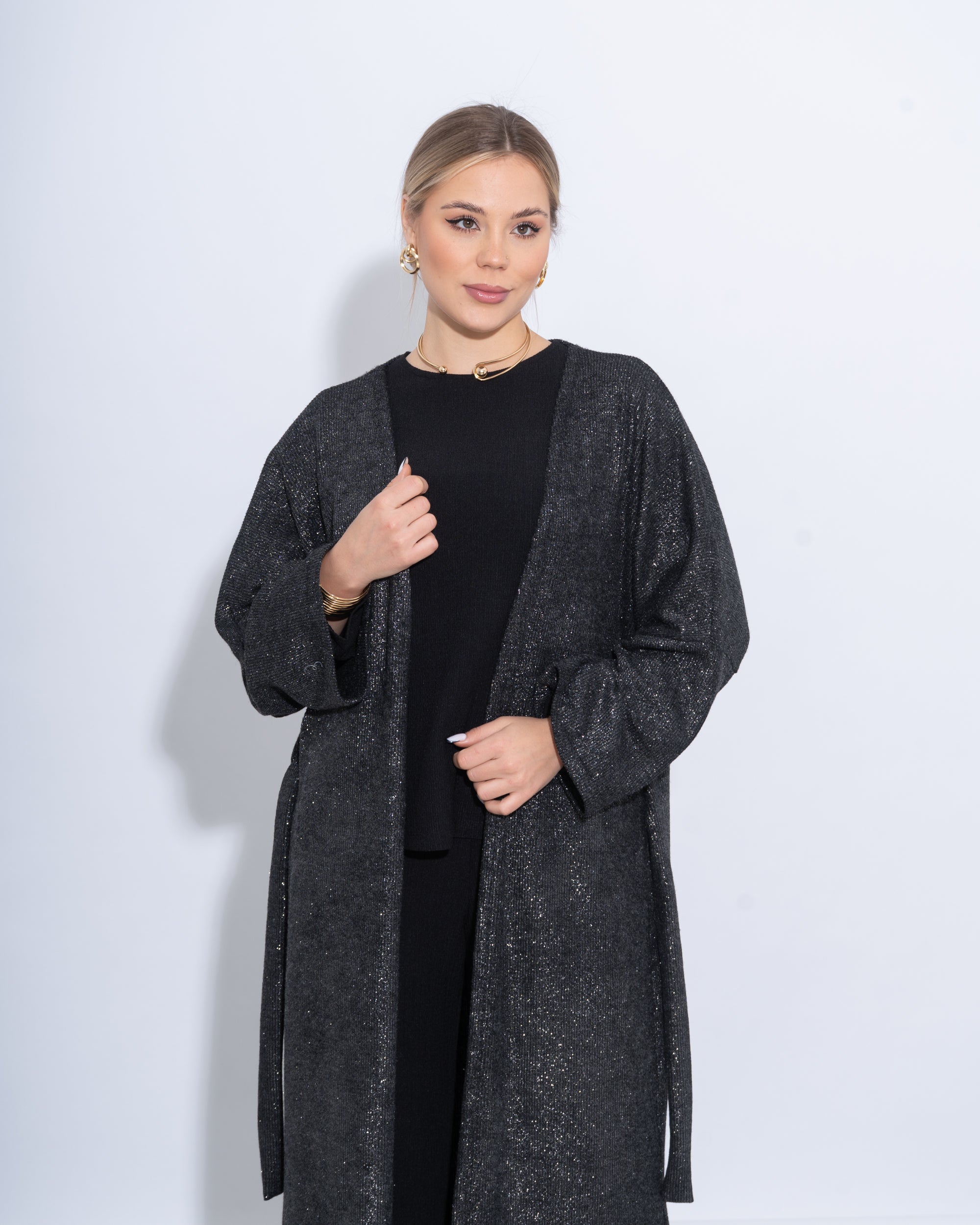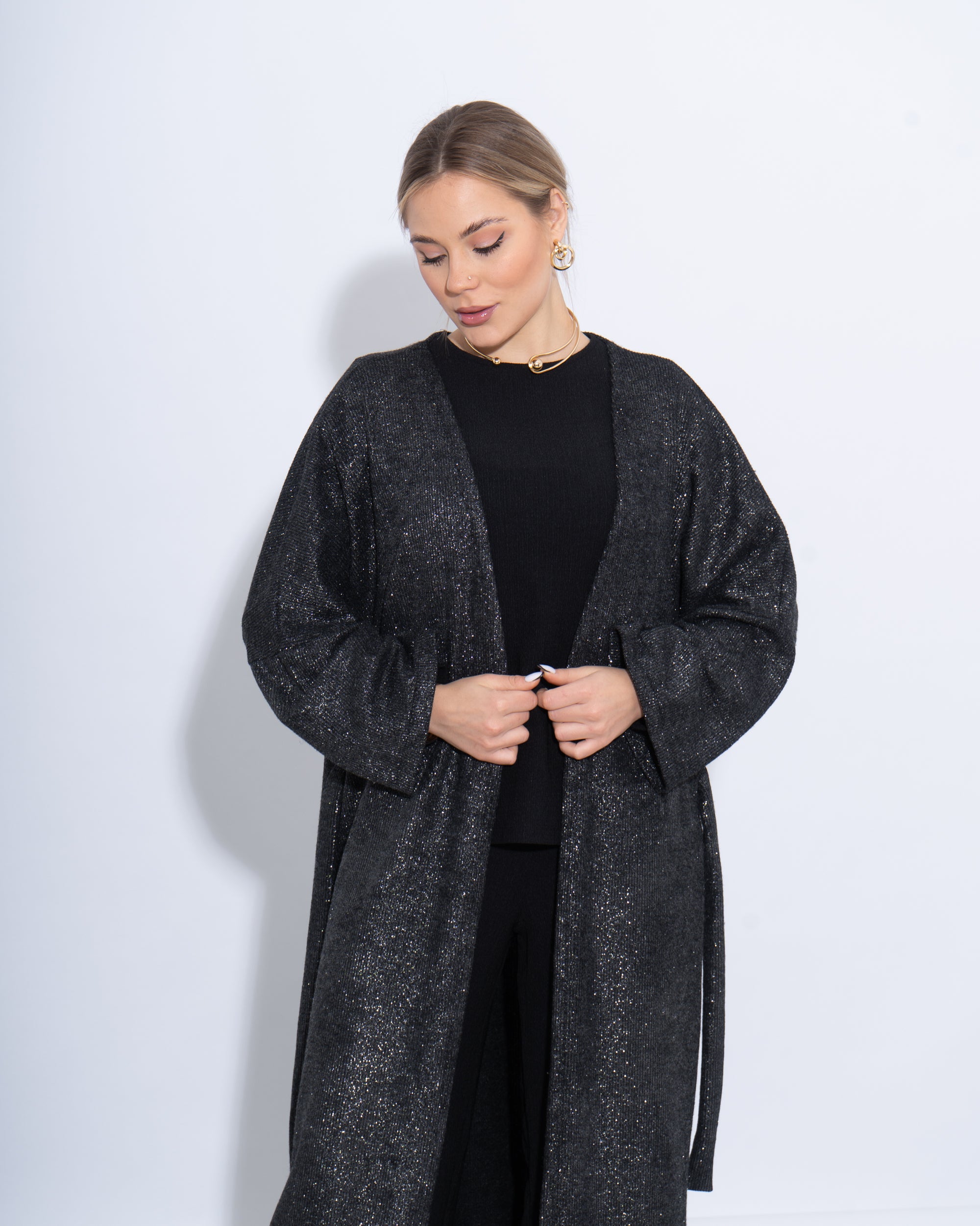 A shimmering statement piece designed to elevate any outfit. This long knit cardigan features a soft, flowy silhouette with a subtle sparkle woven throughout, adding a touch of glam to your layering essentials.